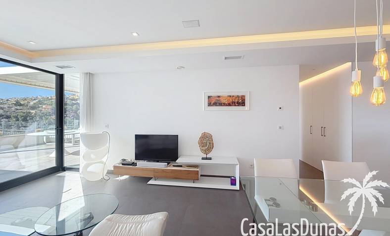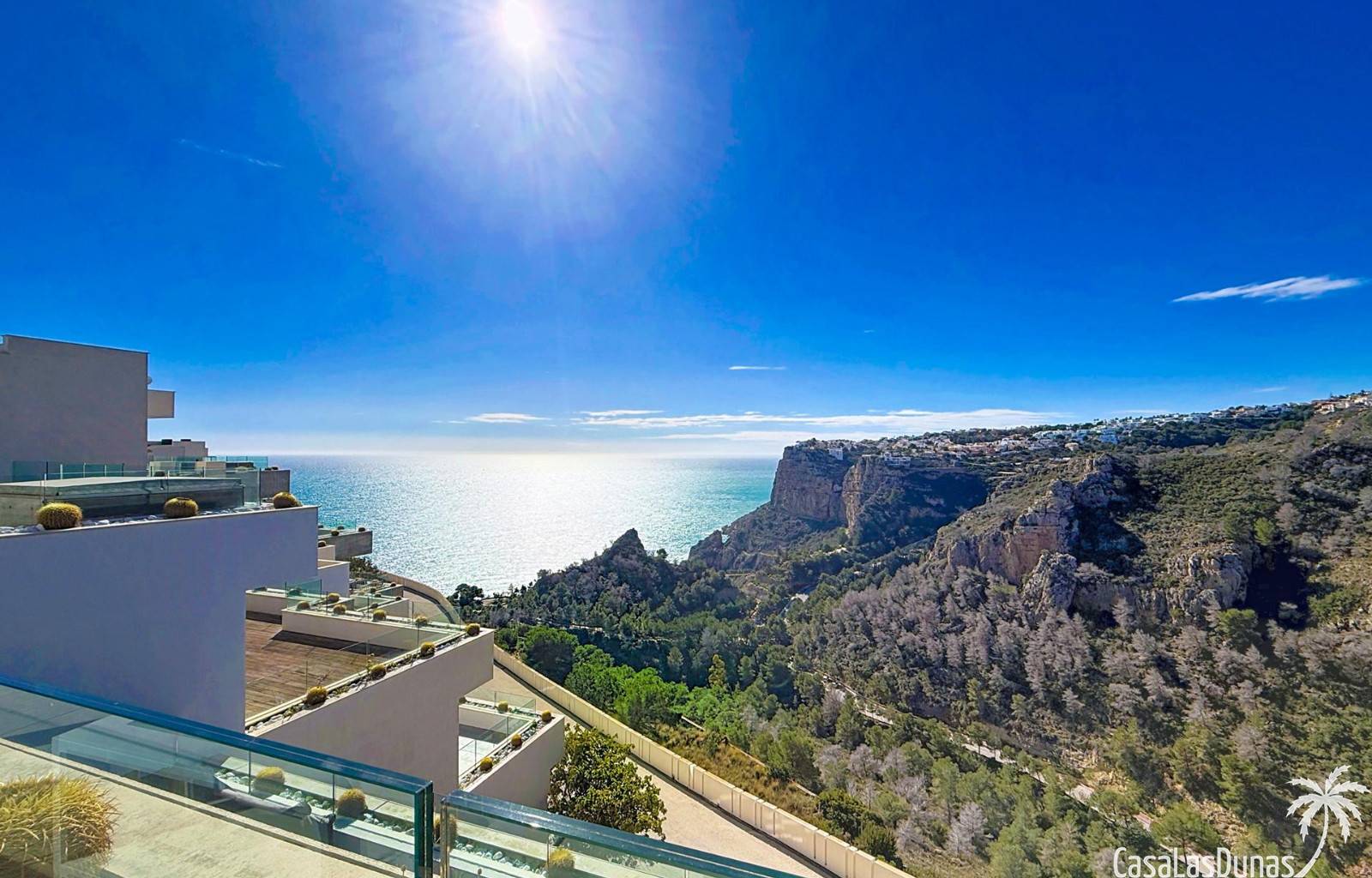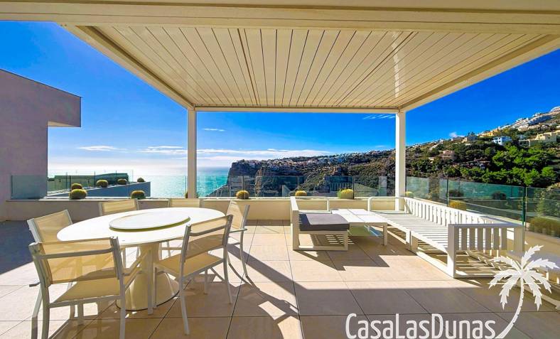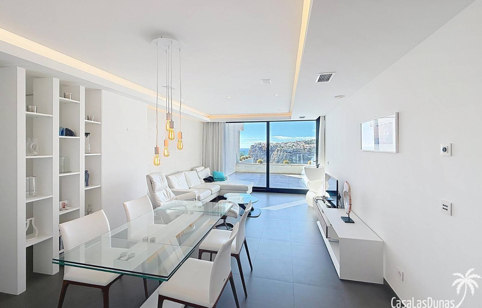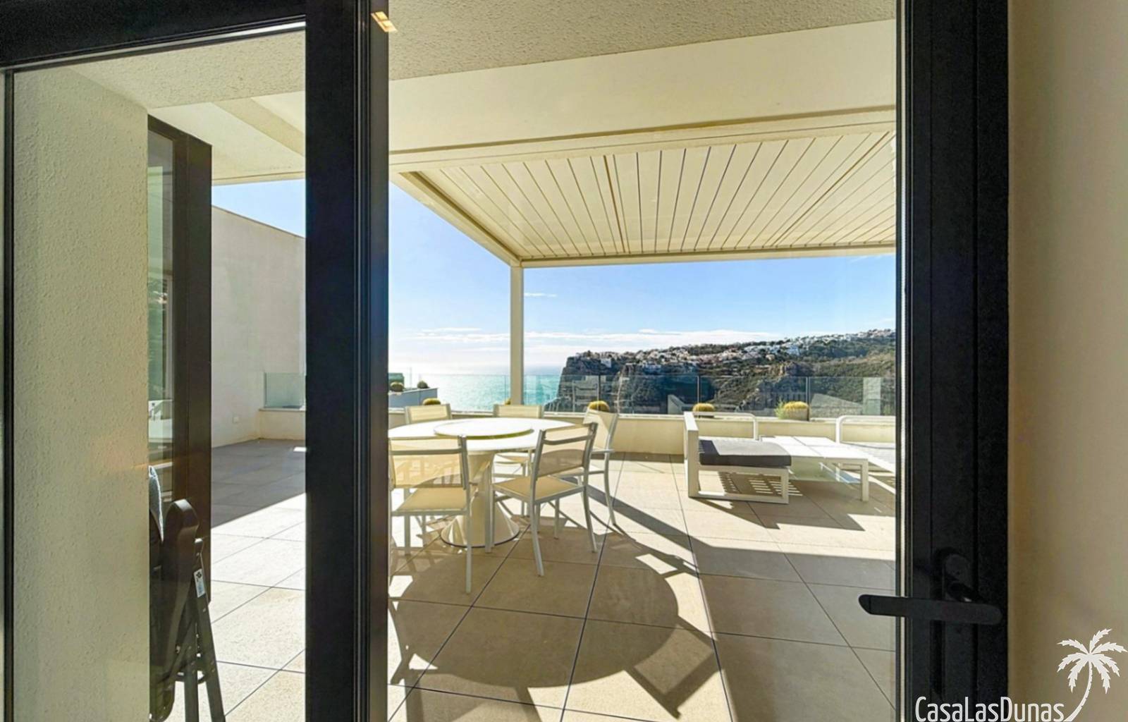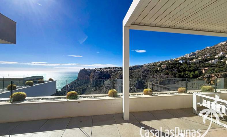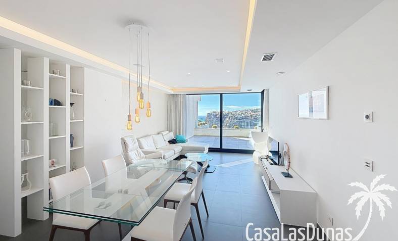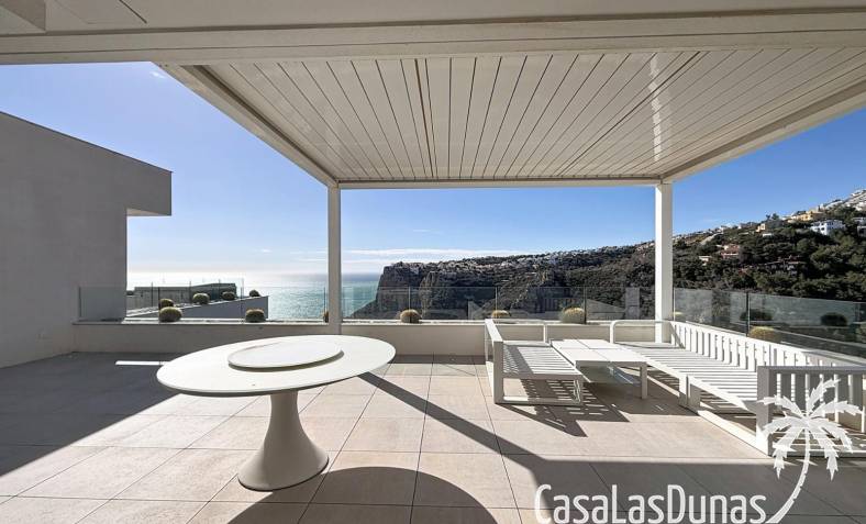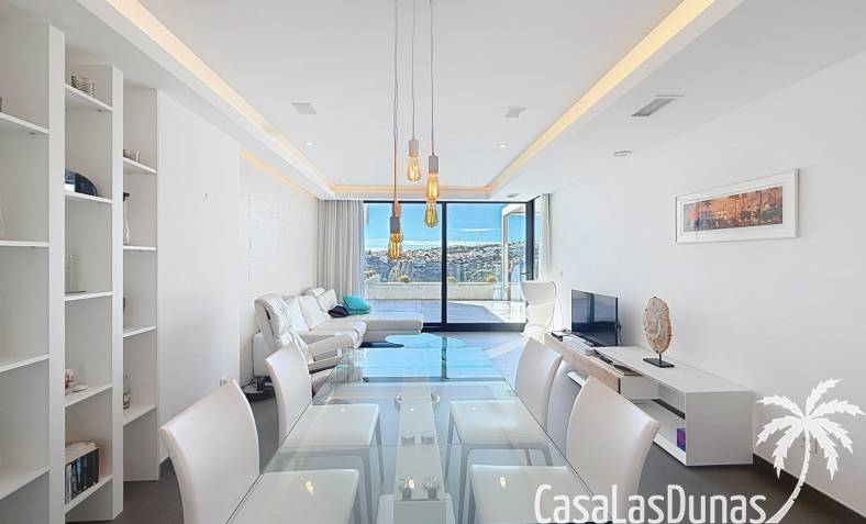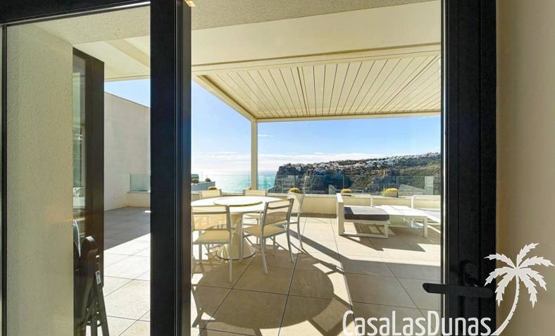 Dieses Penthouse in erster Reihe auf der Cumbre liegt auf einer Klippe mit atemberaubendem Blick auf das Mittelmeer und wurde 2015 in einem modernen Komplex mit Innen- und Außenpools erbaut. Die Immobilie bietet 122 m² Wohnfläche und eine großzügige 70 m² große Terrasse. Das Apartment umfasst eine Eingangshalle, eine Küche mit Hauswirtschaftsraum/Abstellraum, ein geräumiges Wohn-/Esszimmer, ein Gästezimmer mit separatem Bad und ein geräumiges Hauptschlafzimmer mit eigenem Bad. Das Apartment bietet eine optimale Raumaufteilung mit Zugang zur vorderen Terrasse vom Wohnbereich und von beiden Schlafzimmern. Ursprünglich war es eine Dreizimmerwohnung, wobei ein Schlafzimmer für mehr Wohnraum geopfert wurde.