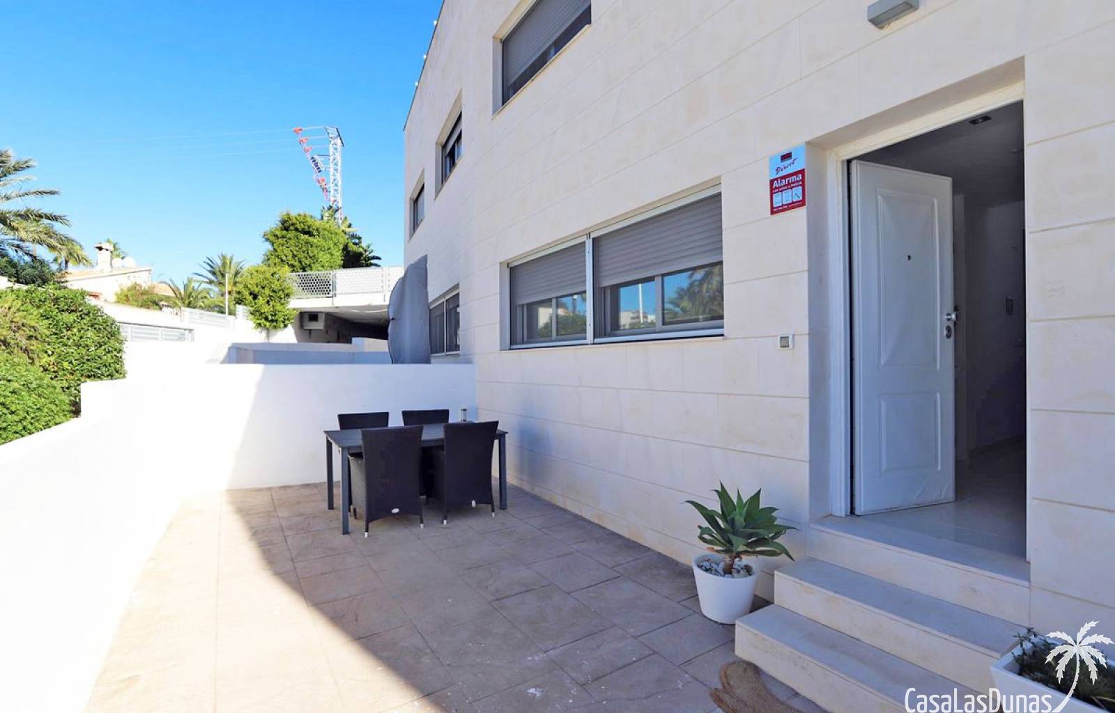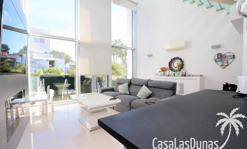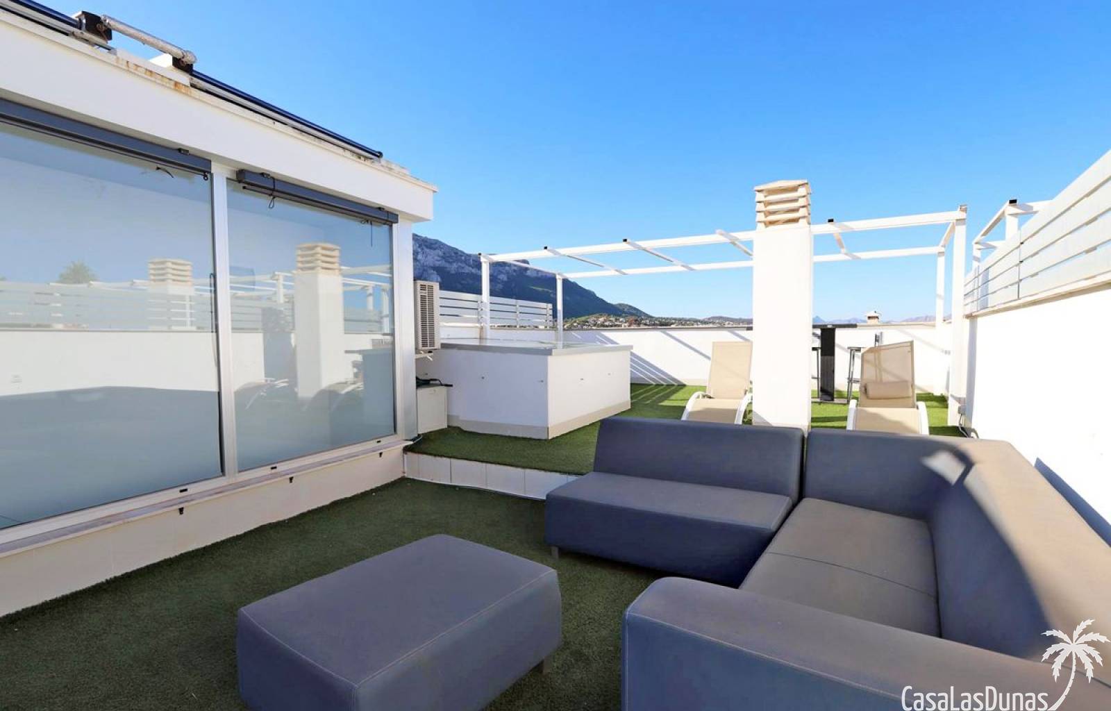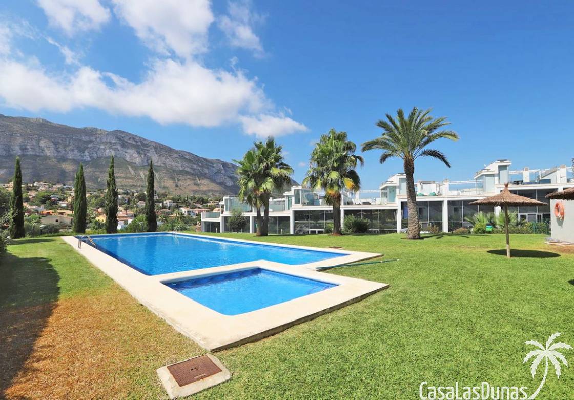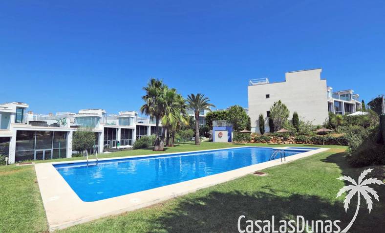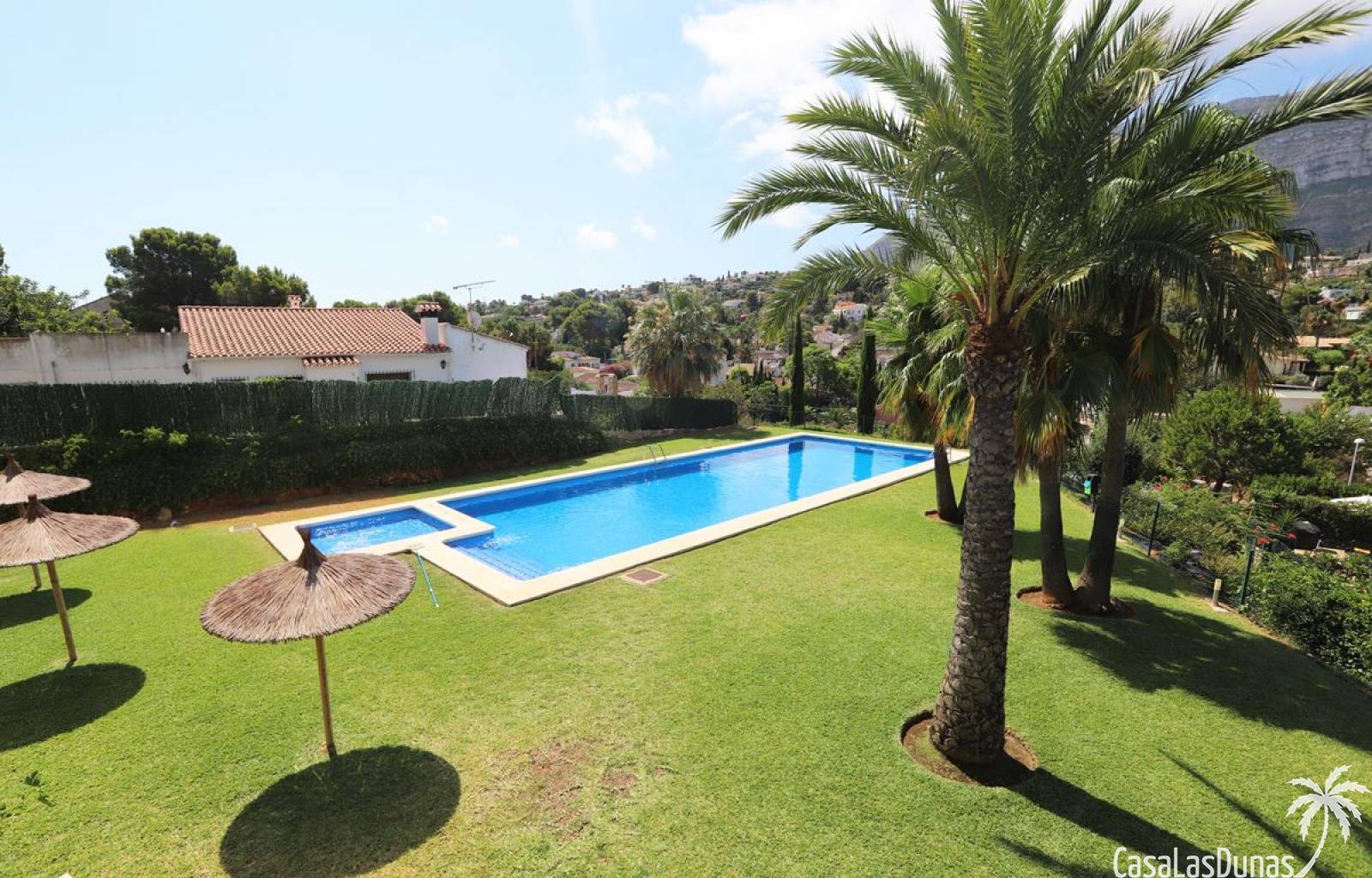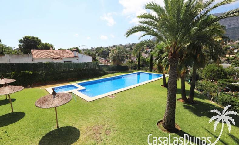 Dieses moderne Doppelhaus befindet sich in einer kleinen Anlage, nur wenige Gehminuten vom Strand, dem Yachthafen und dem Zentrum von Denia entfernt. Das Haus wurde 2008 erbaut und bietet im Untergeschoss eine private Garage mit einem Schlafzimmer, einem Badezimmer und einer Waschküche. Auf der Hauptebene befinden sich ein geräumiges Wohn-/Esszimmer mit hoher Decke, eine offene Küche und ein Schlafzimmer mit eigenem Bad. Vom Wohnzimmer aus haben Sie über große Glastüren Zugang zur nach Südosten ausgerichteten Gartenterrasse. Über eine moderne Treppe gelangt man in den ersten Stock, wo sich zwei Schlafzimmer und ein Badezimmer mit Badewanne befinden. Schließlich gibt es eine wunderschöne Dachterrasse mit herrlicher Aussicht auf den Montgo. Das gesamte Gebäude ist mit einer Hausautomationssteuerung, Warmwasser über Solarmodule und einer Klimaanlage (warm/kalt) ausgestattet. Der Komplex ist makellos gepflegt und verfügt über einen großen Gemeinschaftspool mit altem Baumbestand, Südausrichtung und Blick auf den Montgo sowie einen Paddle-Tennisplatz.