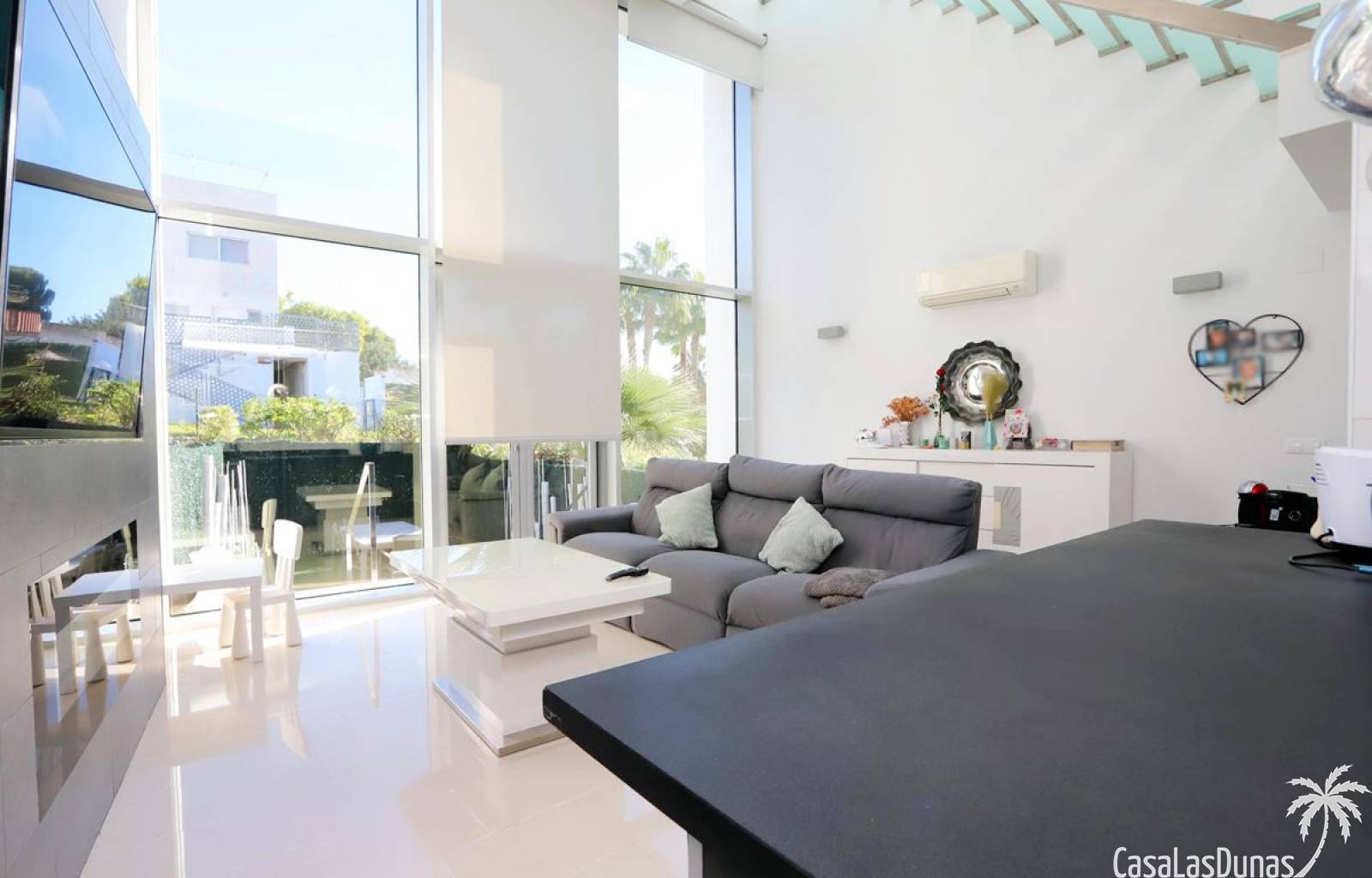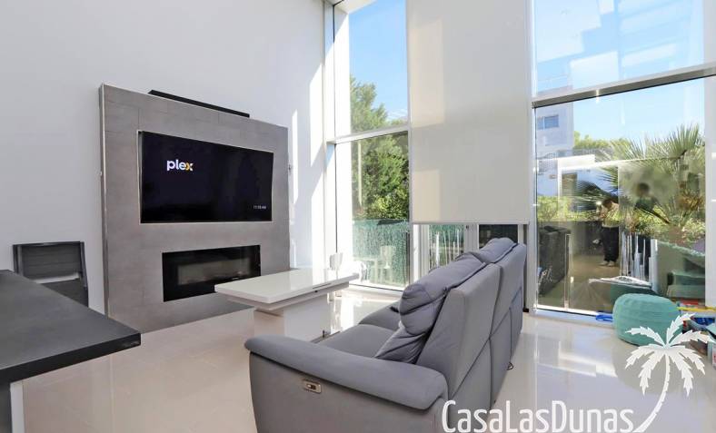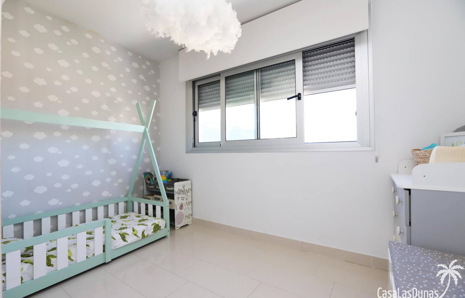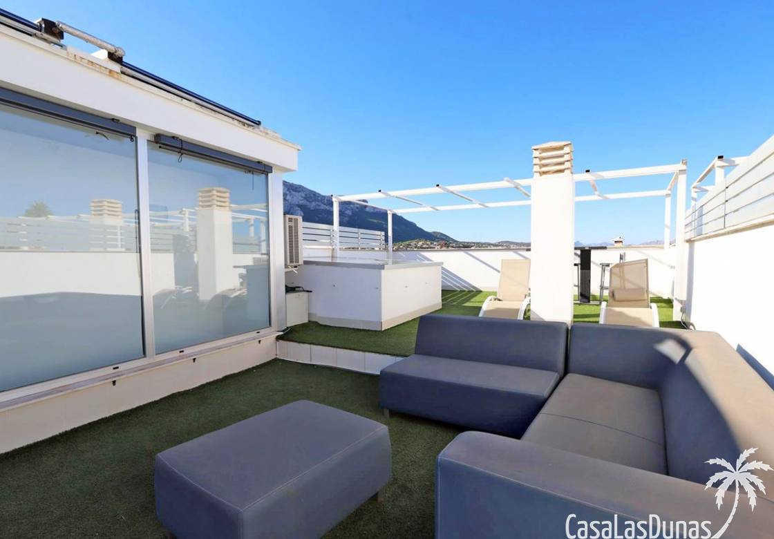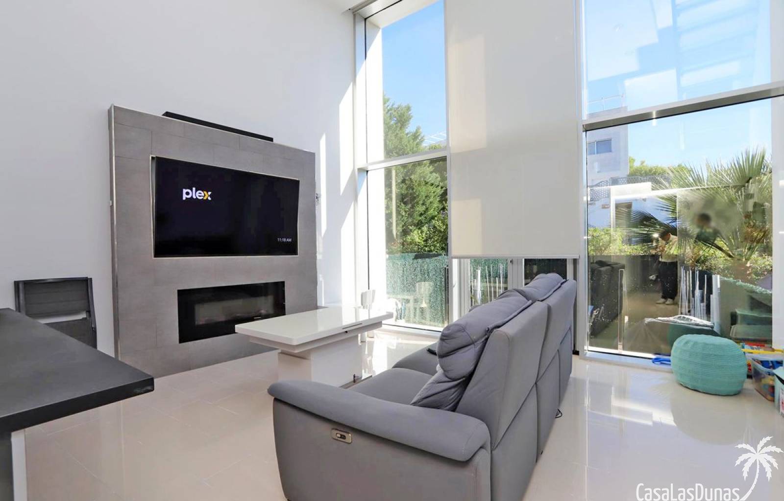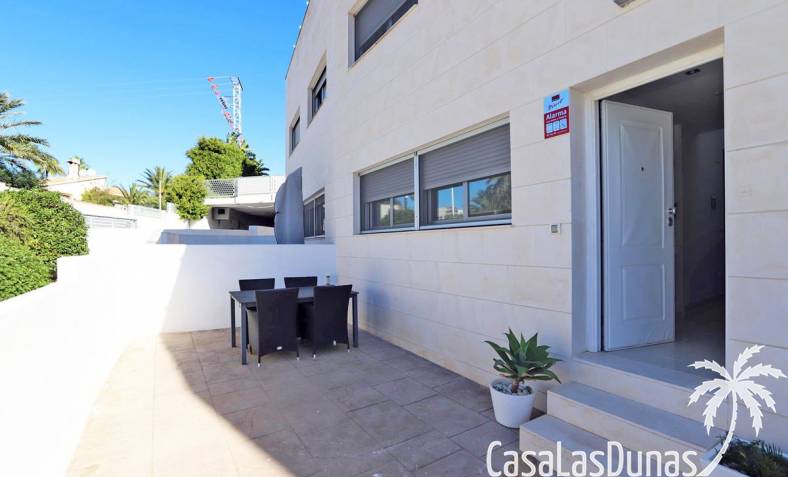 Dieses moderne Doppelhaus befindet sich in einer kleinen Anlage, nur wenige Gehminuten vom Strand, dem Yachthafen und dem Zentrum von Denia entfernt. Das Haus wurde 2008 erbaut und bietet im Untergeschoss eine private Garage mit einem Schlafzimmer, einem Badezimmer und einer Waschküche. Auf der Hauptebene befinden sich ein geräumiges Wohn-/Esszimmer mit hoher Decke, eine offene Küche und ein Schlafzimmer mit eigenem Bad. Vom Wohnzimmer aus haben Sie über große Glastüren Zugang zur nach Südosten ausgerichteten Gartenterrasse. Über eine moderne Treppe gelangt man in den ersten Stock, wo sich zwei Schlafzimmer und ein Badezimmer mit Badewanne befinden. Schließlich gibt es eine wunderschöne Dachterrasse mit herrlicher Aussicht auf den Montgo. Das gesamte Gebäude ist mit einer Hausautomationssteuerung, Warmwasser über Solarmodule und einer Klimaanlage (warm/kalt) ausgestattet. Der Komplex ist makellos gepflegt und verfügt über einen großen Gemeinschaftspool mit altem Baumbestand, Südausrichtung und Blick auf den Montgo sowie einen Paddle-Tennisplatz.