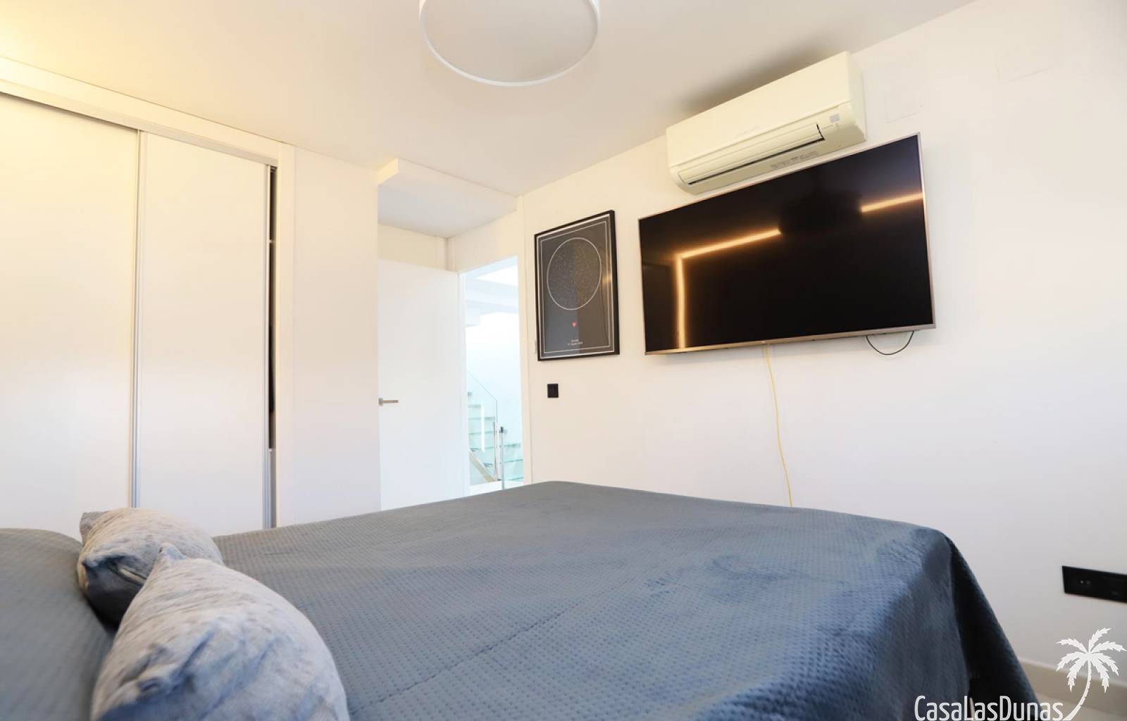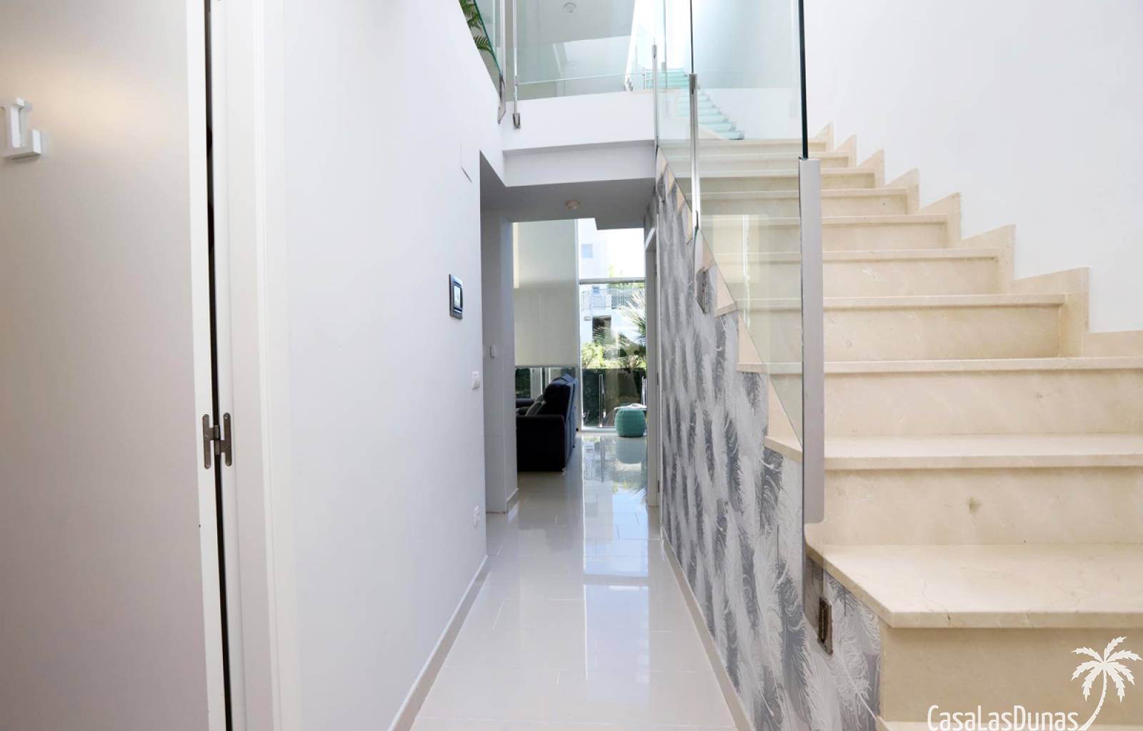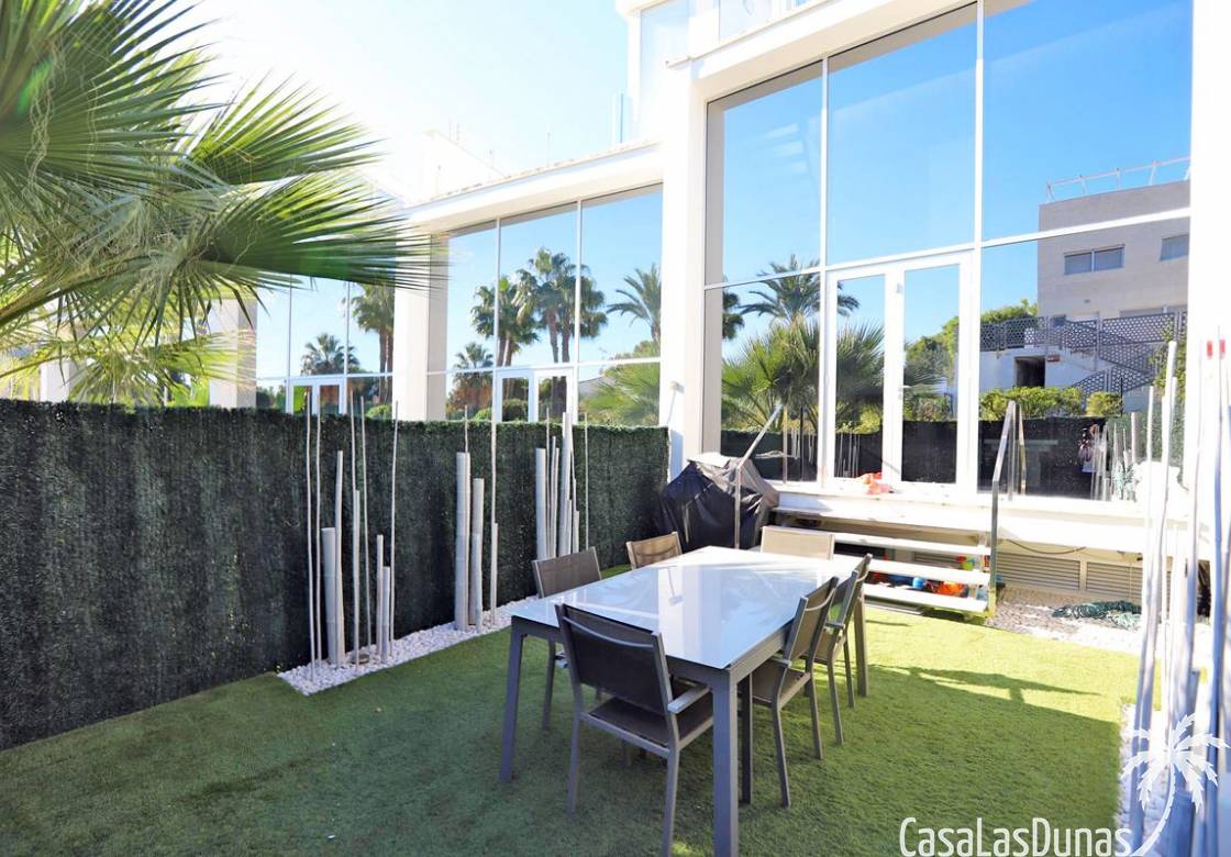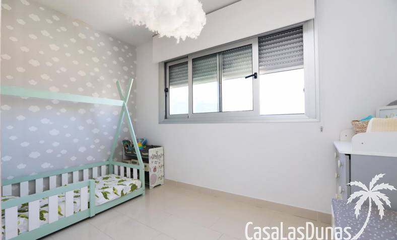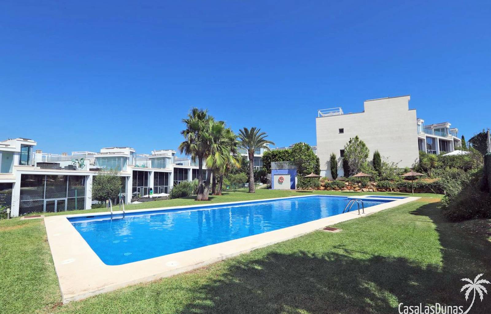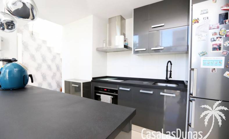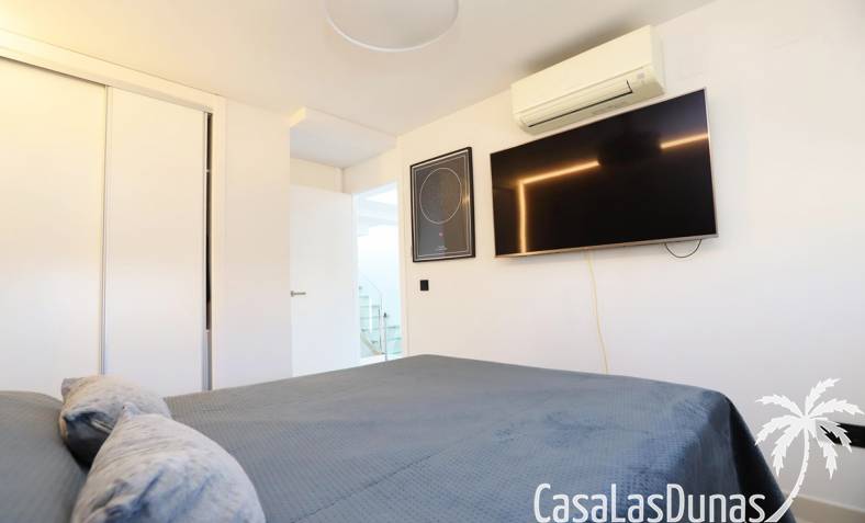 Dieses moderne Doppelhaus befindet sich in einer kleinen Anlage, nur wenige Gehminuten vom Strand, dem Yachthafen und dem Zentrum von Denia entfernt. Das Haus wurde 2008 erbaut und bietet im Untergeschoss eine private Garage mit einem Schlafzimmer, einem Badezimmer und einer Waschküche. Auf der Hauptebene befinden sich ein geräumiges Wohn-/Esszimmer mit hoher Decke, eine offene Küche und ein Schlafzimmer mit eigenem Bad. Vom Wohnzimmer aus haben Sie über große Glastüren Zugang zur nach Südosten ausgerichteten Gartenterrasse. Über eine moderne Treppe gelangt man in den ersten Stock, wo sich zwei Schlafzimmer und ein Badezimmer mit Badewanne befinden. Schließlich gibt es eine wunderschöne Dachterrasse mit herrlicher Aussicht auf den Montgo. Das gesamte Gebäude ist mit einer Hausautomationssteuerung, Warmwasser über Solarmodule und einer Klimaanlage (warm/kalt) ausgestattet. Der Komplex ist makellos gepflegt und verfügt über einen großen Gemeinschaftspool mit altem Baumbestand, Südausrichtung und Blick auf den Montgo sowie einen Paddle-Tennisplatz.