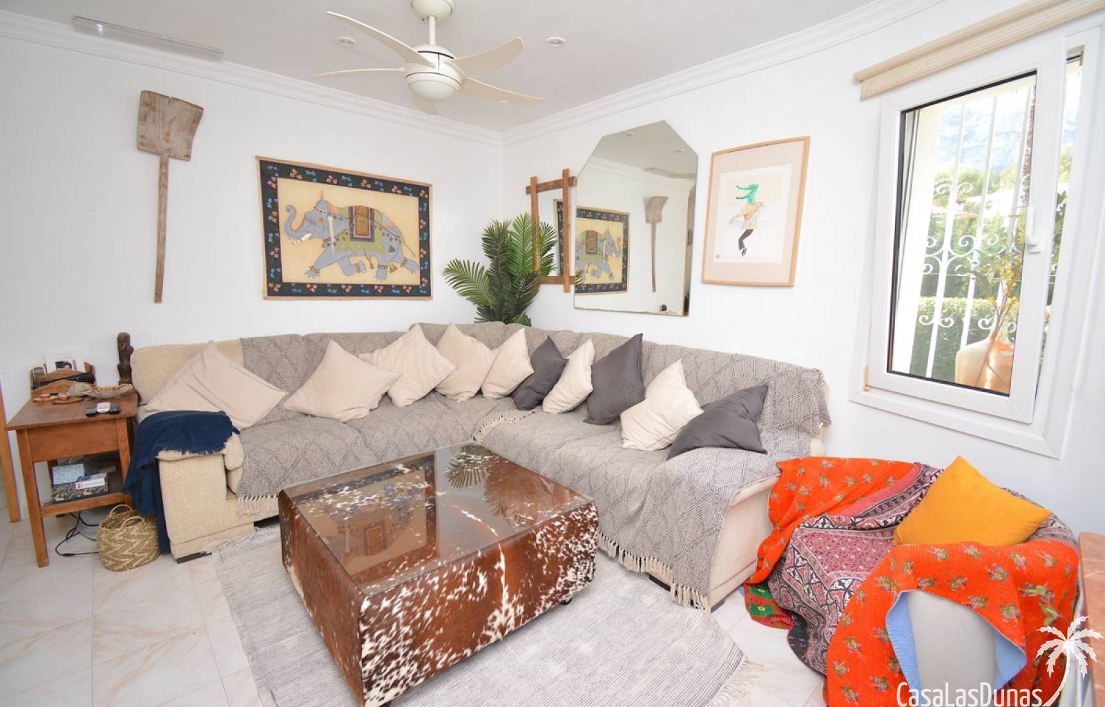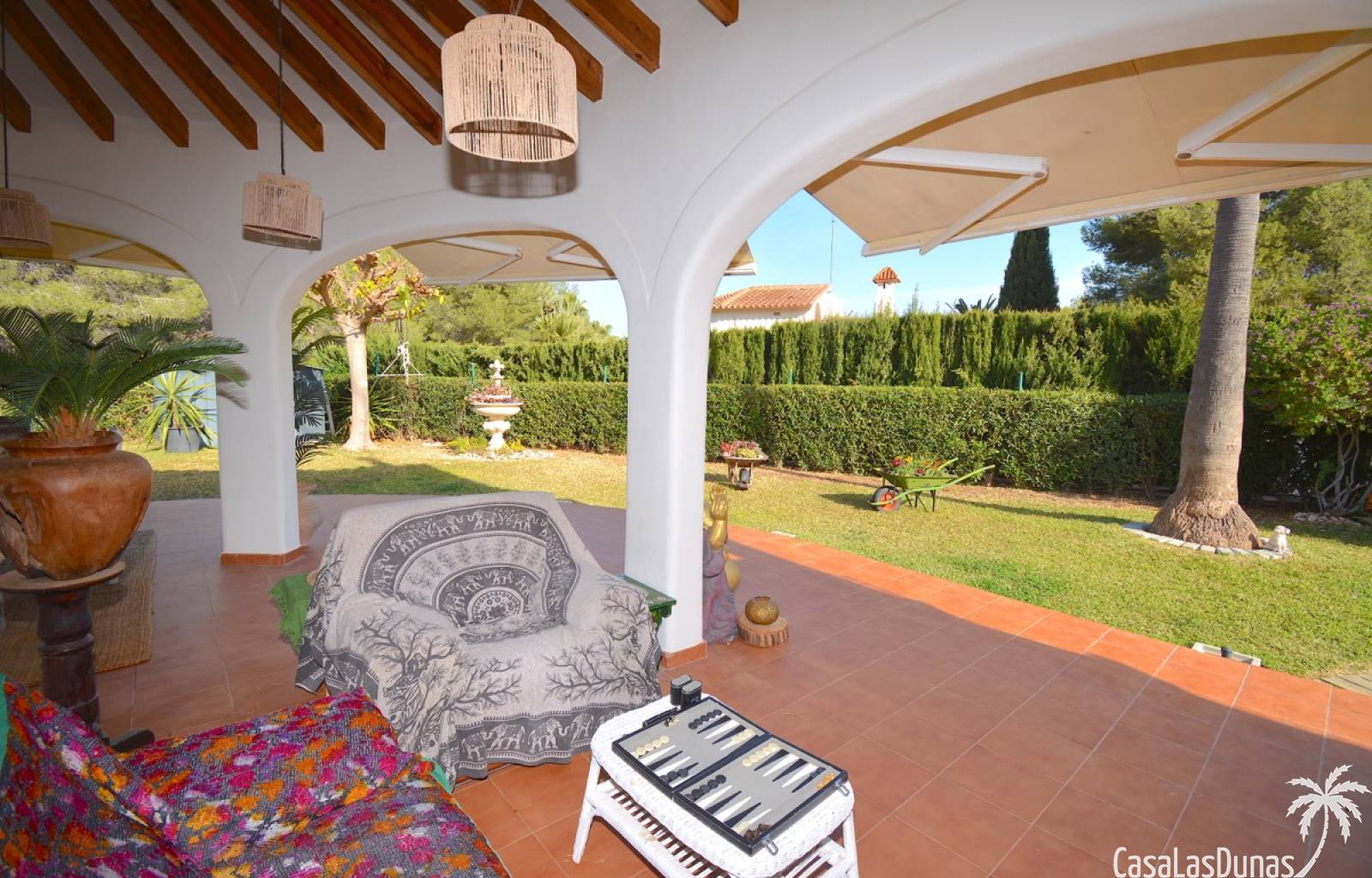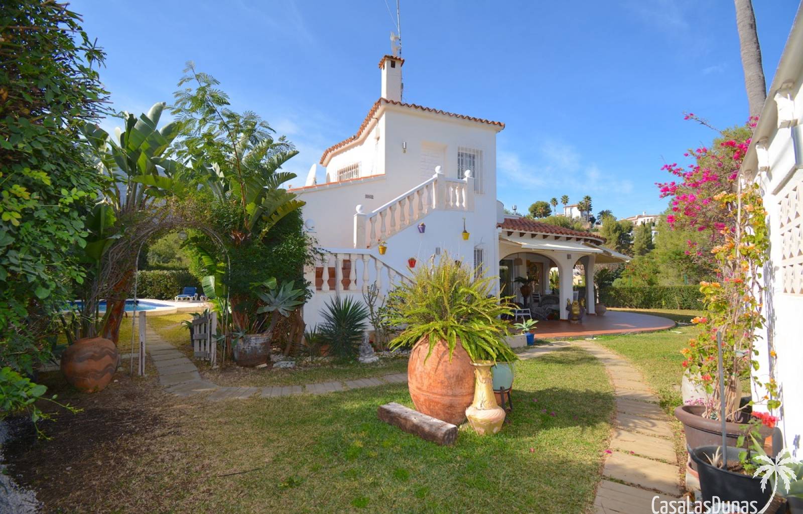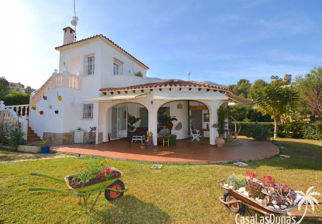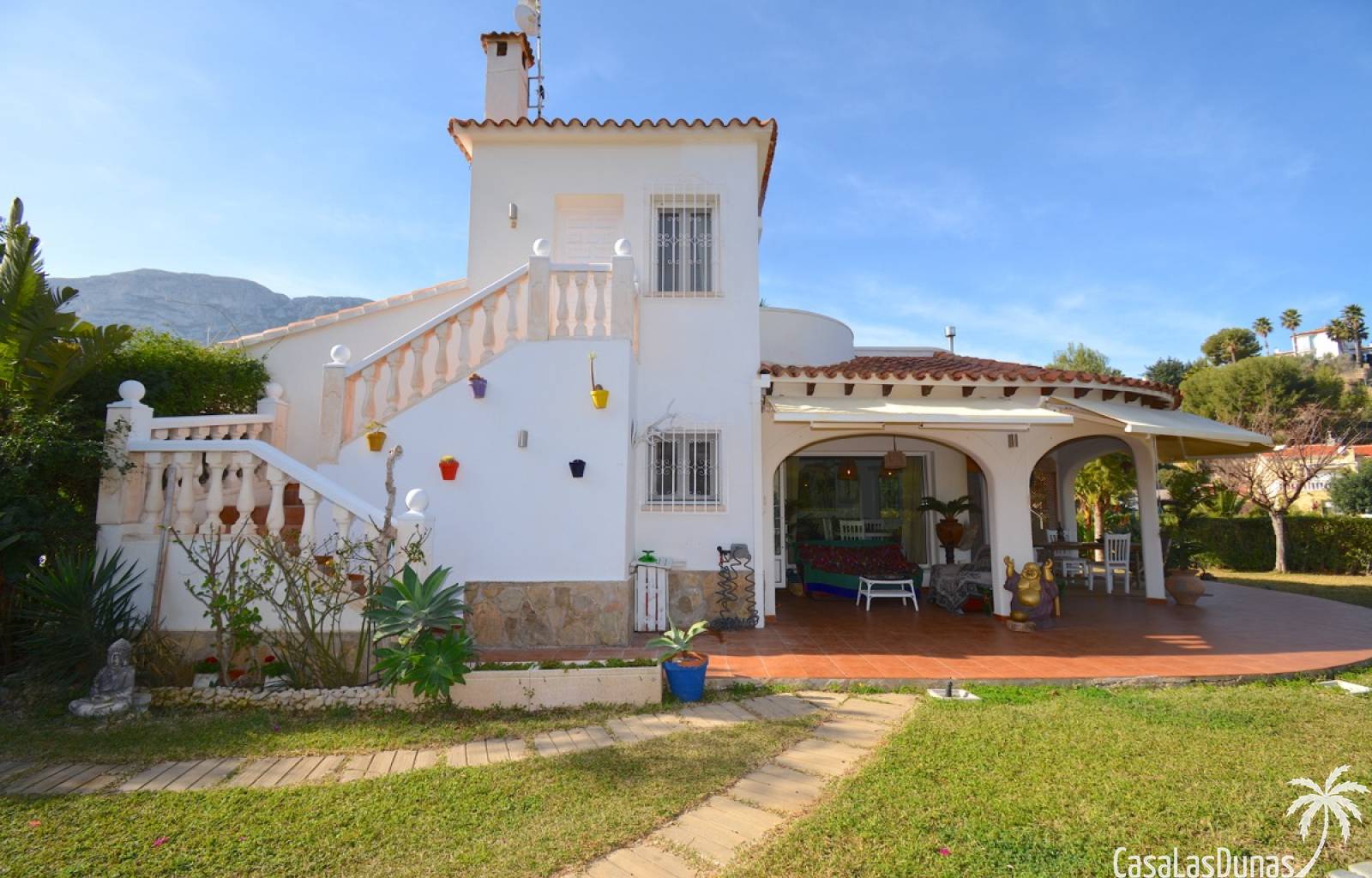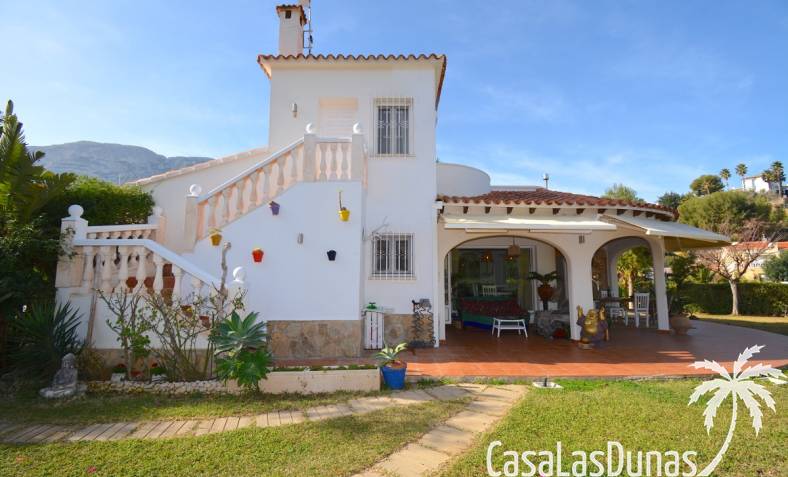 Wunderschöne Villa in begehrter Wohnlage nahe Las Rotas mit guter Anbindung an die Stadt. Das ebene, sonnige 808 m² große Grundstück bietet einen schönen Garten, einen Swimmingpool, einen Grillplatz und eine Garage. Das 160 m² große Haus erstreckt sich über drei Etagen. Der Hauptwohnbereich befindet sich im Erdgeschoss und umfasst zwei separate Apartments, die jeweils über eine Außentreppe erreichbar sind: eines im ersten Stock und das andere im Souterrain. Das Erdgeschoss besteht aus einem hellen Wohn-Esszimmer mit Zugang zur überdachten Terrasse (Naya), einer Küche, zwei geräumigen Schlafzimmern und zwei Badezimmern (eines davon en suite). Im Obergeschoss befindet sich ein Schlafzimmer mit Bad en suite und einer Terrasse mit Blick auf den Montgó und teilweisem Meerblick. Das Souterrain umfasst ein Wohnzimmer, eine Küche, ein Schlafzimmer, ein Ankleidezimmer und ein Badezimmer. Die Villa wurde 1995 erbaut und später renoviert. Sie verfügt über eine Lizenz zur touristischen Vermietung und ist mit einer Split-Klimaanlage (Heizung und Kühlung) ausgestattet.