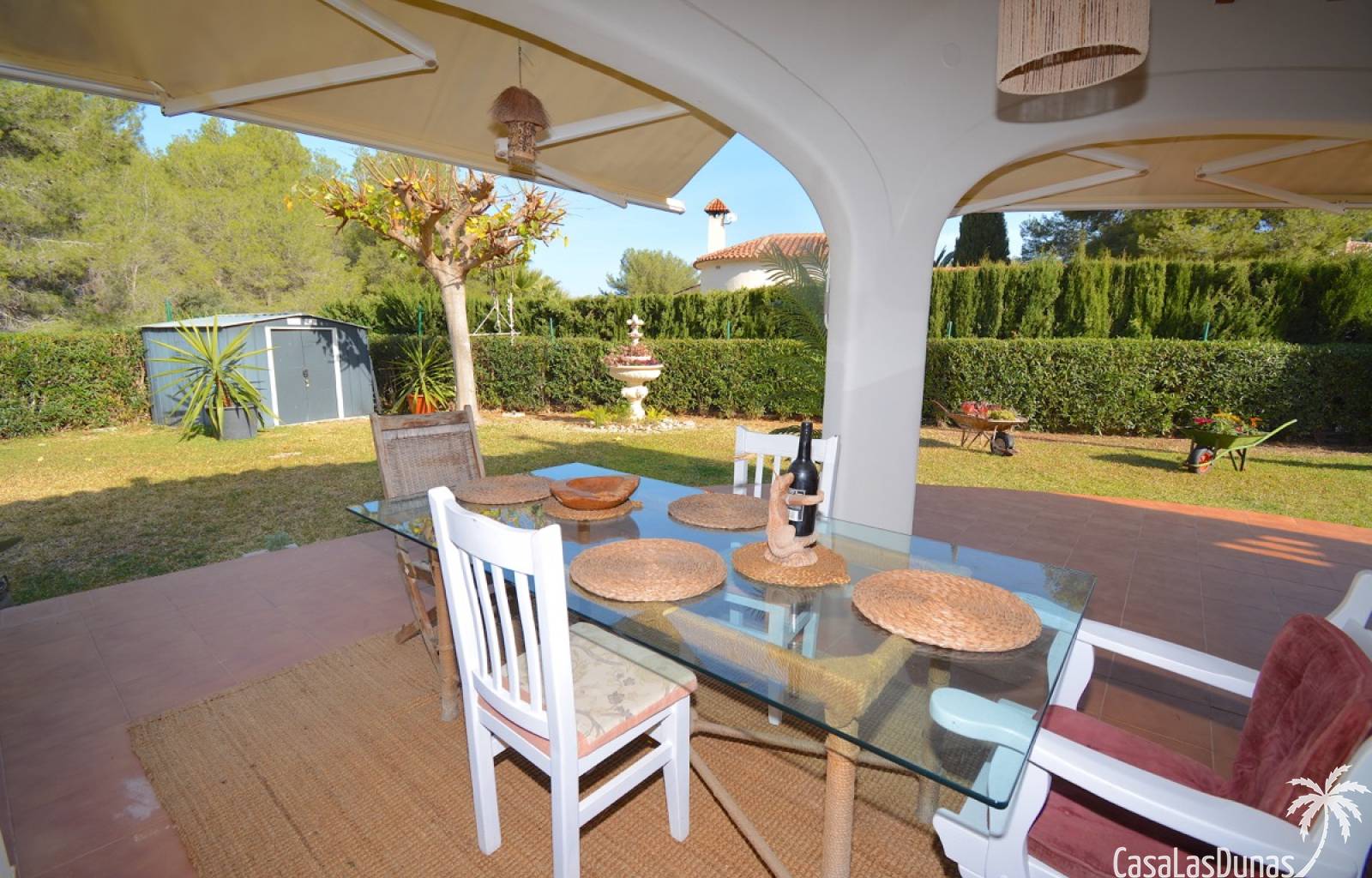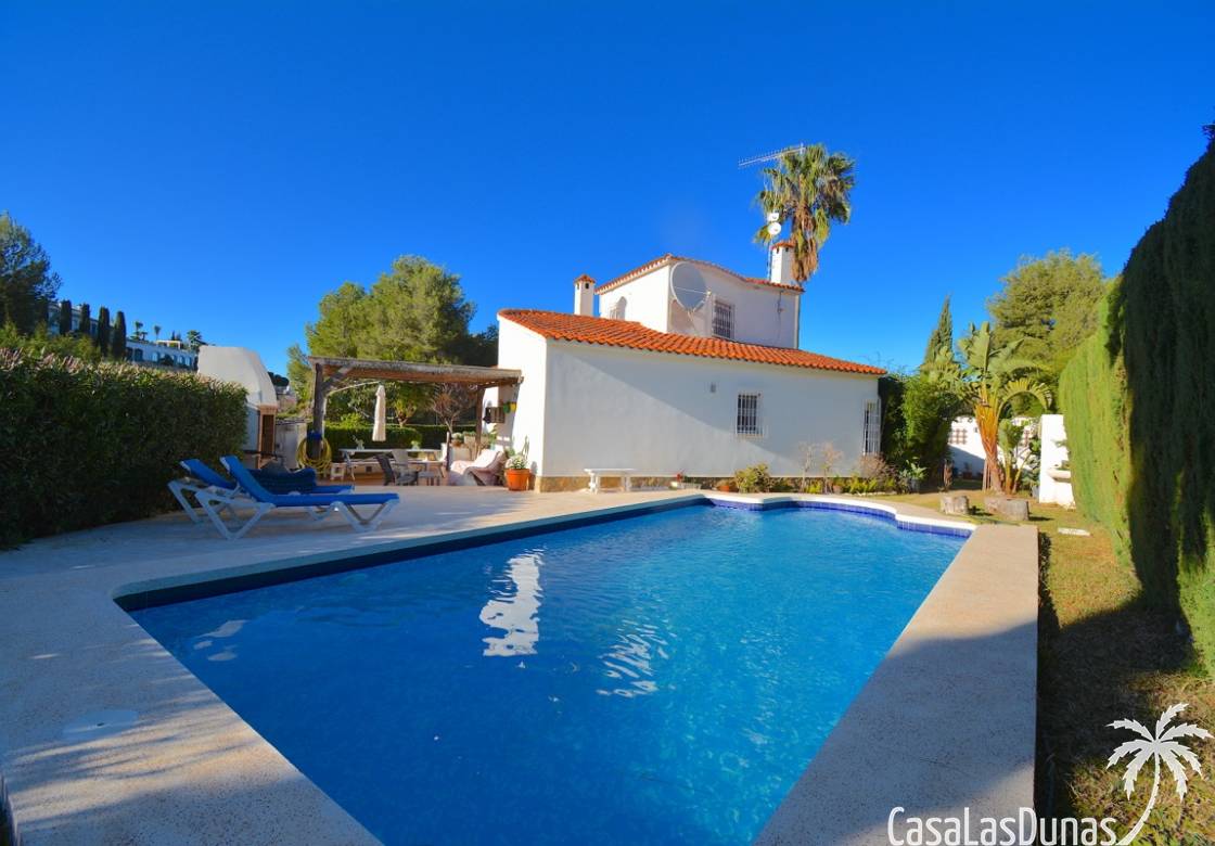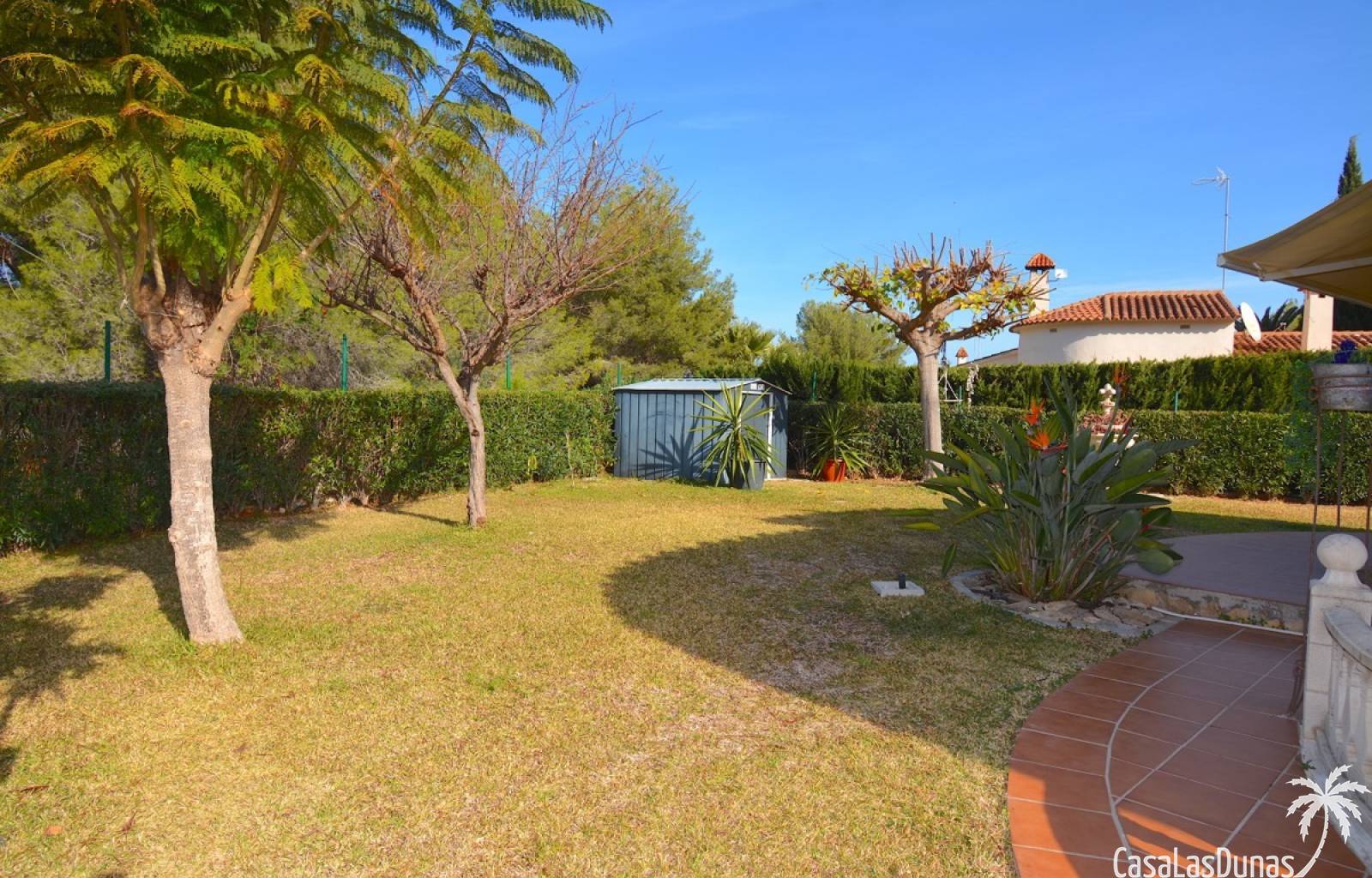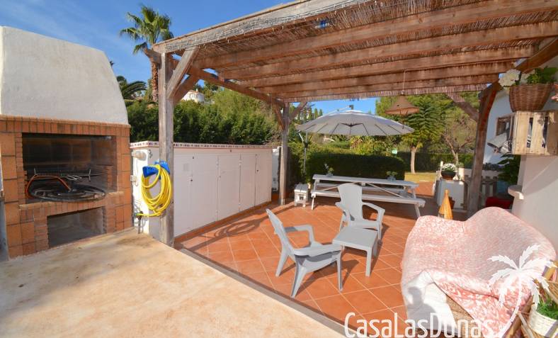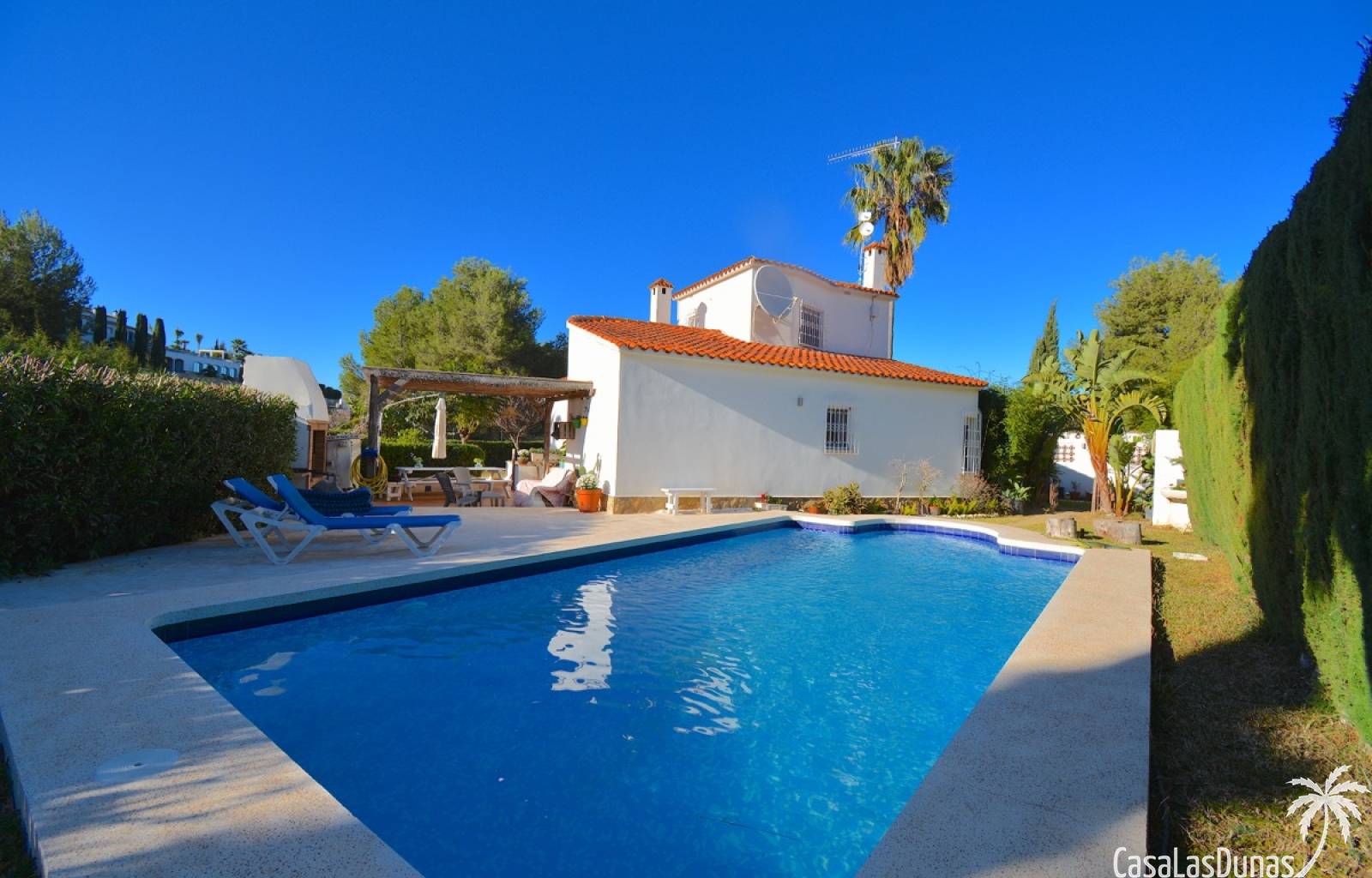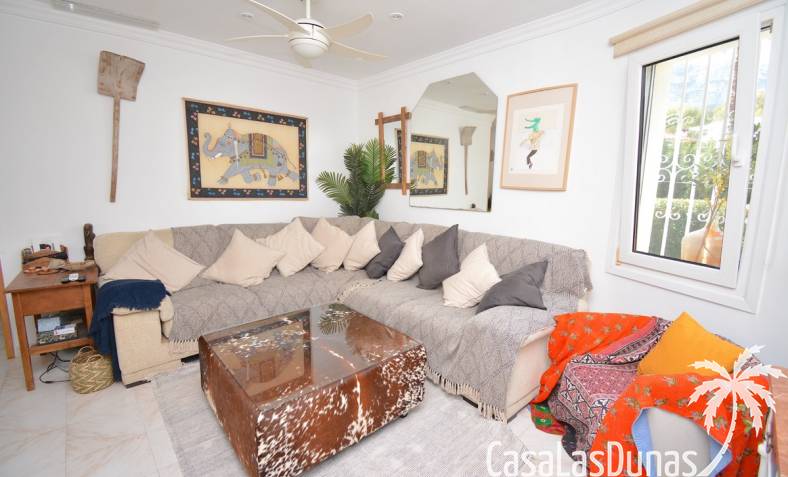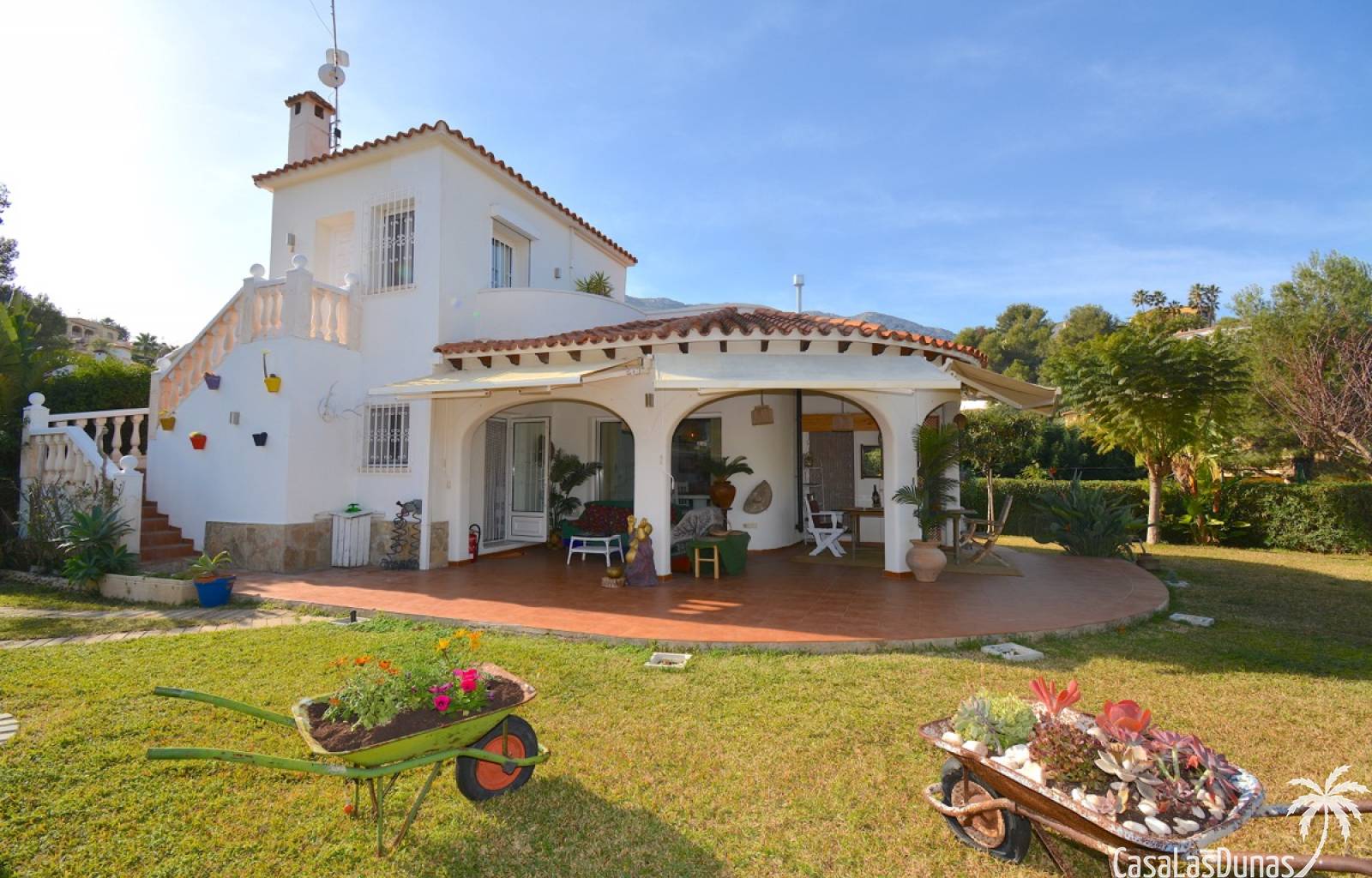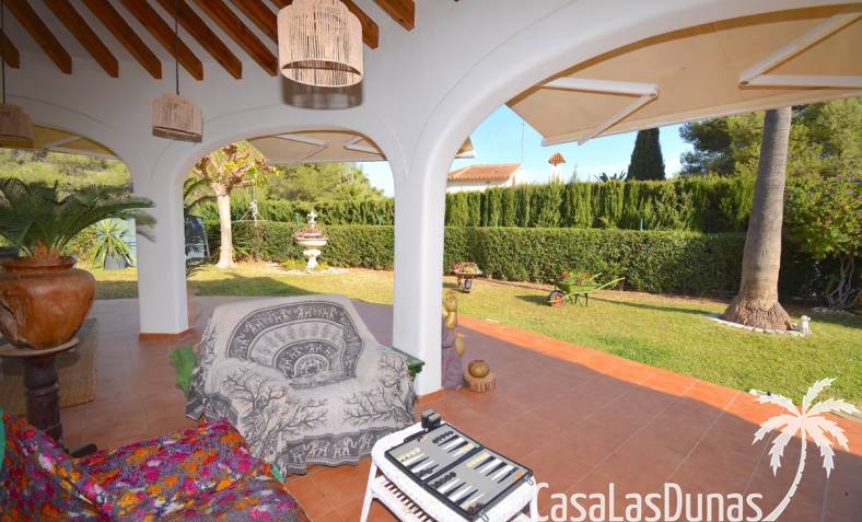 Wunderschöne Villa in begehrter Wohnlage nahe Las Rotas mit guter Anbindung an die Stadt. Das ebene, sonnige 808 m² große Grundstück bietet einen schönen Garten, einen Swimmingpool, einen Grillplatz und eine Garage. Das 160 m² große Haus erstreckt sich über drei Etagen. Der Hauptwohnbereich befindet sich im Erdgeschoss und umfasst zwei separate Apartments, die jeweils über eine Außentreppe erreichbar sind: eines im ersten Stock und das andere im Souterrain. Das Erdgeschoss besteht aus einem hellen Wohn-Esszimmer mit Zugang zur überdachten Terrasse (Naya), einer Küche, zwei geräumigen Schlafzimmern und zwei Badezimmern (eines davon en suite). Im Obergeschoss befindet sich ein Schlafzimmer mit Bad en suite und einer Terrasse mit Blick auf den Montgó und teilweisem Meerblick. Das Souterrain umfasst ein Wohnzimmer, eine Küche, ein Schlafzimmer, ein Ankleidezimmer und ein Badezimmer. Die Villa wurde 1995 erbaut und später renoviert. Sie verfügt über eine Lizenz zur touristischen Vermietung und ist mit einer Split-Klimaanlage (Heizung und Kühlung) ausgestattet.