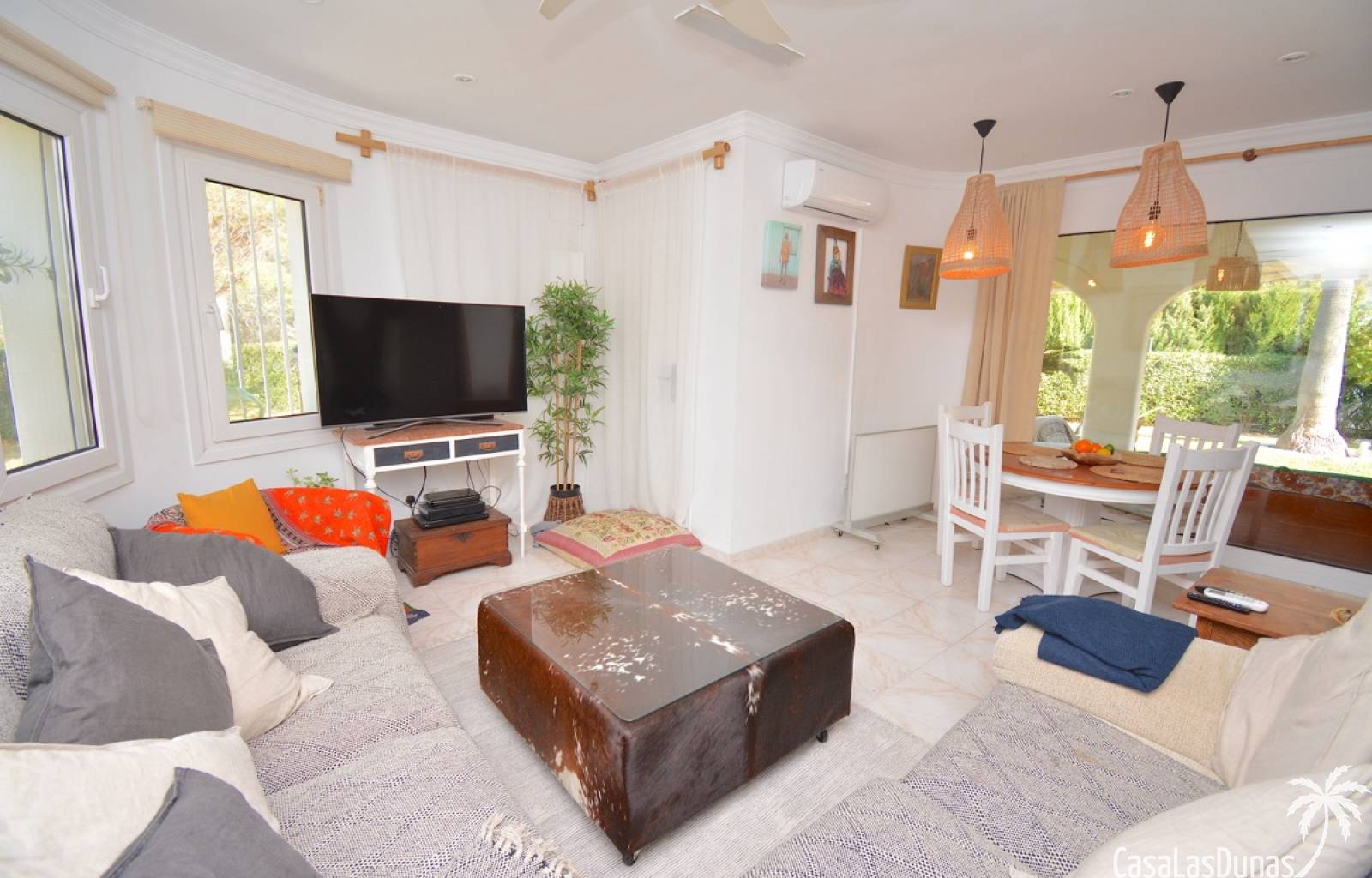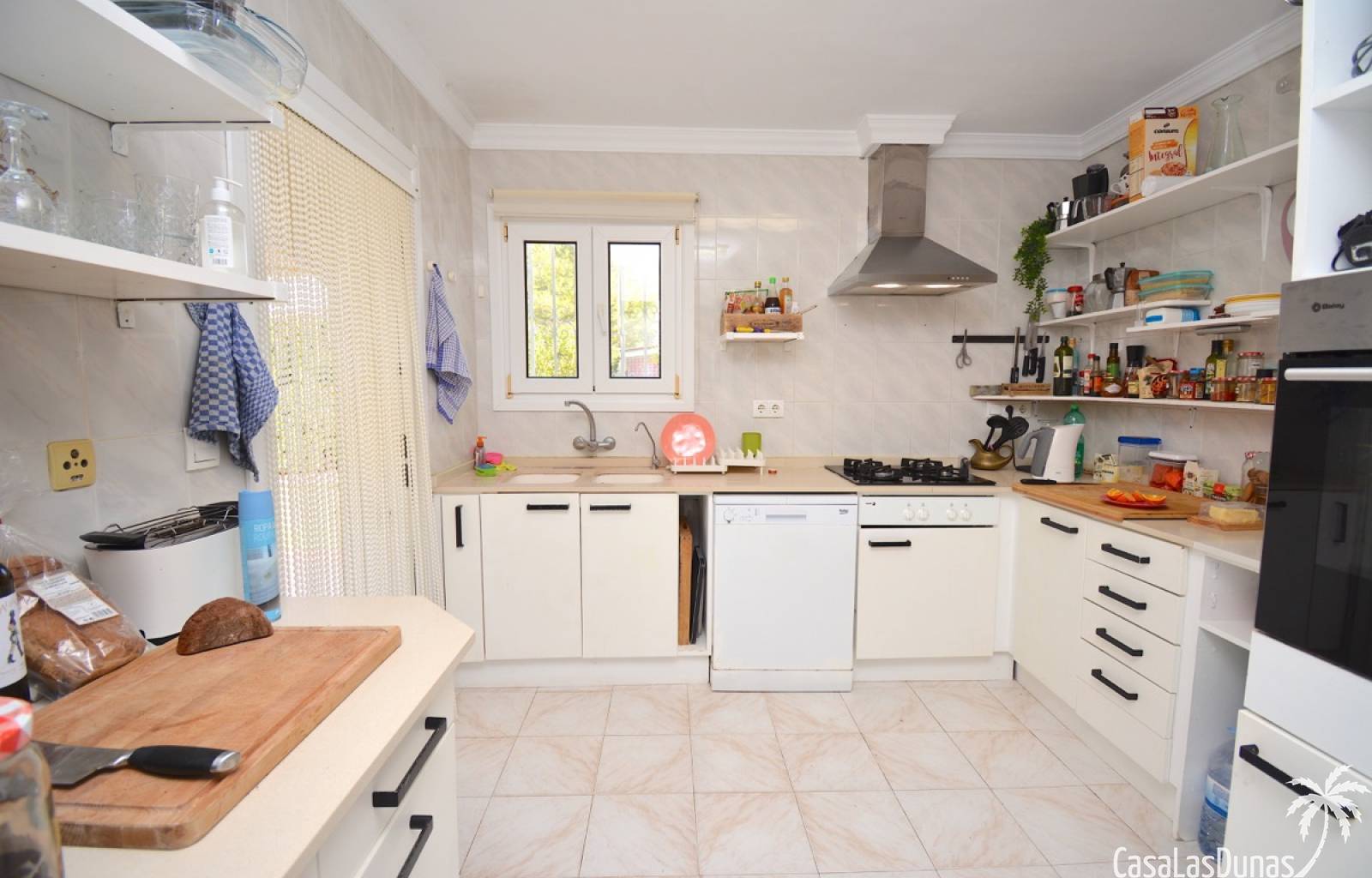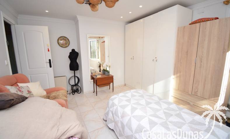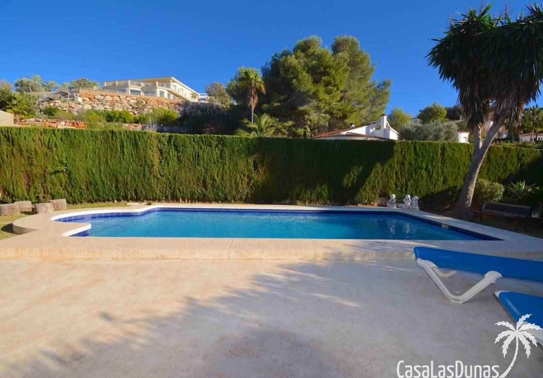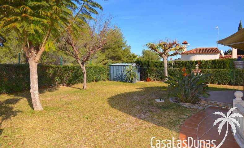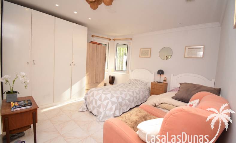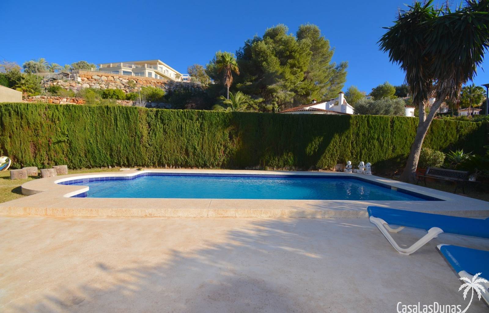 Wunderschöne Villa in begehrter Wohnlage nahe Las Rotas mit guter Anbindung an die Stadt. Das ebene, sonnige 808 m² große Grundstück bietet einen schönen Garten, einen Swimmingpool, einen Grillplatz und eine Garage. Das 160 m² große Haus erstreckt sich über drei Etagen. Der Hauptwohnbereich befindet sich im Erdgeschoss und umfasst zwei separate Apartments, die jeweils über eine Außentreppe erreichbar sind: eines im ersten Stock und das andere im Souterrain. Das Erdgeschoss besteht aus einem hellen Wohn-Esszimmer mit Zugang zur überdachten Terrasse (Naya), einer Küche, zwei geräumigen Schlafzimmern und zwei Badezimmern (eines davon en suite). Im Obergeschoss befindet sich ein Schlafzimmer mit Bad en suite und einer Terrasse mit Blick auf den Montgó und teilweisem Meerblick. Das Souterrain umfasst ein Wohnzimmer, eine Küche, ein Schlafzimmer, ein Ankleidezimmer und ein Badezimmer. Die Villa wurde 1995 erbaut und später renoviert. Sie verfügt über eine Lizenz zur touristischen Vermietung und ist mit einer Split-Klimaanlage (Heizung und Kühlung) ausgestattet.