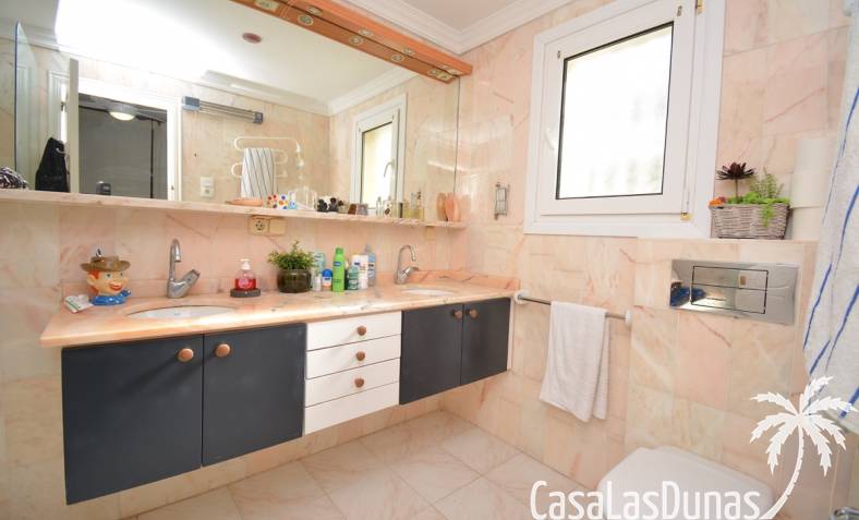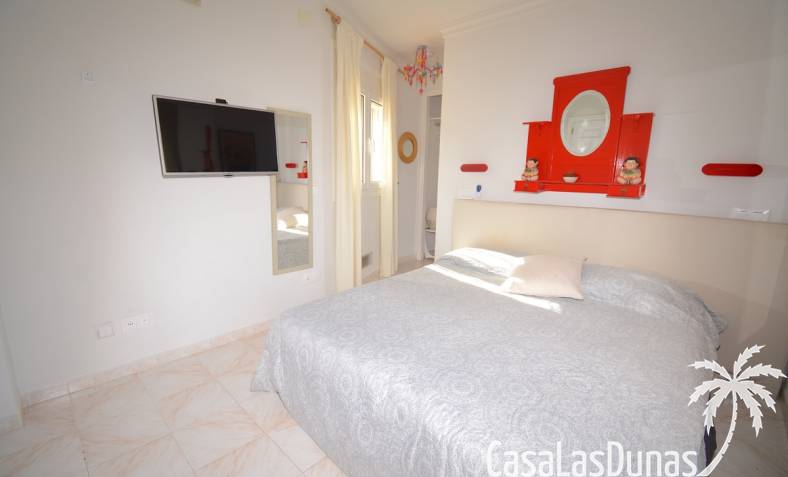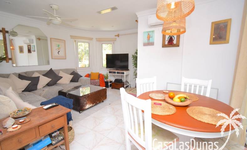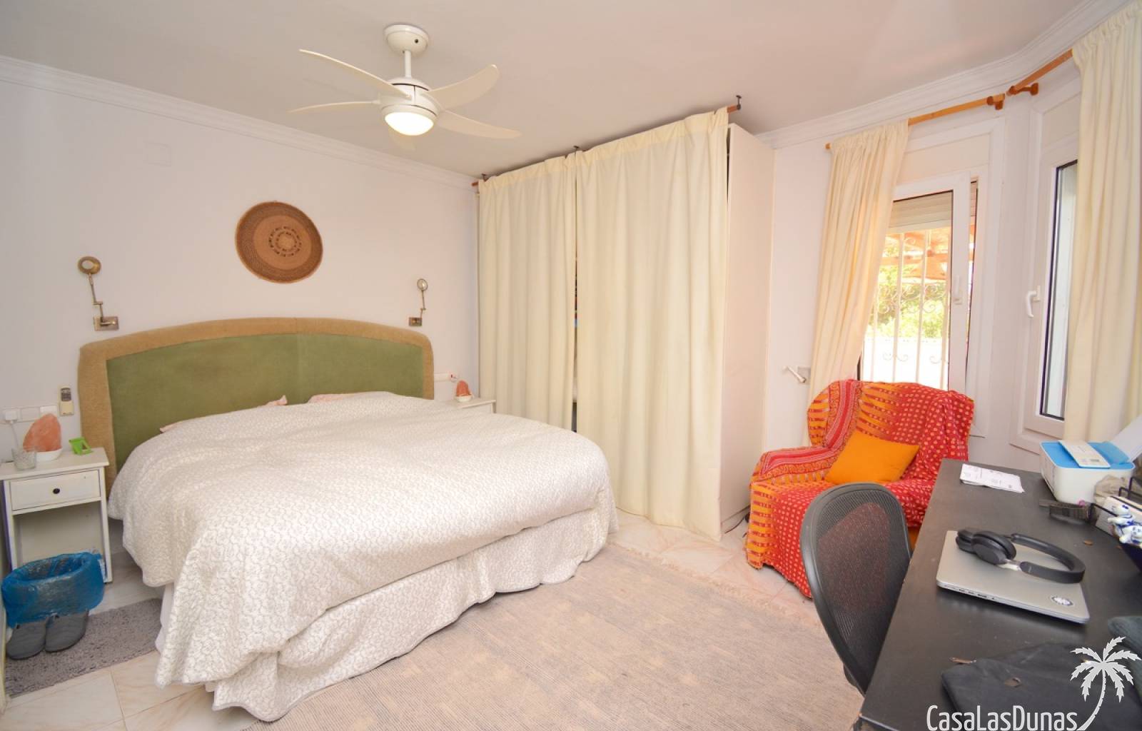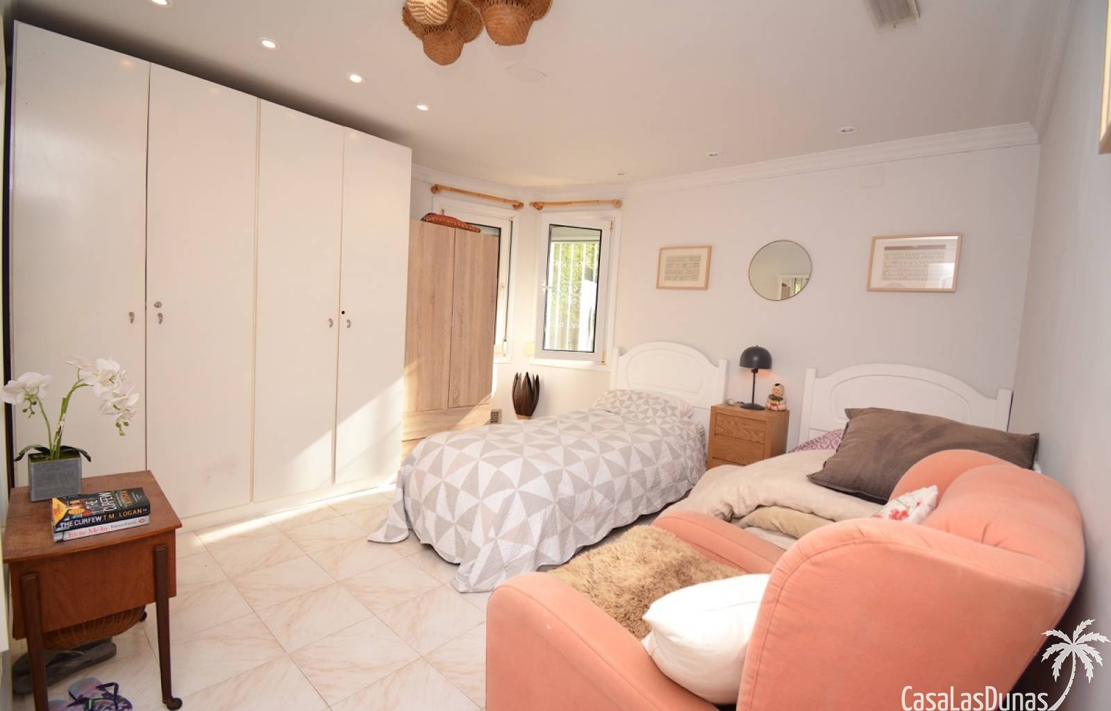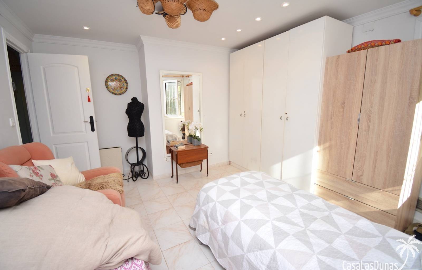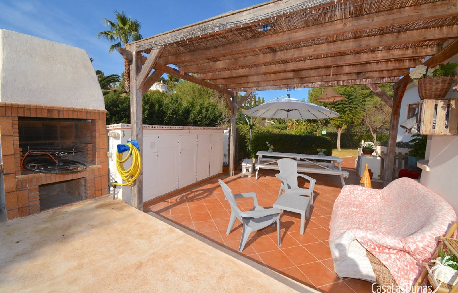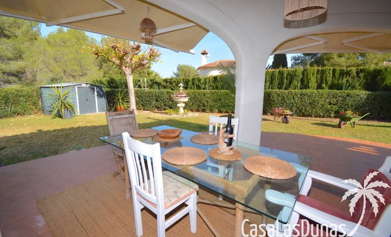 Wunderschöne Villa in begehrter Wohnlage nahe Las Rotas mit guter Anbindung an die Stadt. Das ebene, sonnige 808 m² große Grundstück bietet einen schönen Garten, einen Swimmingpool, einen Grillplatz und eine Garage. Das 160 m² große Haus erstreckt sich über drei Etagen. Der Hauptwohnbereich befindet sich im Erdgeschoss und umfasst zwei separate Apartments, die jeweils über eine Außentreppe erreichbar sind: eines im ersten Stock und das andere im Souterrain. Das Erdgeschoss besteht aus einem hellen Wohn-Esszimmer mit Zugang zur überdachten Terrasse (Naya), einer Küche, zwei geräumigen Schlafzimmern und zwei Badezimmern (eines davon en suite). Im Obergeschoss befindet sich ein Schlafzimmer mit Bad en suite und einer Terrasse mit Blick auf den Montgó und teilweisem Meerblick. Das Souterrain umfasst ein Wohnzimmer, eine Küche, ein Schlafzimmer, ein Ankleidezimmer und ein Badezimmer. Die Villa wurde 1995 erbaut und später renoviert. Sie verfügt über eine Lizenz zur touristischen Vermietung und ist mit einer Split-Klimaanlage (Heizung und Kühlung) ausgestattet.