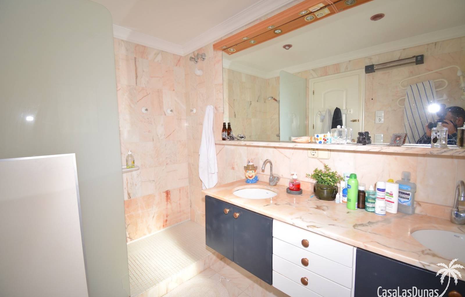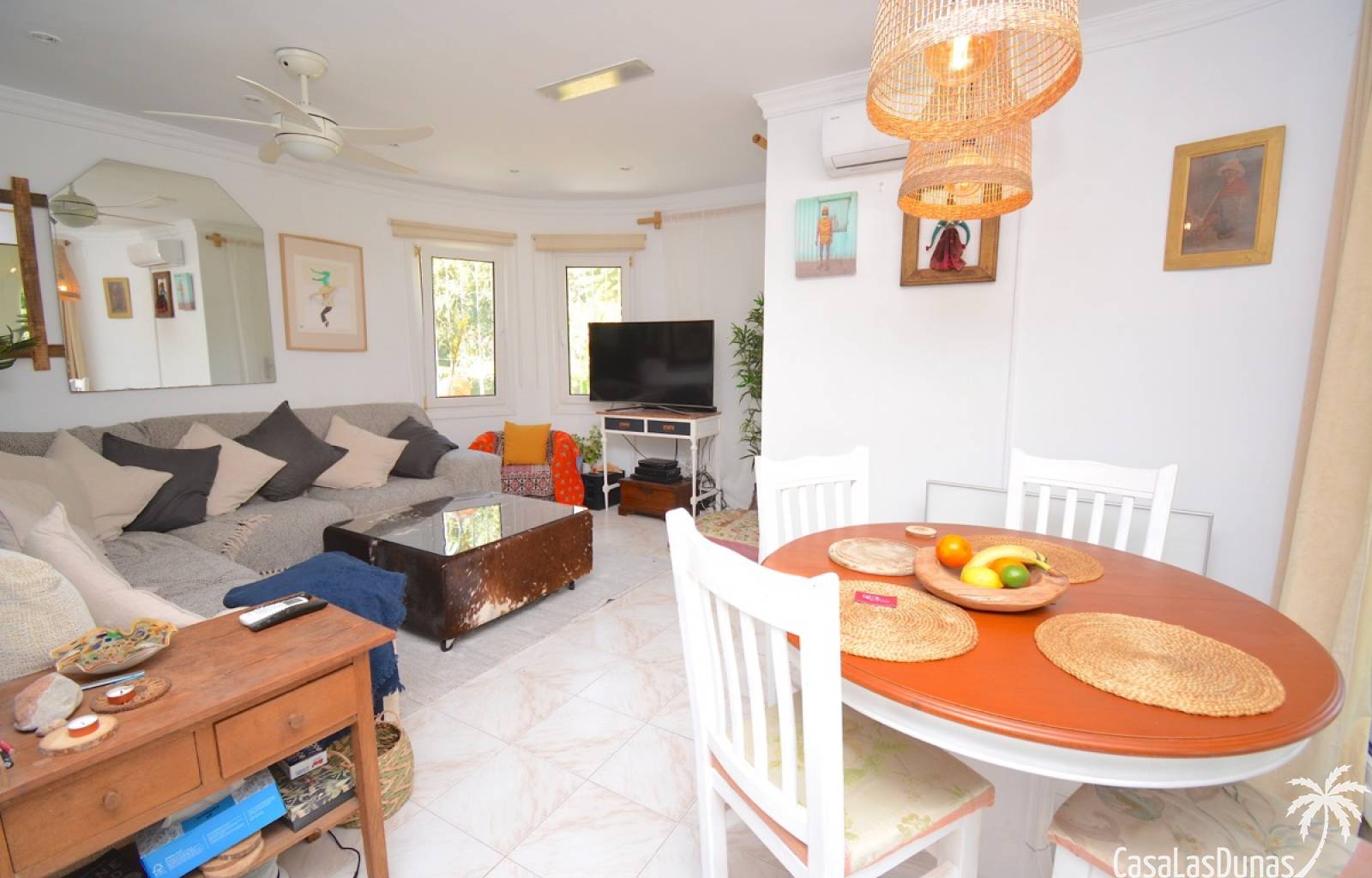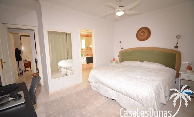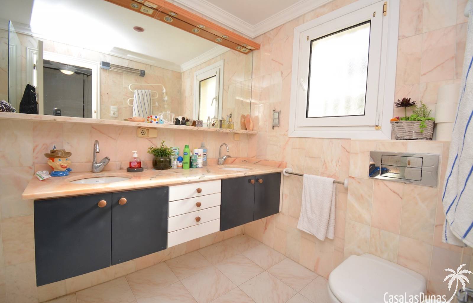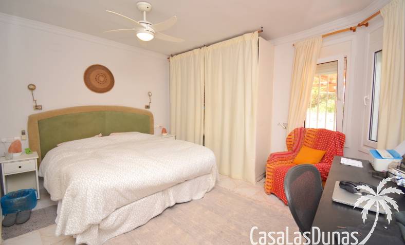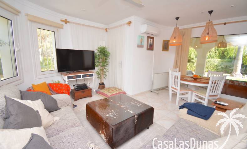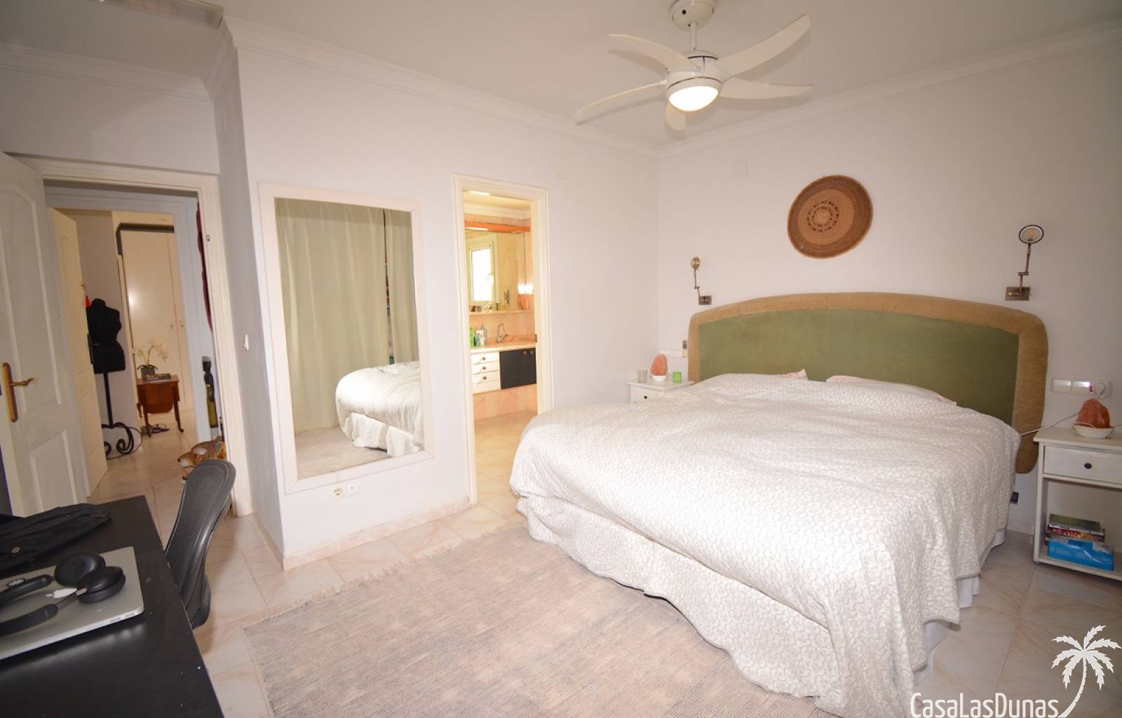 Wunderschöne Villa in begehrter Wohnlage nahe Las Rotas mit guter Anbindung an die Stadt. Das ebene, sonnige 808 m² große Grundstück bietet einen schönen Garten, einen Swimmingpool, einen Grillplatz und eine Garage. Das 160 m² große Haus erstreckt sich über drei Etagen. Der Hauptwohnbereich befindet sich im Erdgeschoss und umfasst zwei separate Apartments, die jeweils über eine Außentreppe erreichbar sind: eines im ersten Stock und das andere im Souterrain. Das Erdgeschoss besteht aus einem hellen Wohn-Esszimmer mit Zugang zur überdachten Terrasse (Naya), einer Küche, zwei geräumigen Schlafzimmern und zwei Badezimmern (eines davon en suite). Im Obergeschoss befindet sich ein Schlafzimmer mit Bad en suite und einer Terrasse mit Blick auf den Montgó und teilweisem Meerblick. Das Souterrain umfasst ein Wohnzimmer, eine Küche, ein Schlafzimmer, ein Ankleidezimmer und ein Badezimmer. Die Villa wurde 1995 erbaut und später renoviert. Sie verfügt über eine Lizenz zur touristischen Vermietung und ist mit einer Split-Klimaanlage (Heizung und Kühlung) ausgestattet.
