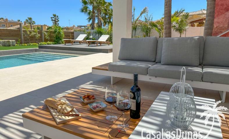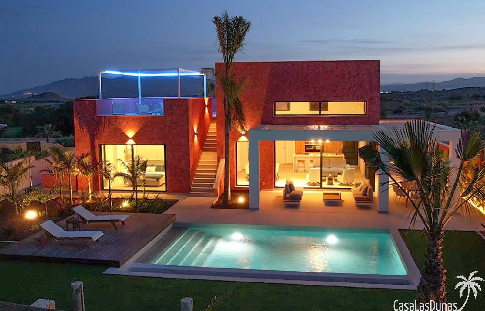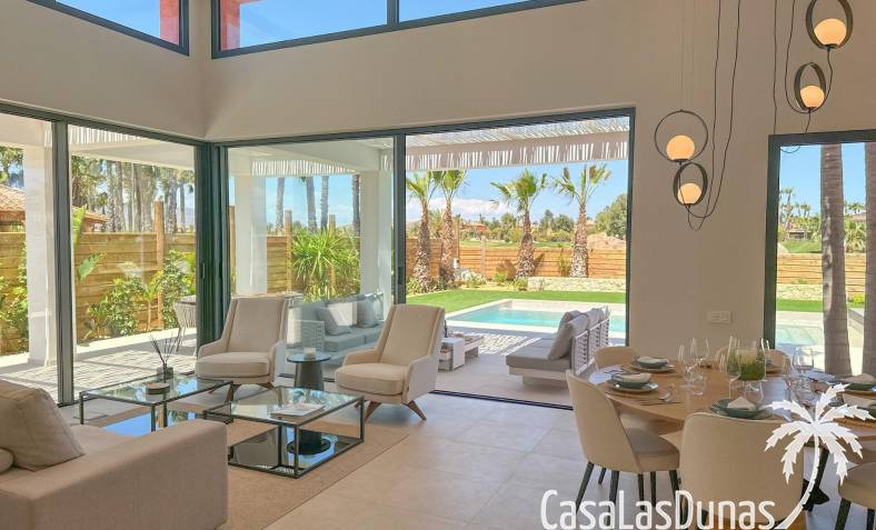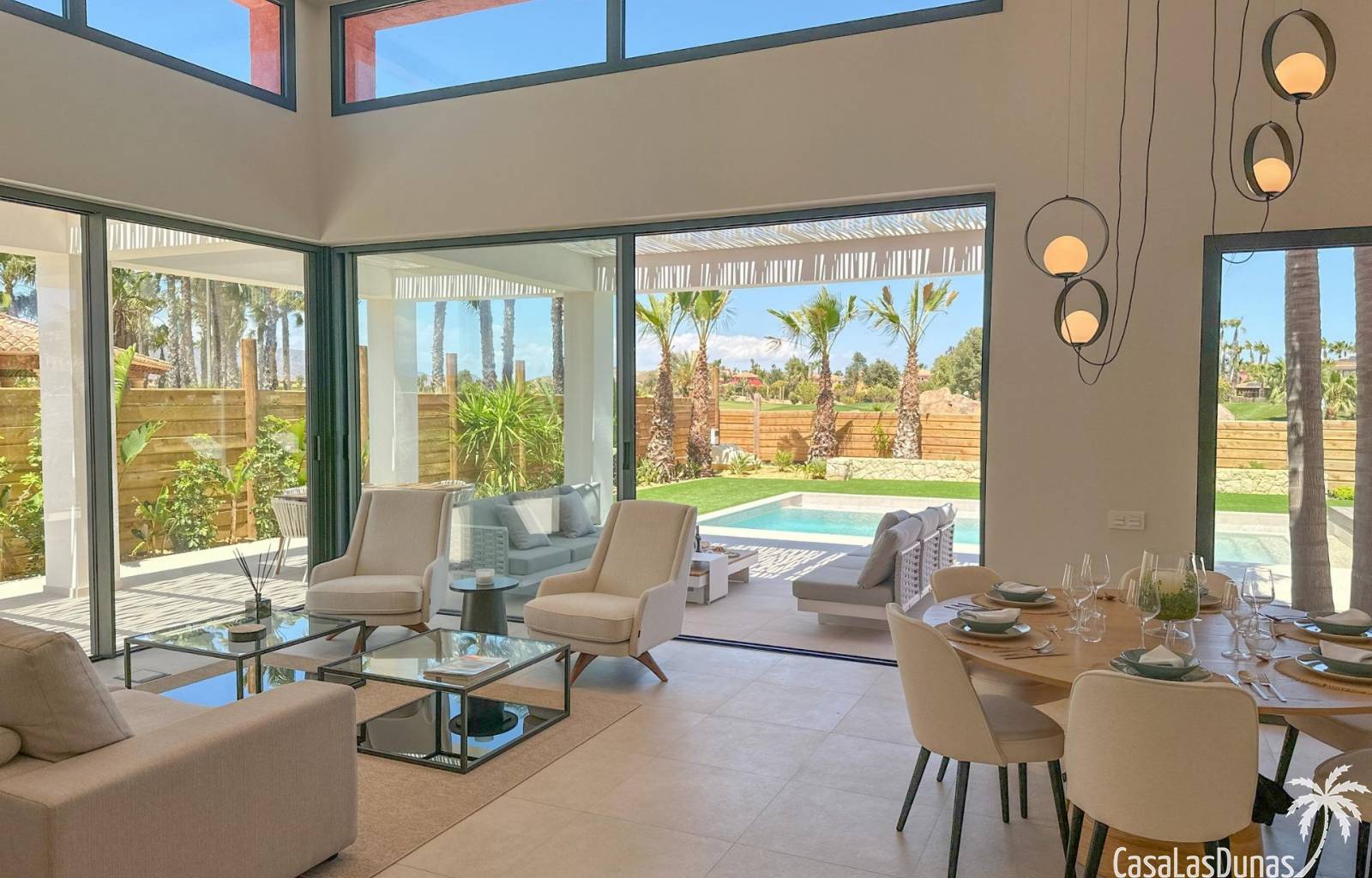 Zu den Merkmalen gehört ein geräumiger innerer Empfangsbereich, der sich mit einem durchgehenden Fußboden zu den überdachten Terrassen und dem Garten hin öffnet und über 93 m2 kombinierten Wohn- und Essbereich im Innen- und Außenbereich bietet, der so gestaltet ist, dass er in dem besonders privilegierten Klima der Region als Einheit genutzt werden kann.