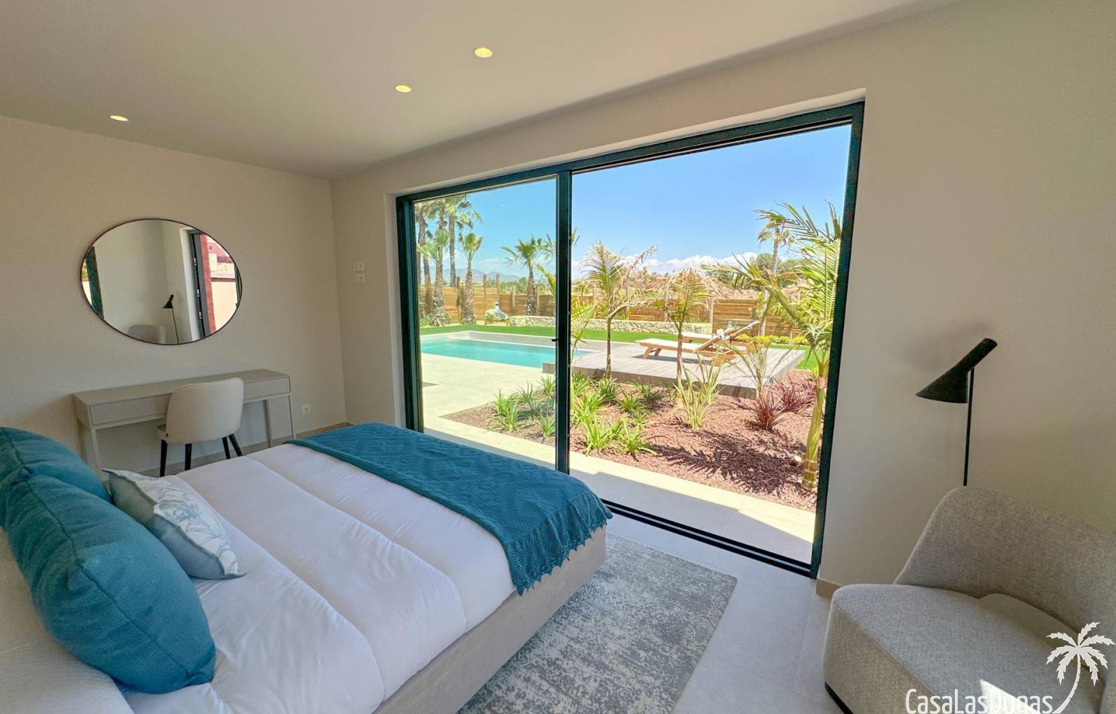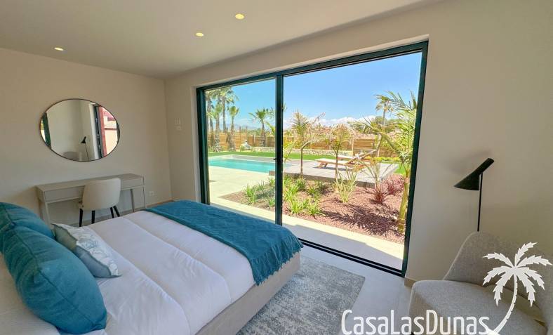 Das Hauptschlafzimmer mit eigenem Bad hat direkten Zugang zur großen Veranda und zum Swimmingpool. Es gibt zwei weitere Schlafzimmer, beide mit eigenem Bad und Garderobe.