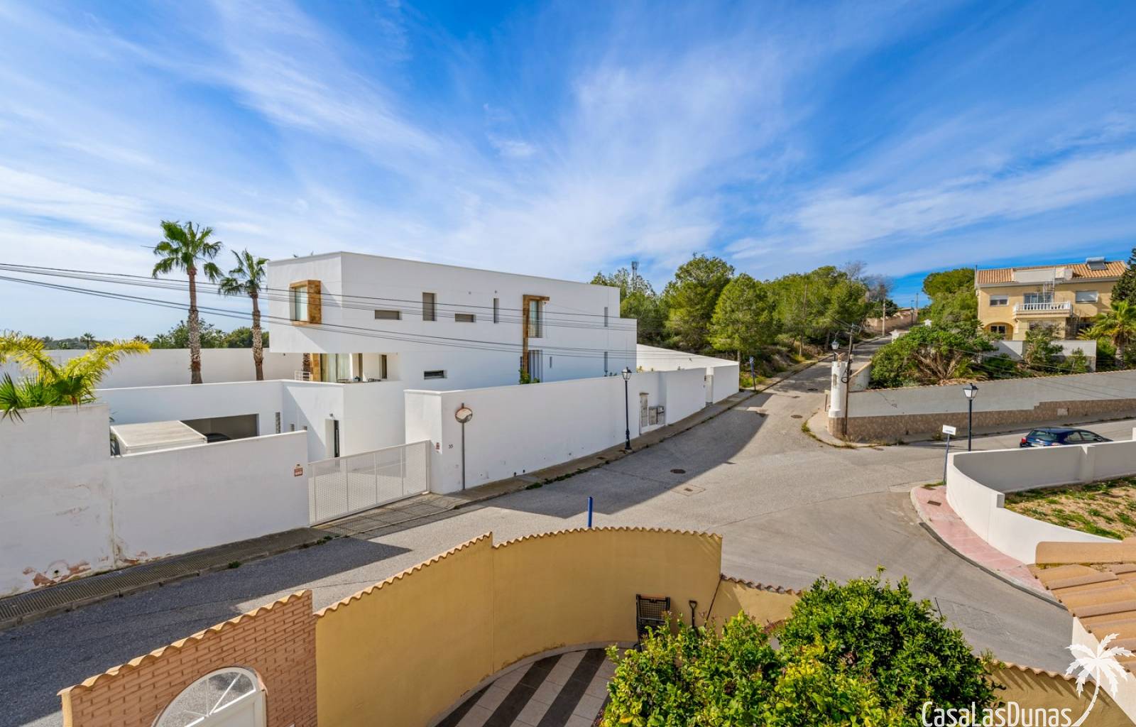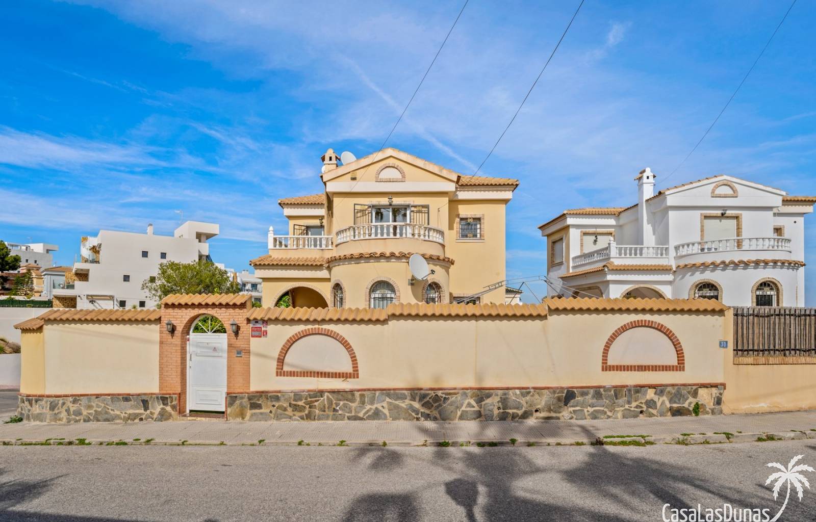 Diese exklusive freistehende Villa strahlt sofort Charme und Authentizität aus. Die runde Fassadenform, die eleganten Balustraden und die stilvollen Bogenakzente verleihen dem Haus einen typisch mediterranen Charakter, der sofort ins Auge fällt. Die warme Fassadenfarbe in Kombination mit Natursteindetails sorgt für eine besonders ansprechende Ausstrahlung.
