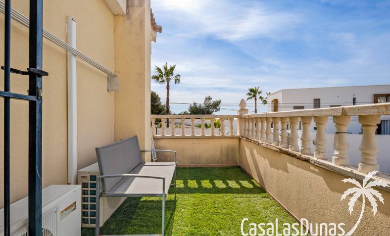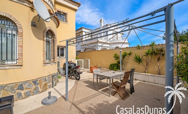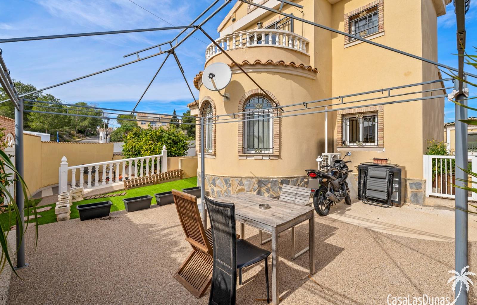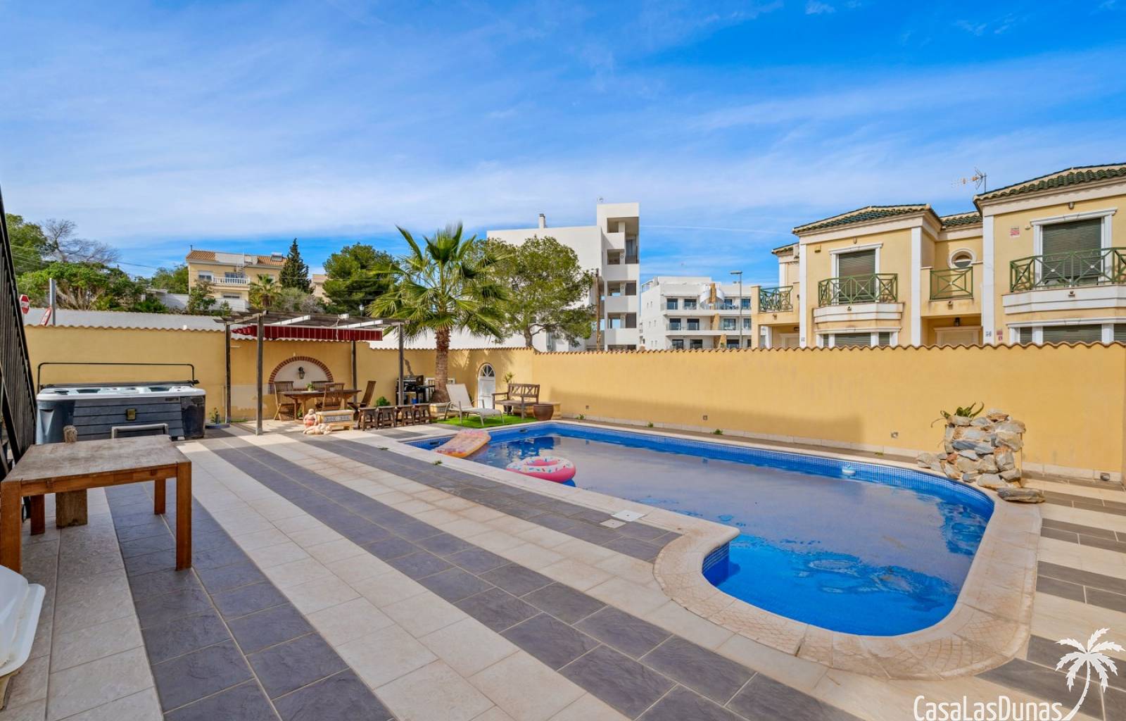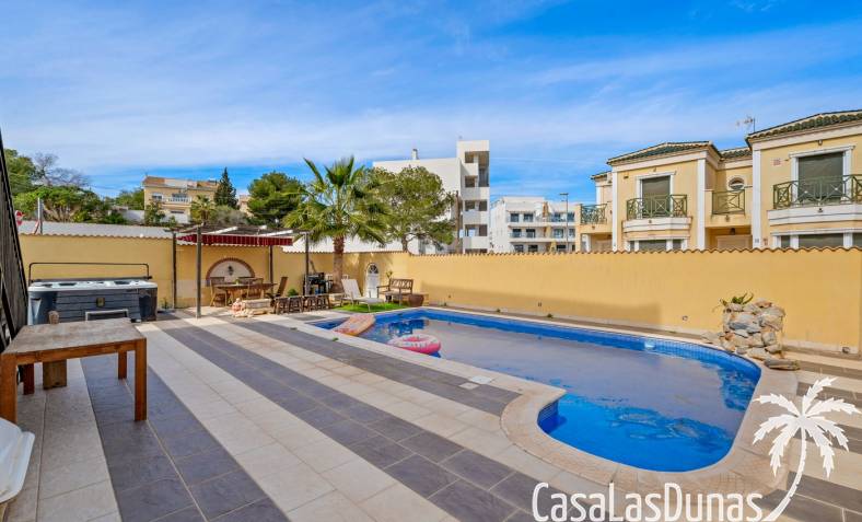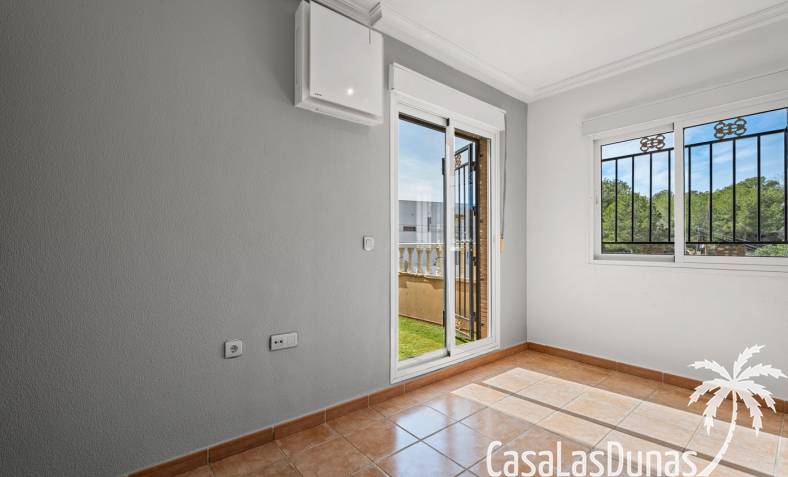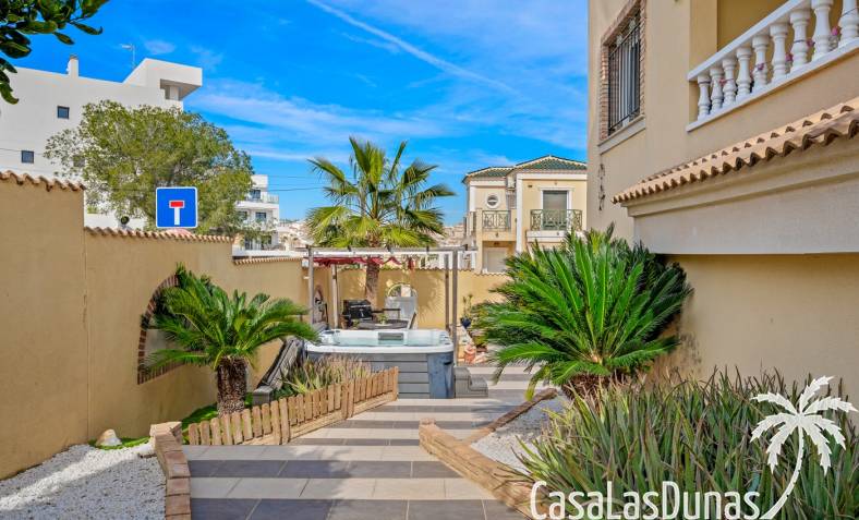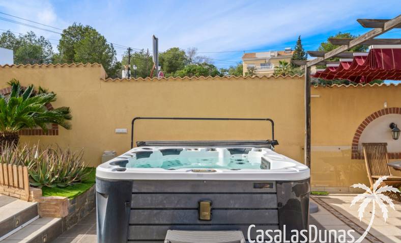 Der pflegeleichte Garten mit Kunstrasen schafft eine grüne, gepflegte Atmosphäre ohne großen Pflegeaufwand, sodass Sie sich vollkommen entspannen und das spanische Klima genießen können. Der vorhandene Whirlpool macht das Außenleben noch komfortabler und einladender.
