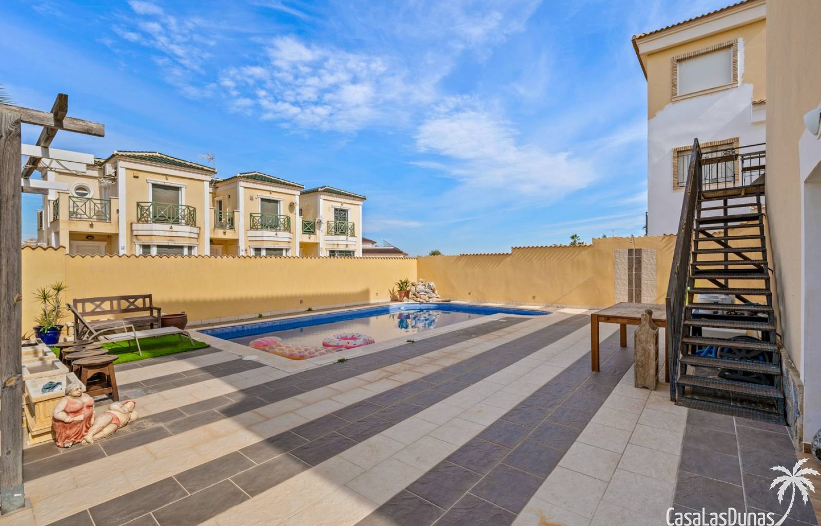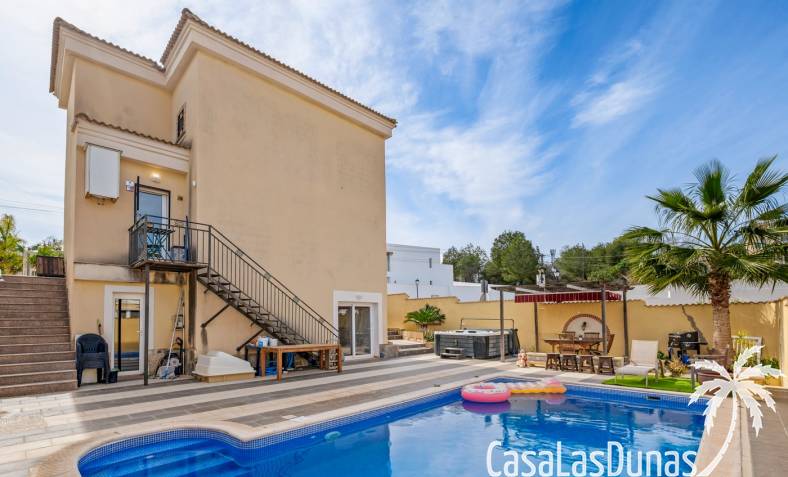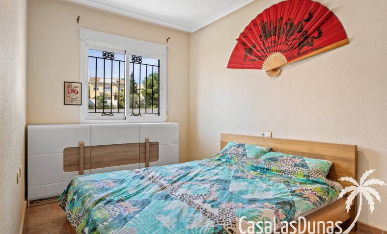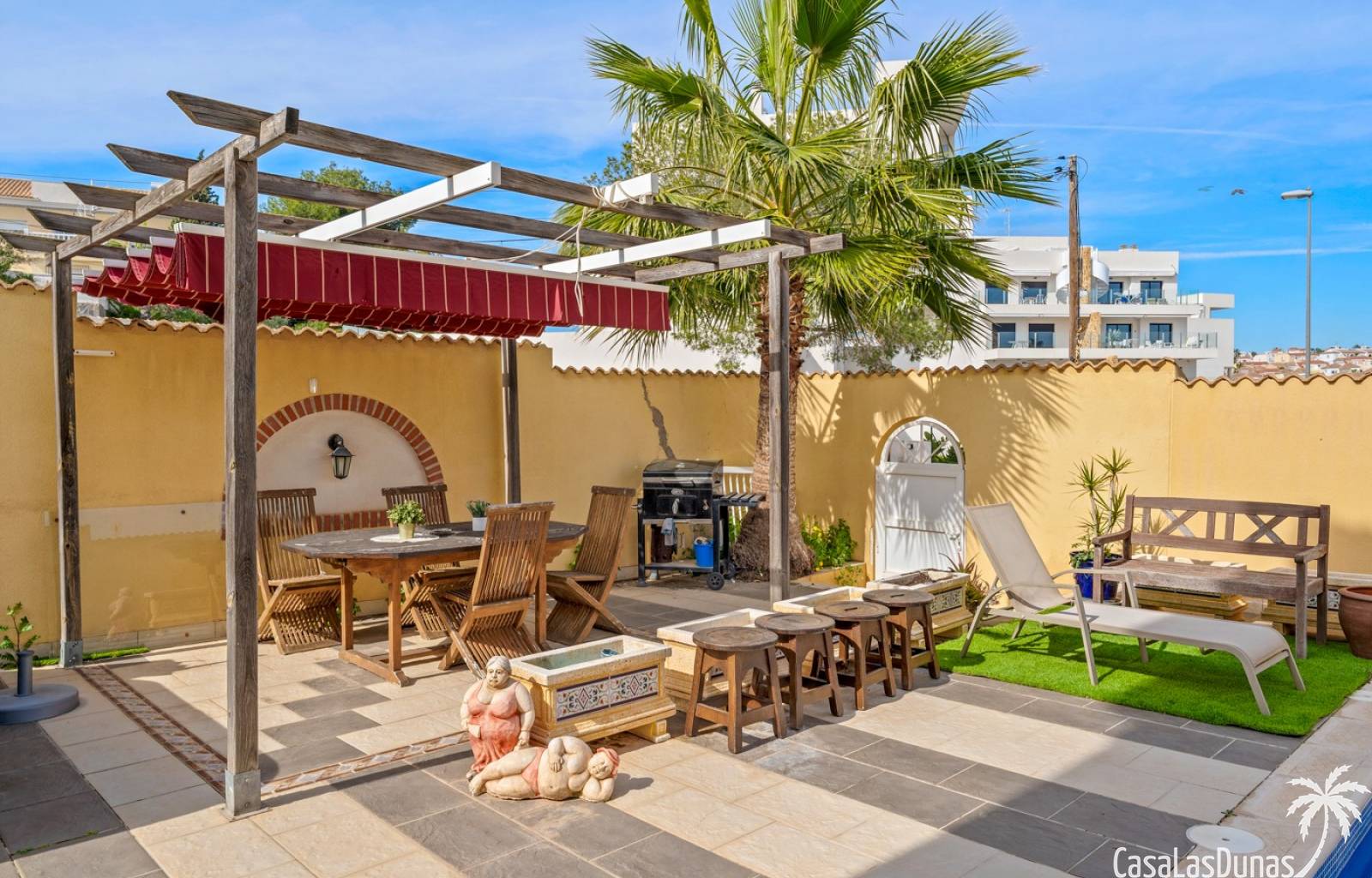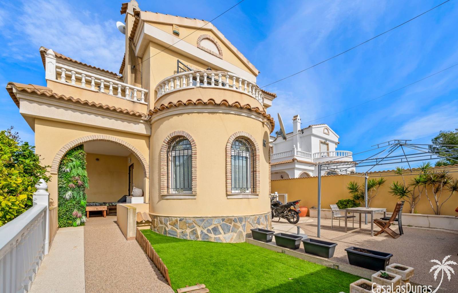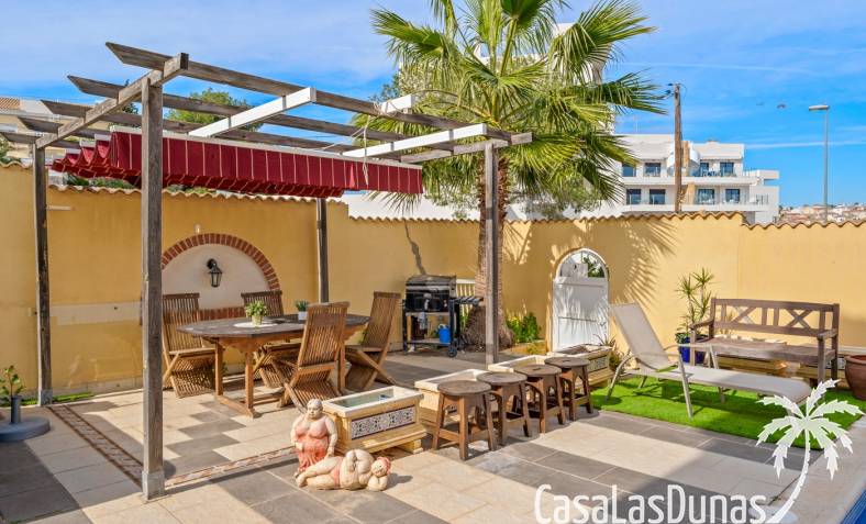Der pflegeleichte Garten mit Kunstrasen schafft eine grüne, gepflegte Atmosphäre ohne großen Pflegeaufwand, sodass Sie sich vollkommen entspannen und das spanische Klima genießen können. Der vorhandene Whirlpool macht das Außenleben noch komfortabler und einladender.