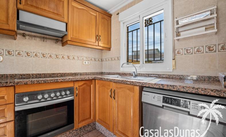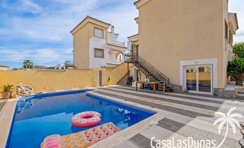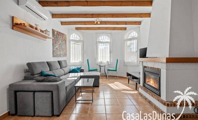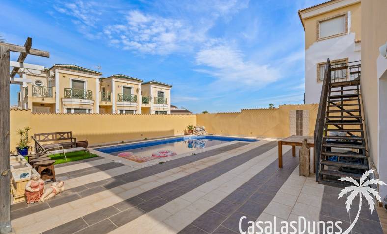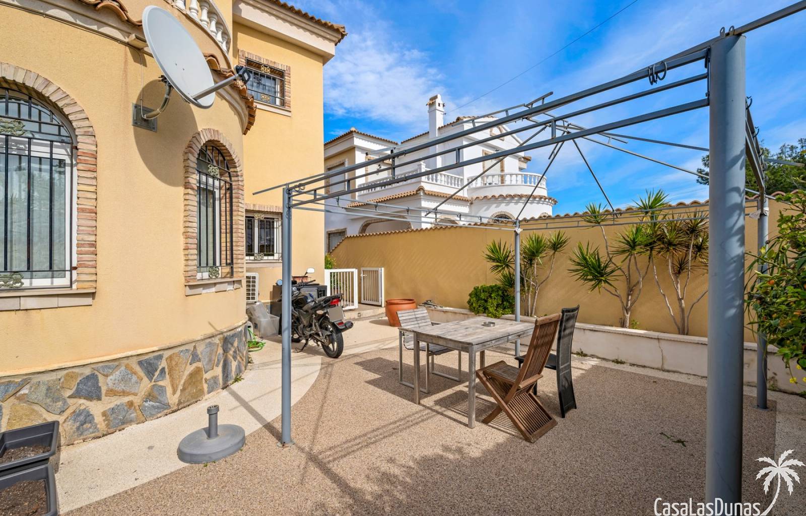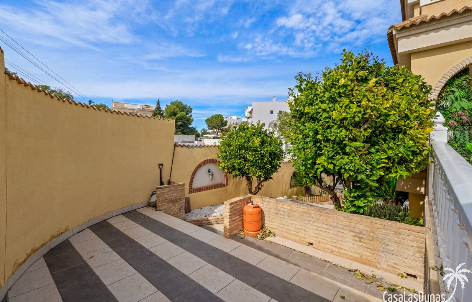 Der pflegeleichte Garten mit Kunstrasen schafft eine grüne, gepflegte Atmosphäre ohne großen Pflegeaufwand, sodass Sie sich vollkommen entspannen und das spanische Klima genießen können. Der vorhandene Whirlpool macht das Außenleben noch komfortabler und einladender.