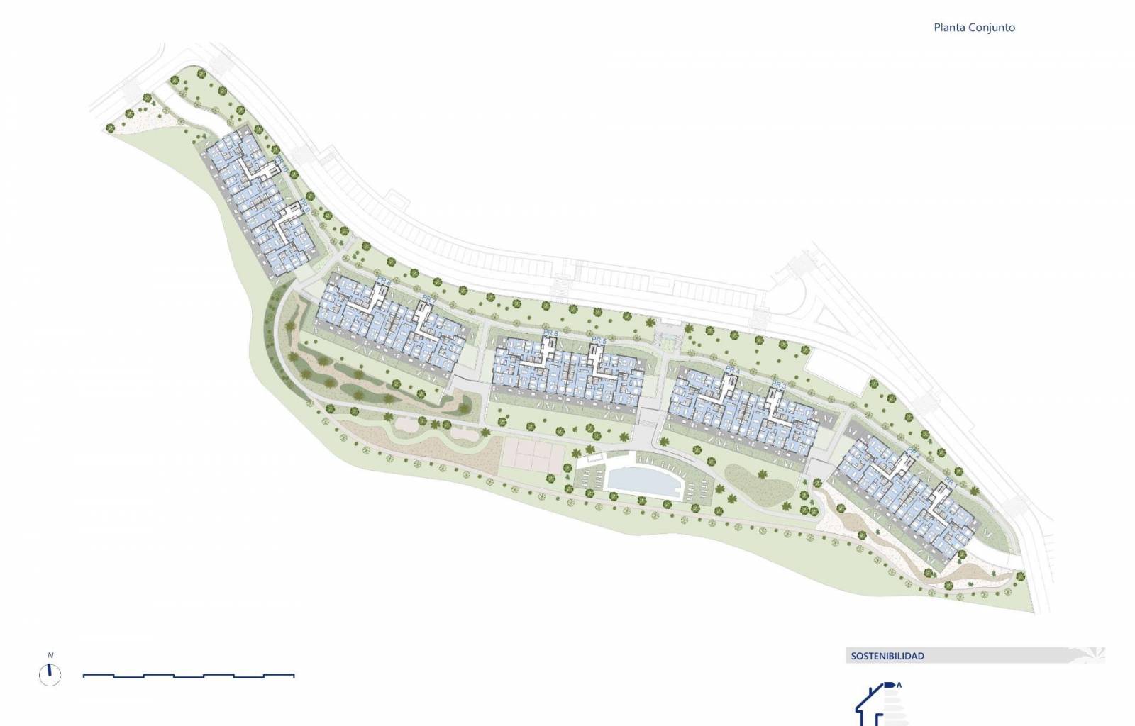 Die Anlage besteht aus 106 Mehrfamilienhäusern mit 2 und 3 Schlafzimmern mit Tiefgaragenstellplatz und Abstellraum.