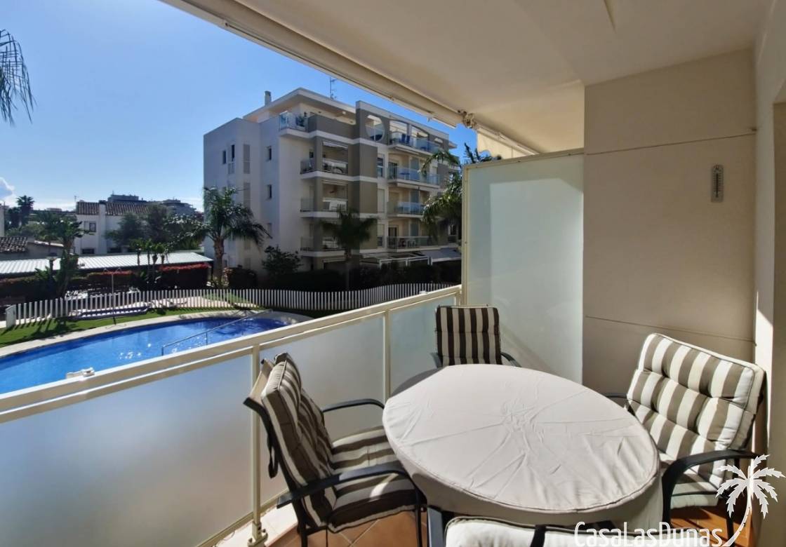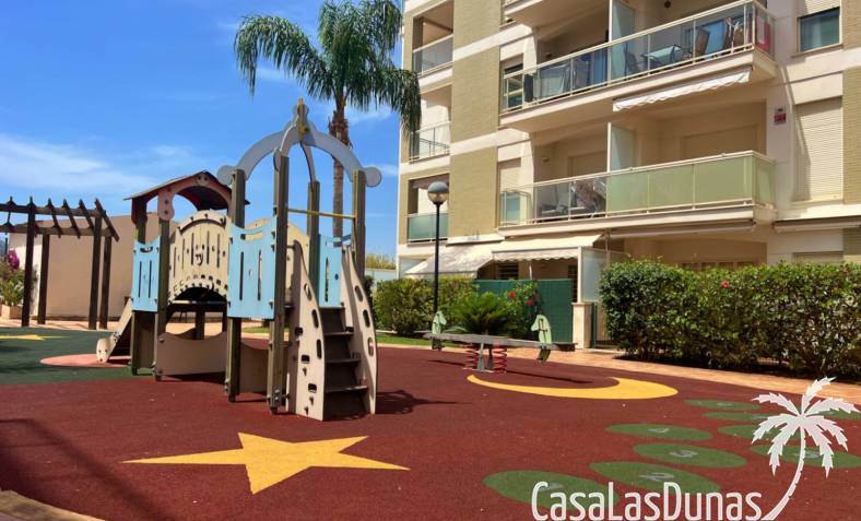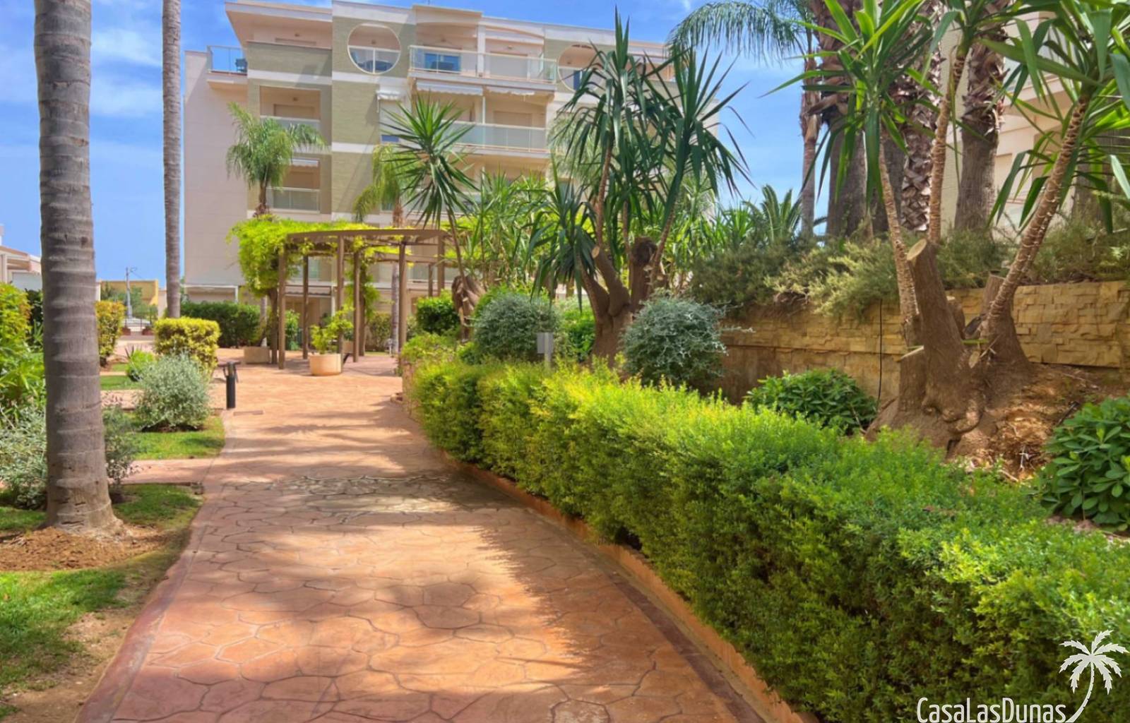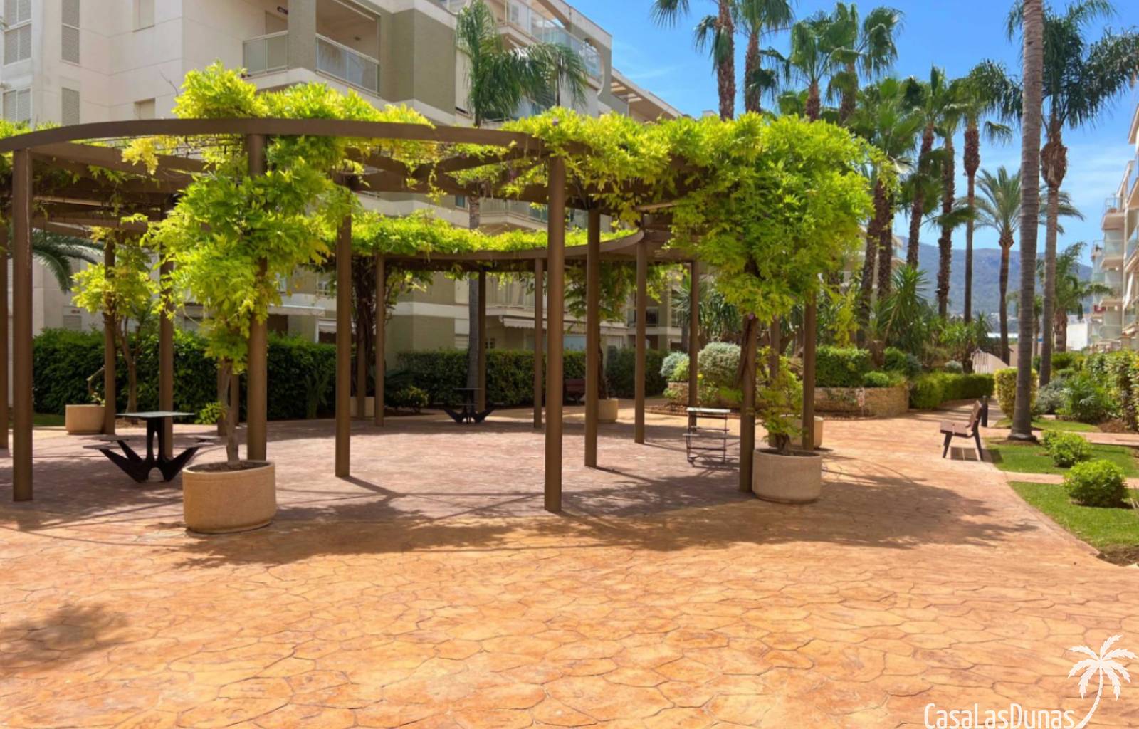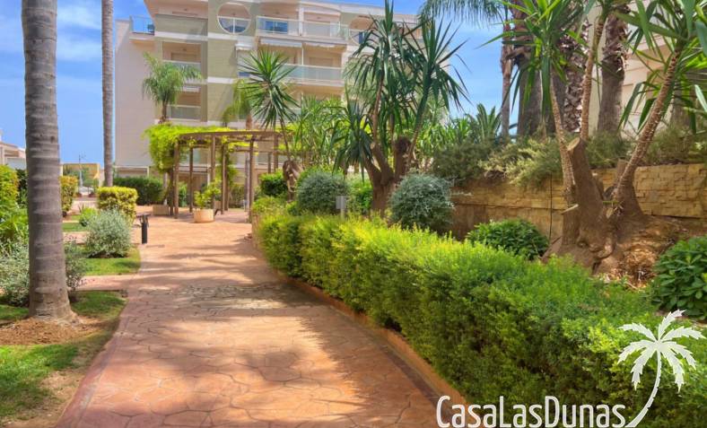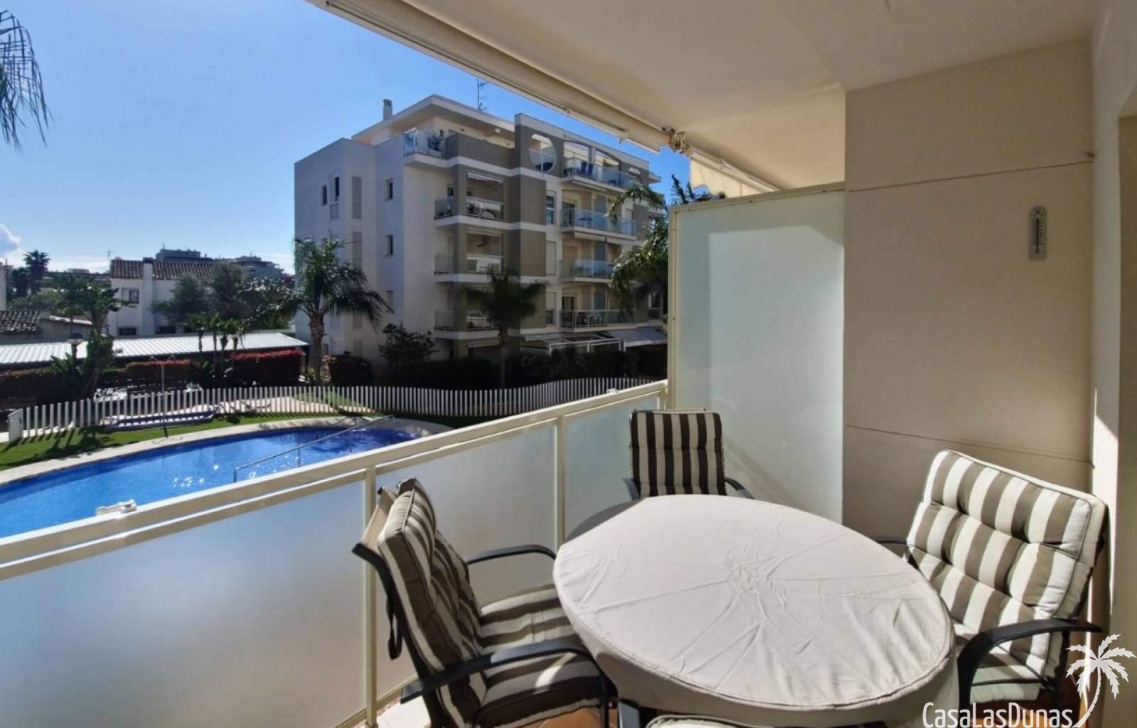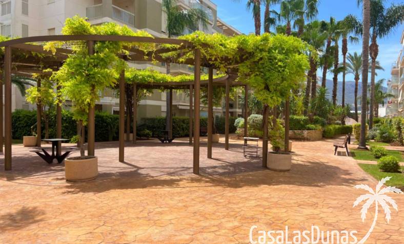 This apartment was built in 2007 in a beautiful complex with large communal garden with swimming pool just 500m from the centre and 1.5km from the beach of Denia. The house has a living/dining room with access to a terrace overlooking the pool, a kitchen, a bedroom and bathroom. There is air conditioning, a private parking space and storage room.