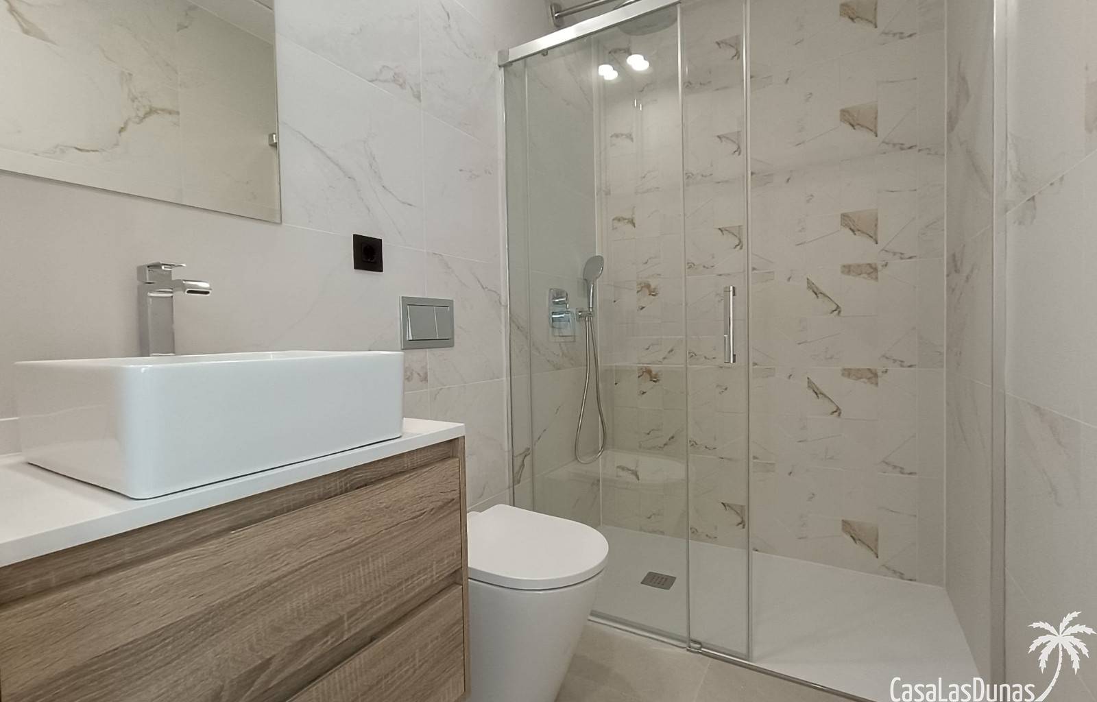 This project is being built in the popular town of Benijofar. In the first phase of the project we find 6 semi-detached villas with 3 bedrooms and 3 bathrooms. The houses are delivered very complete, including: Fully furnished garden with private 2.5 x 5 meter swimming pool, roof terrace, white goods package (built-in fridge-freezer, extractor hood, hob, built-in dishwasher, built-in oven and built-in microwave). In addition, you will receive the complete air conditioning installation, underfloor heating in the bathrooms, electric shutters and all lighting (inside and outside) as a gift. The spacious houses are very popular, making this the ninth project with this type of houses. Contact us for more information!