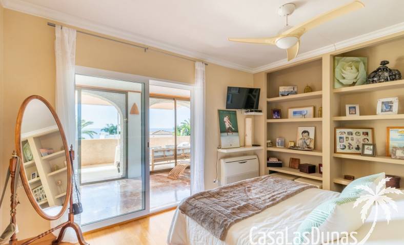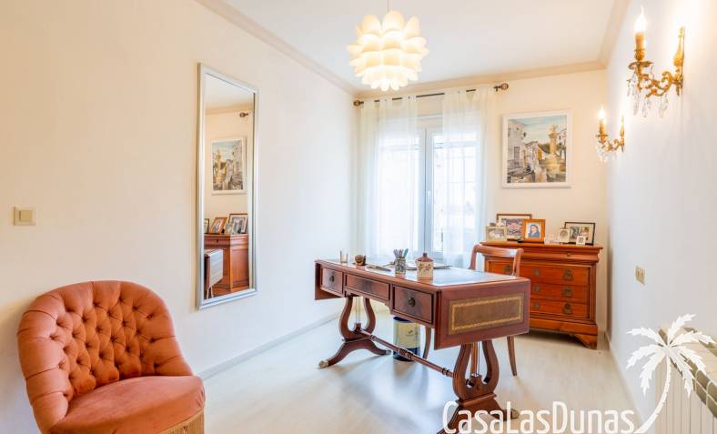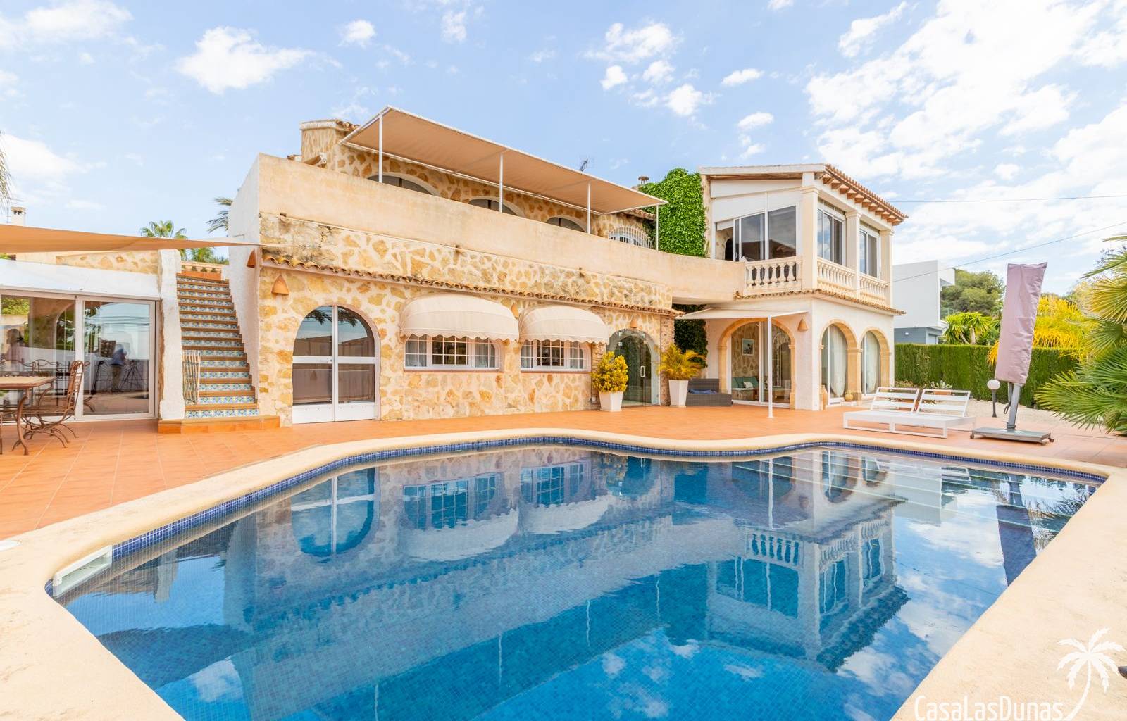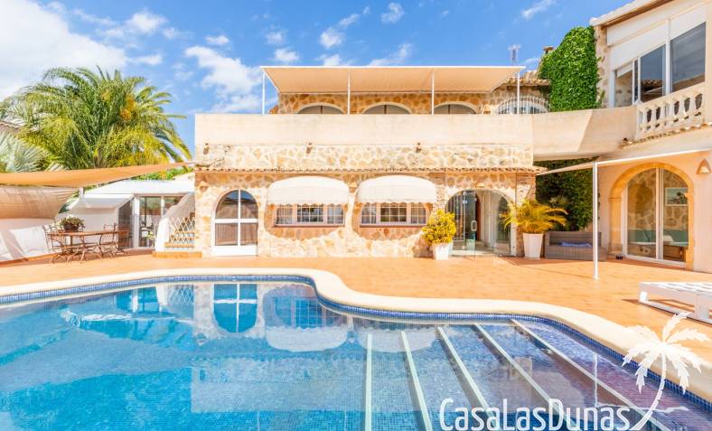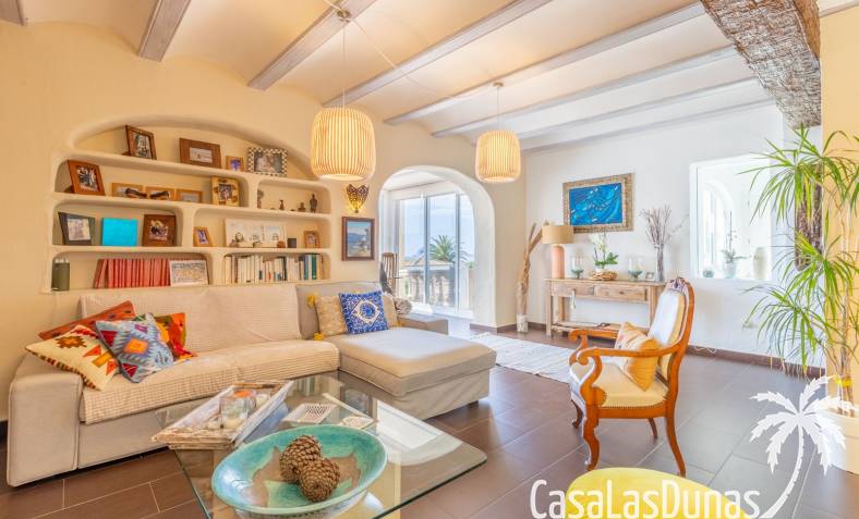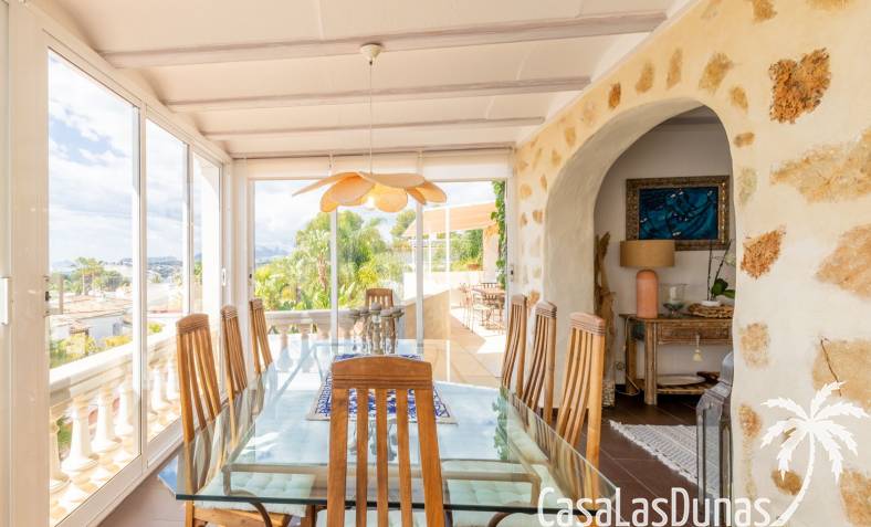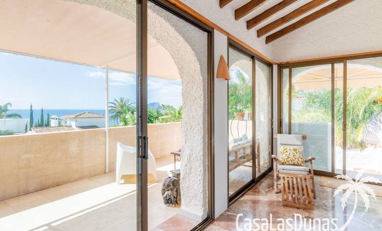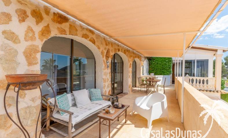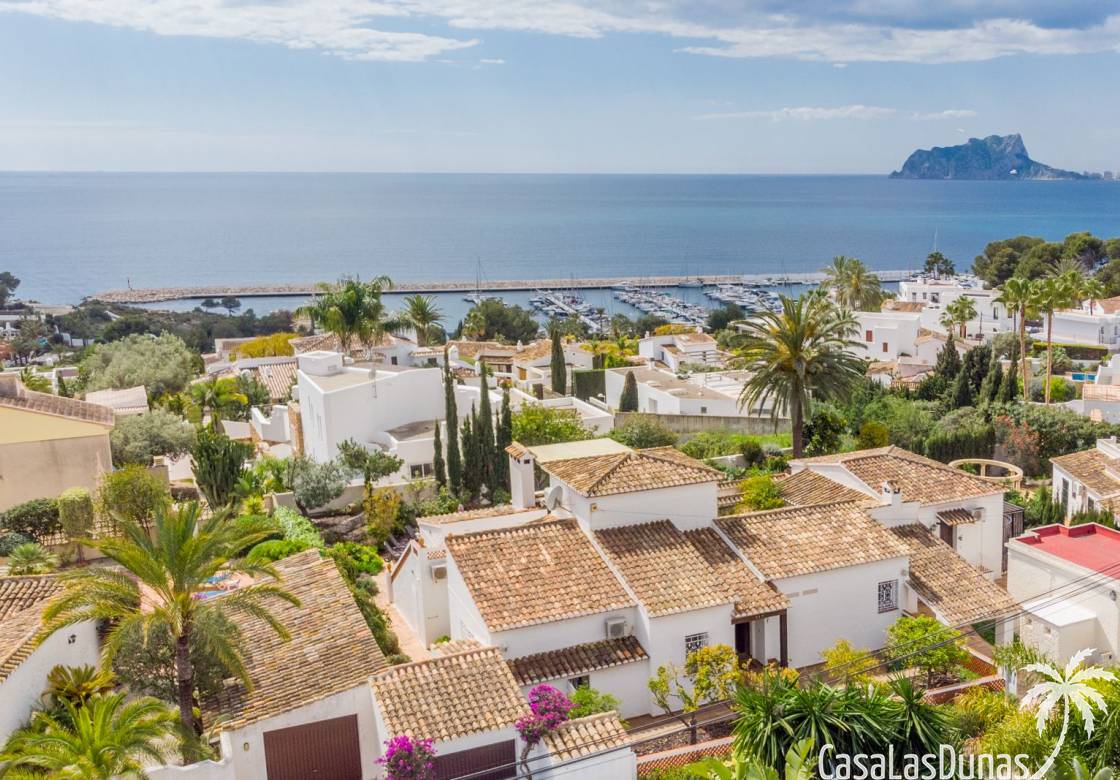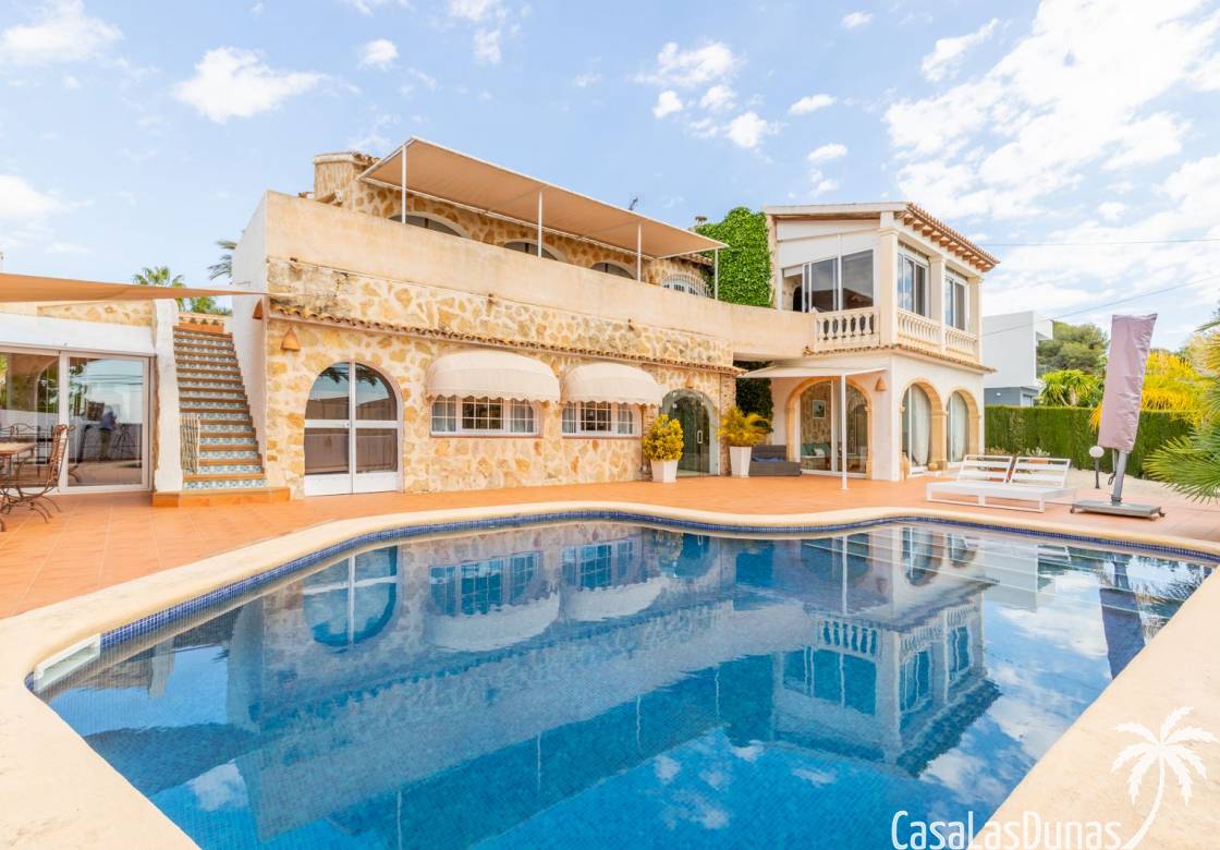This traditional villa with sea views was built in 1975 in an ideal location in the popular residential area of Pla del Mar, 5 minutes walk from the center of Moraira, the marina and the beach. The house has a built area of 495m2, a living area of 375m2 and is distributed over 2 floors. The ground floor consists of a living room, dining room, kitchen, guest toilet and two bedrooms with ensuite bathrooms and dressing rooms. On the same floor there is a laundry room, a storage room and a garage. The upper floor, accessible via an internal staircase, consists of a living room with access to a terrace with sea views, an office, two bedrooms and two bathrooms. The pool has a water surface of 39 m2. The garden is low maintenance and offers privacy.