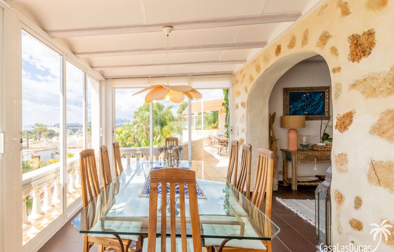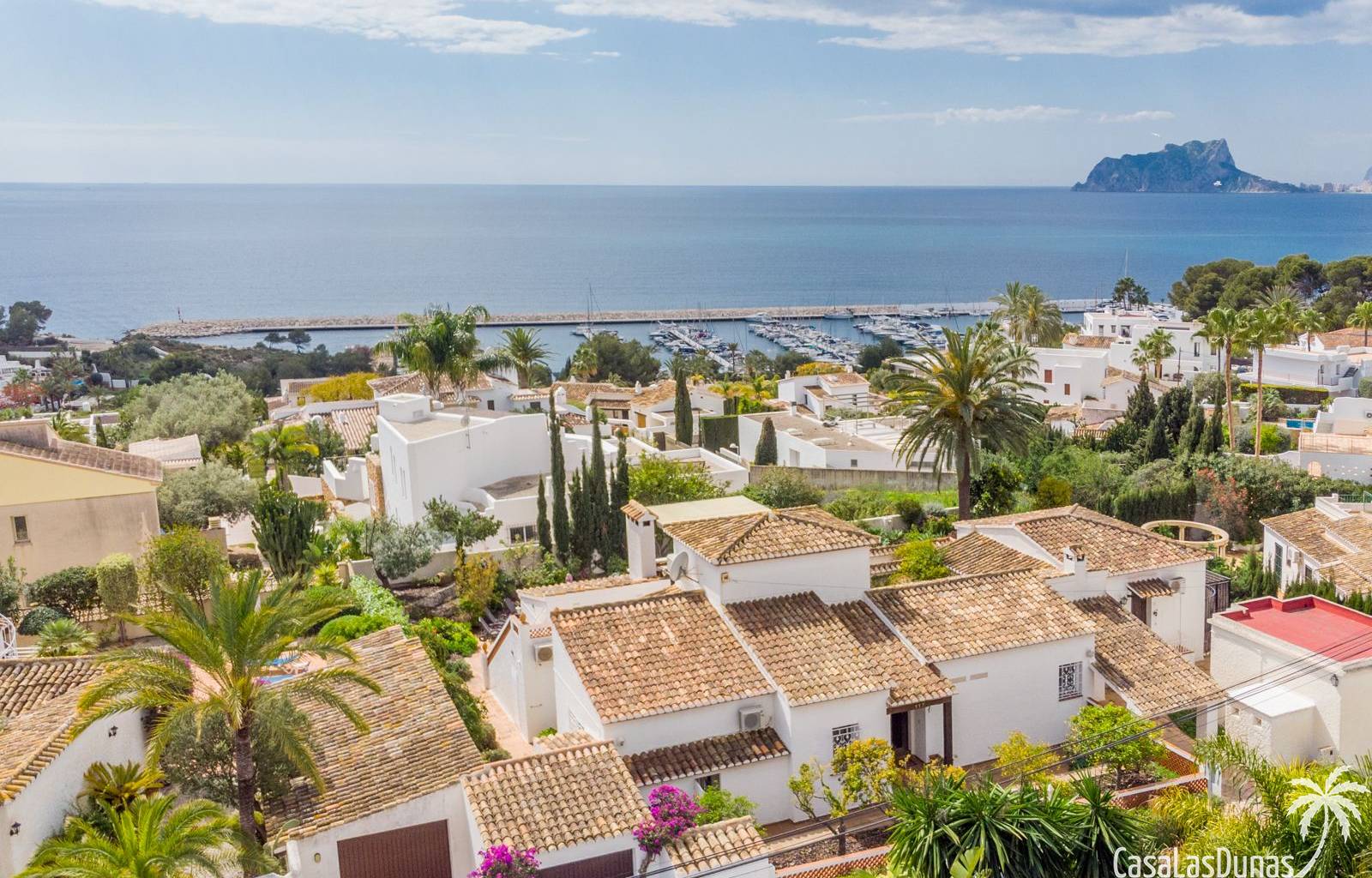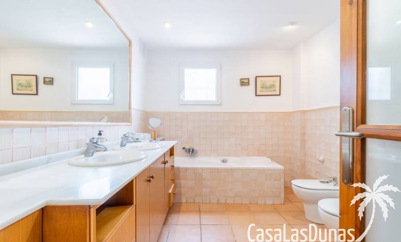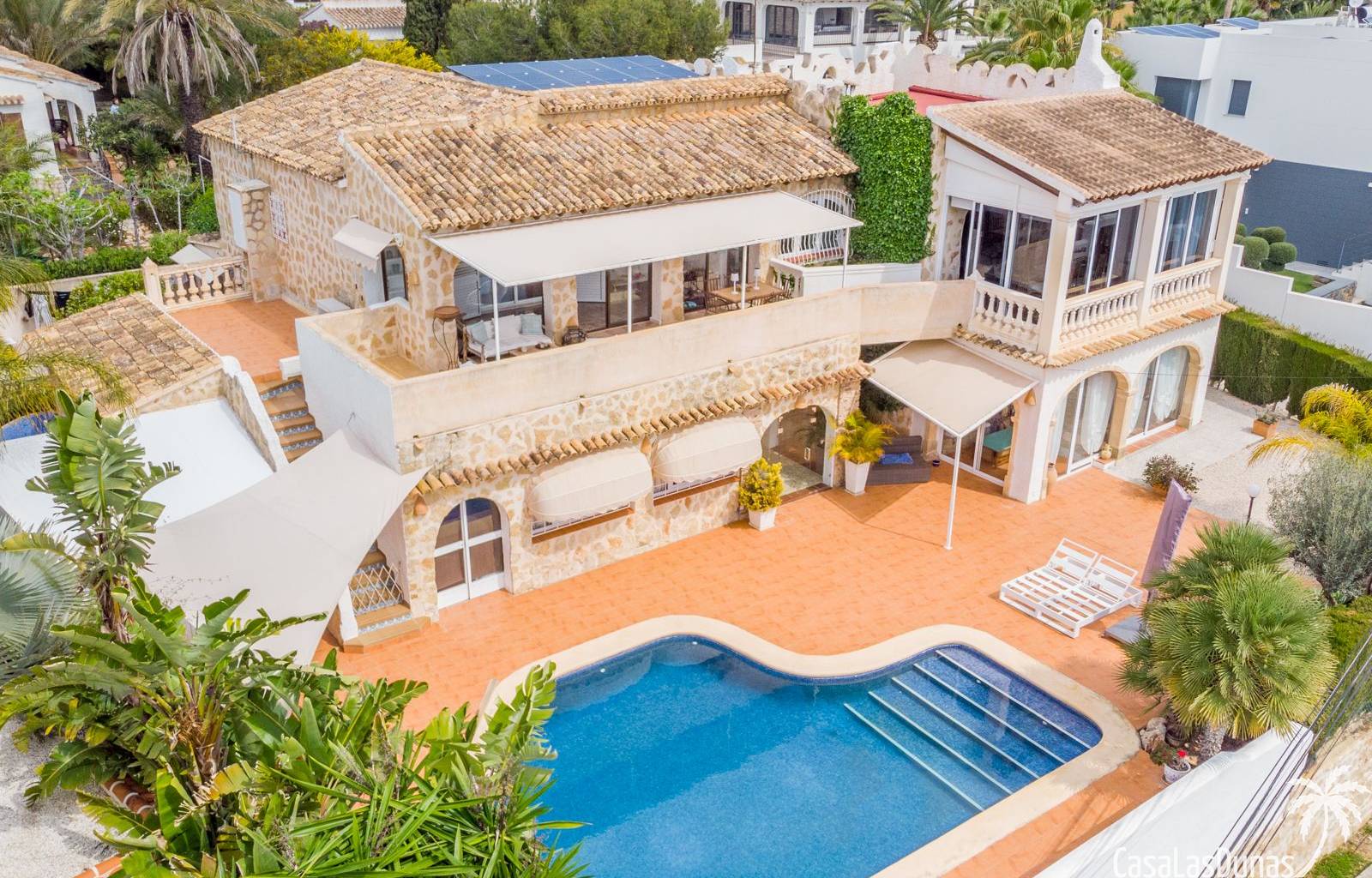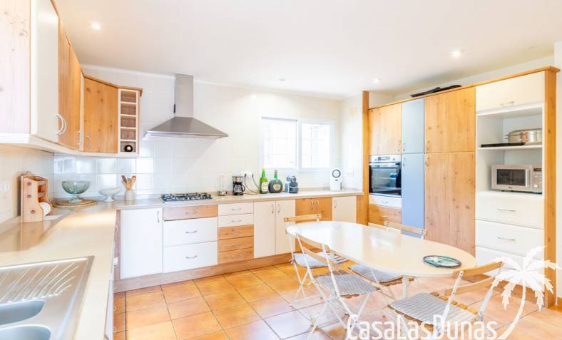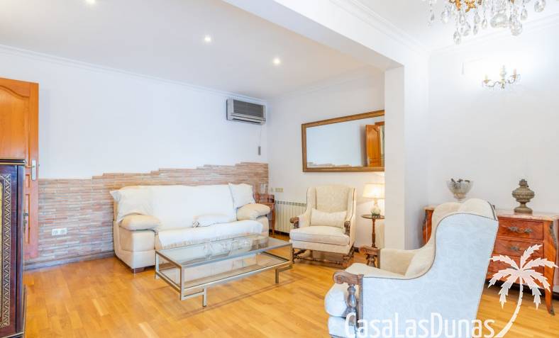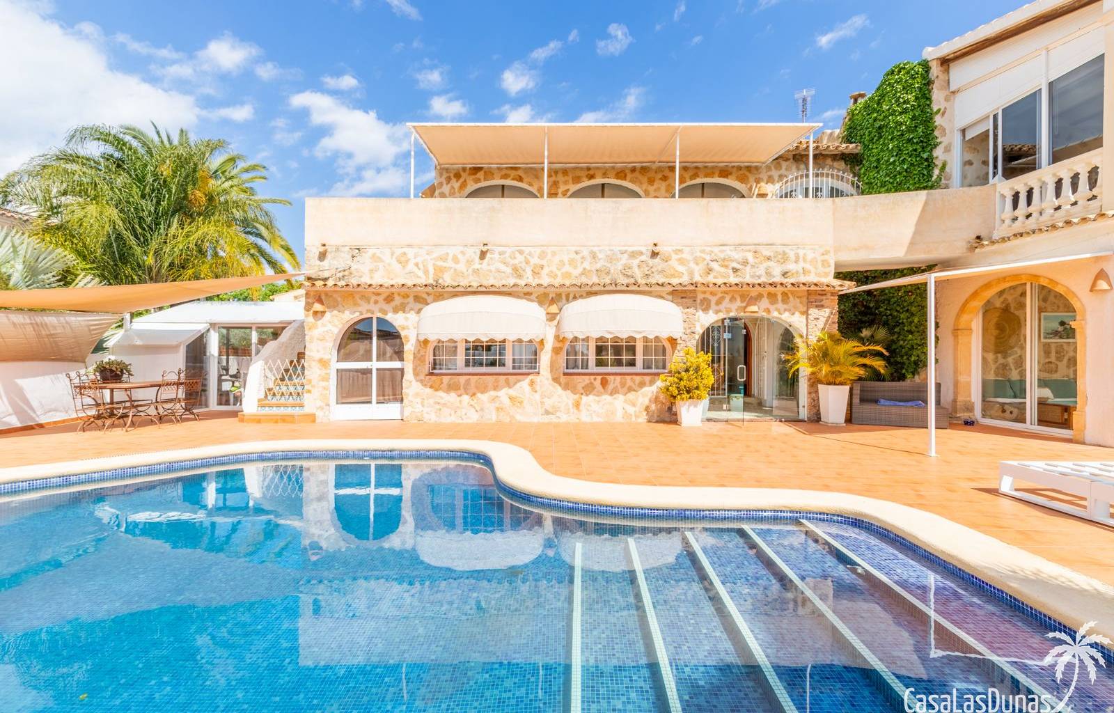 This traditional villa with sea views was built in 1975 in an ideal location in the popular residential area of Pla del Mar, 5 minutes walk from the center of Moraira, the marina and the beach. The house has a built area of 495m2, a living area of 375m2 and is distributed over 2 floors. The ground floor consists of a living room, dining room, kitchen, guest toilet and two bedrooms with ensuite bathrooms and dressing rooms. On the same floor there is a laundry room, a storage room and a garage. The upper floor, accessible via an internal staircase, consists of a living room with access to a terrace with sea views, an office, two bedrooms and two bathrooms. The pool has a water surface of 39 m2. The garden is low maintenance and offers privacy.