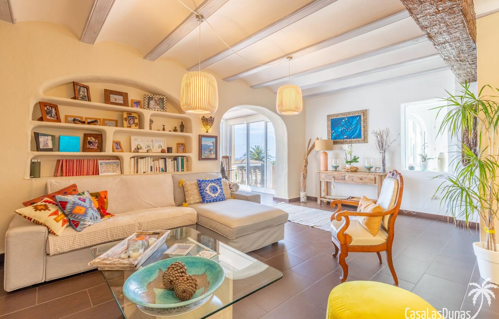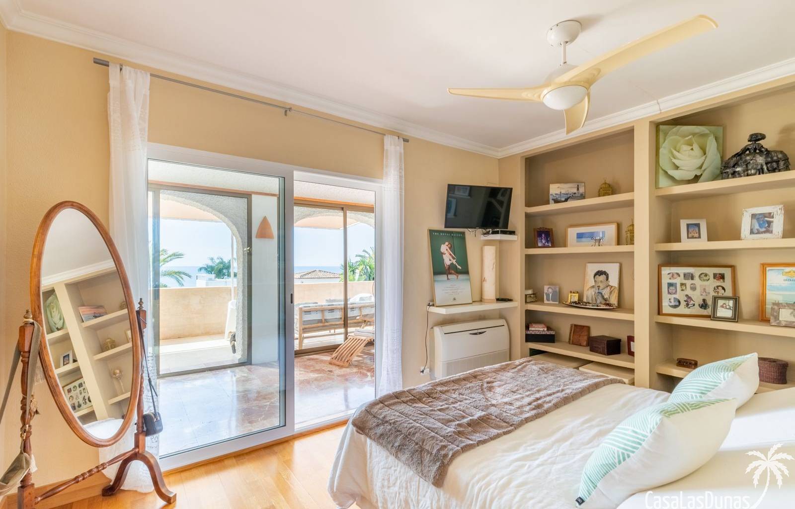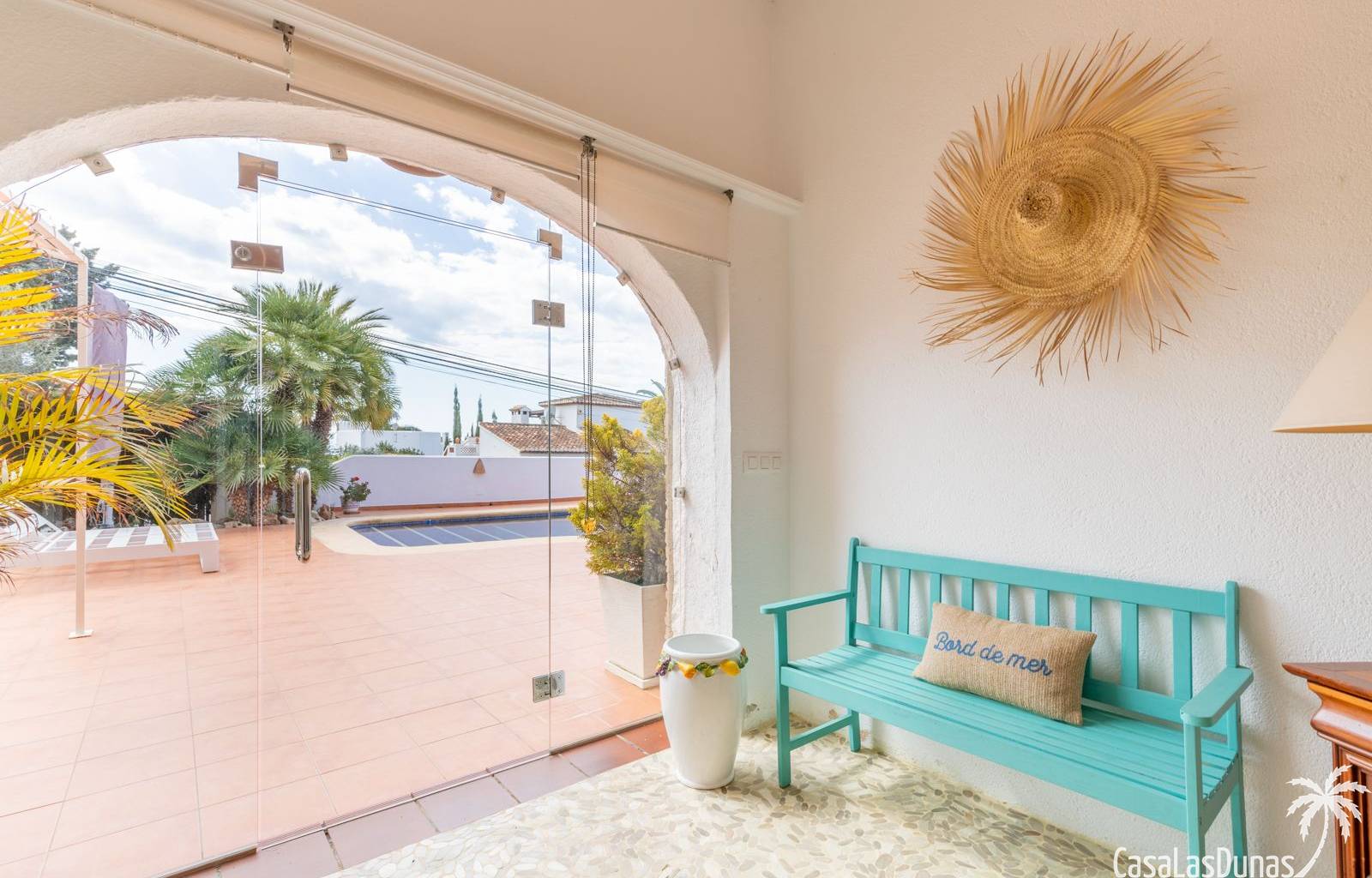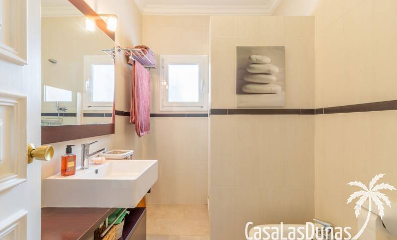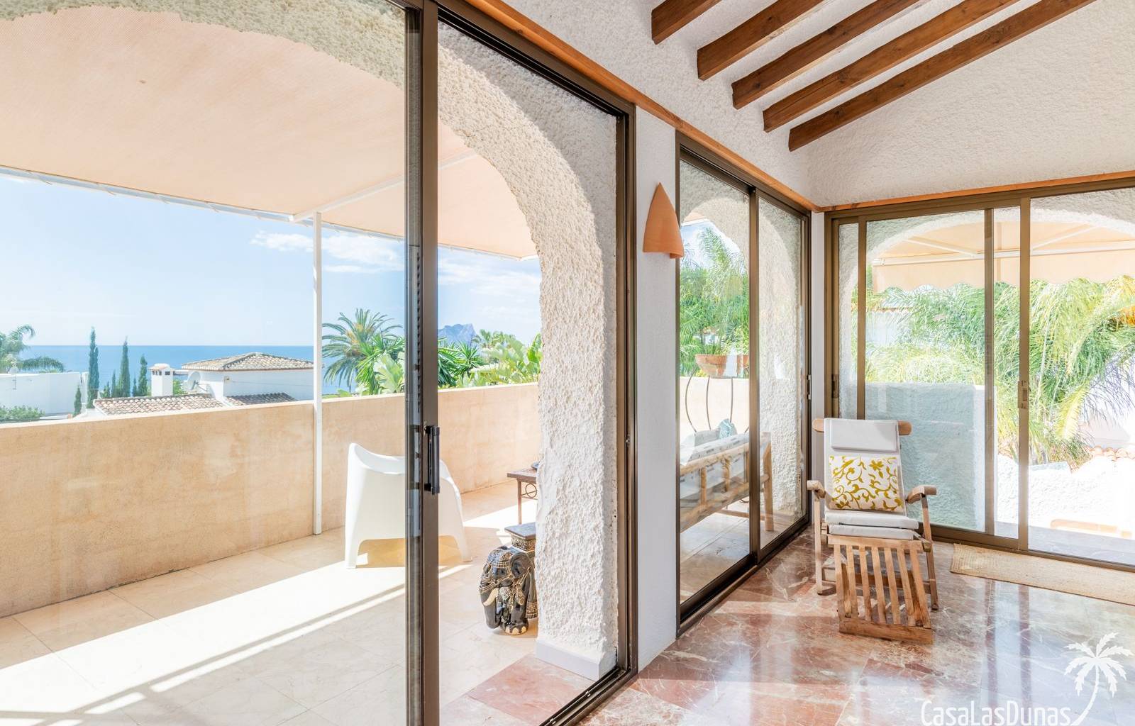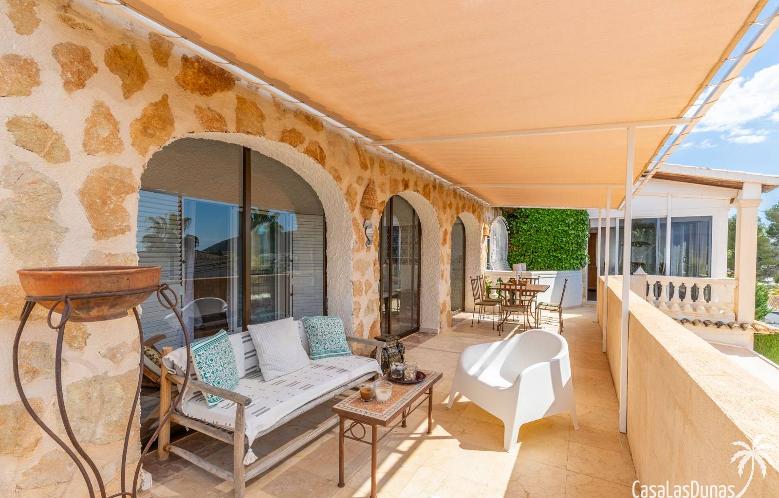 This traditional villa with sea views was built in 1975 in an ideal location in the popular residential area of Pla del Mar, 5 minutes walk from the center of Moraira, the marina and the beach. The house has a built area of 495m2, a living area of 375m2 and is distributed over 2 floors. The ground floor consists of a living room, dining room, kitchen, guest toilet and two bedrooms with ensuite bathrooms and dressing rooms. On the same floor there is a laundry room, a storage room and a garage. The upper floor, accessible via an internal staircase, consists of a living room with access to a terrace with sea views, an office, two bedrooms and two bathrooms. The pool has a water surface of 39 m2. The garden is low maintenance and offers privacy.