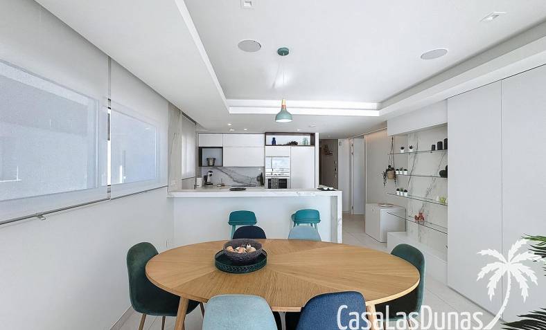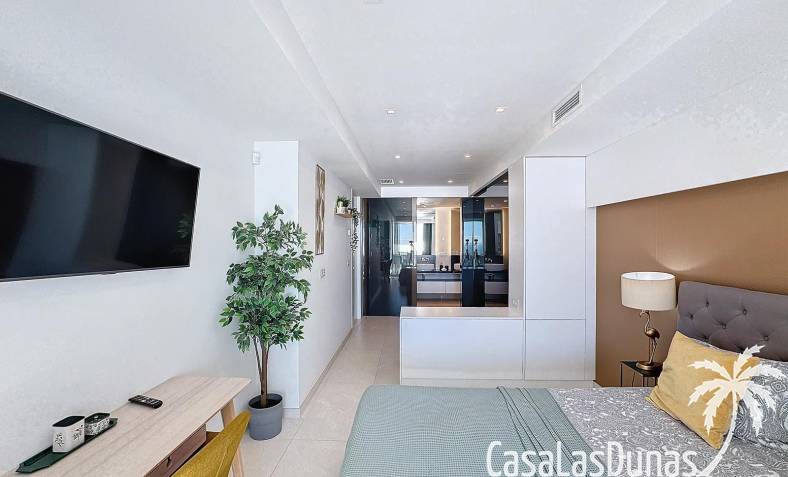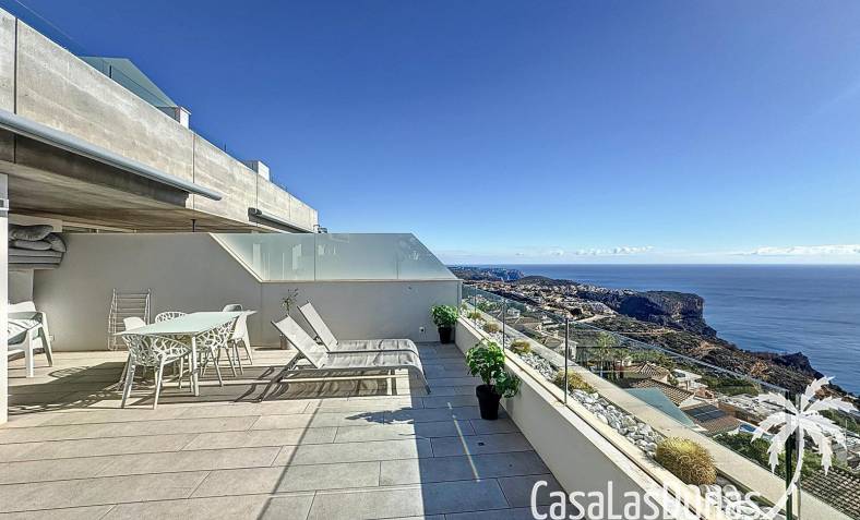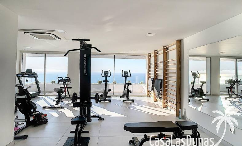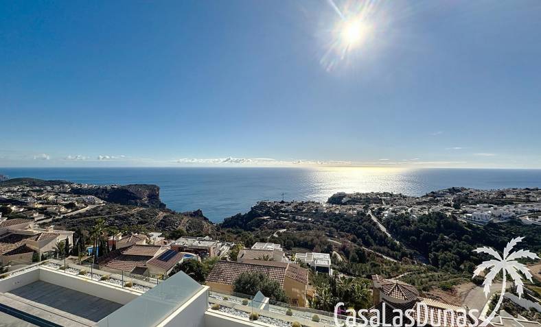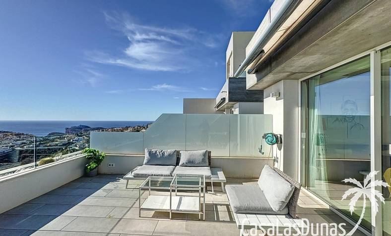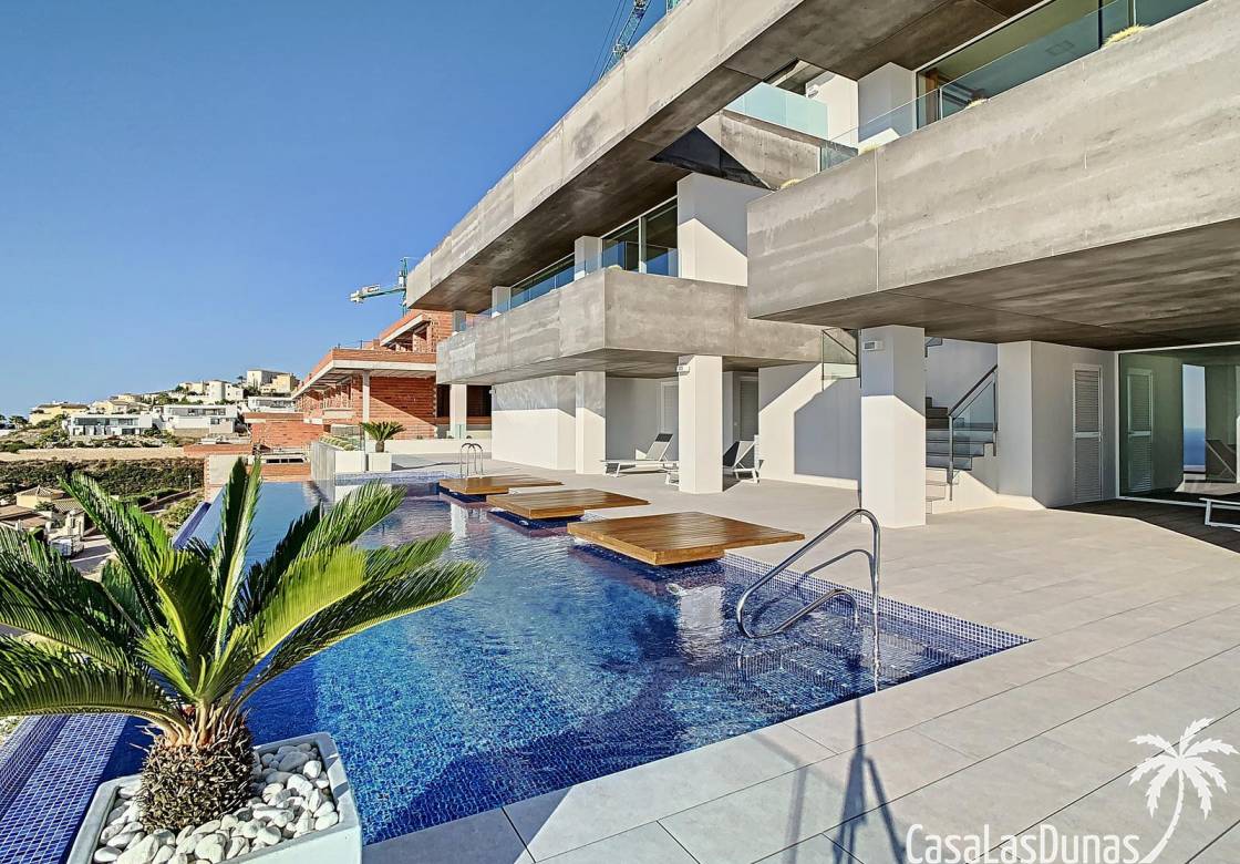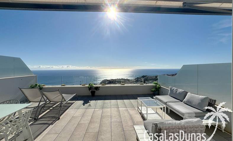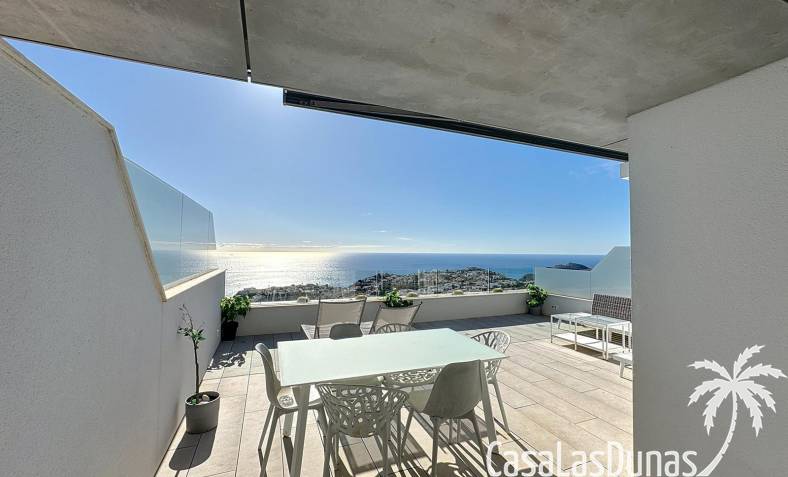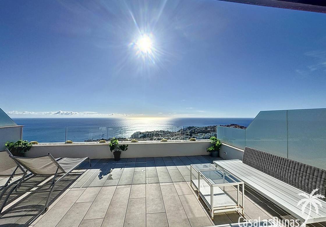 This luxury apartment on the Cumbre offers stunning views of the Mediterranean Sea and was built in 2020 in a modern complex with both indoor and outdoor pools. The property boasts 106m² of living space and a generous 50m² of terrace. The apartment comprises an entrance hall, a kitchen with a utility/storage room, a spacious living/dining room, two guest bedrooms with a separate bathroom, and a spacious master bedroom with an en-suite bathroom. The apartment boasts an optimal layout, with access to the front terrace from both the living area and the master bedroom. A 6m² storage room and a 13m² covered parking space are also included.
