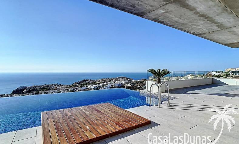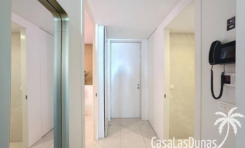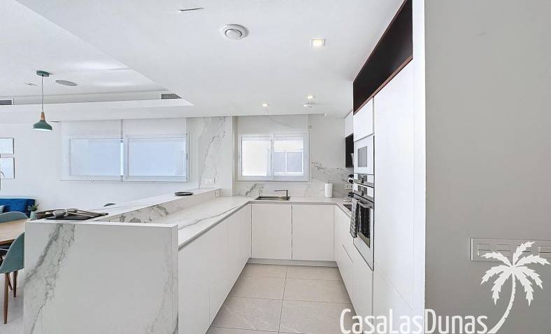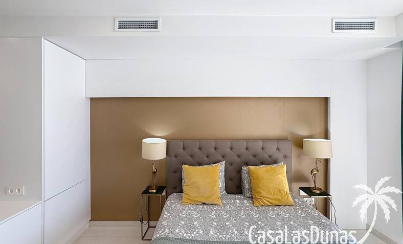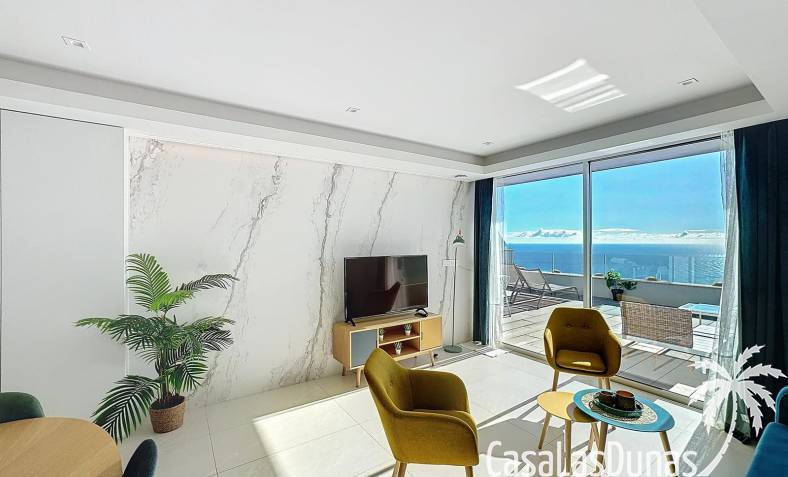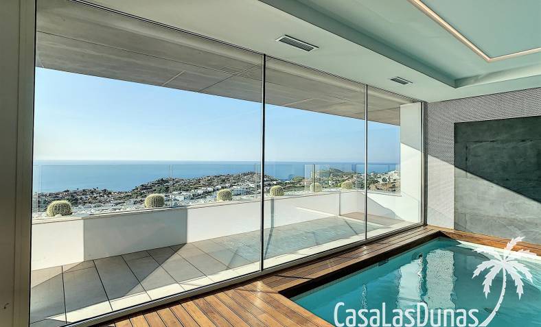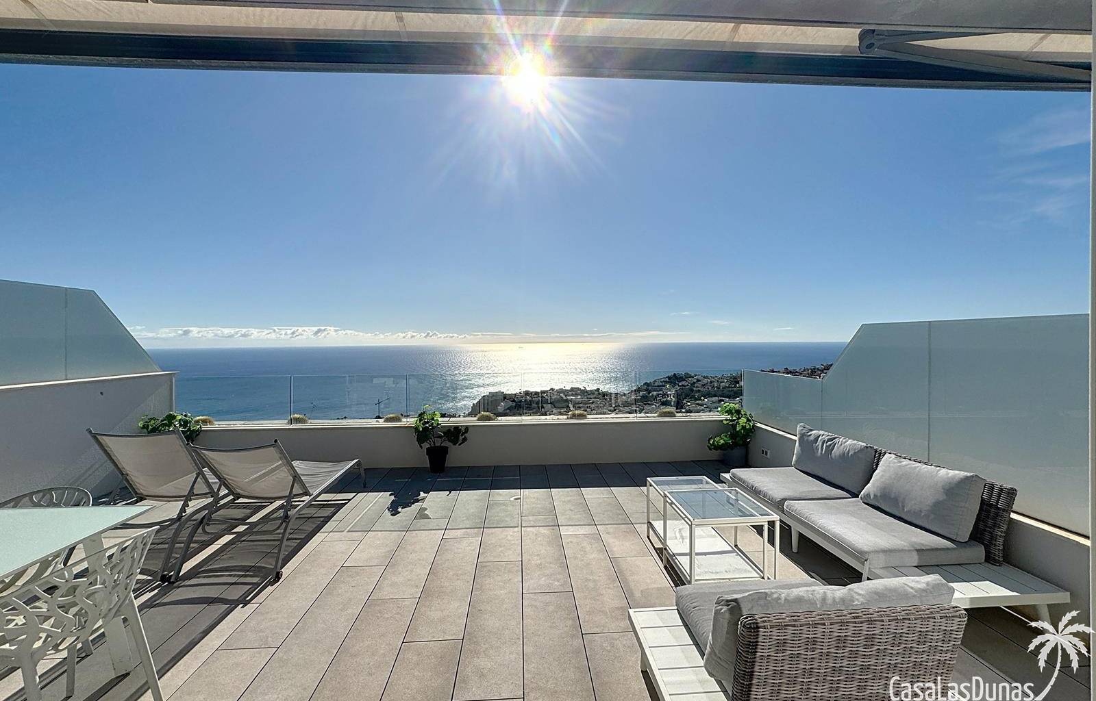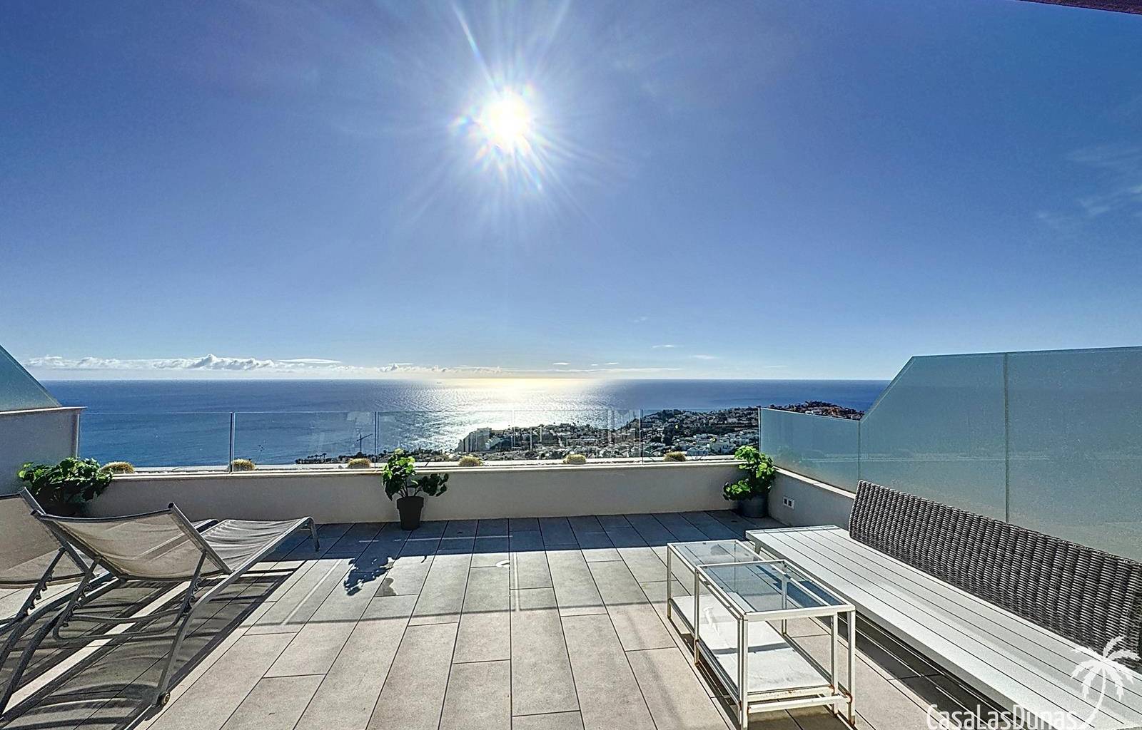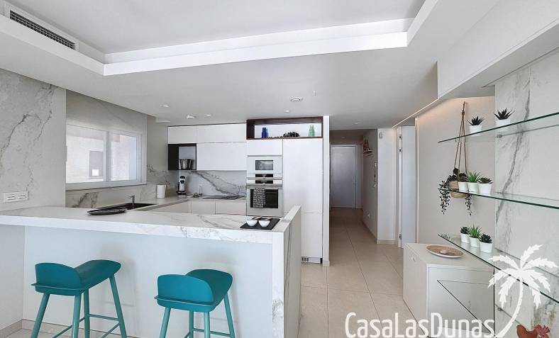 This luxury apartment on the Cumbre offers stunning views of the Mediterranean Sea and was built in 2020 in a modern complex with both indoor and outdoor pools. The property boasts 106m² of living space and a generous 50m² of terrace. The apartment comprises an entrance hall, a kitchen with a utility/storage room, a spacious living/dining room, two guest bedrooms with a separate bathroom, and a spacious master bedroom with an en-suite bathroom. The apartment boasts an optimal layout, with access to the front terrace from both the living area and the master bedroom. A 6m² storage room and a 13m² covered parking space are also included.