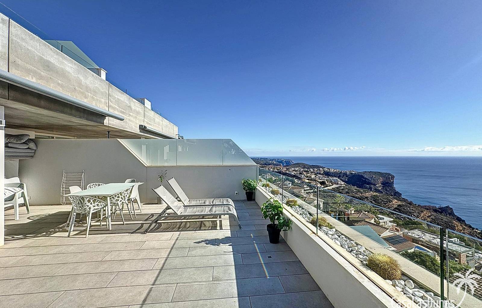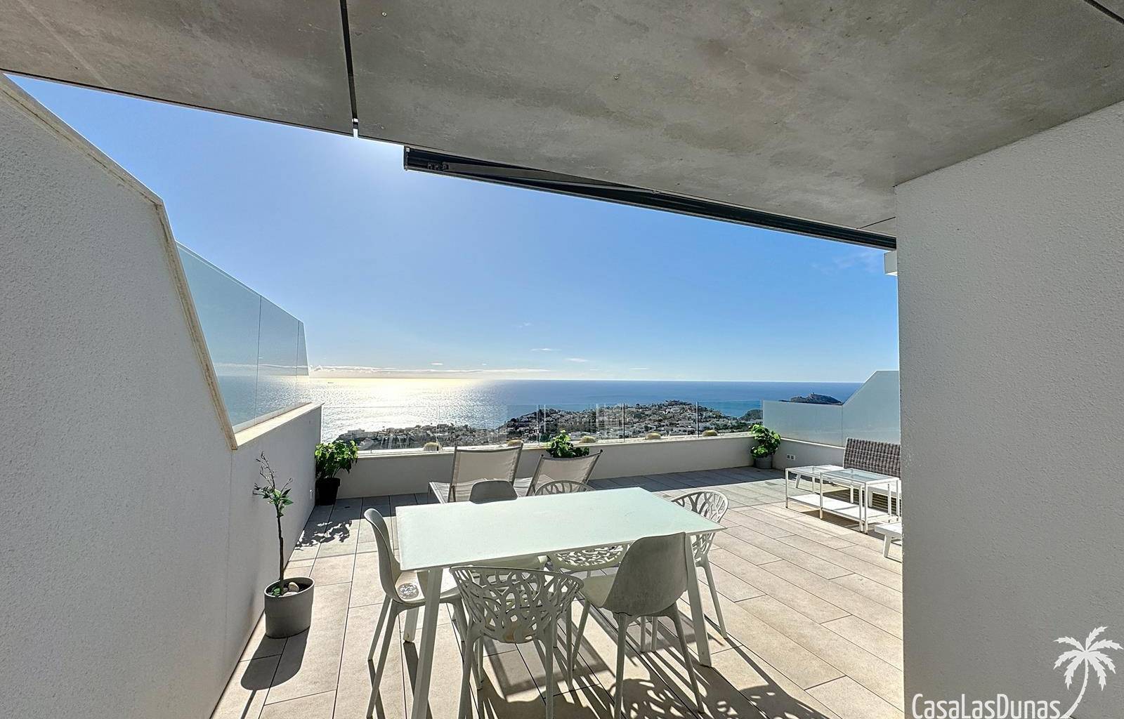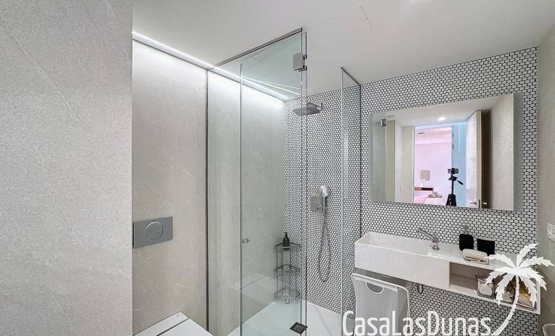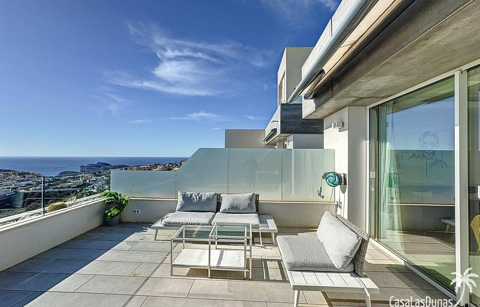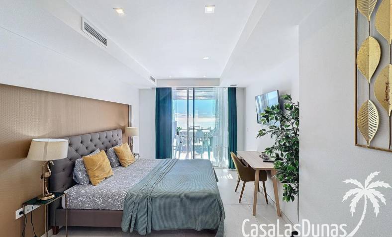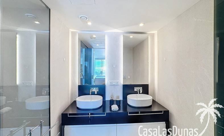 This luxury apartment on the Cumbre offers stunning views of the Mediterranean Sea and was built in 2020 in a modern complex with both indoor and outdoor pools. The property boasts 106m² of living space and a generous 50m² of terrace. The apartment comprises an entrance hall, a kitchen with a utility/storage room, a spacious living/dining room, two guest bedrooms with a separate bathroom, and a spacious master bedroom with an en-suite bathroom. The apartment boasts an optimal layout, with access to the front terrace from both the living area and the master bedroom. A 6m² storage room and a 13m² covered parking space are also included.