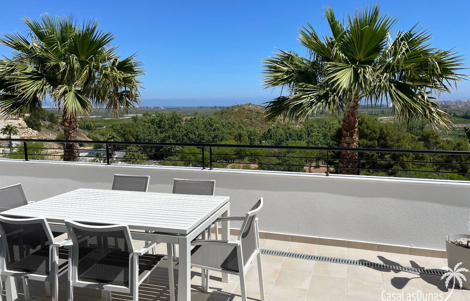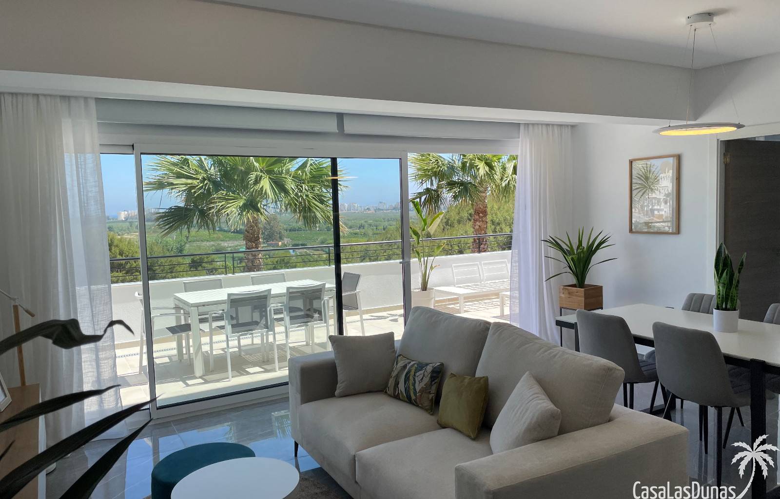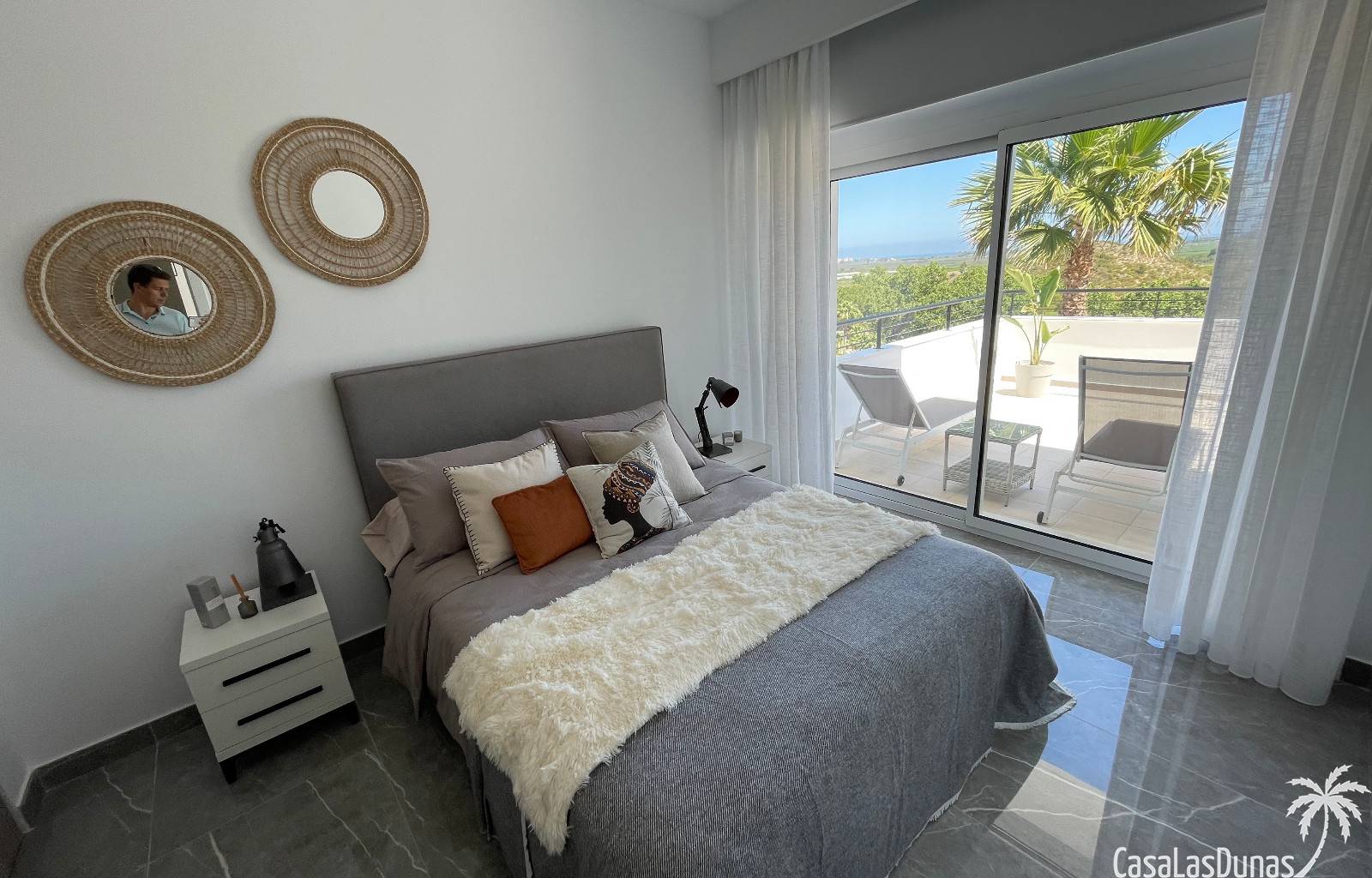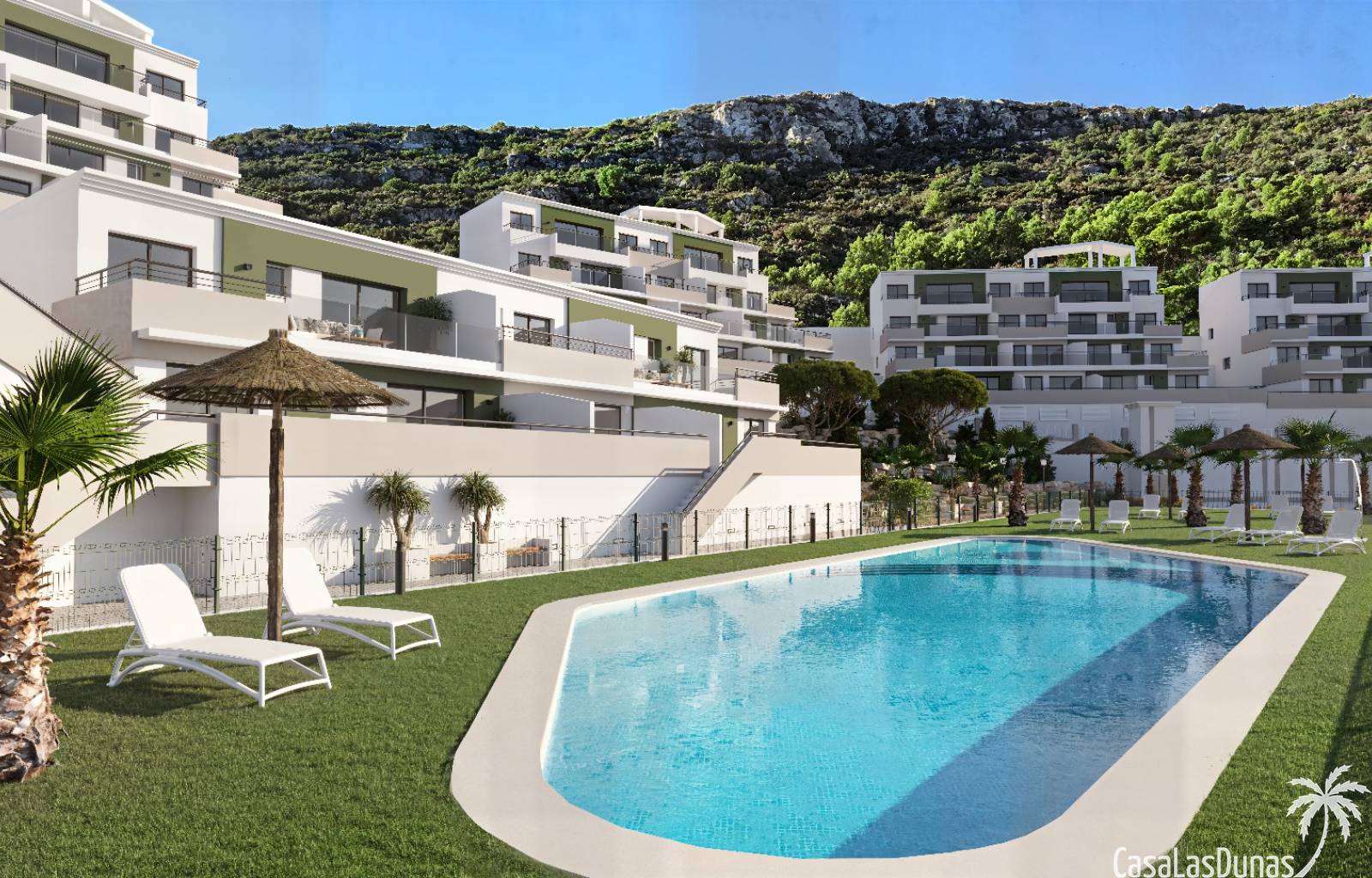 This modern three-bedroom apartment currently under construction offers a spacious, open-plan living area with large sliding doors leading to a terrace with panoramic views of the coastline. The apartment boasts an ideal layout with a bright, open-plan living area featuring an open-plan kitchen and access to the front terrace. It comprises two bedrooms and two bathrooms, with the master bedroom also offering sea views and access to the terrace. The complex is less than a 10-minute drive from the beach and features beautiful communal gardens with several swimming pools and a fitness room. The apartments are sold with a parking space and storage unit in the underground garage.