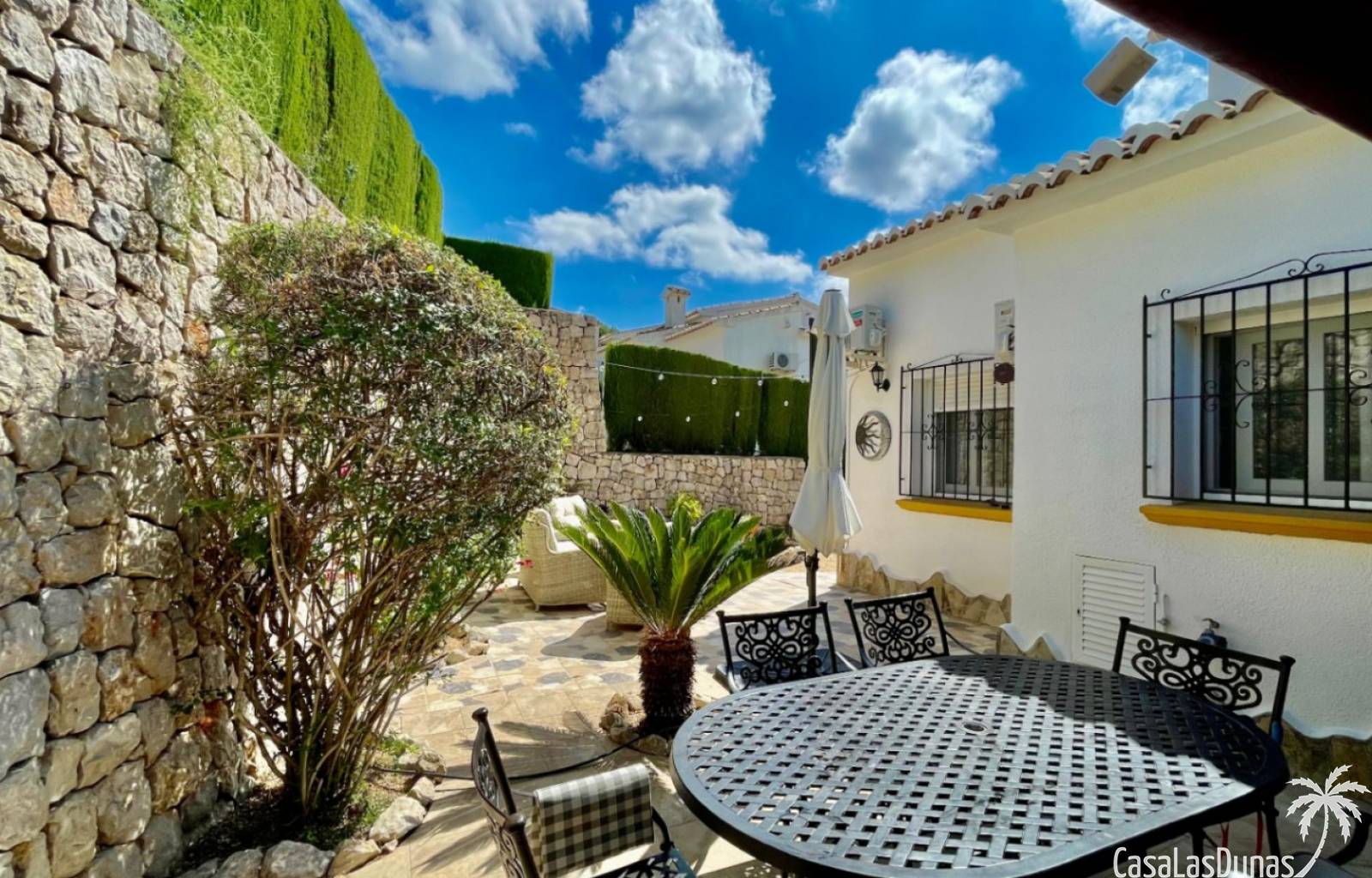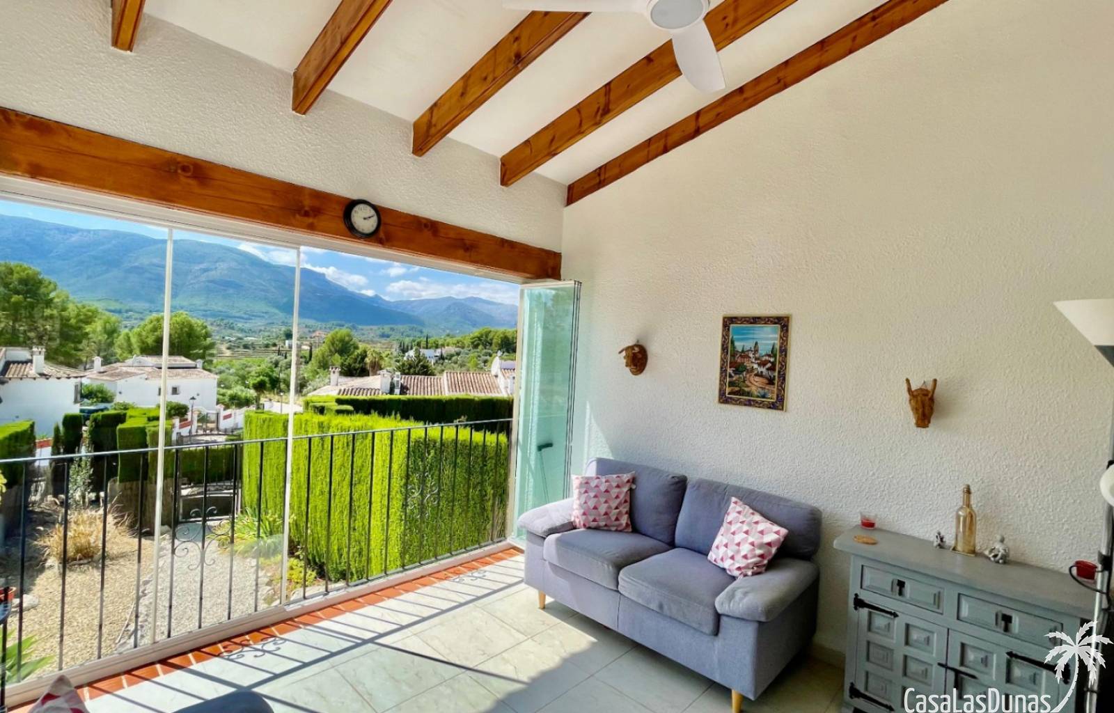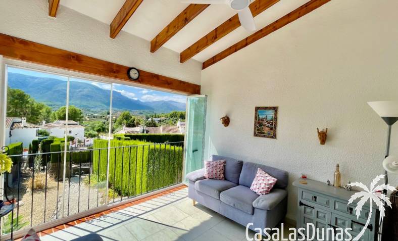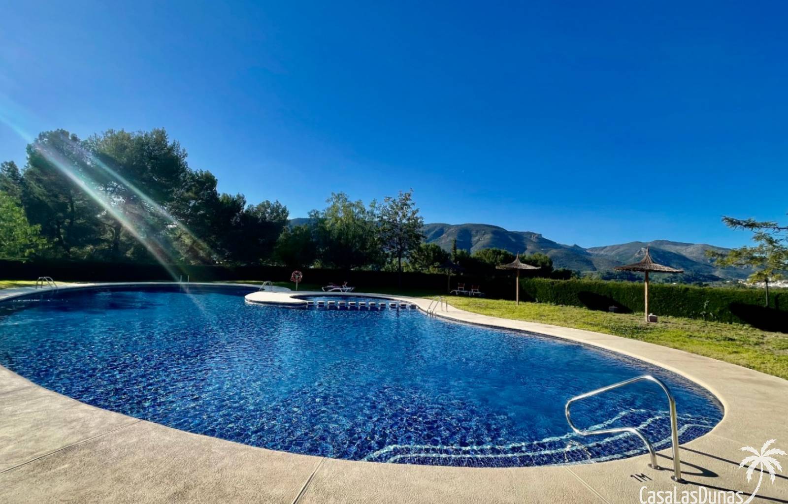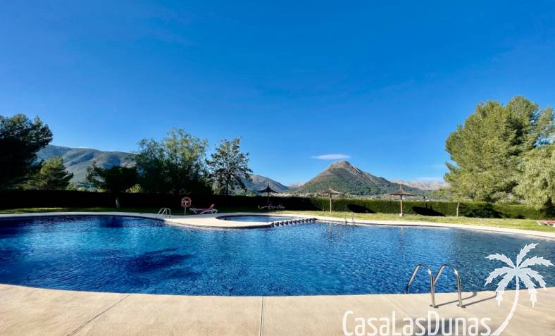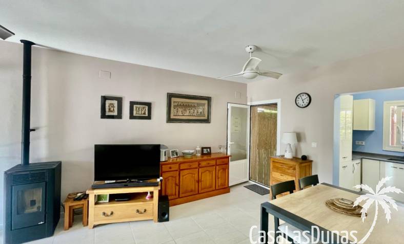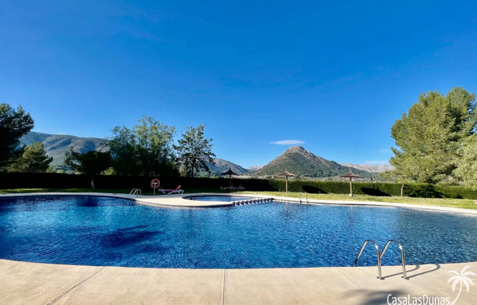 This south facing semi detached villa with open views and private garden is located in a lovely community with large communal pool. The house comprises of a covered naya leading to a large open plan living/dining room with pellet burner, hot and cold air conditioning and ceiling fans. The fully fitted kitchen has an external door leading to a very private terrace for dining/relaxing with gas BBQ. There are two double bedrooms with fitted wardrobes, hot and cold air conditioning, ceiling fans and a modern bathroom. The villa has a small underground storage room and off street parking. The property also has access to the very well maintained communal pool area with showers, toilets, parasols and sun loungers. Within walking distance you will find a popular restaurant, it is a 5 minute drive to Orba/Jalon/Murla and a 20 minute drive to the bustling town of Denia and its beaches, and 25/30 minutes to Javea/Moraira and Calpe.