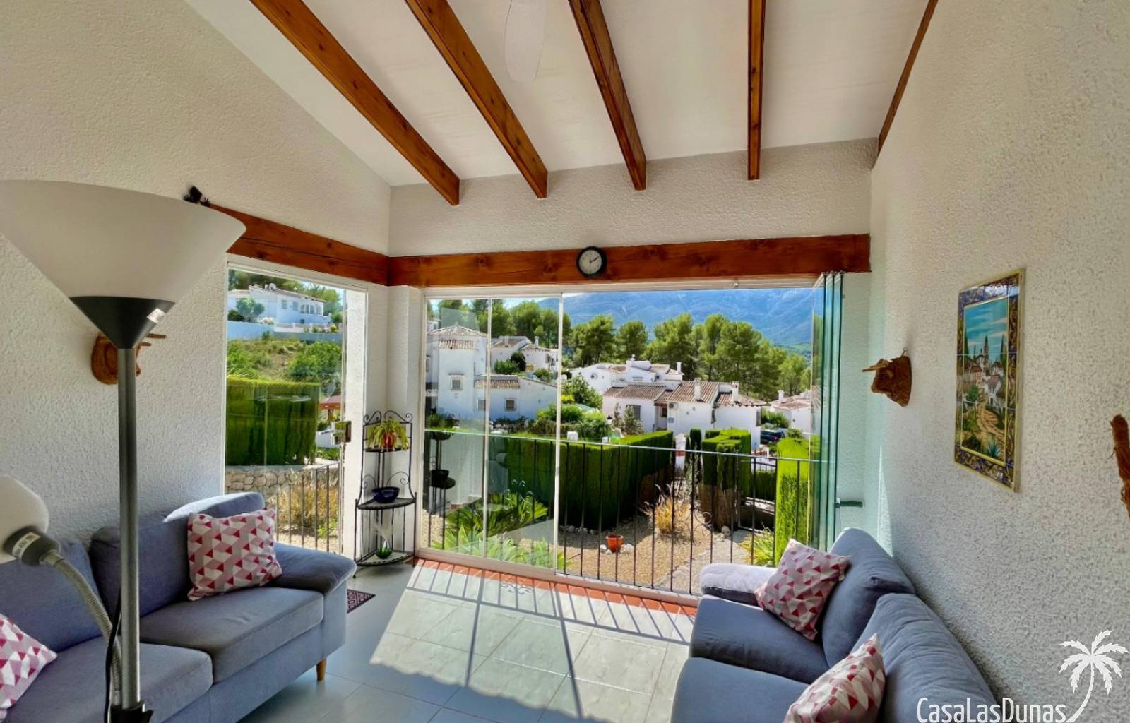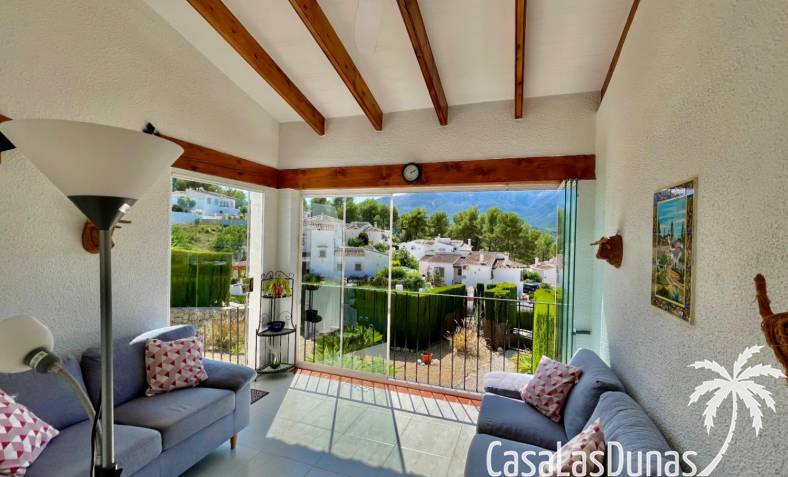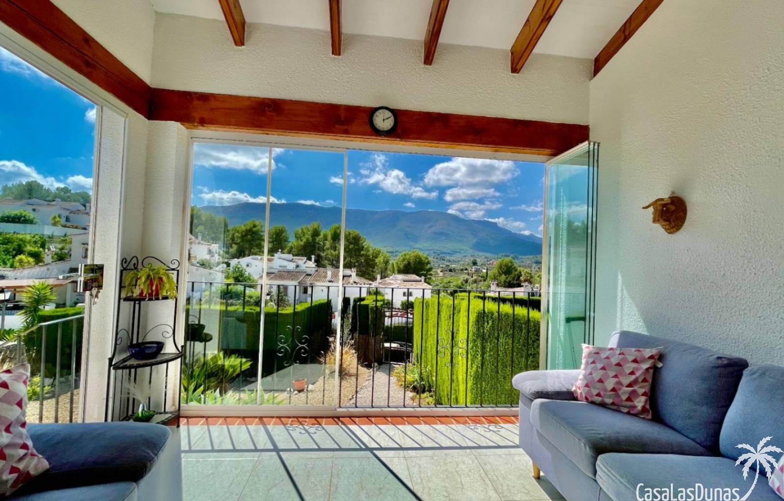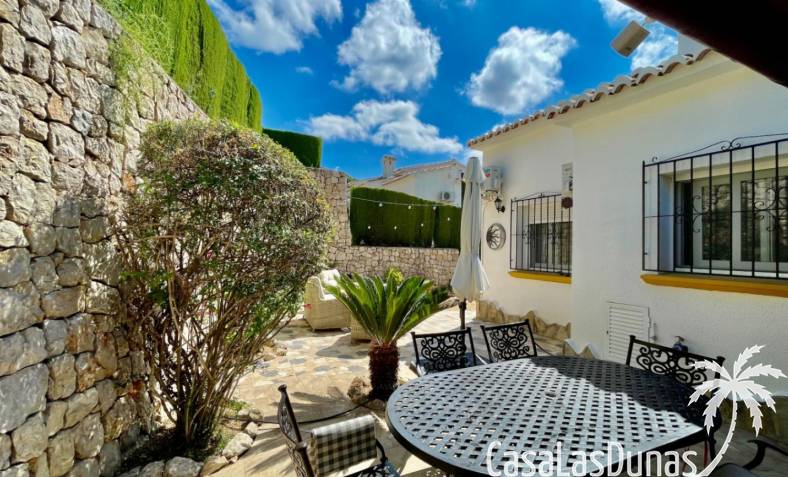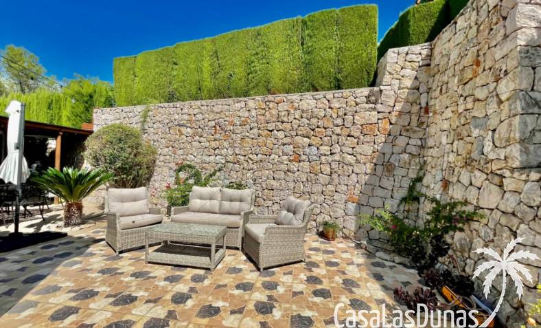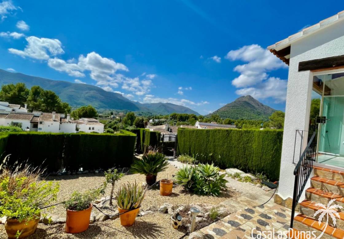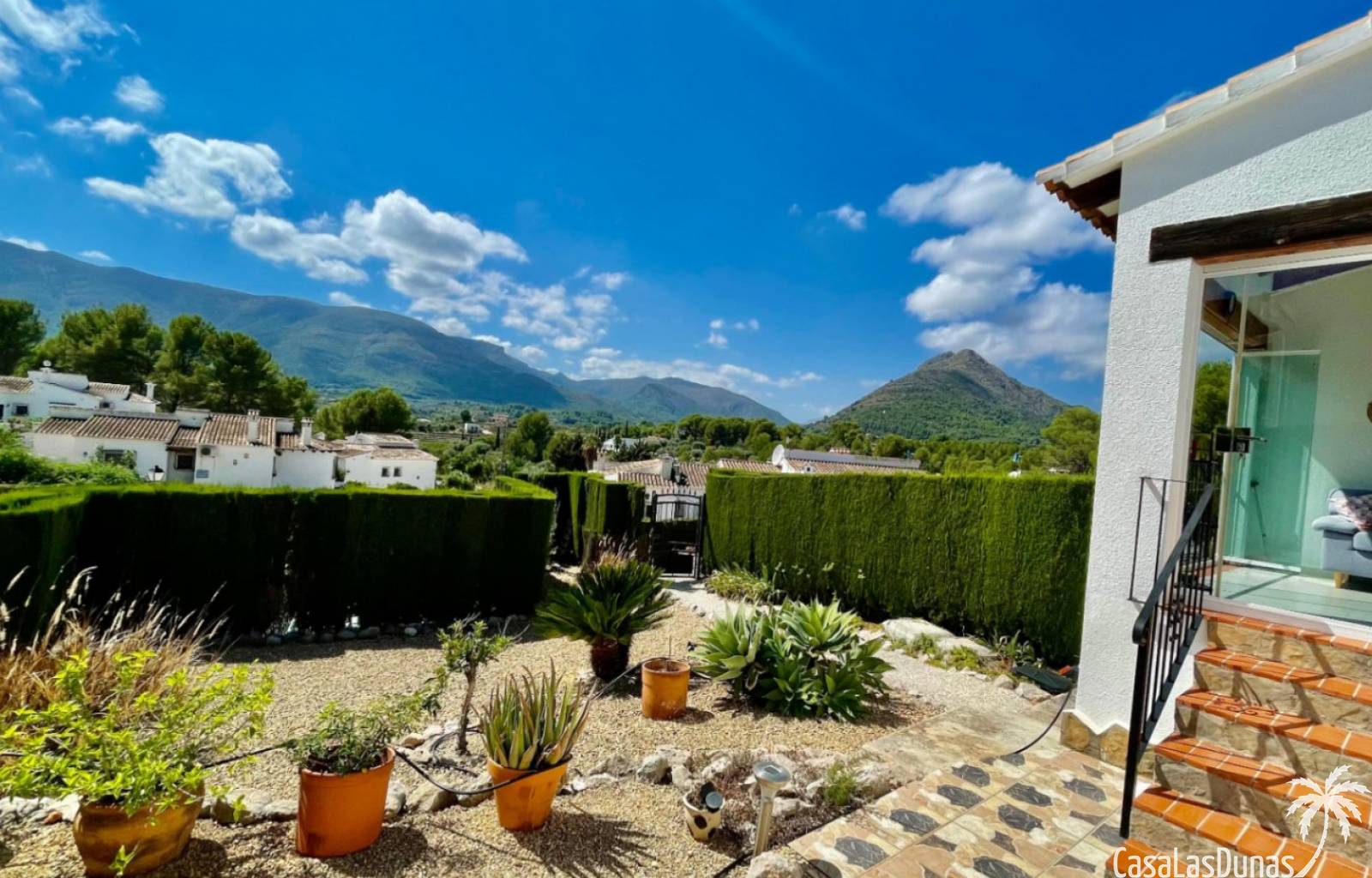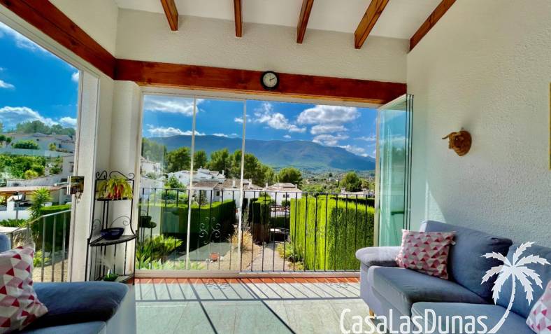 This south facing semi detached villa with open views and private garden is located in a lovely community with large communal pool. The house comprises of a covered naya leading to a large open plan living/dining room with pellet burner, hot and cold air conditioning and ceiling fans. The fully fitted kitchen has an external door leading to a very private terrace for dining/relaxing with gas BBQ. There are two double bedrooms with fitted wardrobes, hot and cold air conditioning, ceiling fans and a modern bathroom. The villa has a small underground storage room and off street parking. The property also has access to the very well maintained communal pool area with showers, toilets, parasols and sun loungers. Within walking distance you will find a popular restaurant, it is a 5 minute drive to Orba/Jalon/Murla and a 20 minute drive to the bustling town of Denia and its beaches, and 25/30 minutes to Javea/Moraira and Calpe.