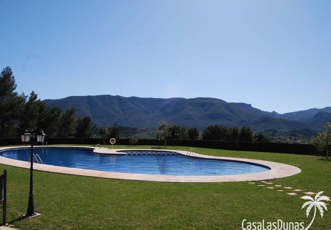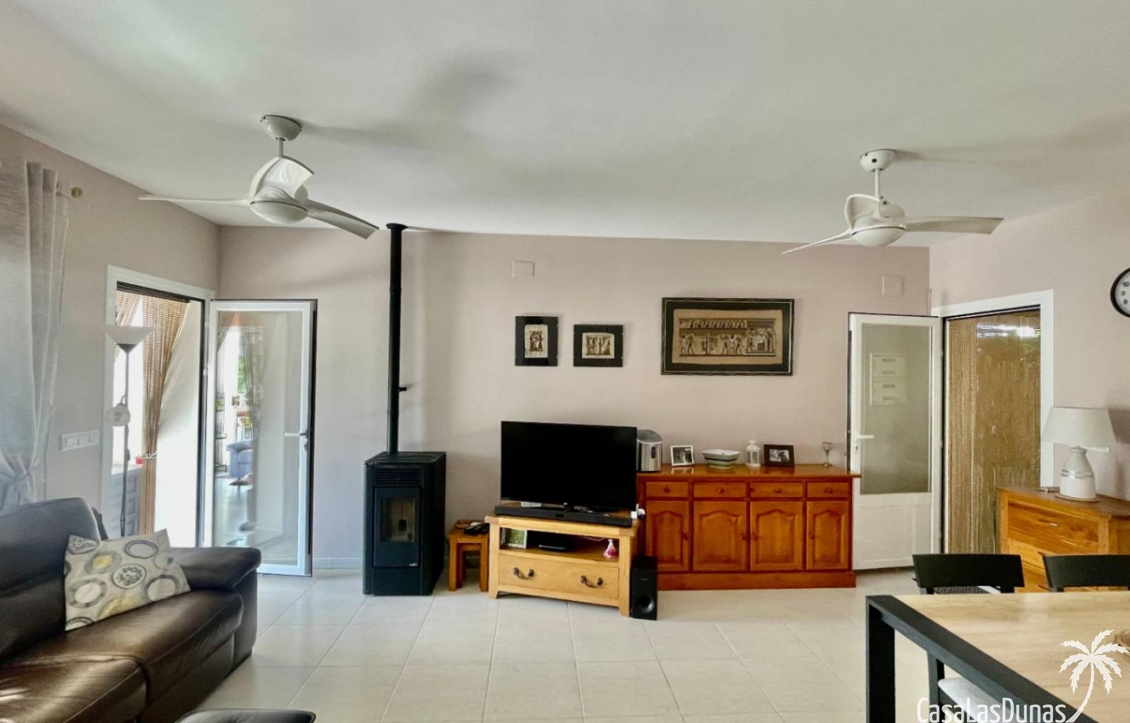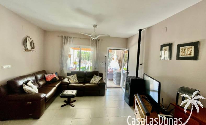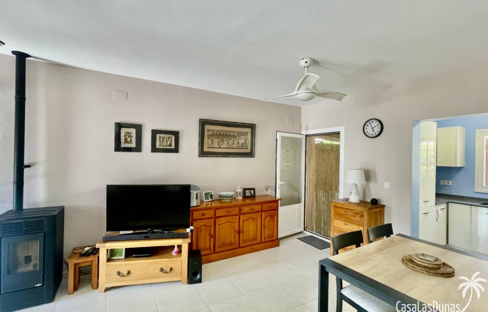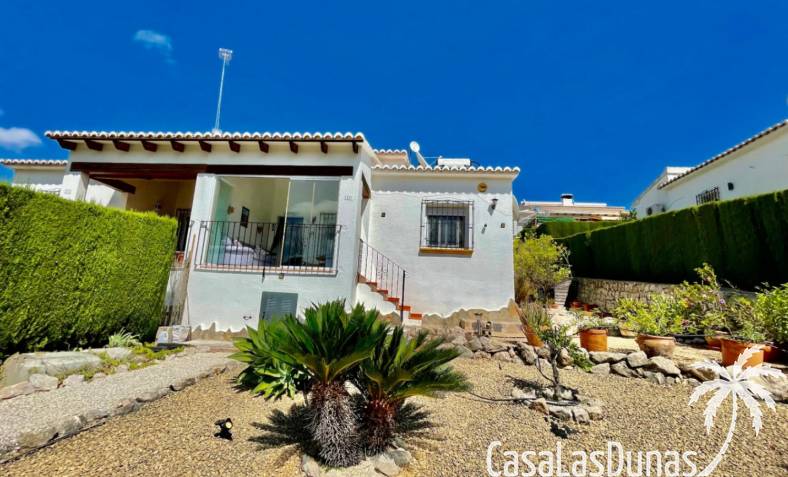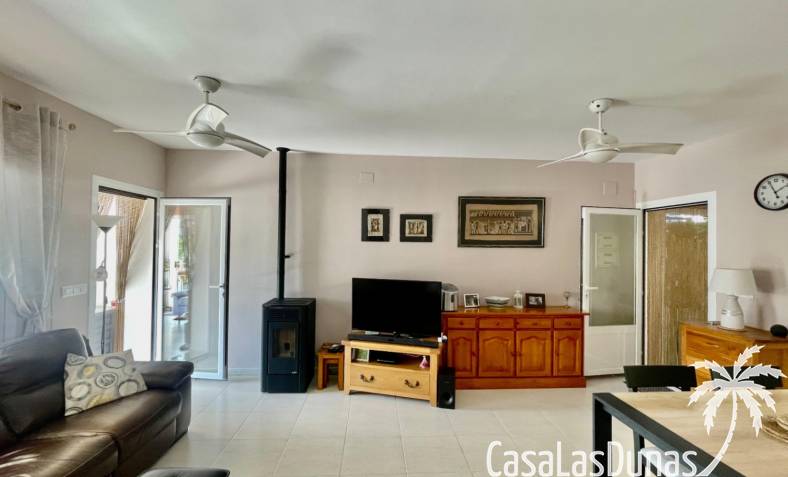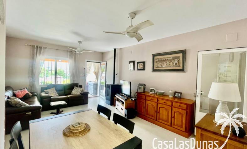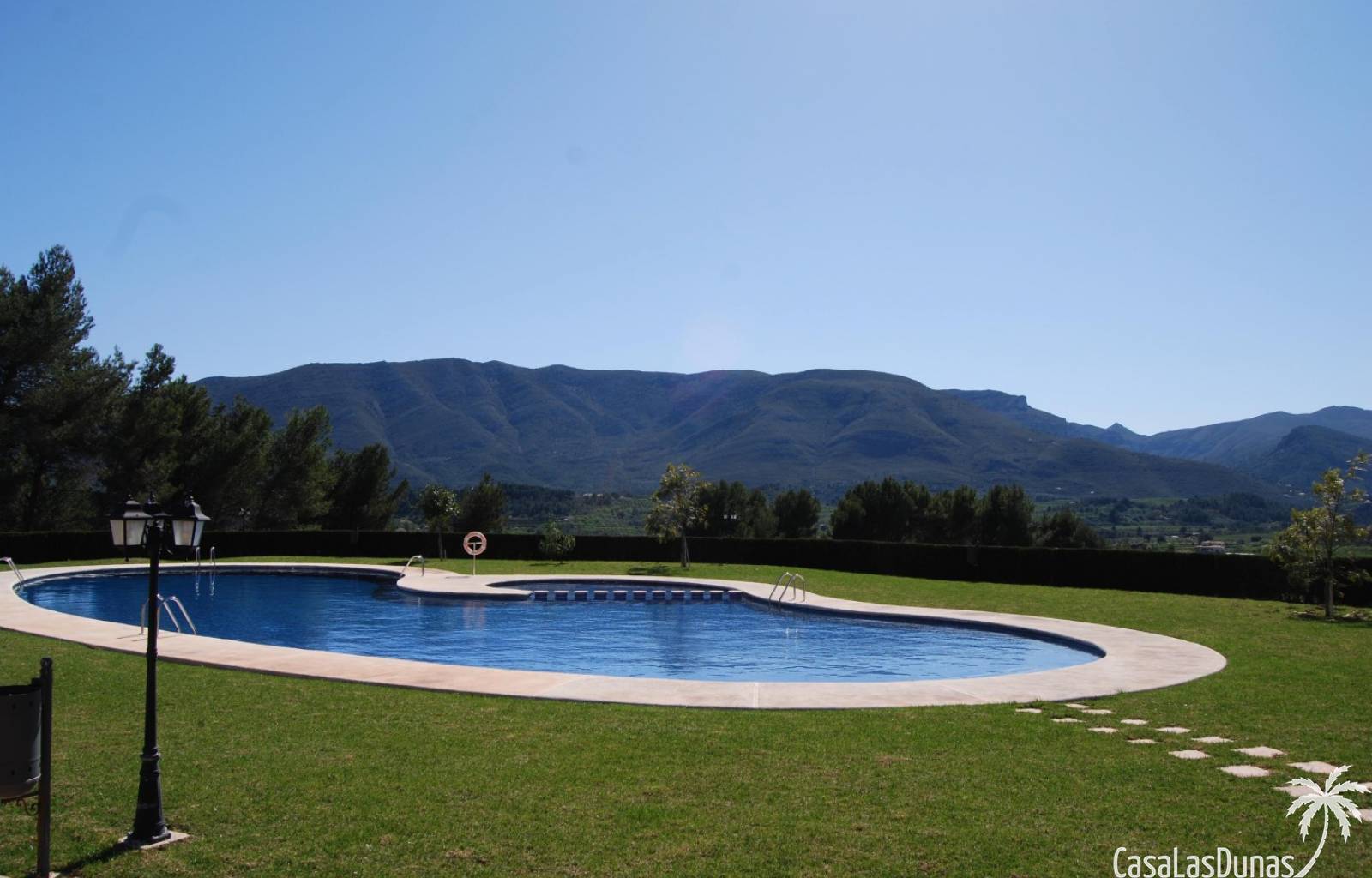 This south facing semi detached villa with open views and private garden is located in a lovely community with large communal pool. The house comprises of a covered naya leading to a large open plan living/dining room with pellet burner, hot and cold air conditioning and ceiling fans. The fully fitted kitchen has an external door leading to a very private terrace for dining/relaxing with gas BBQ. There are two double bedrooms with fitted wardrobes, hot and cold air conditioning, ceiling fans and a modern bathroom. The villa has a small underground storage room and off street parking. The property also has access to the very well maintained communal pool area with showers, toilets, parasols and sun loungers. Within walking distance you will find a popular restaurant, it is a 5 minute drive to Orba/Jalon/Murla and a 20 minute drive to the bustling town of Denia and its beaches, and 25/30 minutes to Javea/Moraira and Calpe.