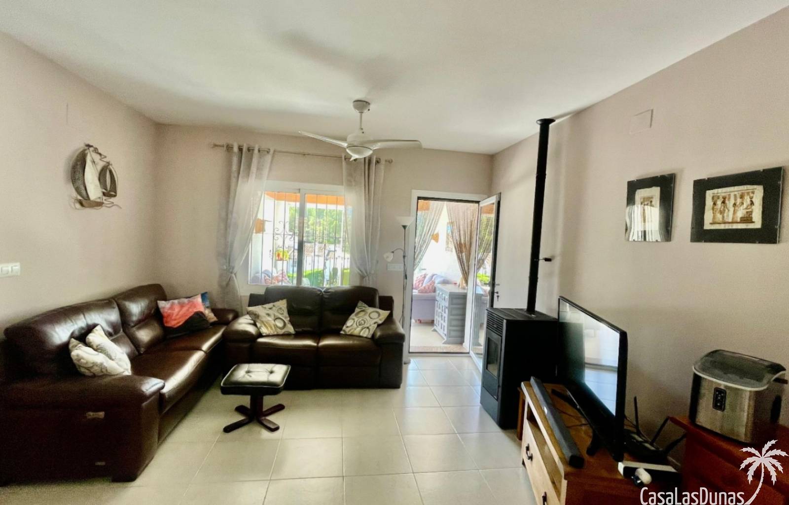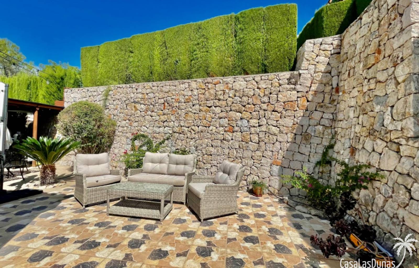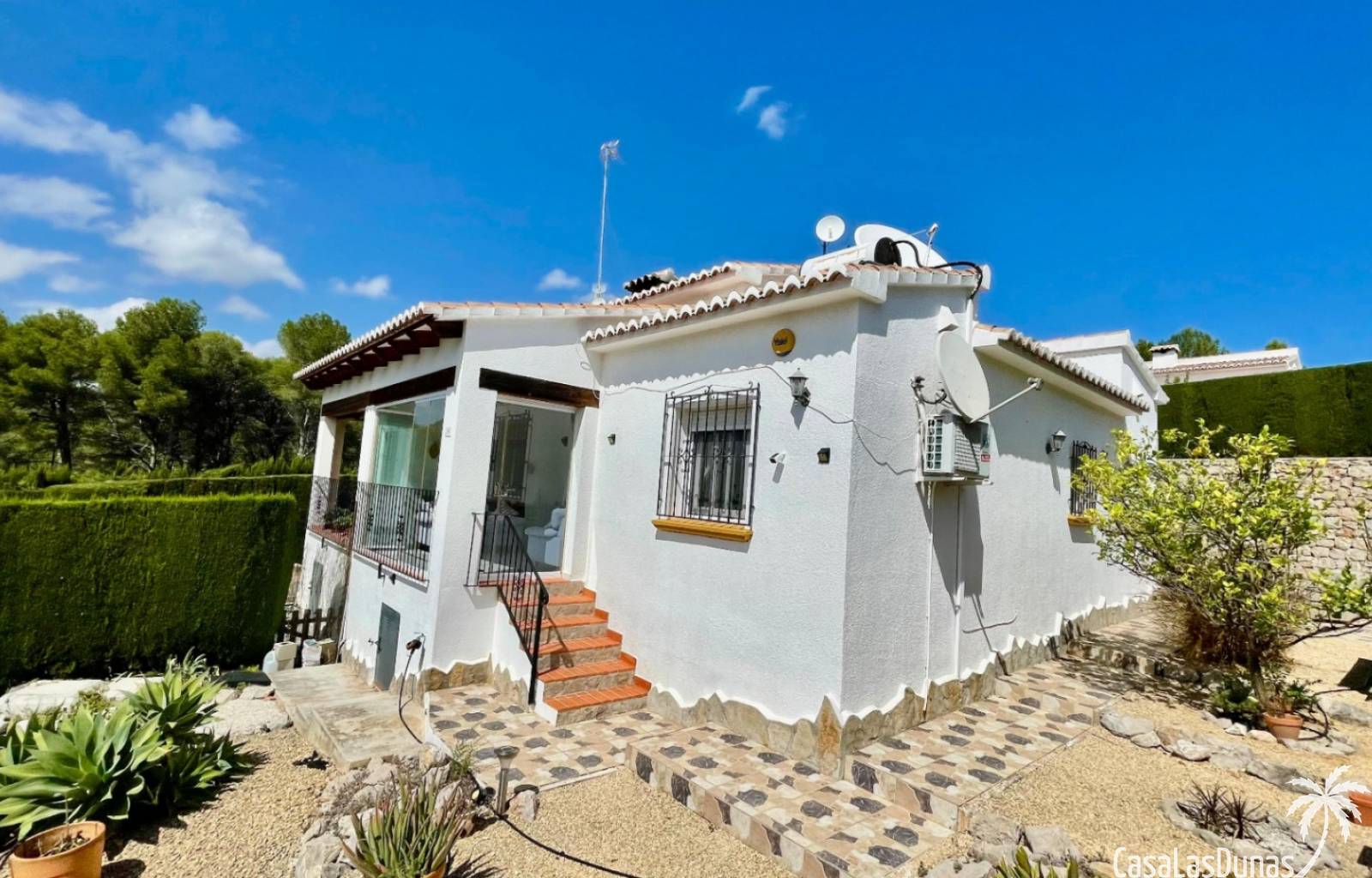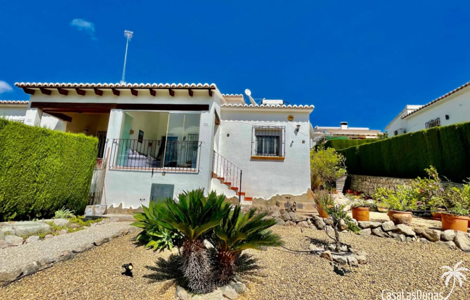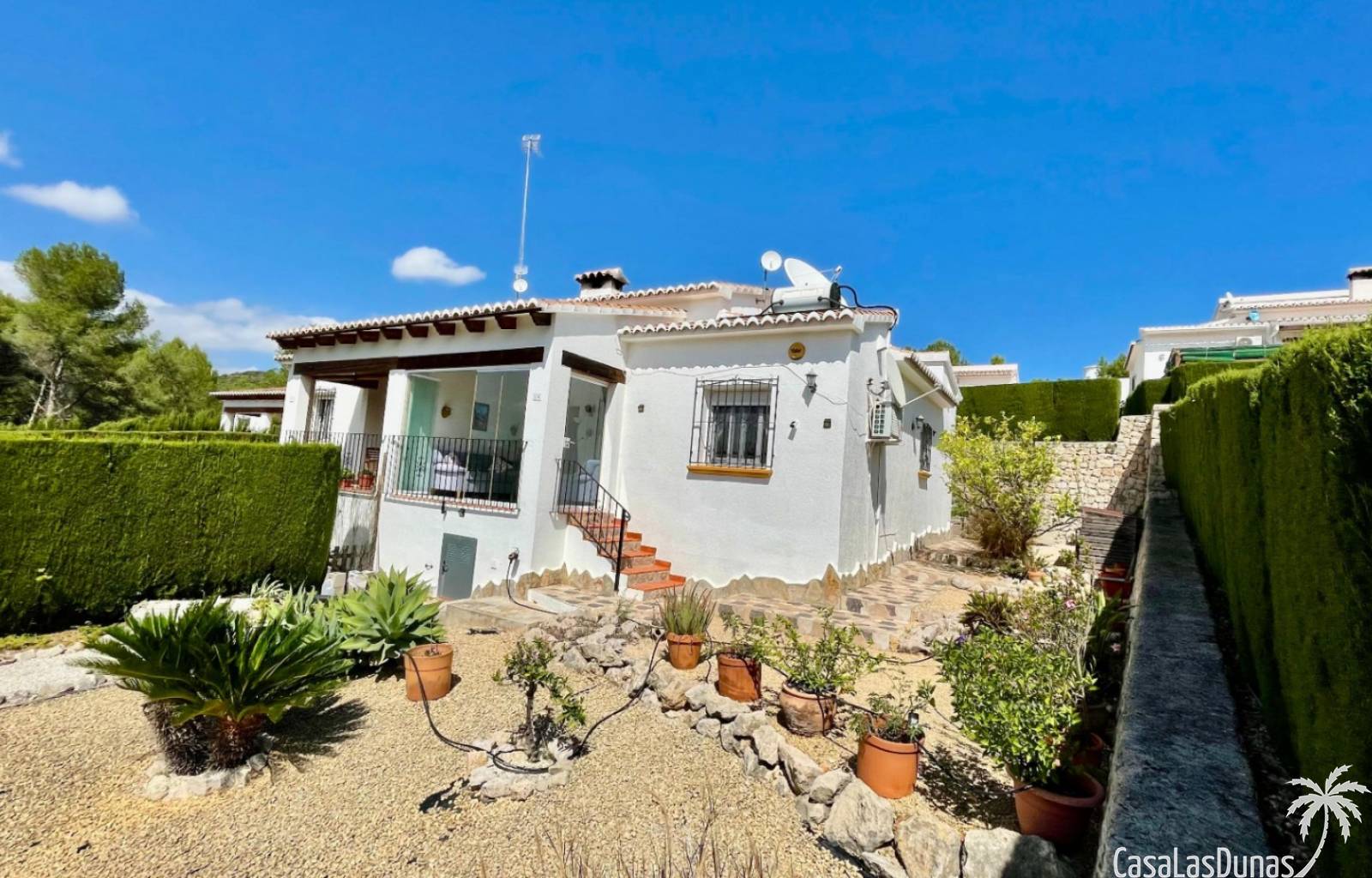 This south facing semi detached villa with open views and private garden is located in a lovely community with large communal pool. The house comprises of a covered naya leading to a large open plan living/dining room with pellet burner, hot and cold air conditioning and ceiling fans. The fully fitted kitchen has an external door leading to a very private terrace for dining/relaxing with gas BBQ. There are two double bedrooms with fitted wardrobes, hot and cold air conditioning, ceiling fans and a modern bathroom. The villa has a small underground storage room and off street parking. The property also has access to the very well maintained communal pool area with showers, toilets, parasols and sun loungers. Within walking distance you will find a popular restaurant, it is a 5 minute drive to Orba/Jalon/Murla and a 20 minute drive to the bustling town of Denia and its beaches, and 25/30 minutes to Javea/Moraira and Calpe.