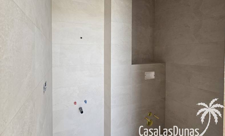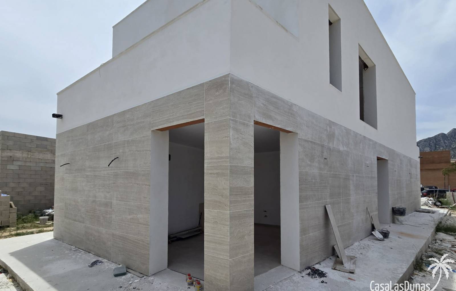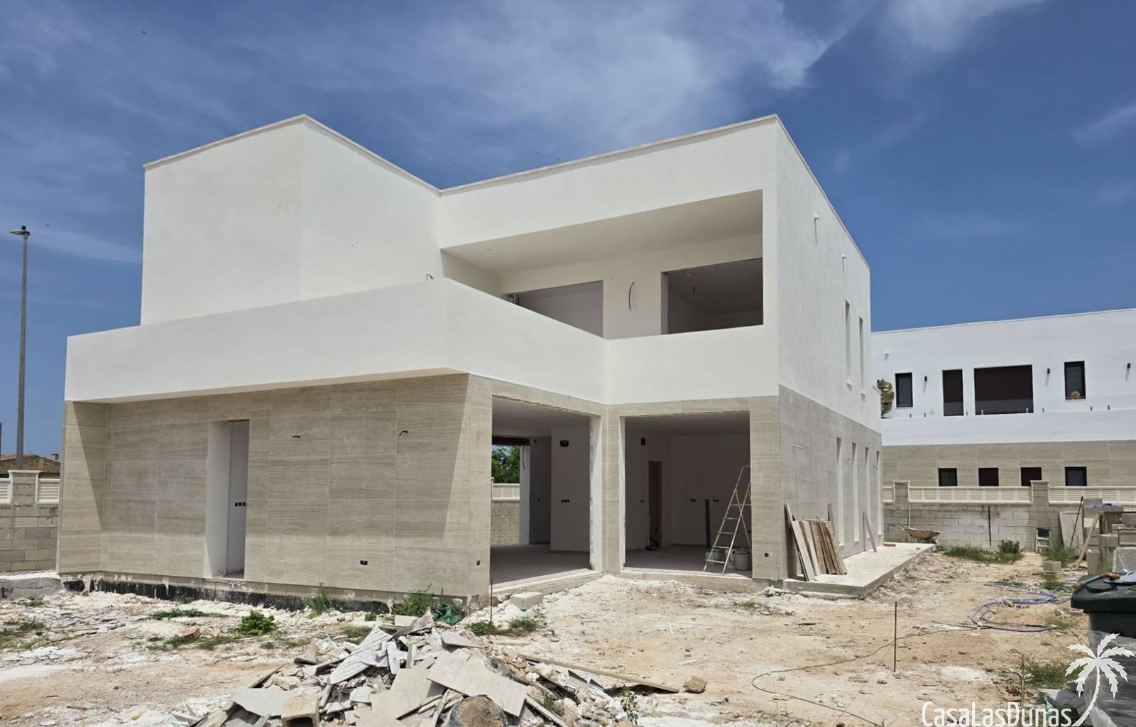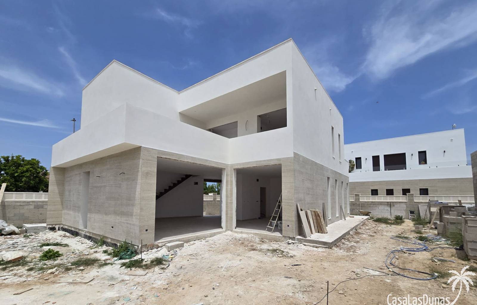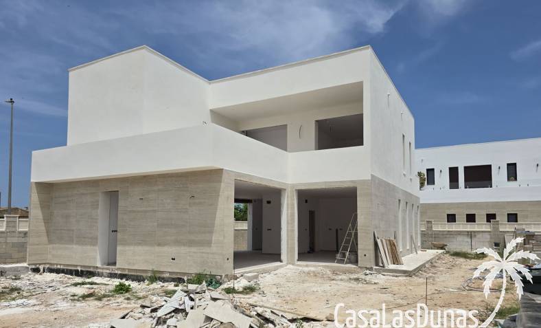 This modern villa with a private pool is being built a short walk from the center of El Vergel and all amenities, and a 5-minute drive from the expansive sandy beaches. The house is spread over two floors and features three bedrooms, all with en-suite bathrooms, plus an additional guest toilet. The open-plan kitchen with a cooking island seamlessly connects to the living room, creating a spacious and bright space thanks to its large windows. The villa is equipped with Bosch appliances, underfloor heating, and air conditioning with a heat pump.