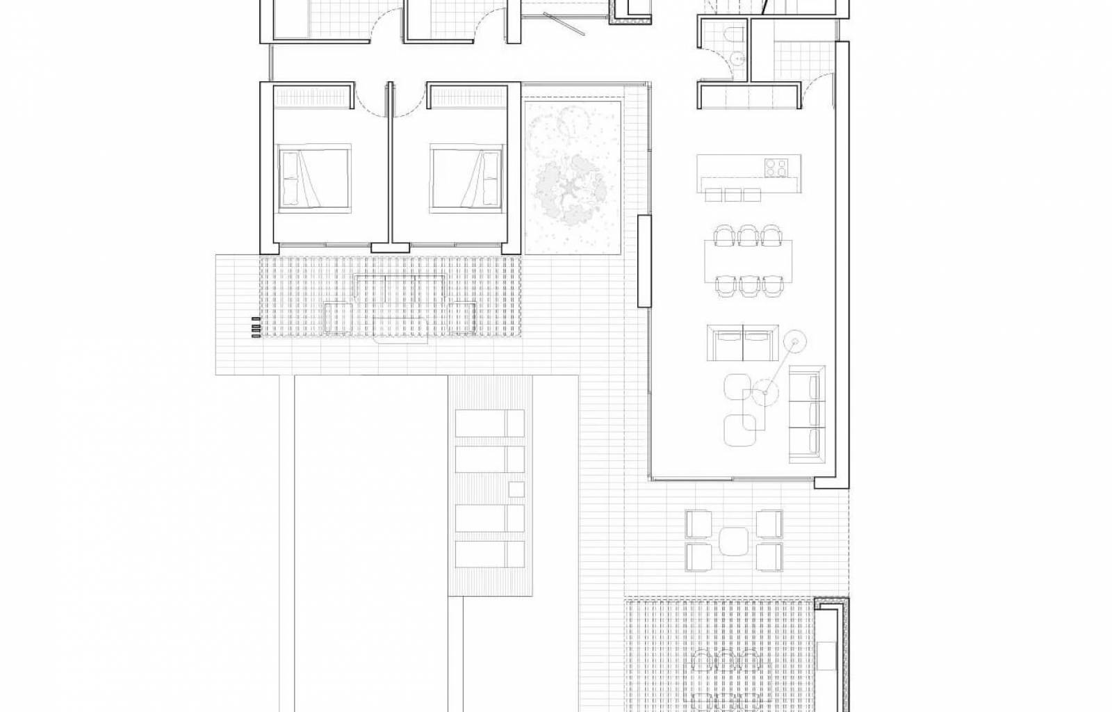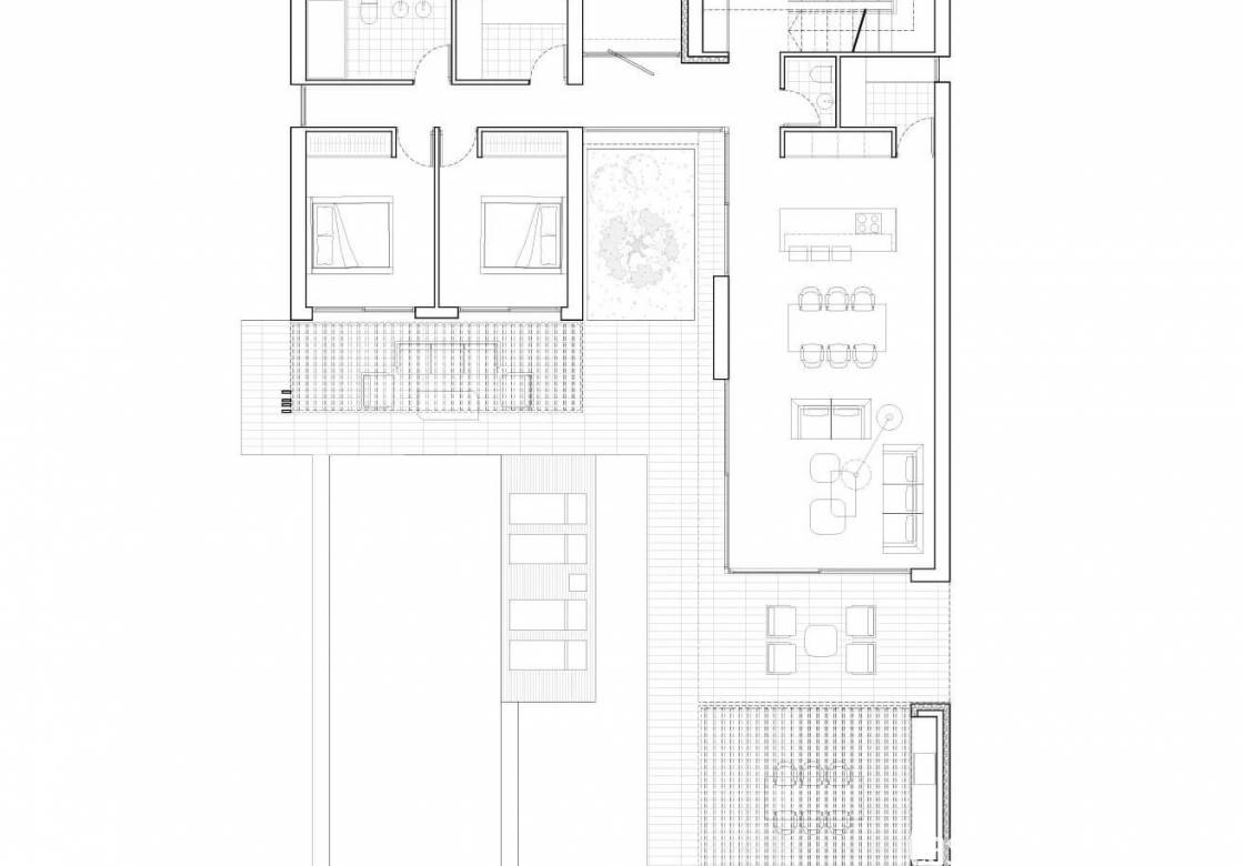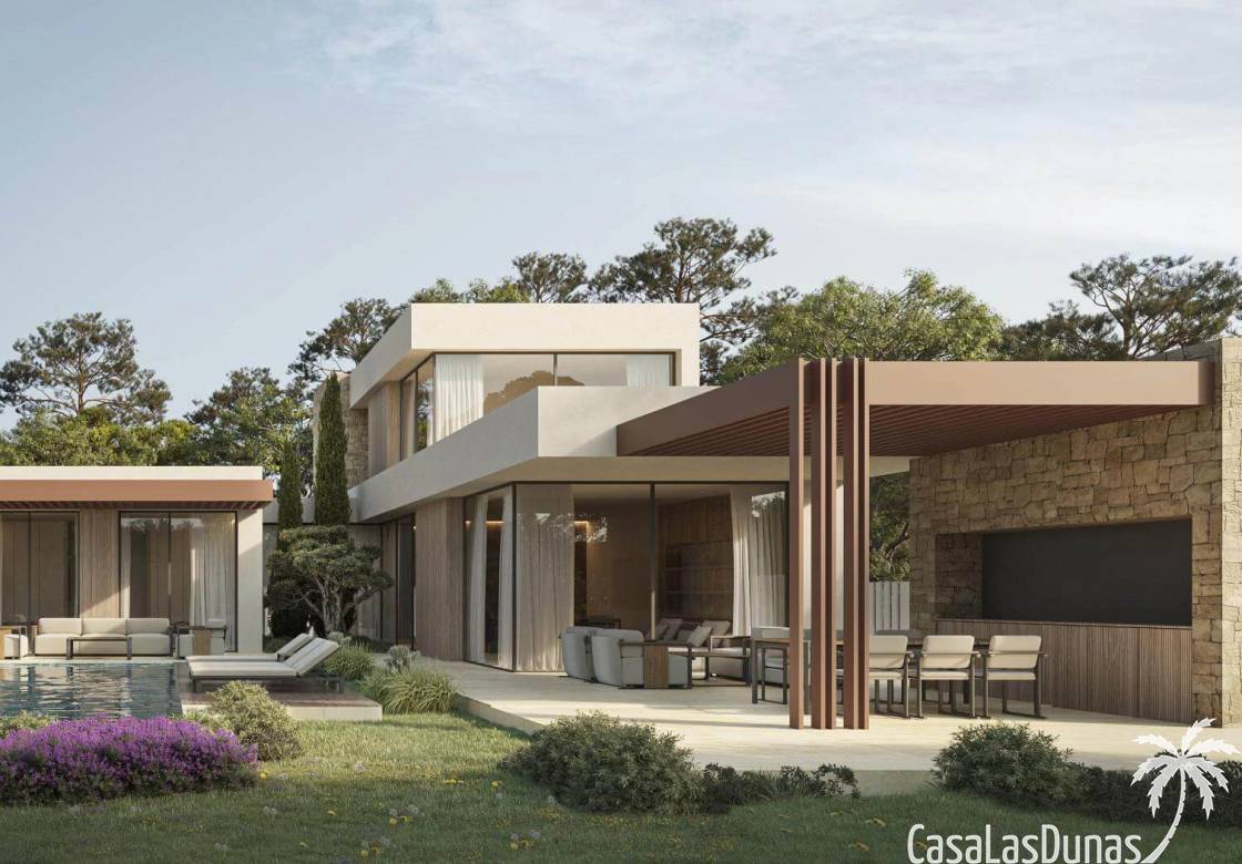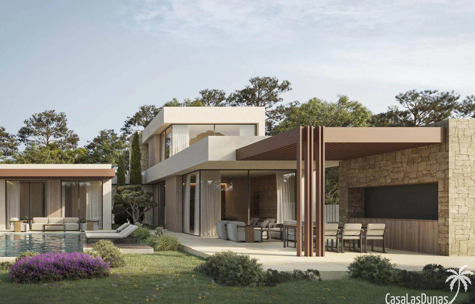This modern designer villa is being built in a quiet residential area on a completely flat, south-facing plot. The house boasts an elegant design with large windows and soft shapes overlooking a private pool and garden. The interior is spacious and filled with natural light, with an open-plan area connecting the living room, dining room, and outdoor terraces, ideal for relaxing or enjoying the outdoors. There are two bedrooms on the ground floor, and the master bedroom is located on the top floor.