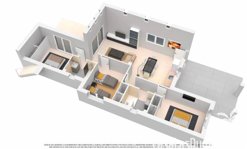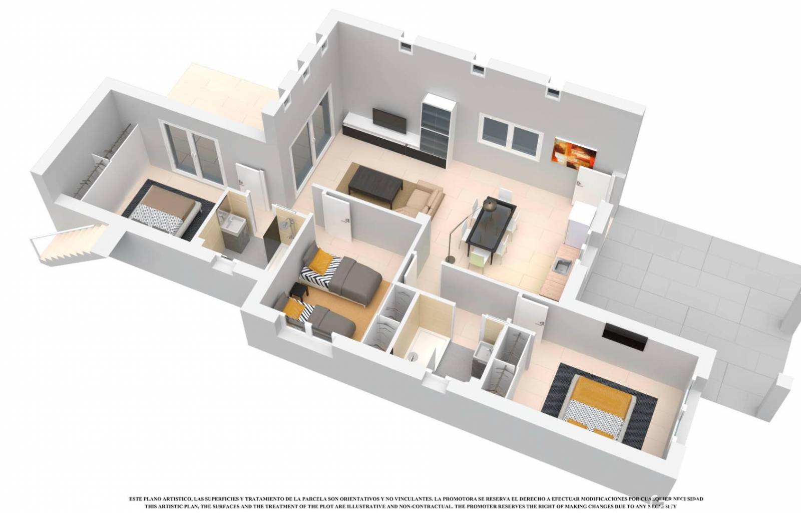 Villa with 3 bedrooms and 2 bathrooms, open plan kitchen with the lounge area, fitted wardrobes, solarium, private garden with off road parking space and space for a swimming pool.