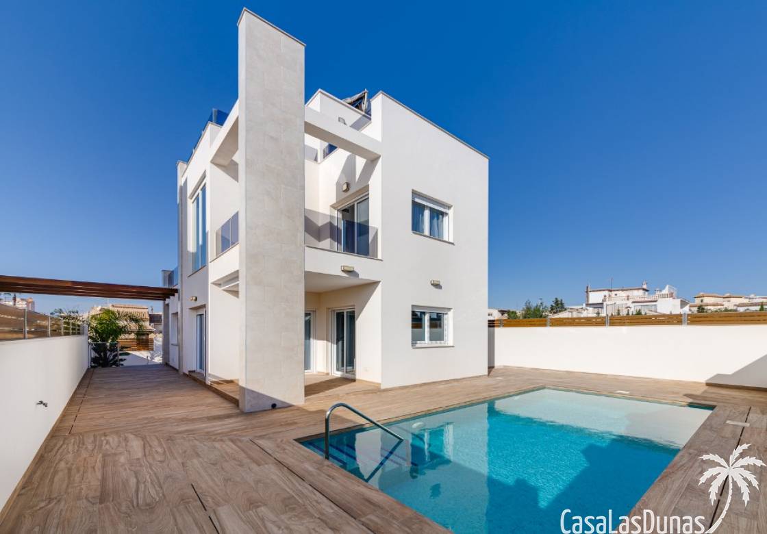 New build villa for sale in TorreviejaWe offer for sale new modern villa in Los Frutales, Torrevieja.The villa has 3 bedrooms with built in wardrobes, 3 bathrooms, spacious living-room, kitchen, basement, 2 terraces and solárium.Outside you will have a large garden with private pool and private parking area.All the necessary amenities for a comfortable stay are within walking distance - bars, restaurants, shops, pharmacies, the beautiful beaches of La Mata and Los Locos.Torrevieja is a tourist town on the Costa Blanca, a favorable climate and environmentally friendly nature with two salt lakes located within the city limits. The city stretches along the coast and therefore all the sandy beaches of the city are within walking distance. Infrastructure of the city perfectly developed. There are shopping centers, sports complexes, a nature preserve, many bars and restaurants.
