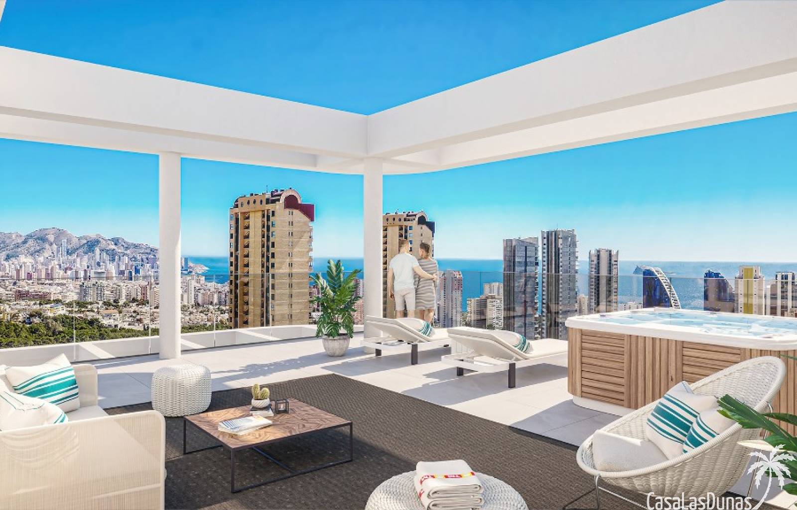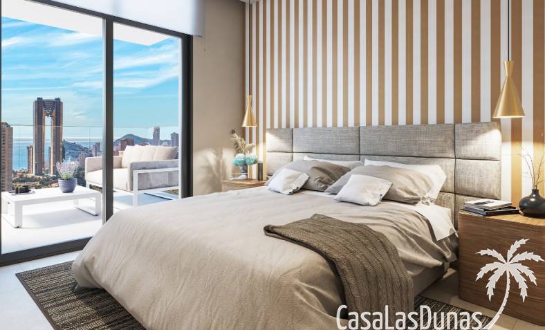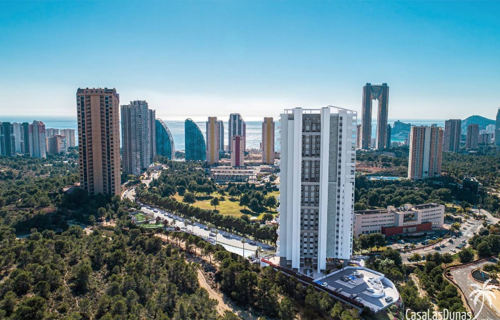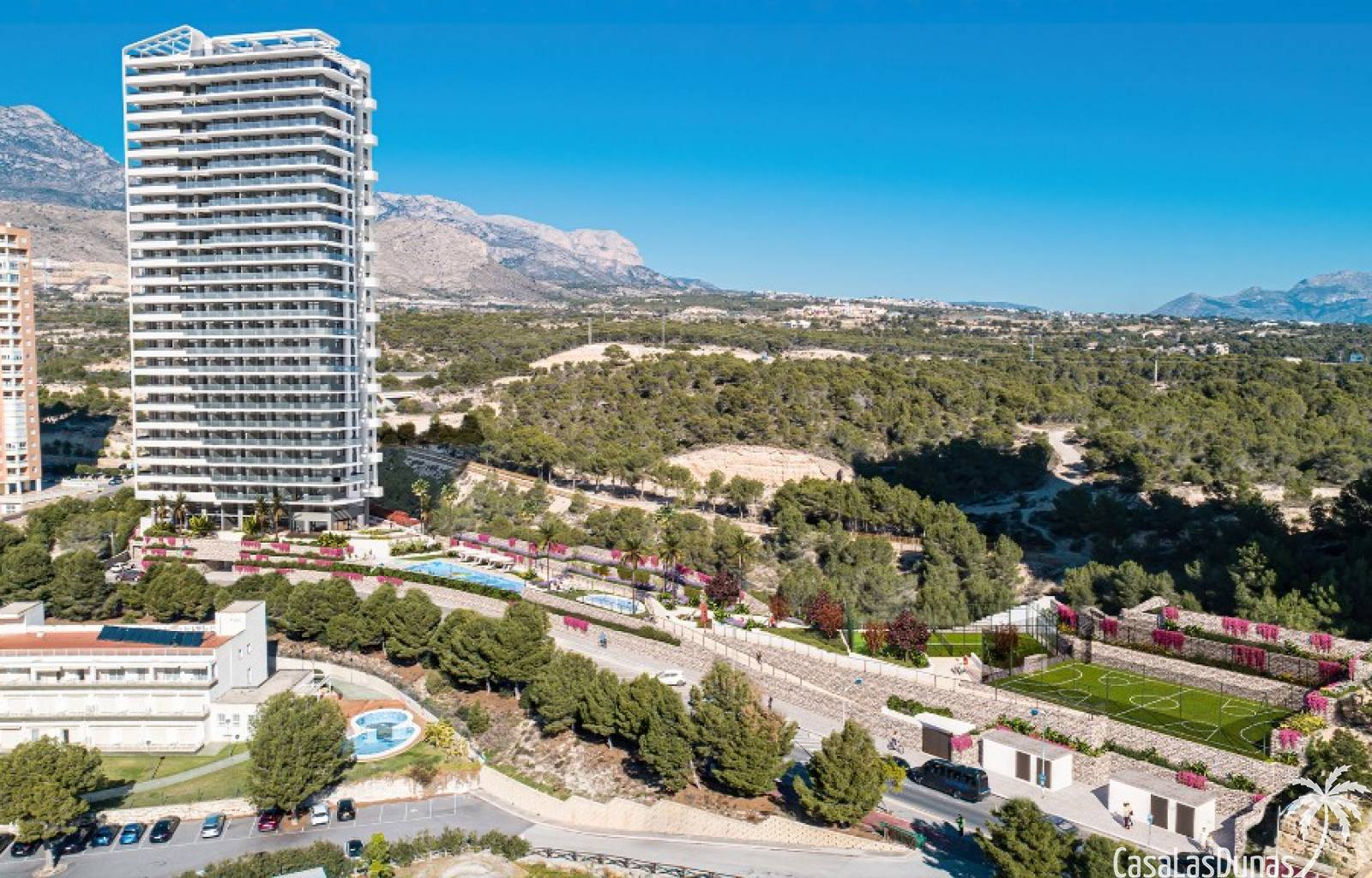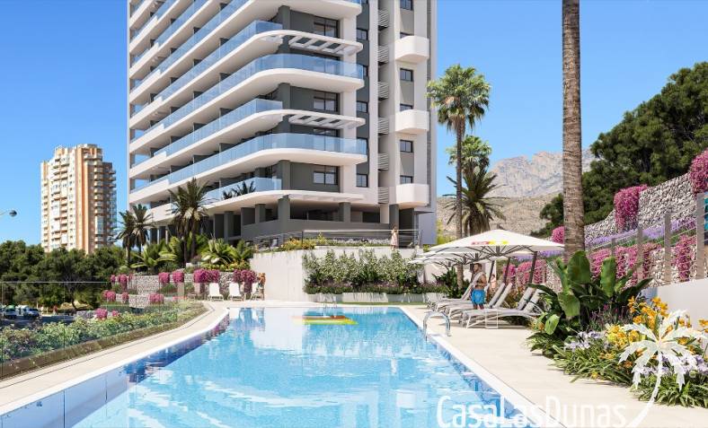 New apartments close to the beach in Benidorm.A residential project have properties with 1, 2, 3 and 4 bedrooms. Its unbeatable location and the height of the properties make it possible to enjoy magnificent views of the sea. Waking up every morning to stunning views and feeling as if you were floating on the sea. There is an adult pool, a children's pool with a play area, a gym, jacuzzis, chill-out area and different sports courts. A unique residential estate designed to enjoy life in the Mediterranean without limits.We offer apartments with 2 dormitorios, 2 bathrooms, living room, kitchen, parking space and storage room. All apartments will have a terrace with nice sea or golf view.The new complex of Benidorm is located in region on the Costa Blanca, close to neighboring Altea, around 40 kilometres from the city of Alicante.You will find shops, supermarkets, banks, restaurants, schools. Nearby of the international airport Alicante. Best place to enjoy your life in Spain!