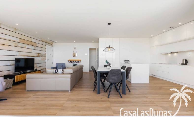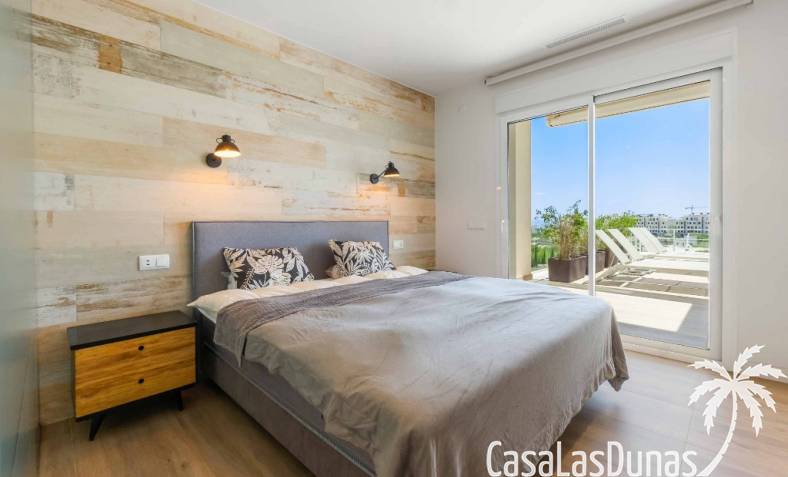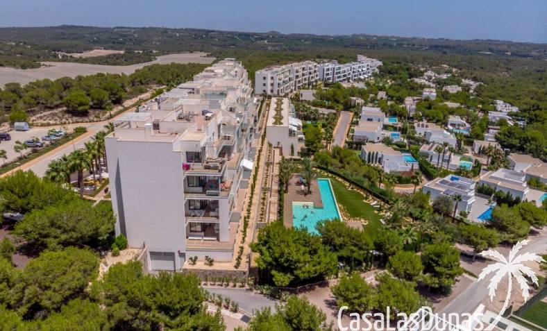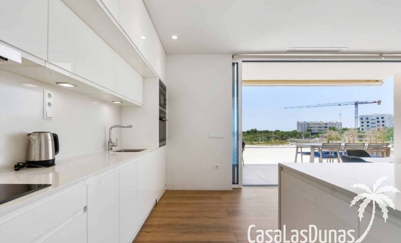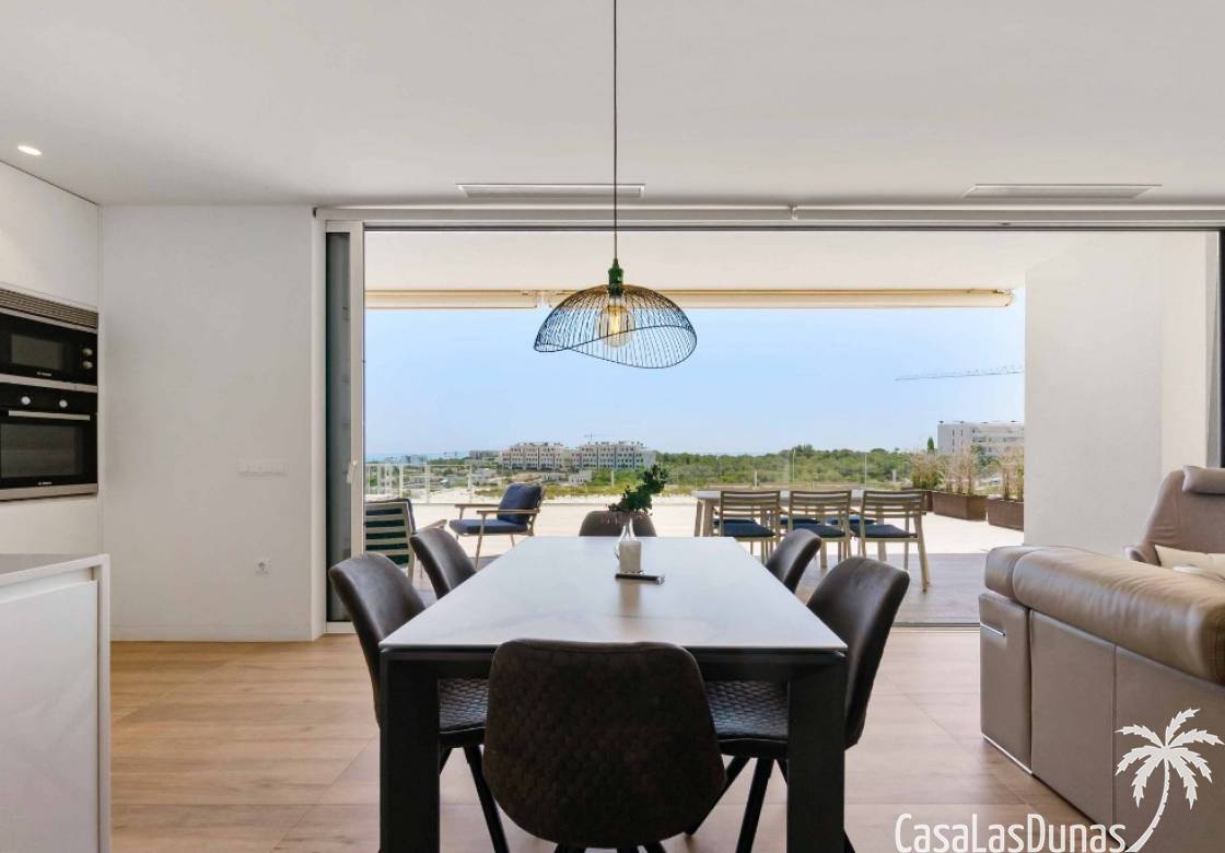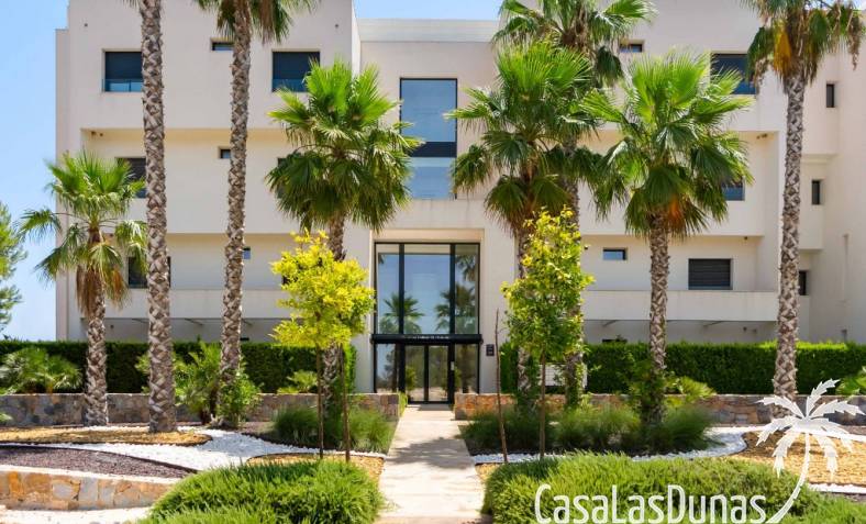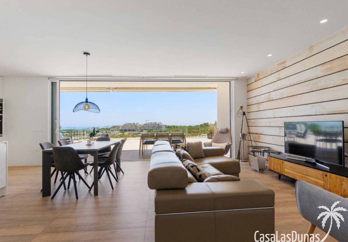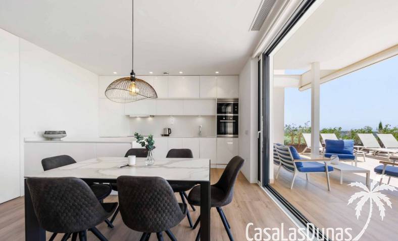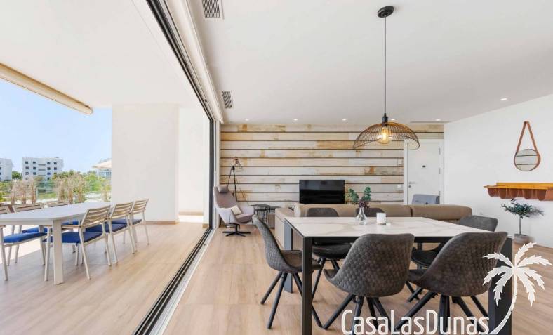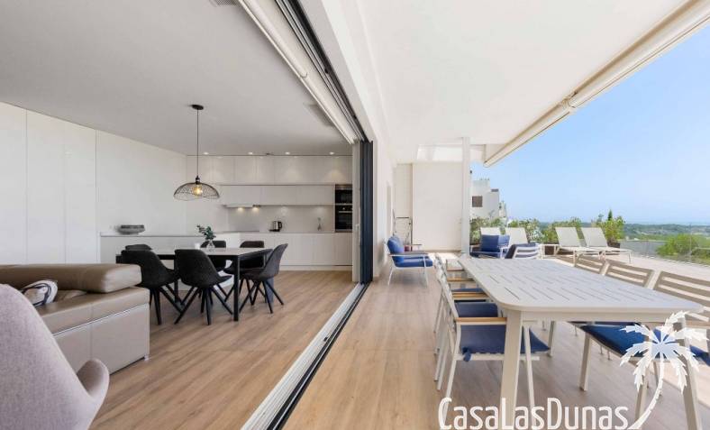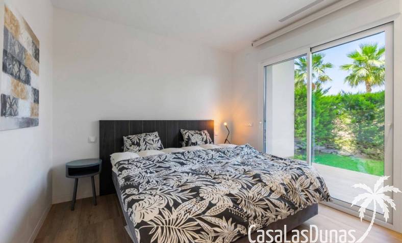 For sale amazing ground floor apartment in Naranjo Community at Las Colinas Golf & Country Club! The apartment built in 2018 is South-facing and offers a living room, dining area, kitchen, three bedrooms, two bathrooms and amazing terraces facing South and North. The apartment is on a slope, which means that you have fantastic views even from the grund floor.Entering the apartment you find the living room and kitchen to your right. From here you have access to an amazing South-facing terrace of 110m2! The large sliding windows are hidden completely in the wall, giving the experience that you are simply extending the inside to the outside. The kitchen has a half kitchen island and plenty of space for cooking and storage. The living area you will find the bedrooms and bathrooms. Two of the bedrooms share a bathroom. These bedrooms also have access to their own terrace and garden facing North. Further on you have the master bedroom with ensuite bathroom. The master bedroom also has direct access to the spacious terrace looking South.The apartment is sold fully equipped and furnished.Las Colinas Golf & Country Club offers an inviting range of restaurants and leisure options. These amenities are concentrated around the Clubhouse, a large Mediterranean-style building (1,500 sq. metres), only a few steps away from tees 1 and 10, greens 9 and 18 and the practice facilities, with magnificent views over the lake at hole 18.Only a short drive away you will find the very popular shopping Center ¨ Zenia Boulevard ¨