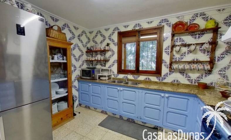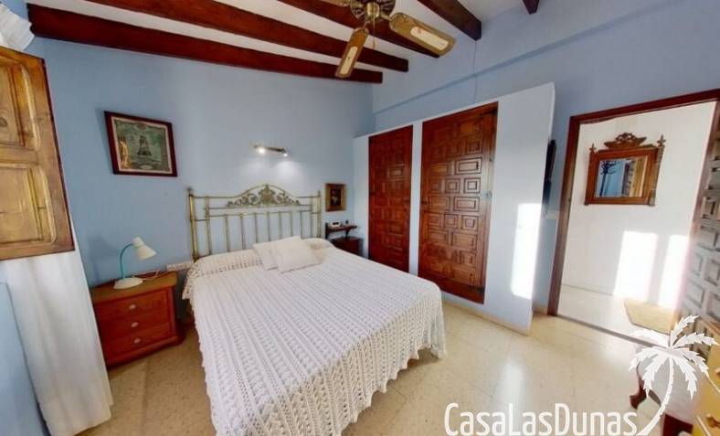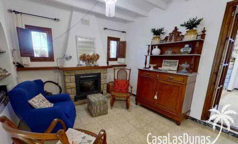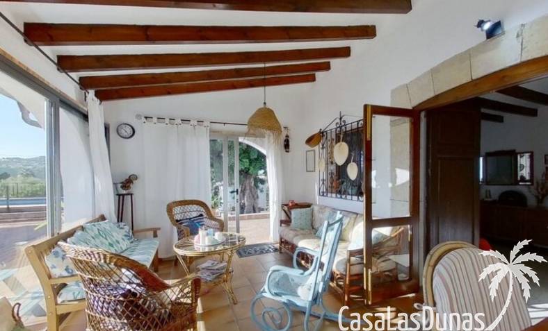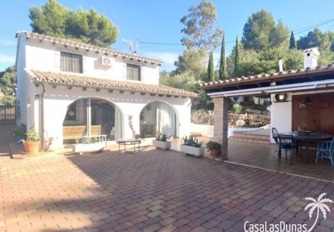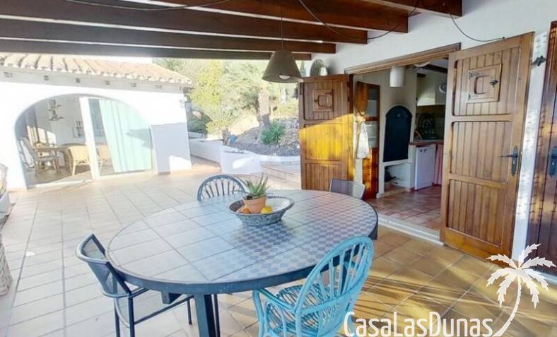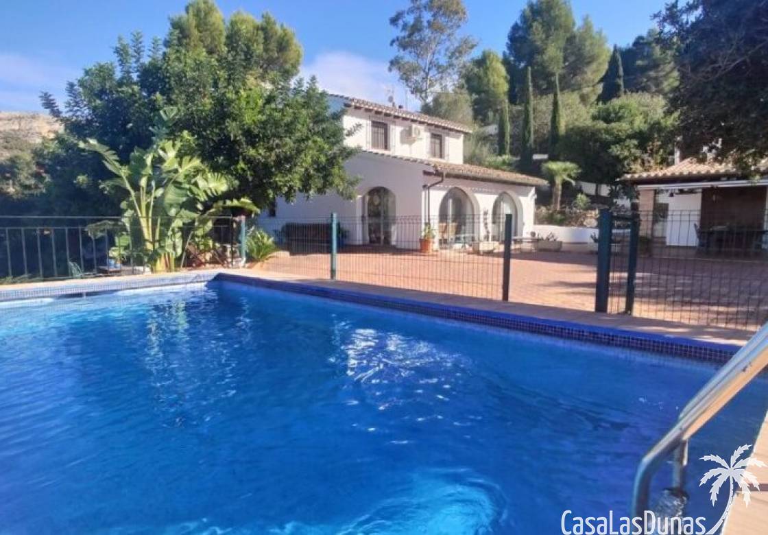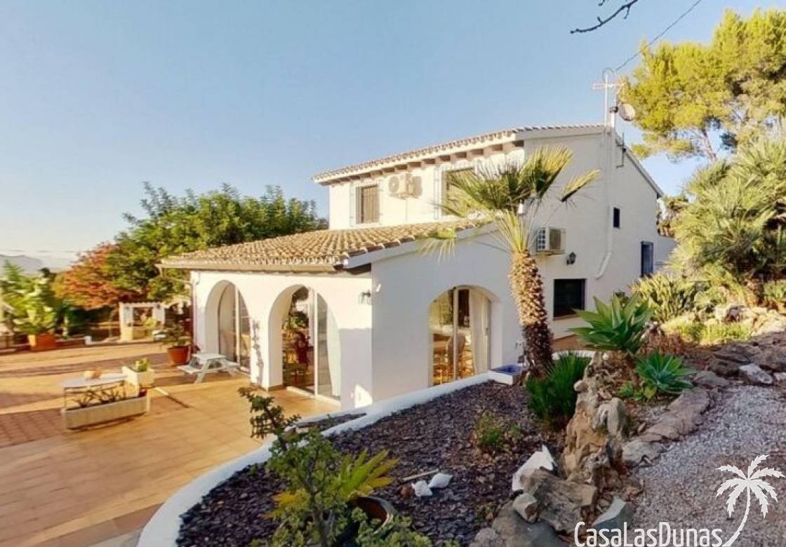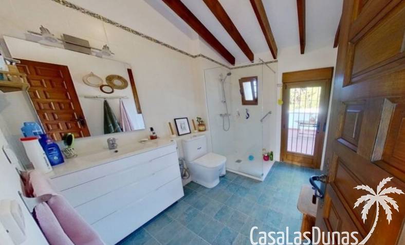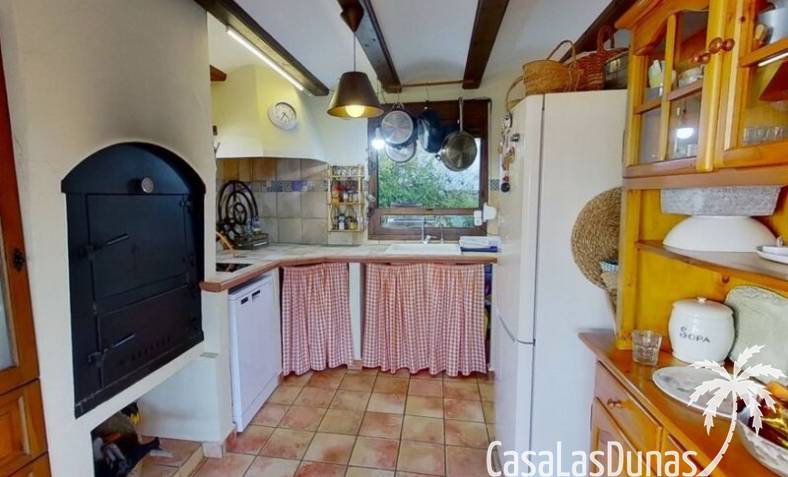 This charming finca is located a short distance from the center of Jesus Pobre and the Montgo Natural Park, and sits on a beautiful plot of almost 2,000m² with unobstructed views over the valley and complete privacy. The house offers 230m² spread over two floors, including a summer kitchen with a shower and a pergola. Entrance is through the glazed naya with double doors leading into the living room with a wood-burning stove and air conditioning. An archway from the living room leads to the dining room with a fireplace and built-in pellet stove. Double doors lead into the traditional farmhouse kitchen with access to the rear garden and a laundry/storage room. A few steps from the kitchen lead to the new guest shower room. Stairs from the dining room lead to the sleeping accommodation, which comprises: two guest bedrooms, a new bathroom with a shower and access to an open terrace, and the master bedroom with air conditioning. Outside, there is a beautiful summer kitchen with a pizza oven, an outdoor shower, and ample parking with a double carport.