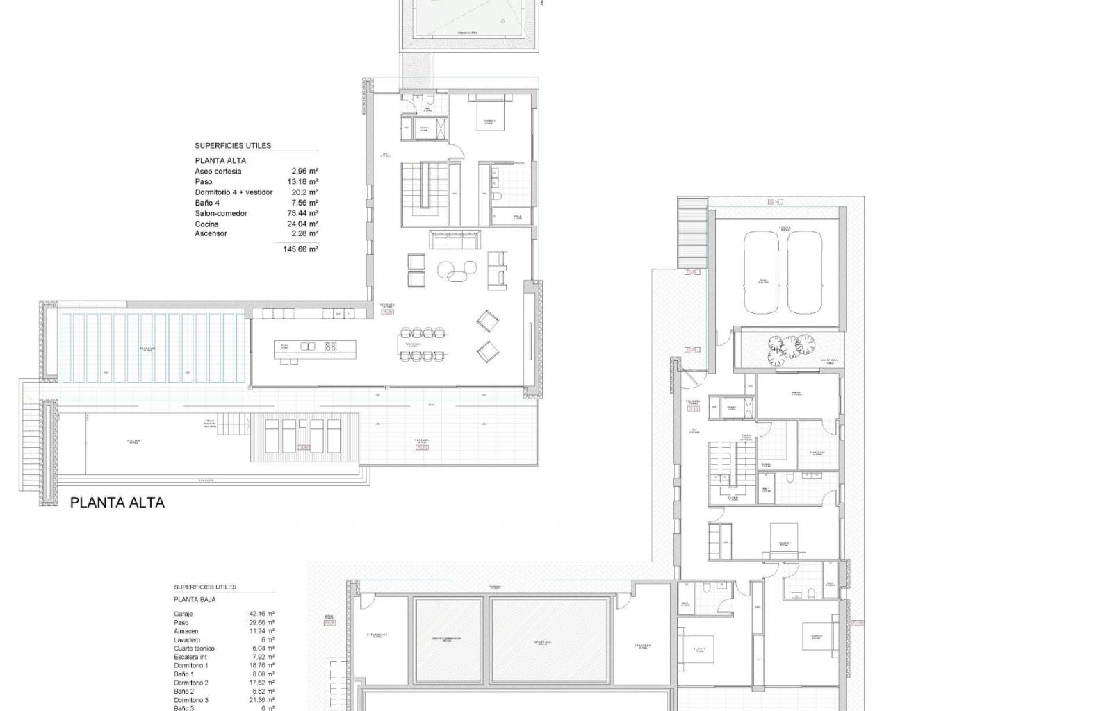 This villa model is distributed over two levels with a functional and elegant layout. The ground floor hosts the main sleeping area with three spacious bedrooms as well as a private garage for two vehicles. The upper level is designed as the main living space, featuring an open plan living room, dining area and designer kitchen with central island.