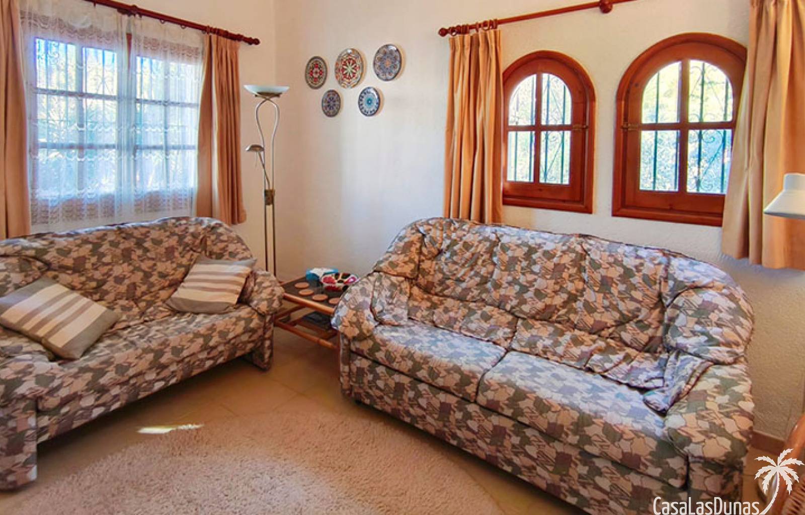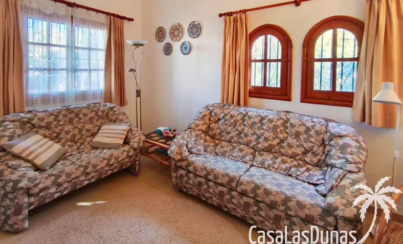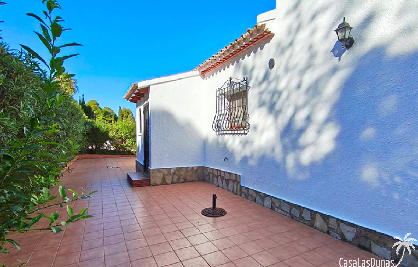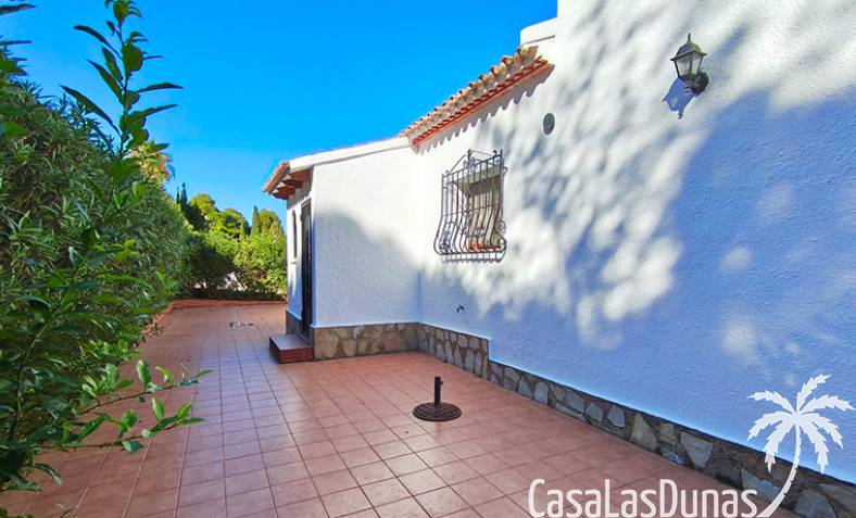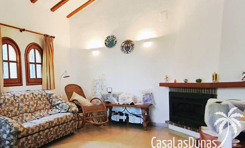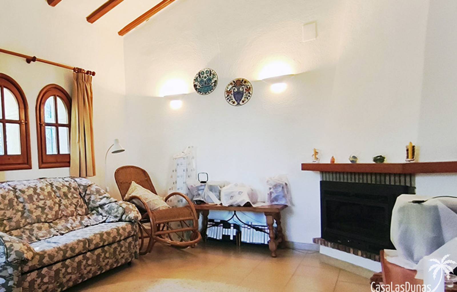 This bungalow is situated in the popular residential area of La Sella Golf, close to the service and recreation center and with access to two communal swimming pools. Built in 1989, the house features two terraces: a sunny south-facing terrace at the entrance and a partially covered terrace accessible from the living-dining room and connecting to the garden and carport. The rear entrance leads to an enclosed laundry room and the open-plan kitchen with dining area, while the cozy living room with fireplace and high beamed ceilings is set back slightly. Furthermore, there are two bedrooms with built-in wardrobes, including a master bedroom with an en-suite bathroom, plus a second bathroom with a shower.