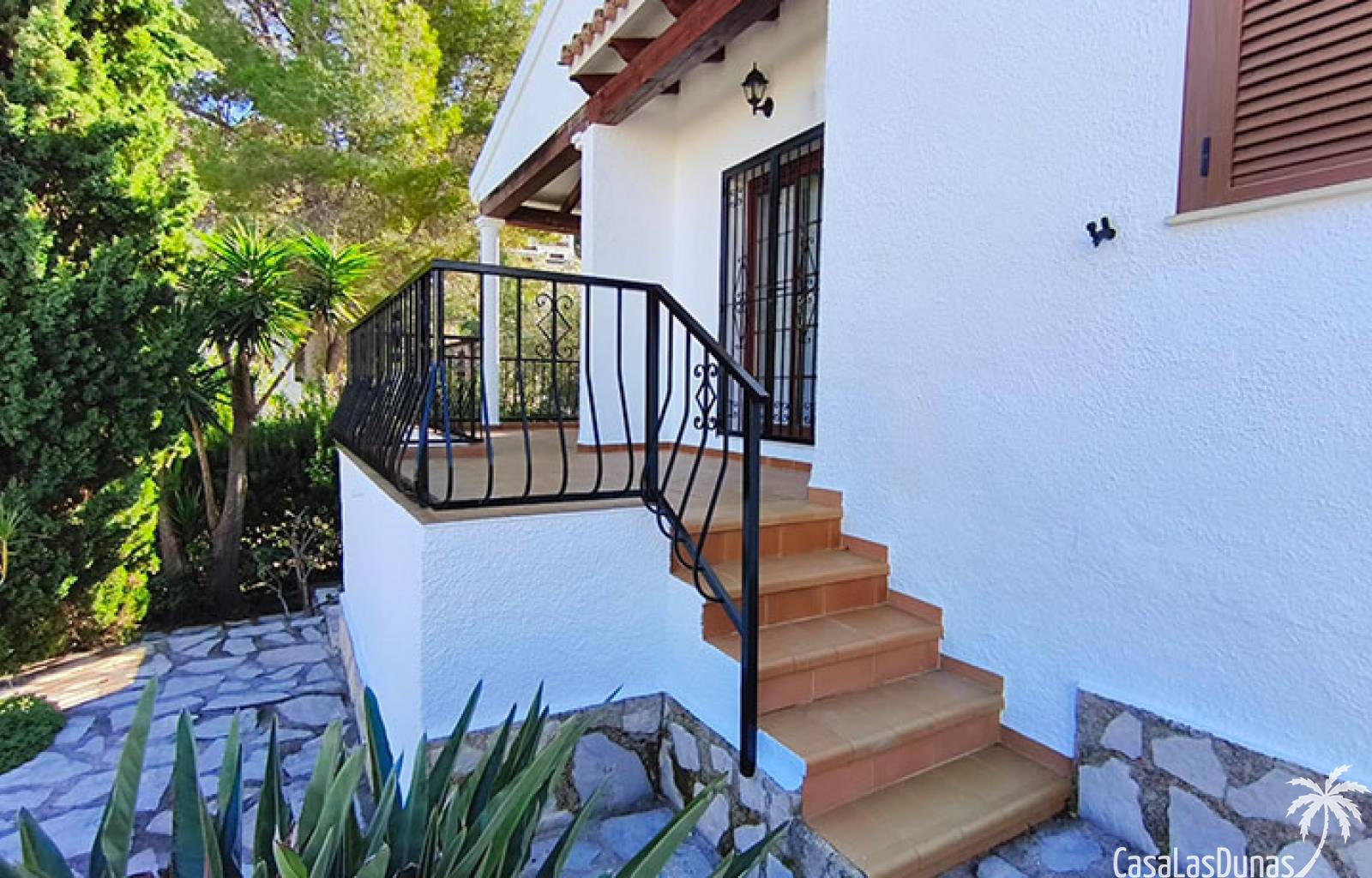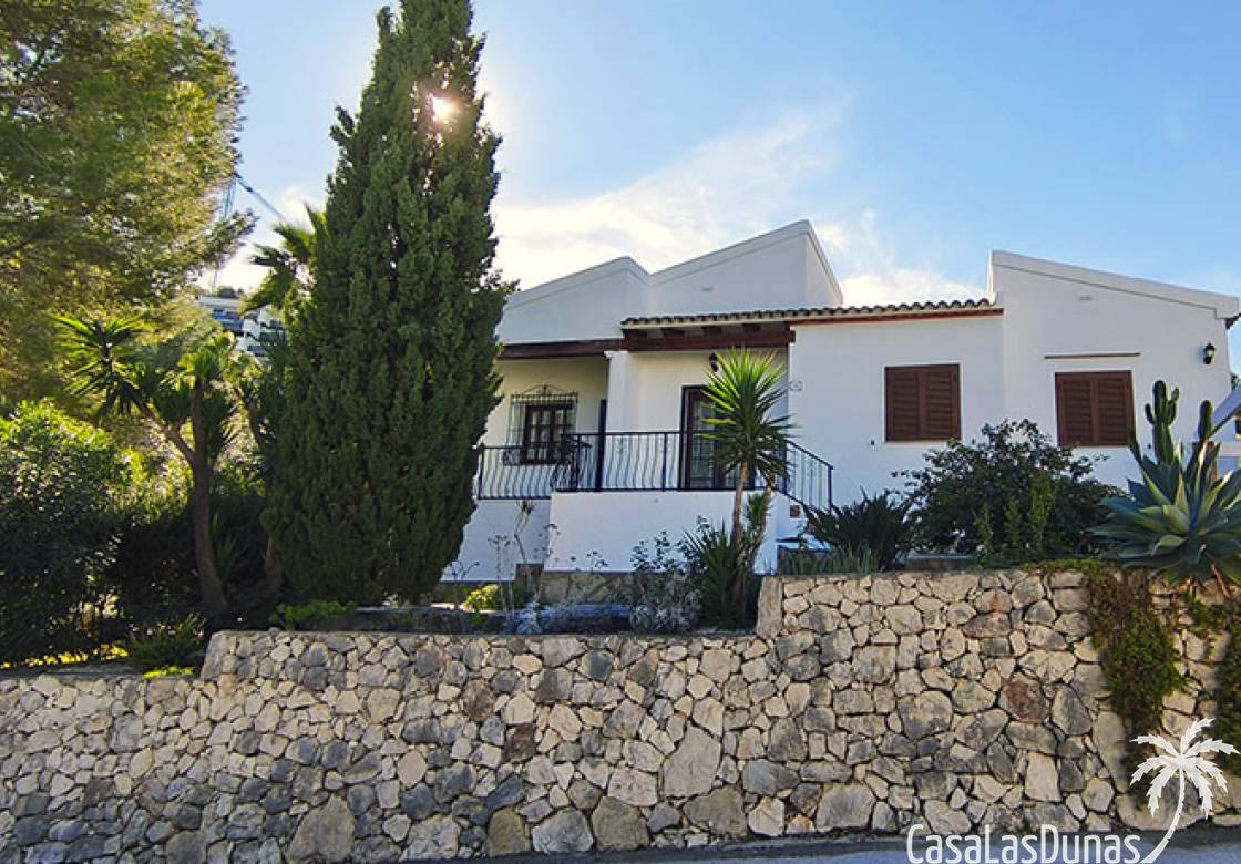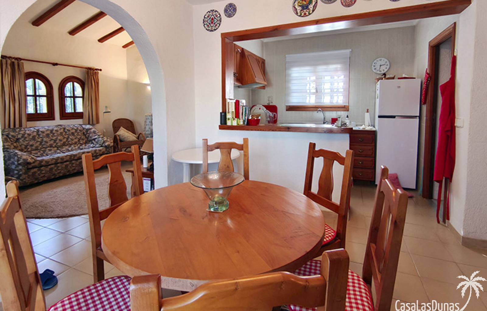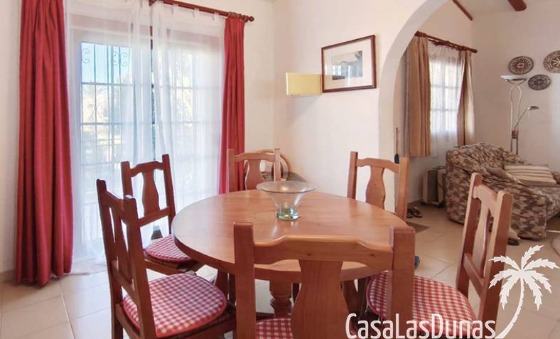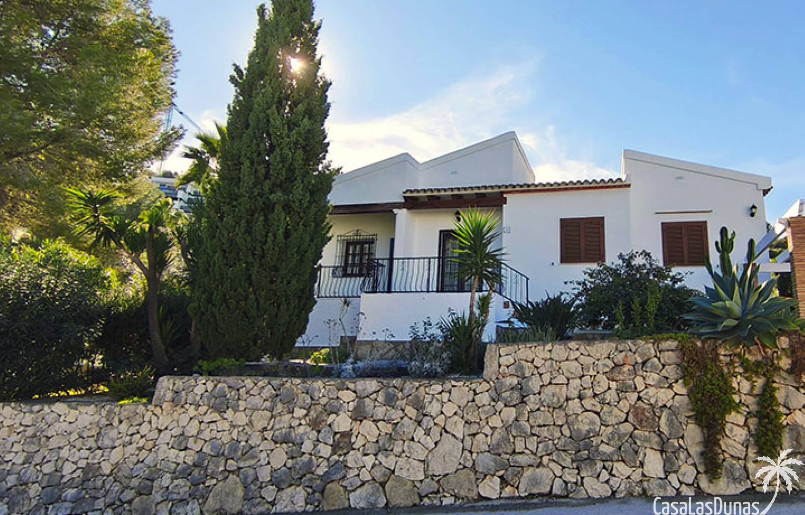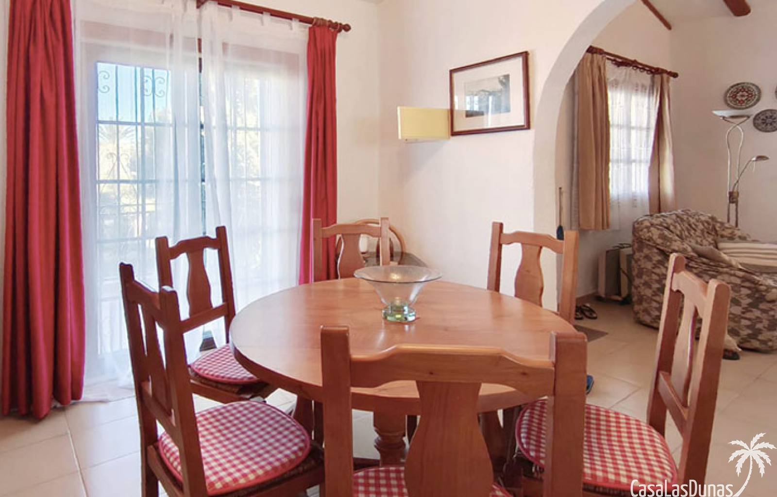 This bungalow is situated in the popular residential area of La Sella Golf, close to the service and recreation center and with access to two communal swimming pools. Built in 1989, the house features two terraces: a sunny south-facing terrace at the entrance and a partially covered terrace accessible from the living-dining room and connecting to the garden and carport. The rear entrance leads to an enclosed laundry room and the open-plan kitchen with dining area, while the cozy living room with fireplace and high beamed ceilings is set back slightly. Furthermore, there are two bedrooms with built-in wardrobes, including a master bedroom with an en-suite bathroom, plus a second bathroom with a shower.