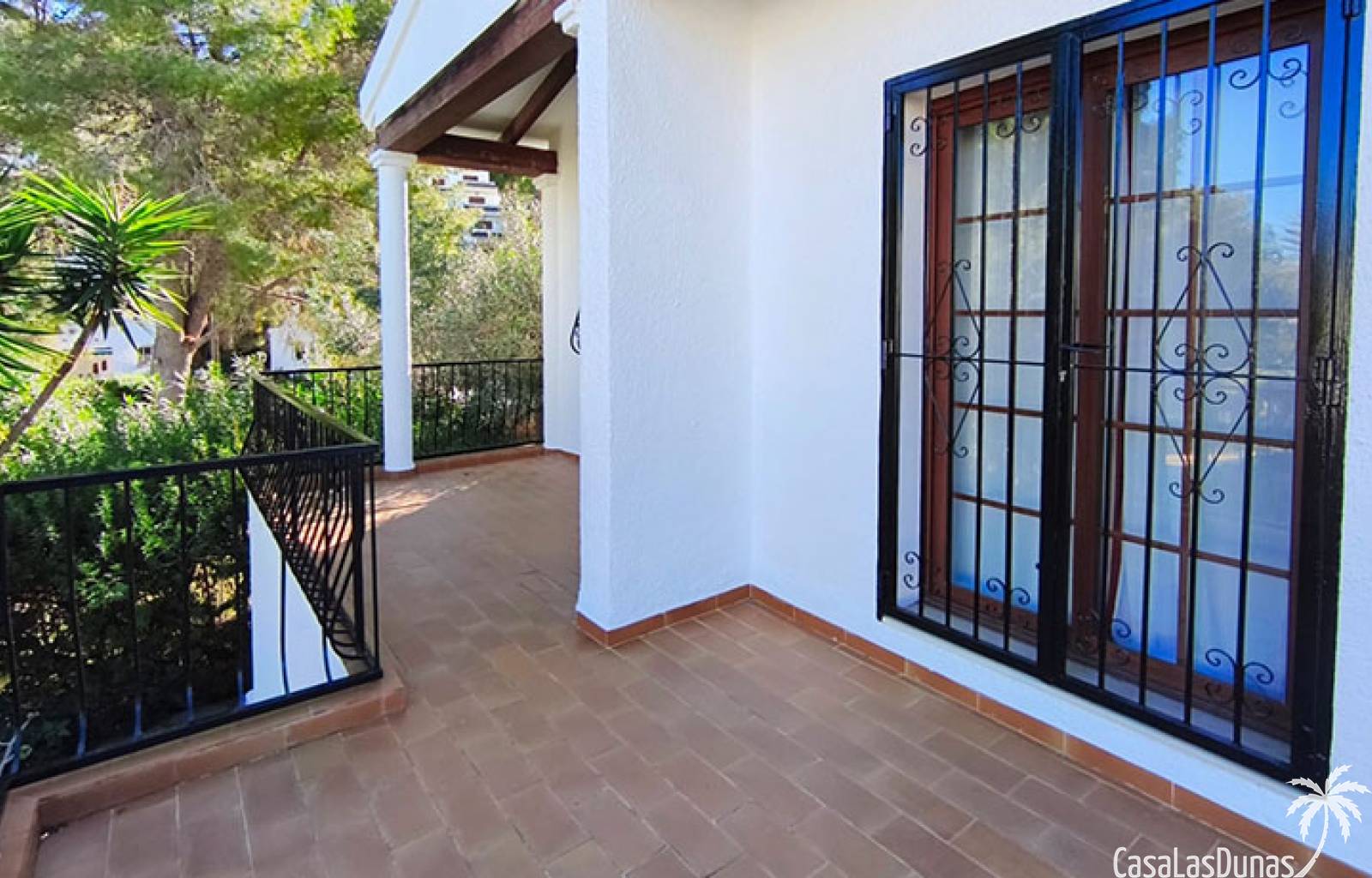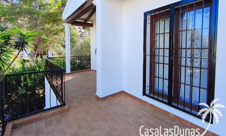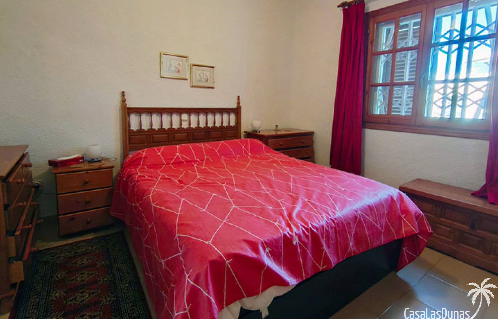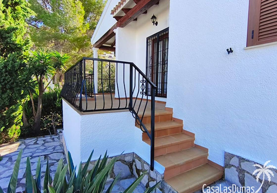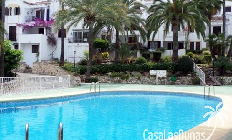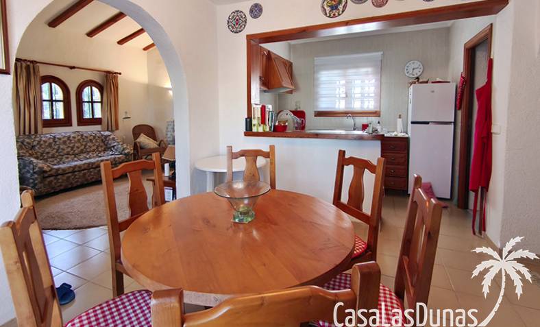 This bungalow is situated in the popular residential area of La Sella Golf, close to the service and recreation center and with access to two communal swimming pools. Built in 1989, the house features two terraces: a sunny south-facing terrace at the entrance and a partially covered terrace accessible from the living-dining room and connecting to the garden and carport. The rear entrance leads to an enclosed laundry room and the open-plan kitchen with dining area, while the cozy living room with fireplace and high beamed ceilings is set back slightly. Furthermore, there are two bedrooms with built-in wardrobes, including a master bedroom with an en-suite bathroom, plus a second bathroom with a shower.