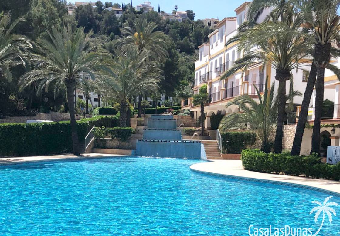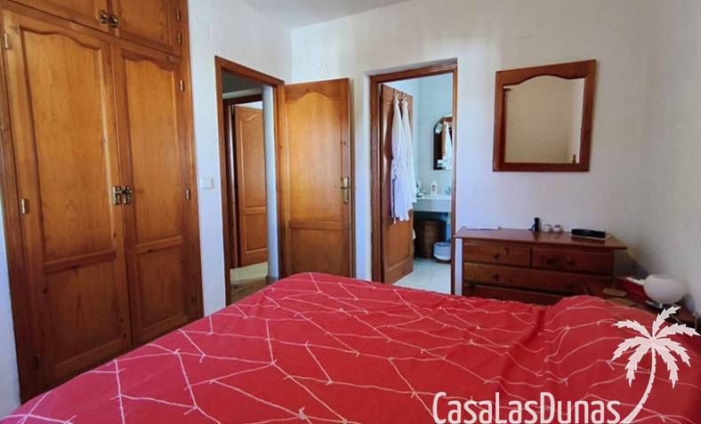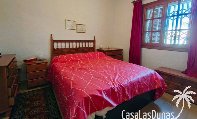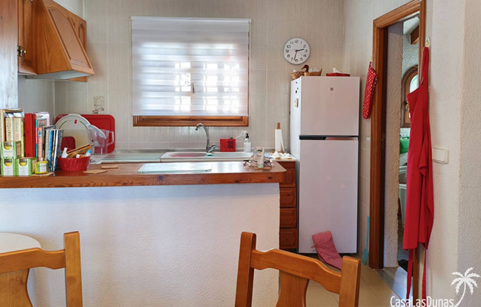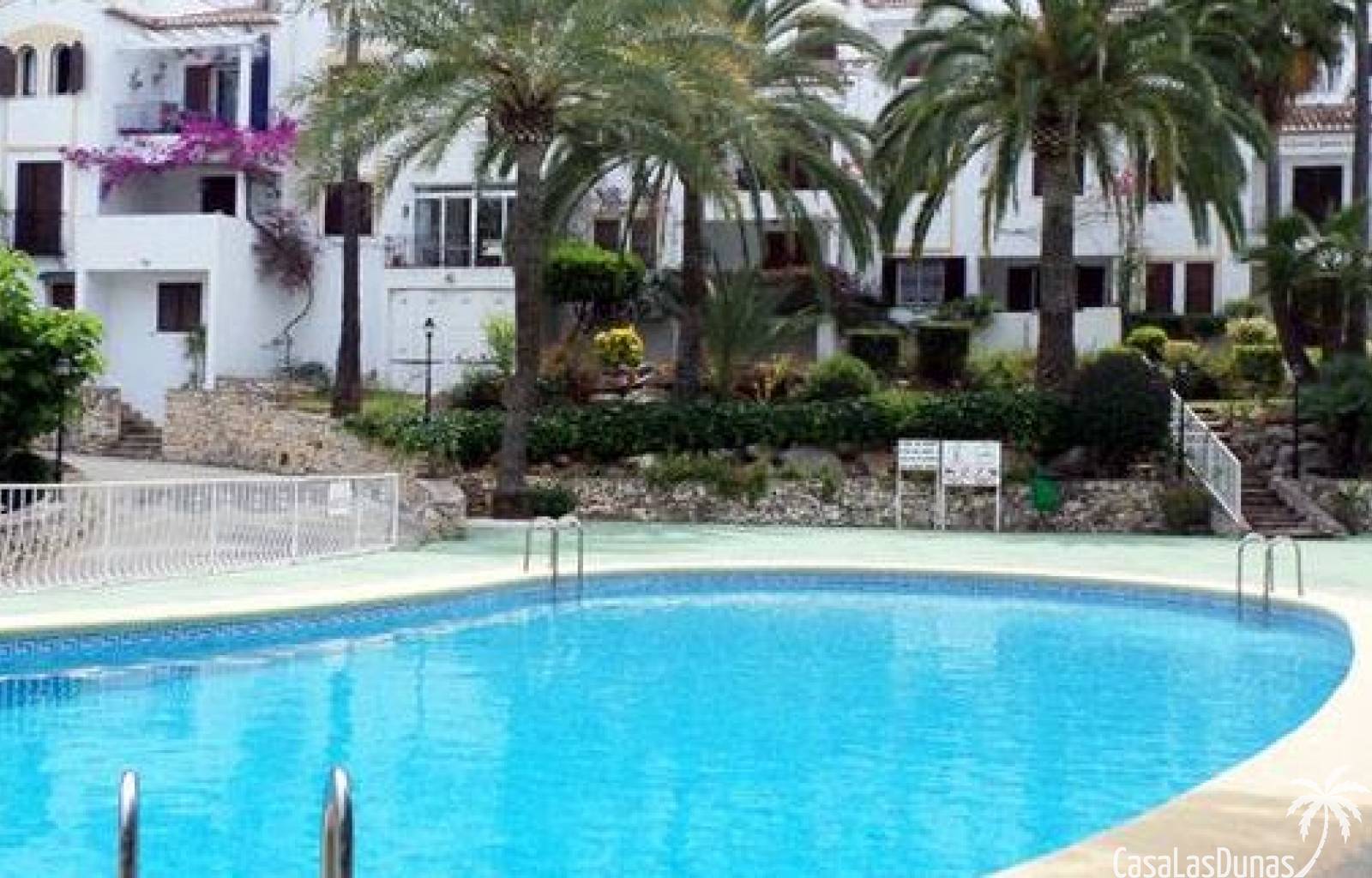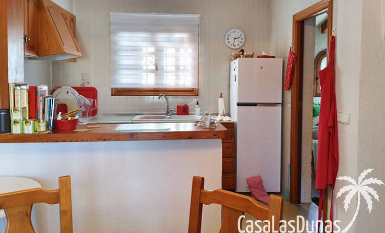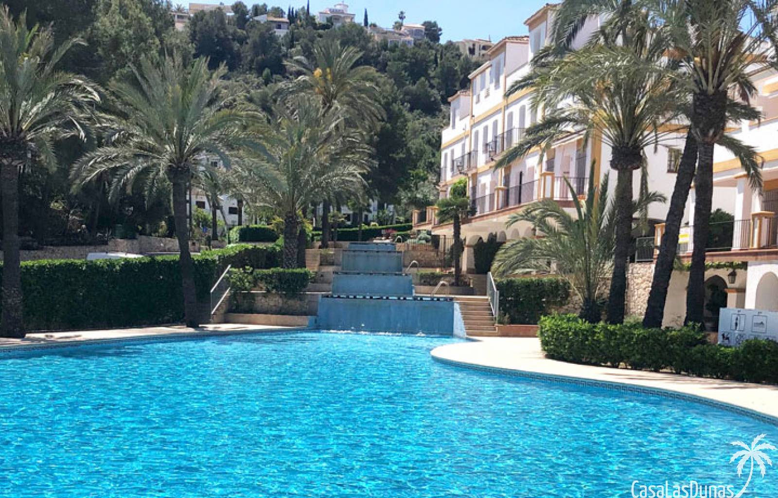 This bungalow is situated in the popular residential area of La Sella Golf, close to the service and recreation center and with access to two communal swimming pools. Built in 1989, the house features two terraces: a sunny south-facing terrace at the entrance and a partially covered terrace accessible from the living-dining room and connecting to the garden and carport. The rear entrance leads to an enclosed laundry room and the open-plan kitchen with dining area, while the cozy living room with fireplace and high beamed ceilings is set back slightly. Furthermore, there are two bedrooms with built-in wardrobes, including a master bedroom with an en-suite bathroom, plus a second bathroom with a shower.