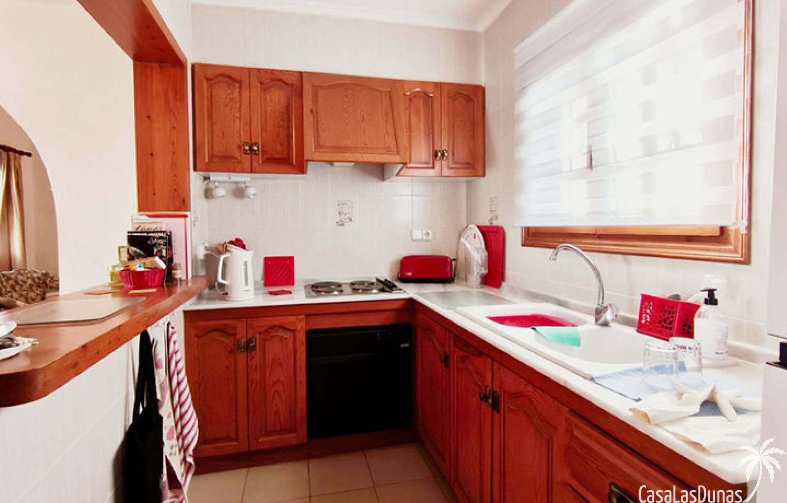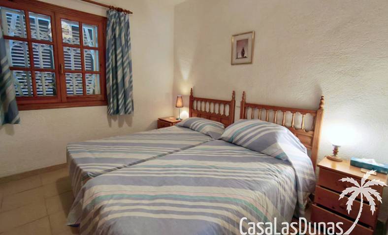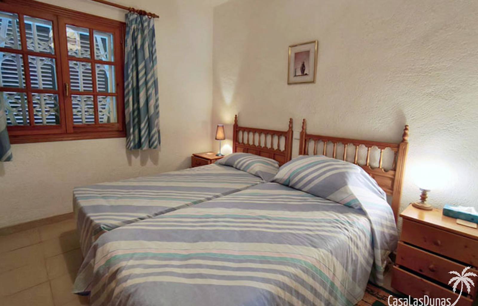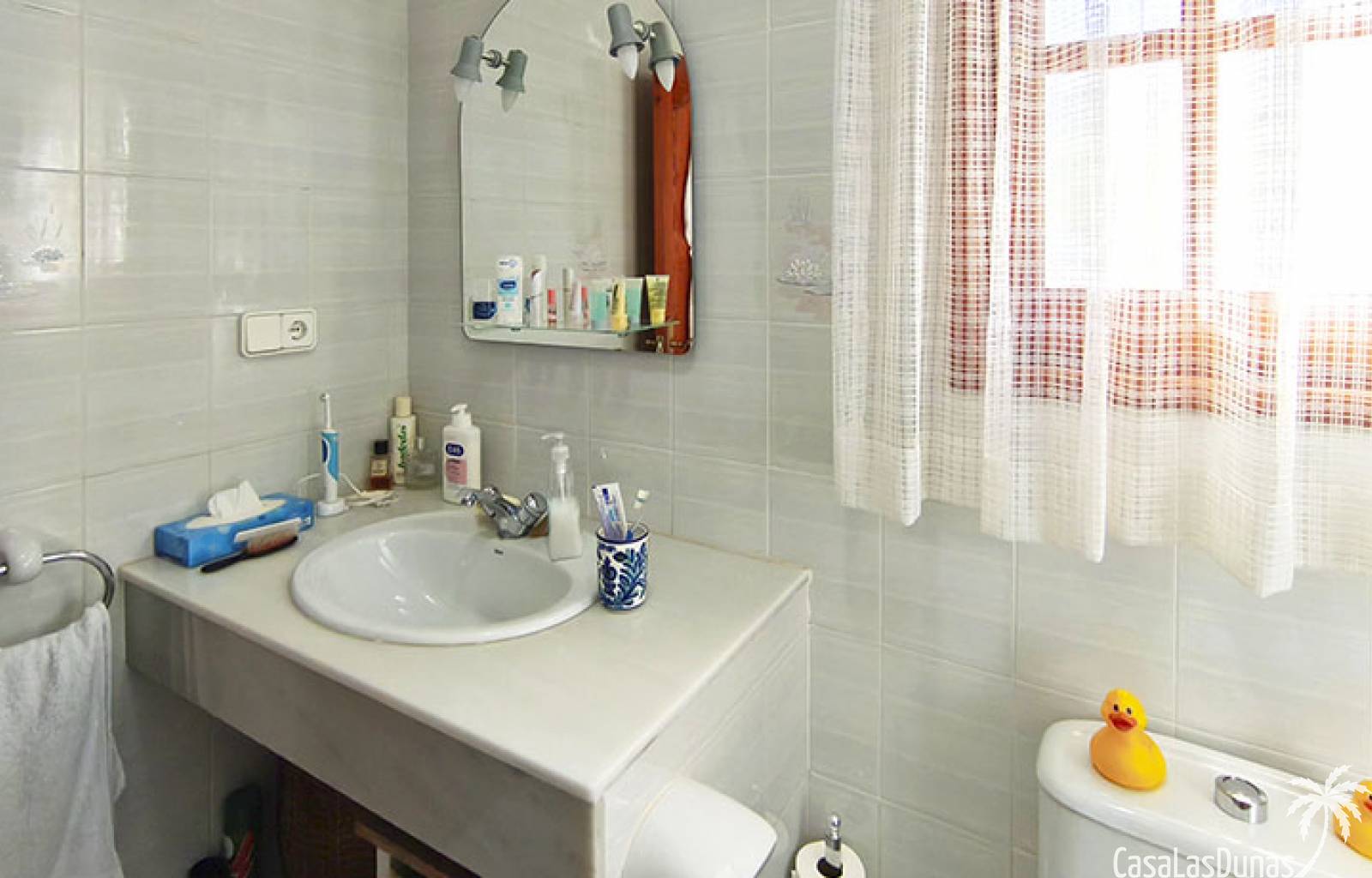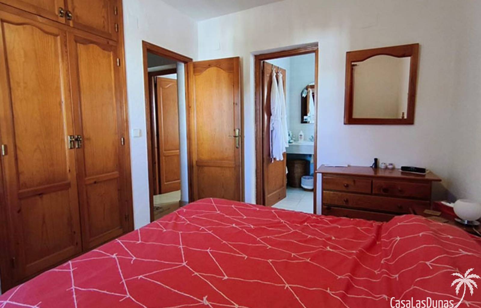 This bungalow is situated in the popular residential area of La Sella Golf, close to the service and recreation center and with access to two communal swimming pools. Built in 1989, the house features two terraces: a sunny south-facing terrace at the entrance and a partially covered terrace accessible from the living-dining room and connecting to the garden and carport. The rear entrance leads to an enclosed laundry room and the open-plan kitchen with dining area, while the cozy living room with fireplace and high beamed ceilings is set back slightly. Furthermore, there are two bedrooms with built-in wardrobes, including a master bedroom with an en-suite bathroom, plus a second bathroom with a shower.