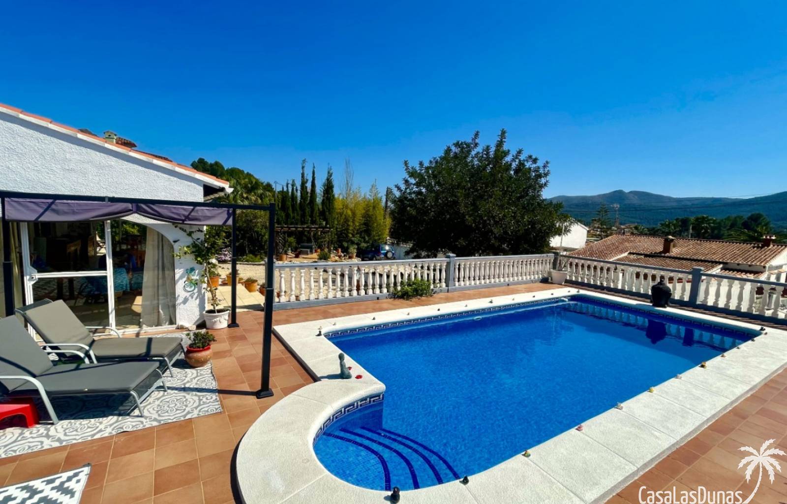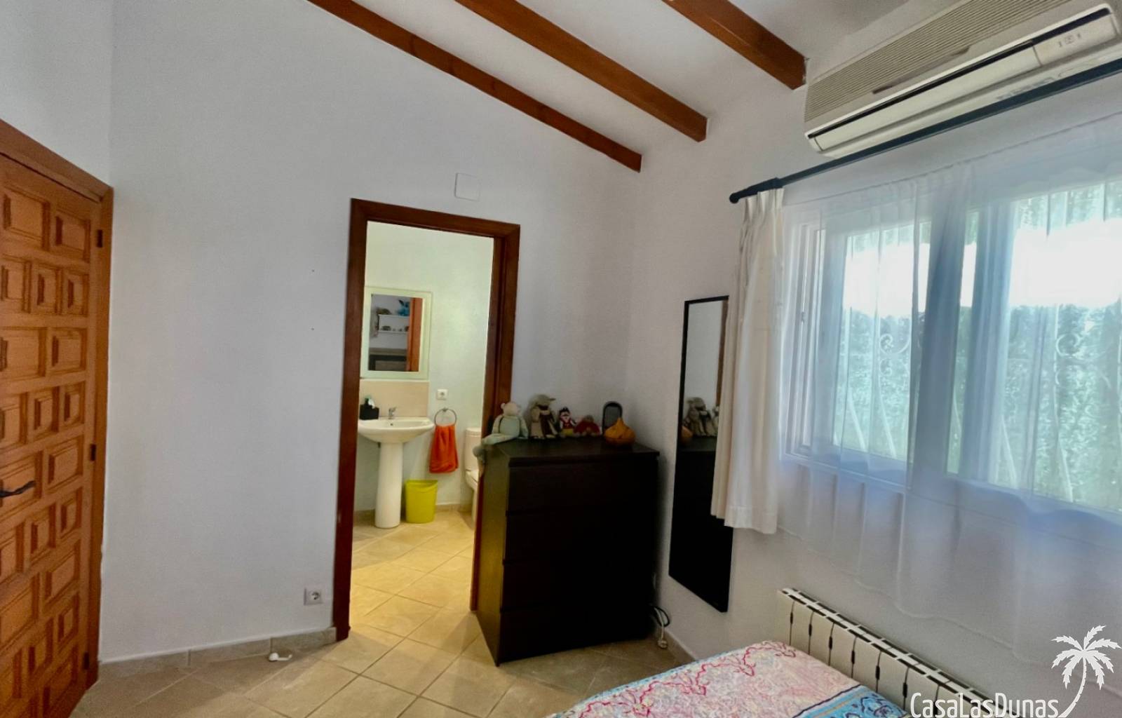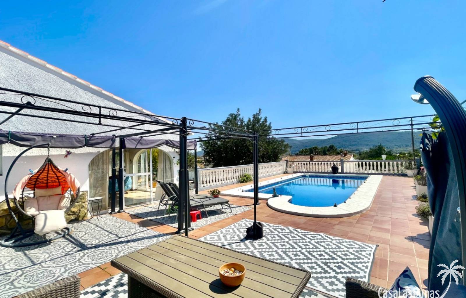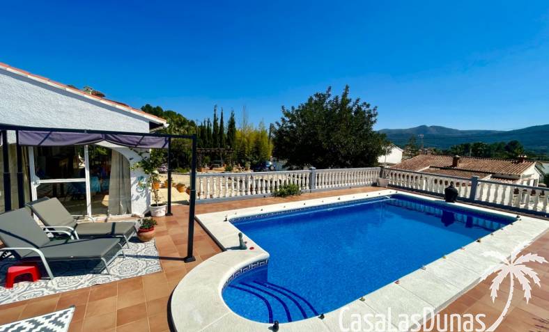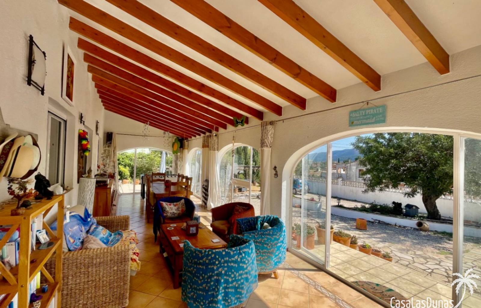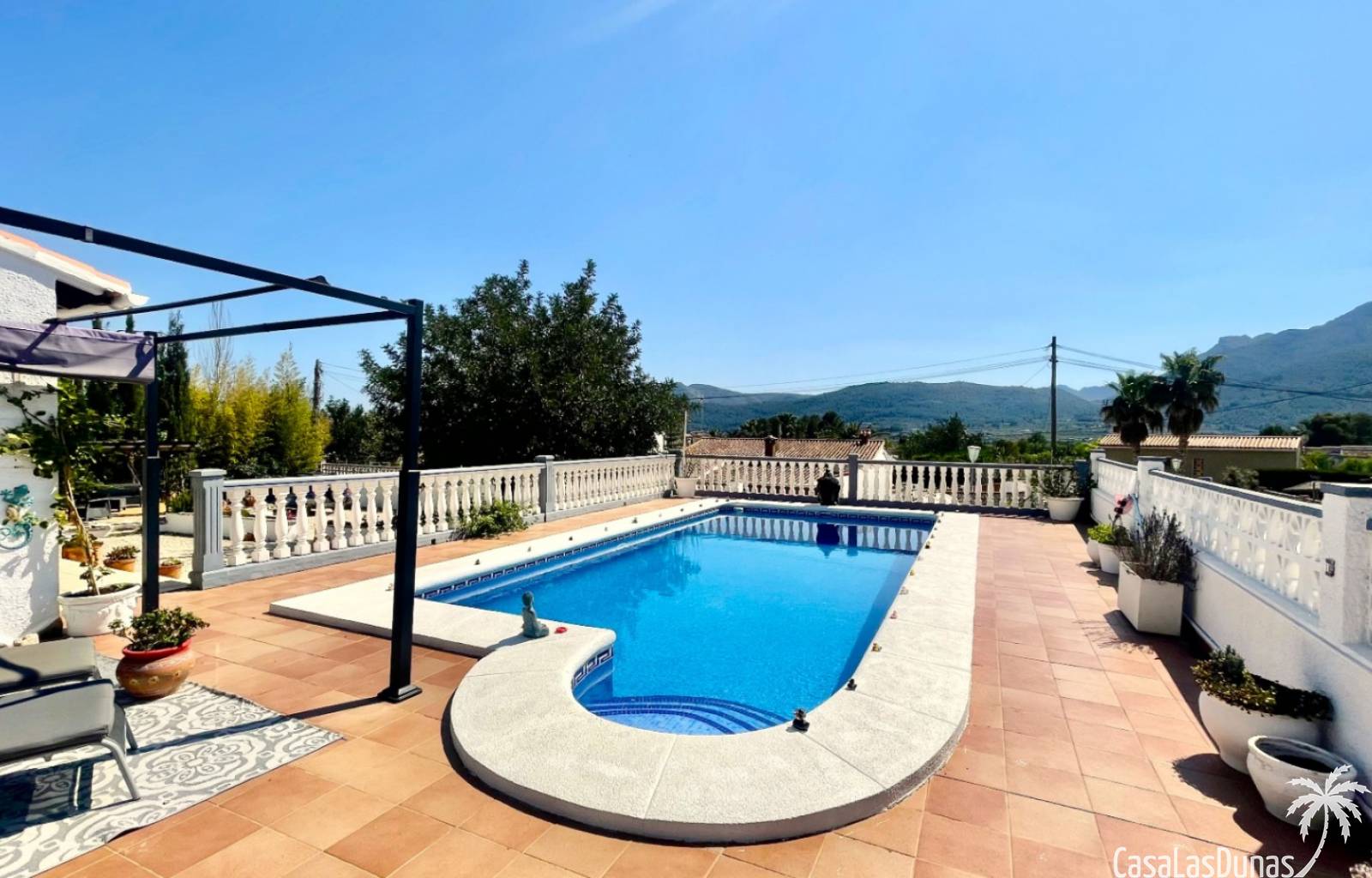 This south-facing detached villa is situated on a flat plot of 1,010 m², within walking distance of the picturesque village of Alcalalí. The house is entirely single-story and offers bright, well-laid-out rooms, culminating in an impressive 45 m² glass naya with a wooden beamed ceiling, ideal for relaxing, dining, or entertaining guests year-round. The villa features a large living room with a wood-burning stove and air conditioning (hot/cold), a spacious fully equipped kitchen with a breakfast bar, a utility room with access to the pool terrace, and three bedrooms, all with en-suite bathrooms; the master suite has three built-in wardrobes, a dressing room, a ceiling fan, patio doors to the private terrace, and a spacious walk-in shower. Outside, the plot offers an 8 x 4 m swimming pool, an outdoor shower, a sunny terrace with a pergola, a chill-out and BBQ area, an additional pergola for shade, and low-maintenance Mediterranean gardens. The fully fenced plot features an entrance gate, ample parking, double glazing, and gas central heating, making this an ideal family or holiday home offering space, privacy, and comfort close to the center of Alcalalí.