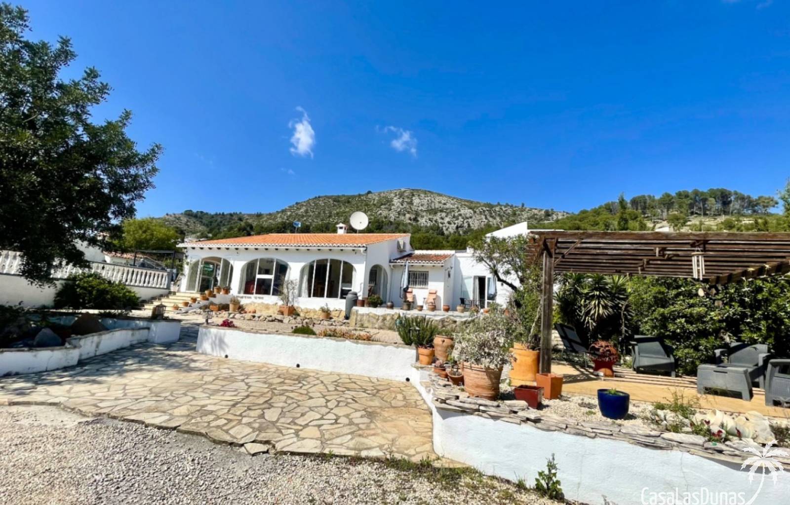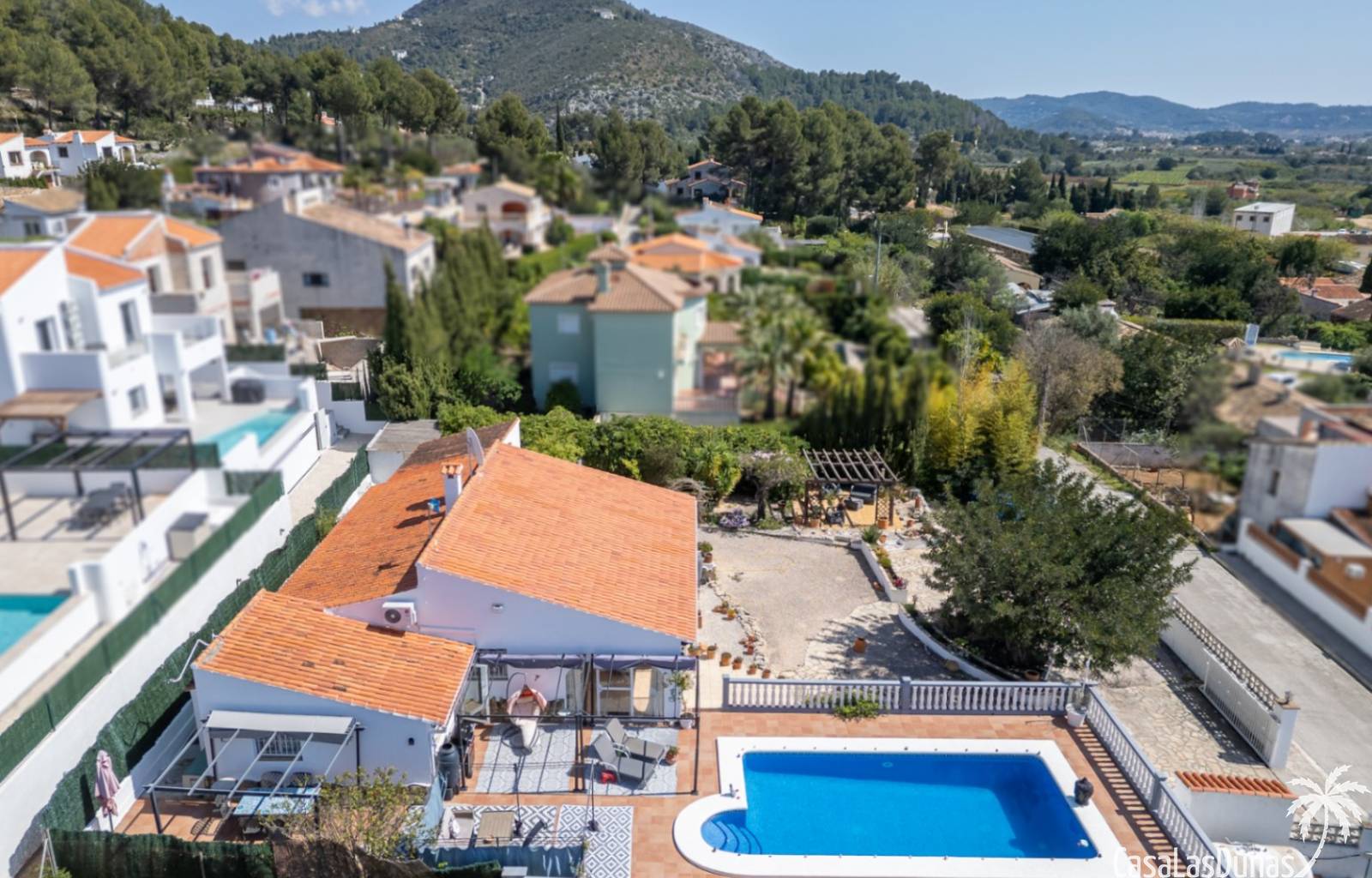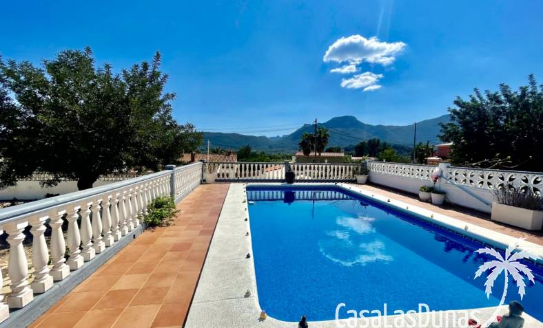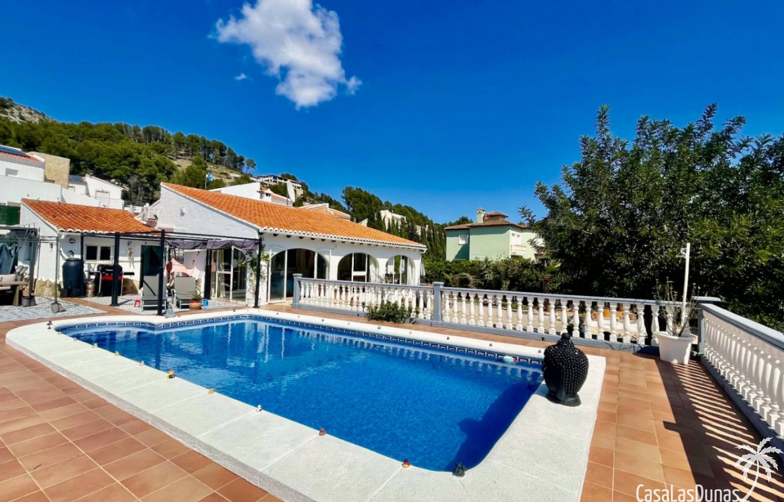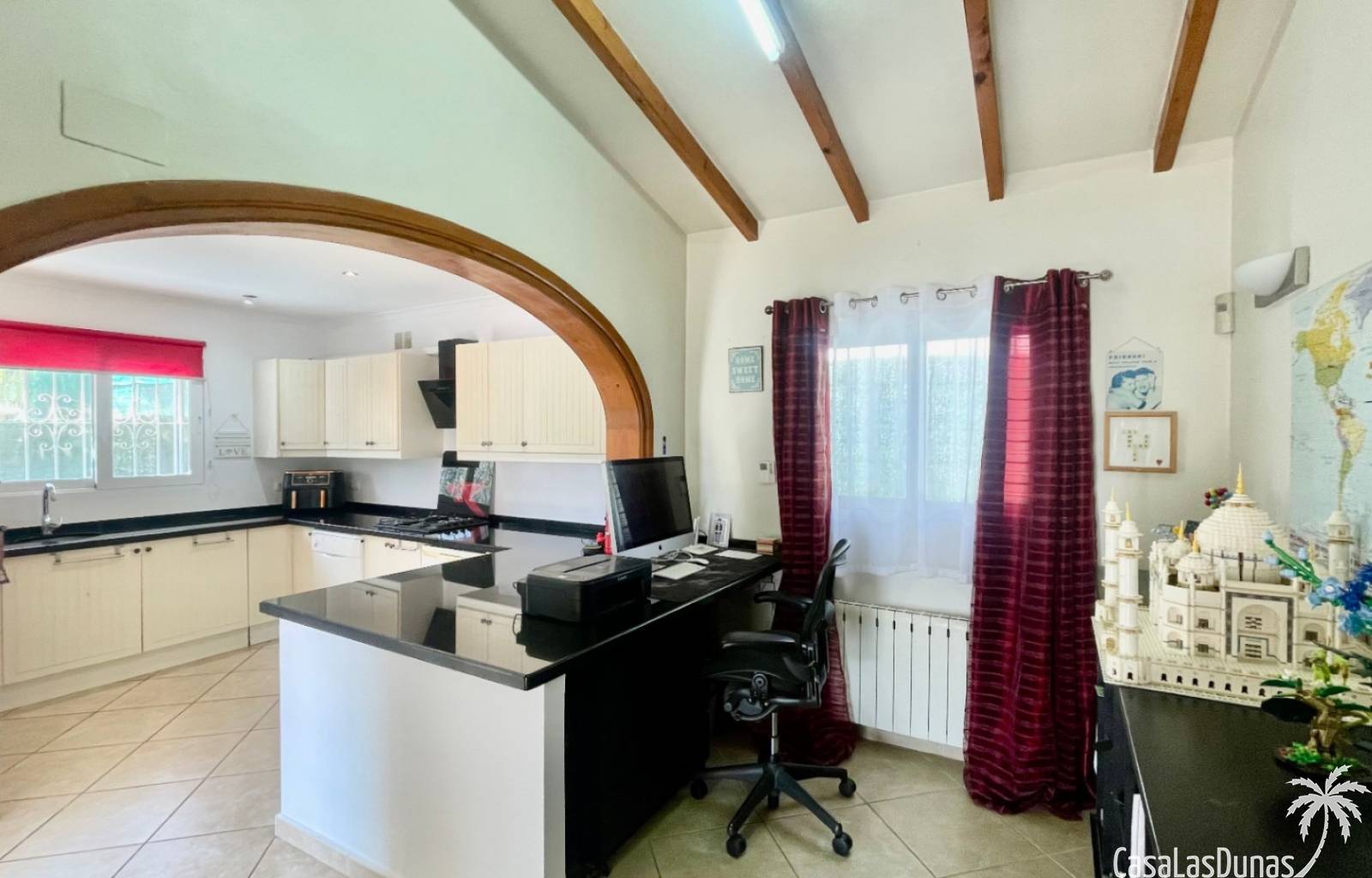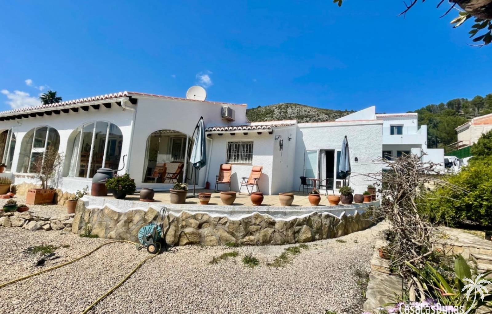 This south-facing detached villa is situated on a flat plot of 1,010 m², within walking distance of the picturesque village of Alcalalí. The house is entirely single-story and offers bright, well-laid-out rooms, culminating in an impressive 45 m² glass naya with a wooden beamed ceiling, ideal for relaxing, dining, or entertaining guests year-round. The villa features a large living room with a wood-burning stove and air conditioning (hot/cold), a spacious fully equipped kitchen with a breakfast bar, a utility room with access to the pool terrace, and three bedrooms, all with en-suite bathrooms; the master suite has three built-in wardrobes, a dressing room, a ceiling fan, patio doors to the private terrace, and a spacious walk-in shower. Outside, the plot offers an 8 x 4 m swimming pool, an outdoor shower, a sunny terrace with a pergola, a chill-out and BBQ area, an additional pergola for shade, and low-maintenance Mediterranean gardens. The fully fenced plot features an entrance gate, ample parking, double glazing, and gas central heating, making this an ideal family or holiday home offering space, privacy, and comfort close to the center of Alcalalí.