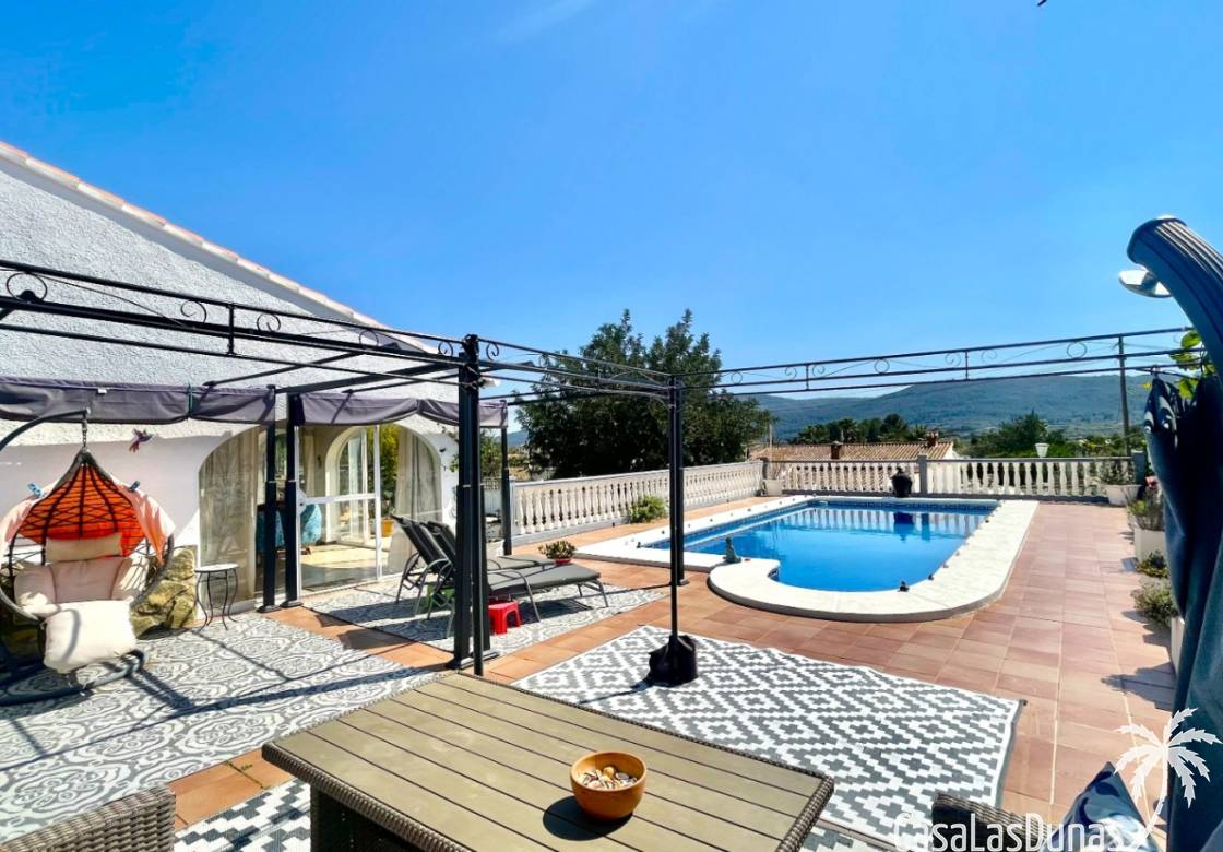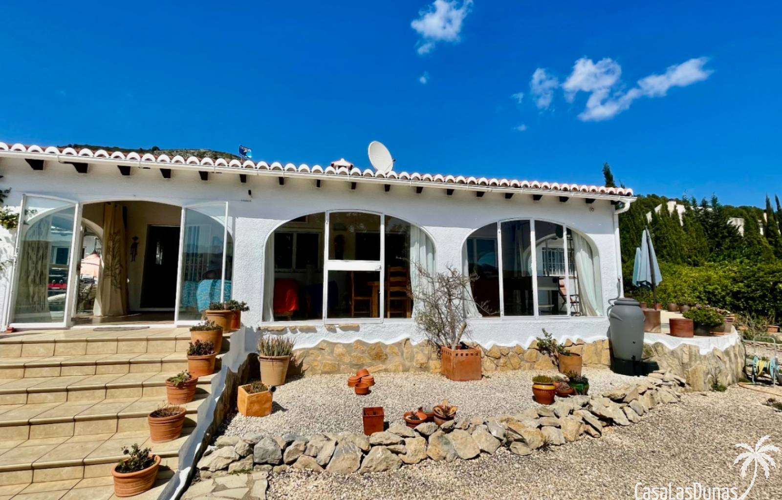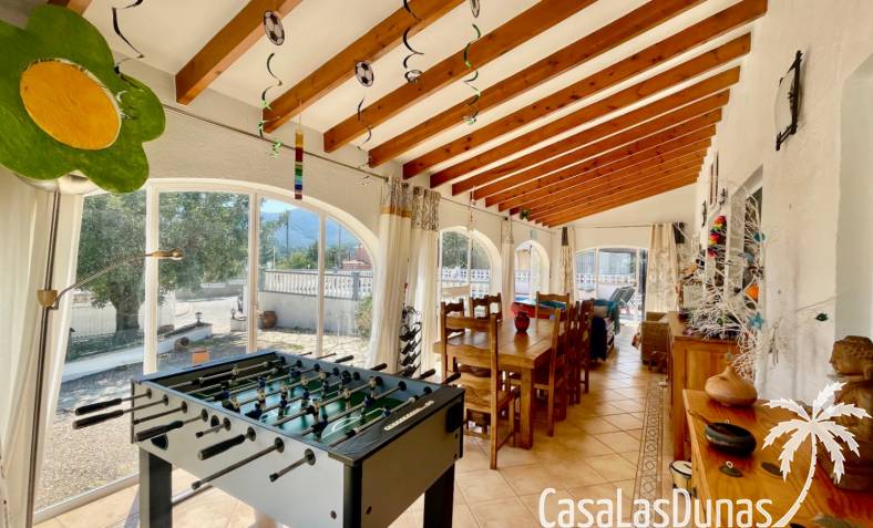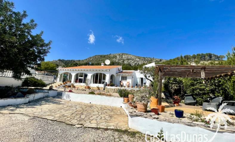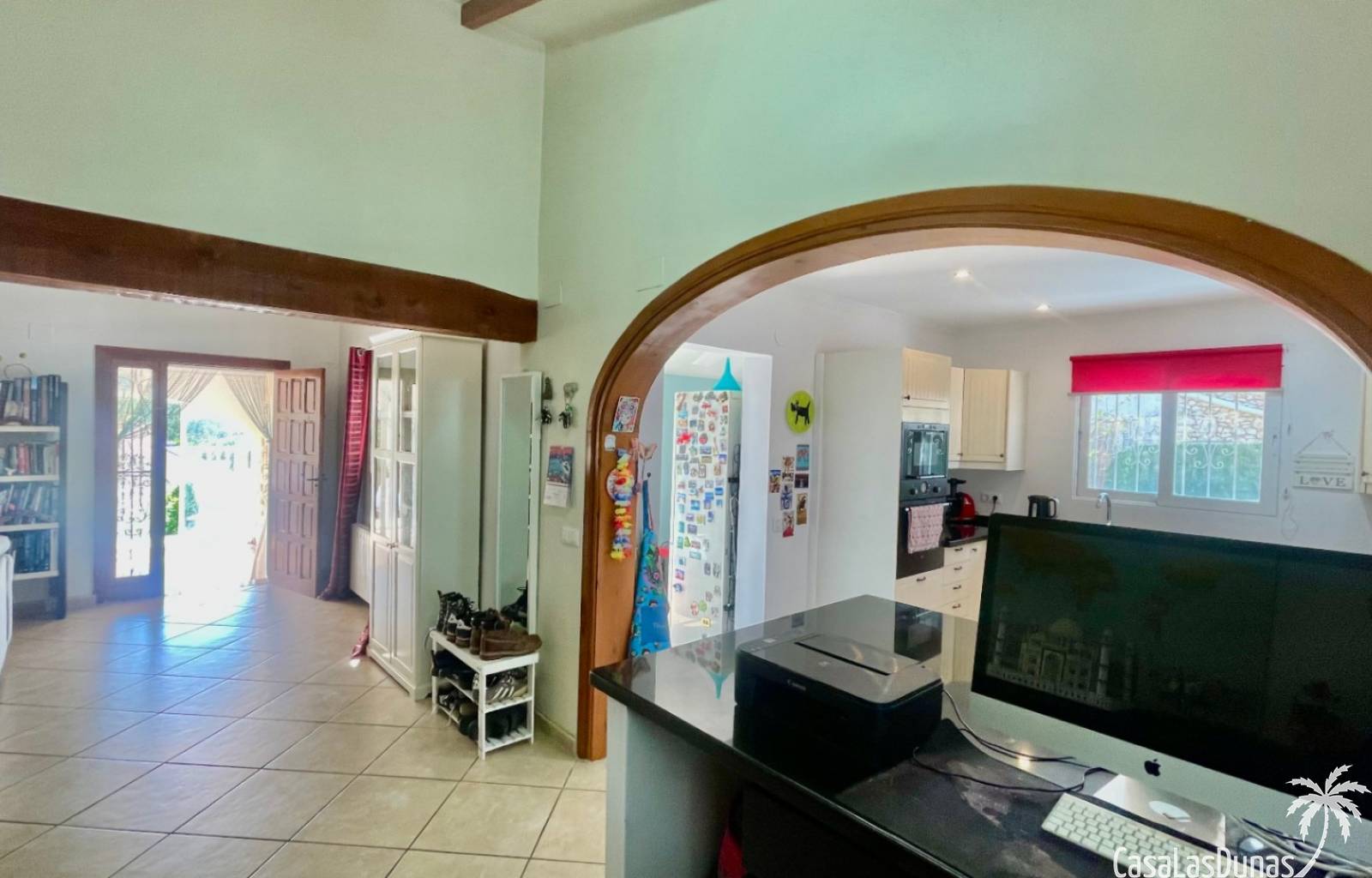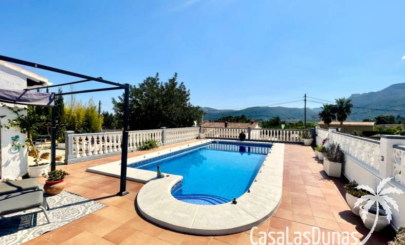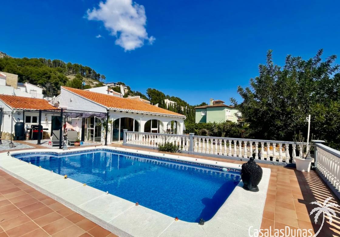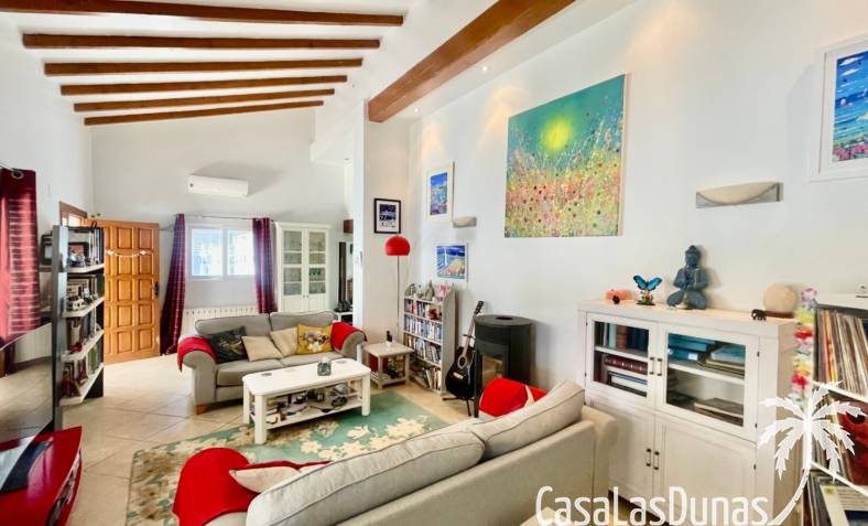 This south-facing detached villa is situated on a flat plot of 1,010 m², within walking distance of the picturesque village of Alcalalí. The house is entirely single-story and offers bright, well-laid-out rooms, culminating in an impressive 45 m² glass naya with a wooden beamed ceiling, ideal for relaxing, dining, or entertaining guests year-round. The villa features a large living room with a wood-burning stove and air conditioning (hot/cold), a spacious fully equipped kitchen with a breakfast bar, a utility room with access to the pool terrace, and three bedrooms, all with en-suite bathrooms; the master suite has three built-in wardrobes, a dressing room, a ceiling fan, patio doors to the private terrace, and a spacious walk-in shower. Outside, the plot offers an 8 x 4 m swimming pool, an outdoor shower, a sunny terrace with a pergola, a chill-out and BBQ area, an additional pergola for shade, and low-maintenance Mediterranean gardens. The fully fenced plot features an entrance gate, ample parking, double glazing, and gas central heating, making this an ideal family or holiday home offering space, privacy, and comfort close to the center of Alcalalí.
