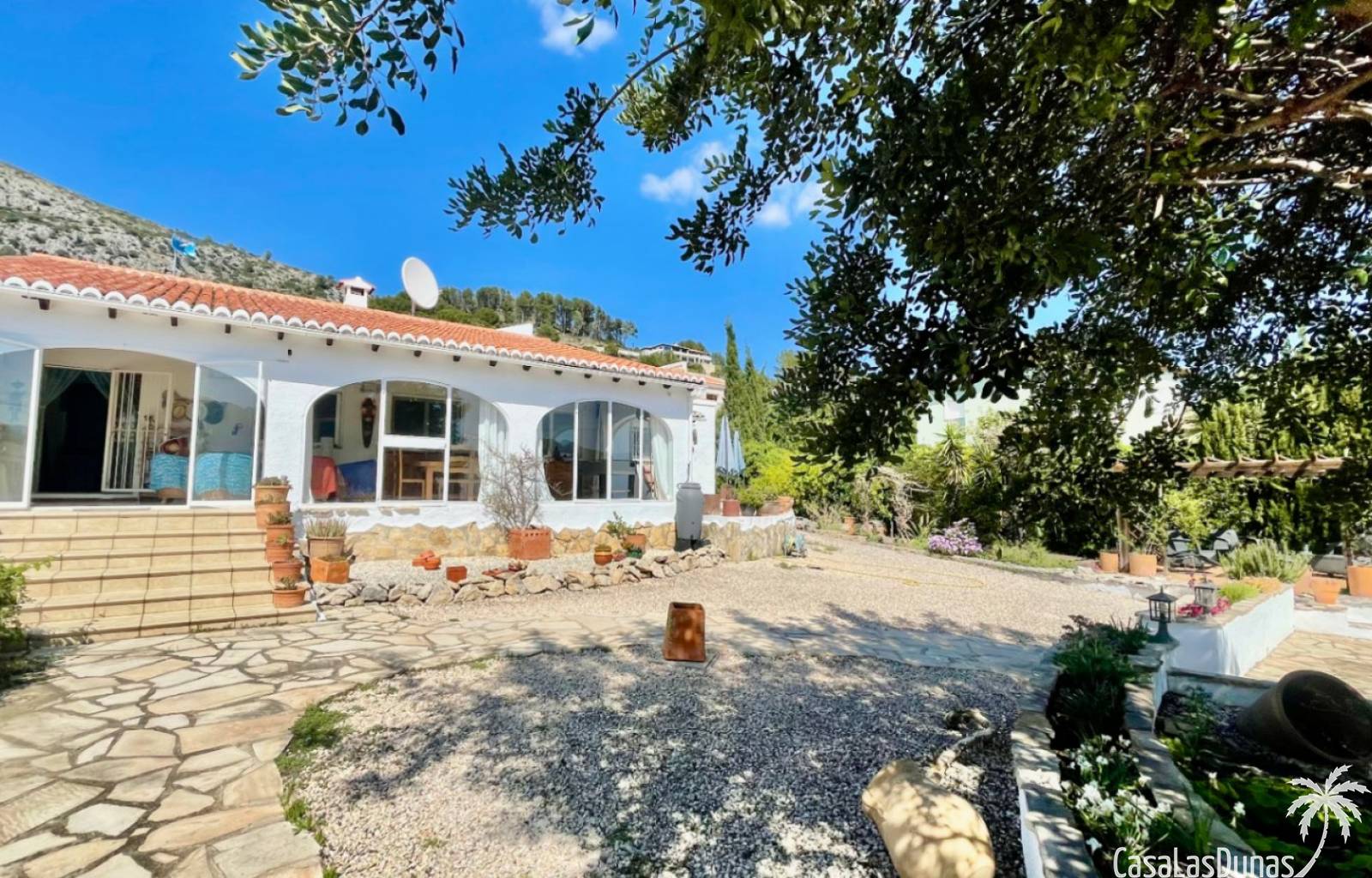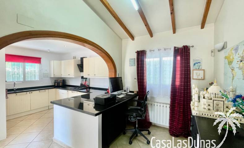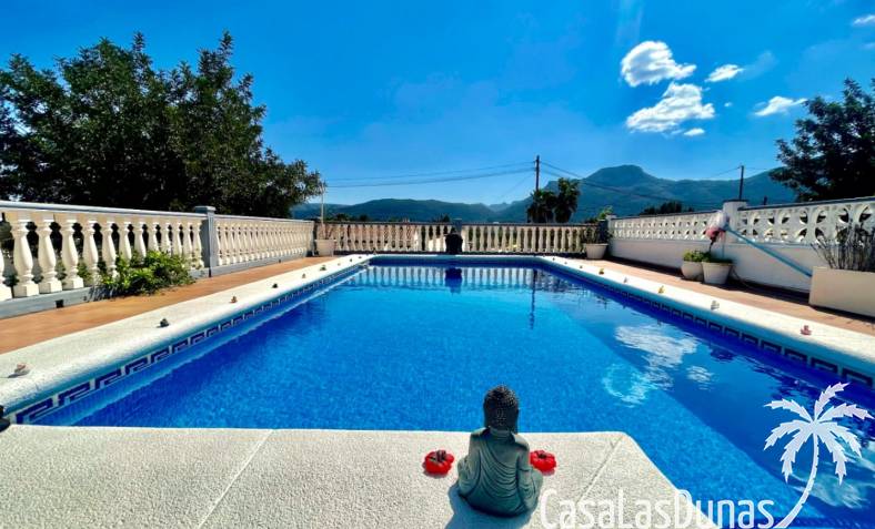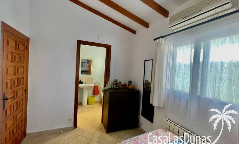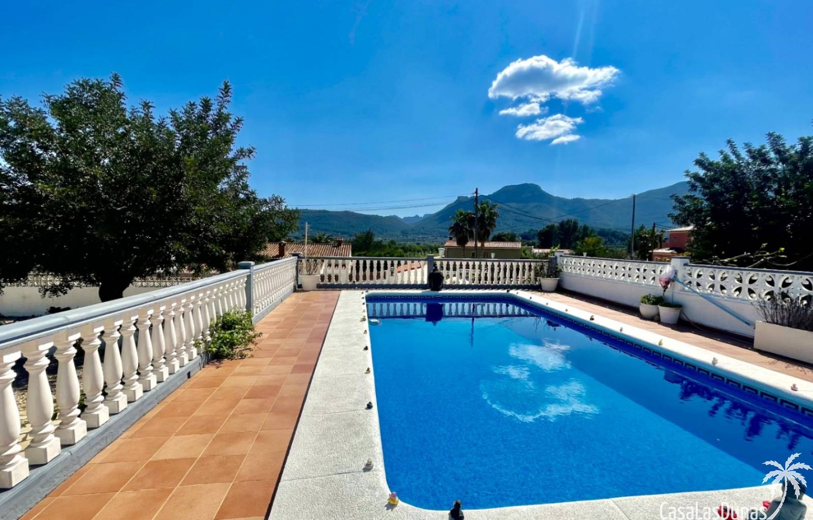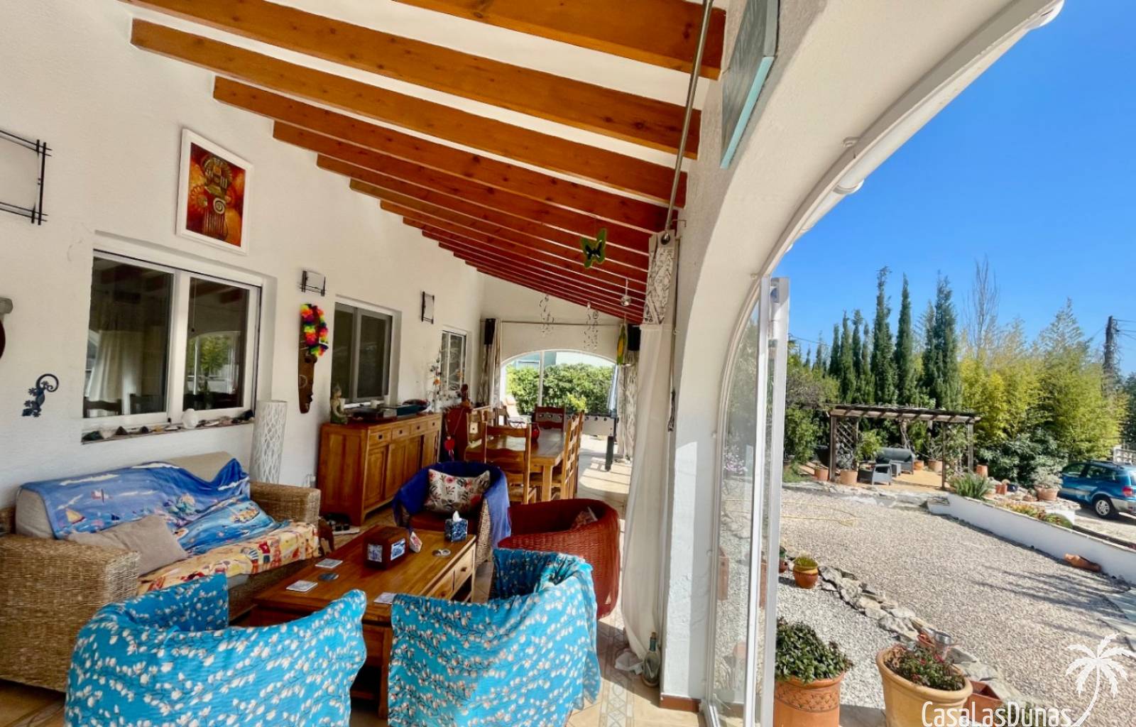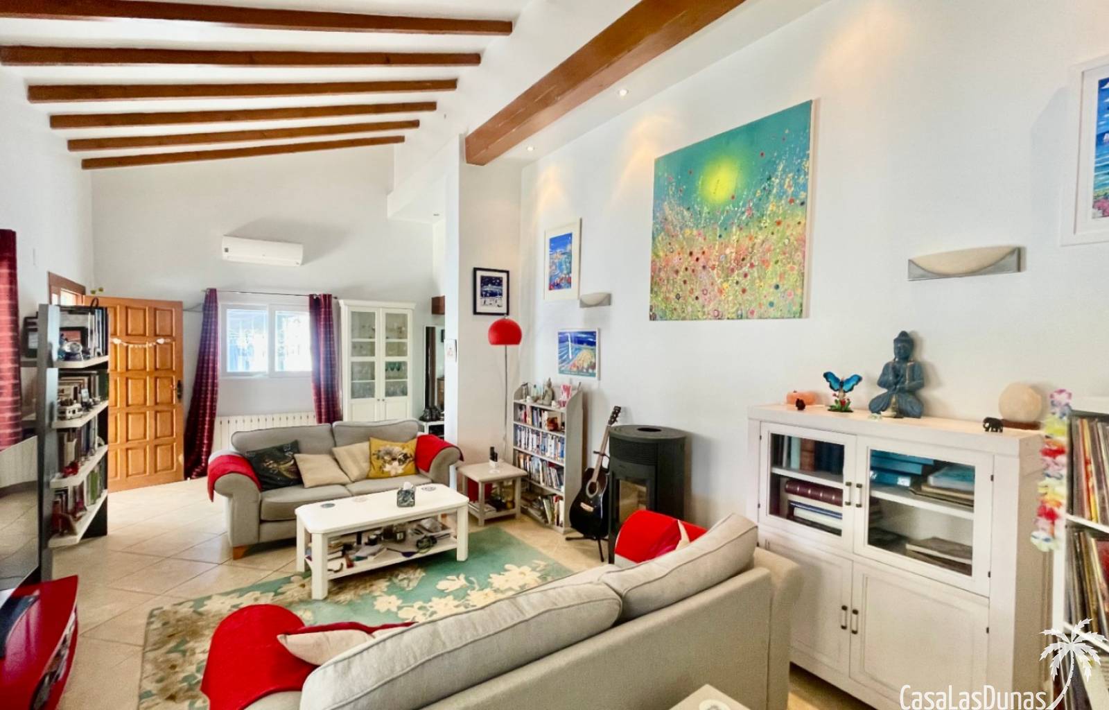 This south-facing detached villa is situated on a flat plot of 1,010 m², within walking distance of the picturesque village of Alcalalí. The house is entirely single-story and offers bright, well-laid-out rooms, culminating in an impressive 45 m² glass naya with a wooden beamed ceiling, ideal for relaxing, dining, or entertaining guests year-round. The villa features a large living room with a wood-burning stove and air conditioning (hot/cold), a spacious fully equipped kitchen with a breakfast bar, a utility room with access to the pool terrace, and three bedrooms, all with en-suite bathrooms; the master suite has three built-in wardrobes, a dressing room, a ceiling fan, patio doors to the private terrace, and a spacious walk-in shower. Outside, the plot offers an 8 x 4 m swimming pool, an outdoor shower, a sunny terrace with a pergola, a chill-out and BBQ area, an additional pergola for shade, and low-maintenance Mediterranean gardens. The fully fenced plot features an entrance gate, ample parking, double glazing, and gas central heating, making this an ideal family or holiday home offering space, privacy, and comfort close to the center of Alcalalí.