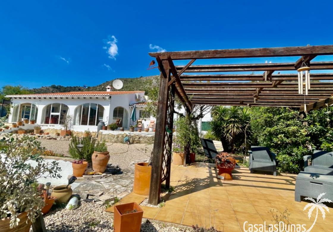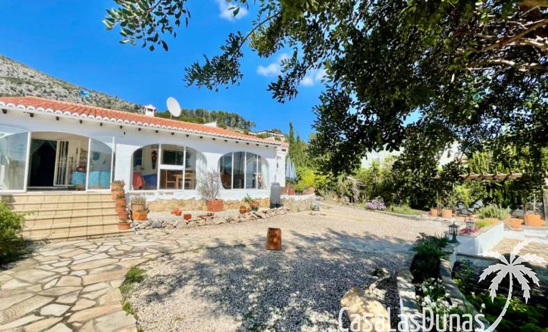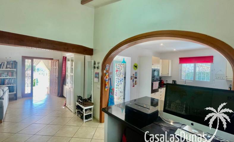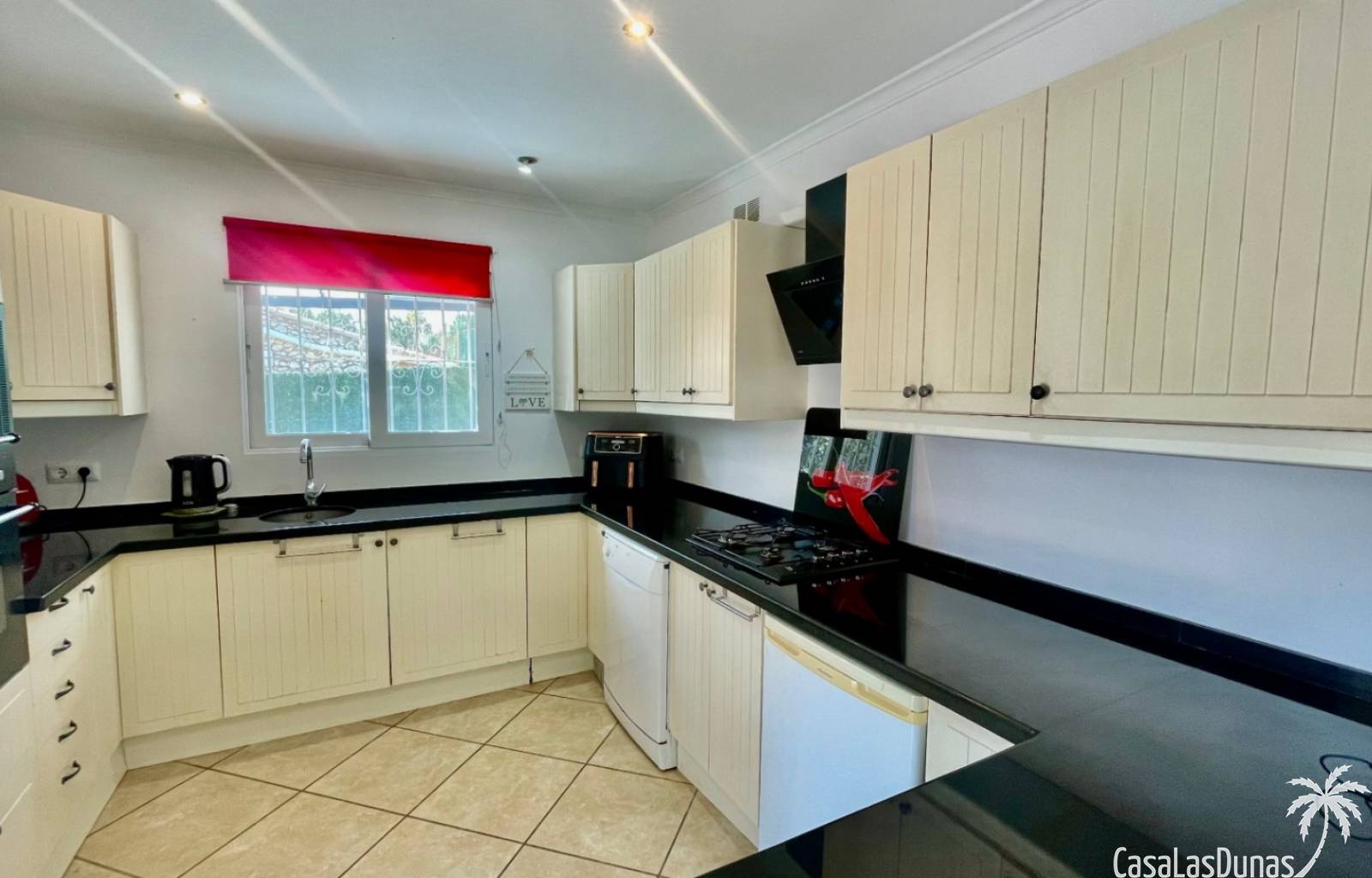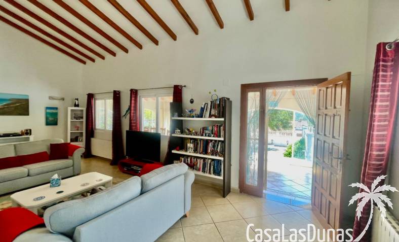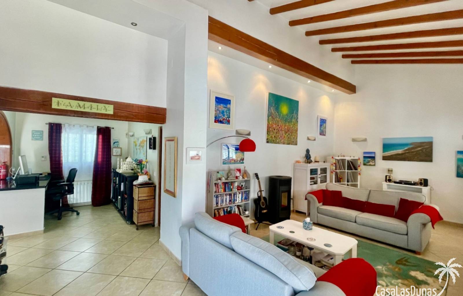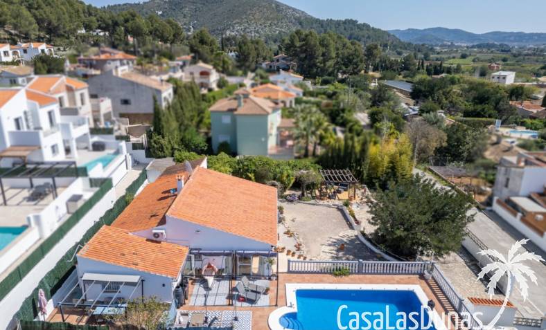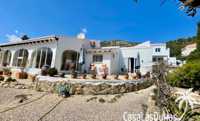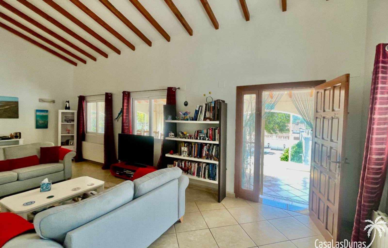 This south-facing detached villa is situated on a flat plot of 1,010 m², within walking distance of the picturesque village of Alcalalí. The house is entirely single-story and offers bright, well-laid-out rooms, culminating in an impressive 45 m² glass naya with a wooden beamed ceiling, ideal for relaxing, dining, or entertaining guests year-round. The villa features a large living room with a wood-burning stove and air conditioning (hot/cold), a spacious fully equipped kitchen with a breakfast bar, a utility room with access to the pool terrace, and three bedrooms, all with en-suite bathrooms; the master suite has three built-in wardrobes, a dressing room, a ceiling fan, patio doors to the private terrace, and a spacious walk-in shower. Outside, the plot offers an 8 x 4 m swimming pool, an outdoor shower, a sunny terrace with a pergola, a chill-out and BBQ area, an additional pergola for shade, and low-maintenance Mediterranean gardens. The fully fenced plot features an entrance gate, ample parking, double glazing, and gas central heating, making this an ideal family or holiday home offering space, privacy, and comfort close to the center of Alcalalí.