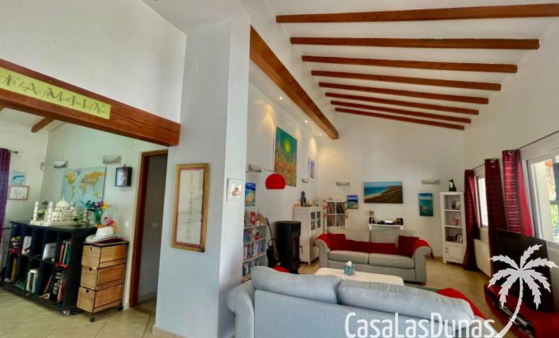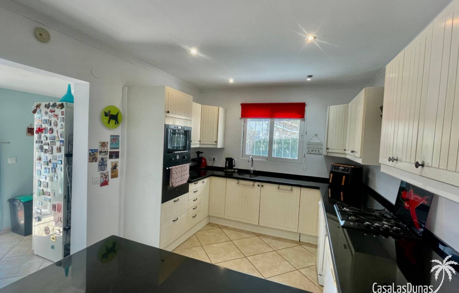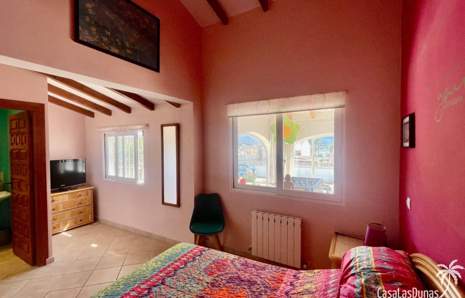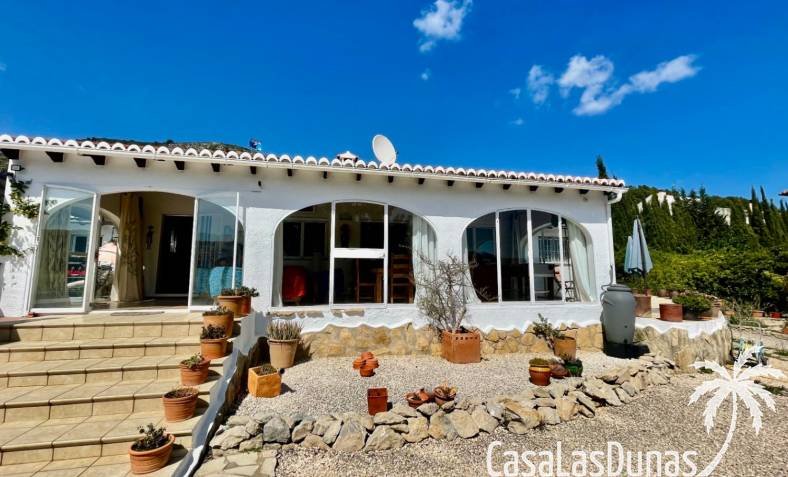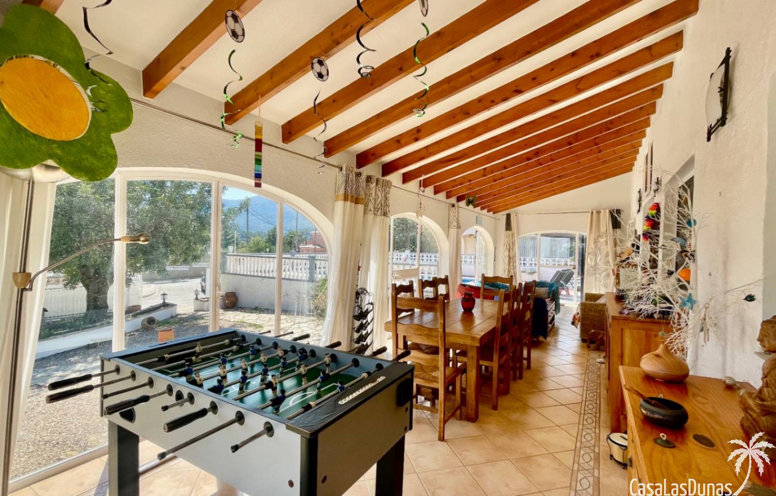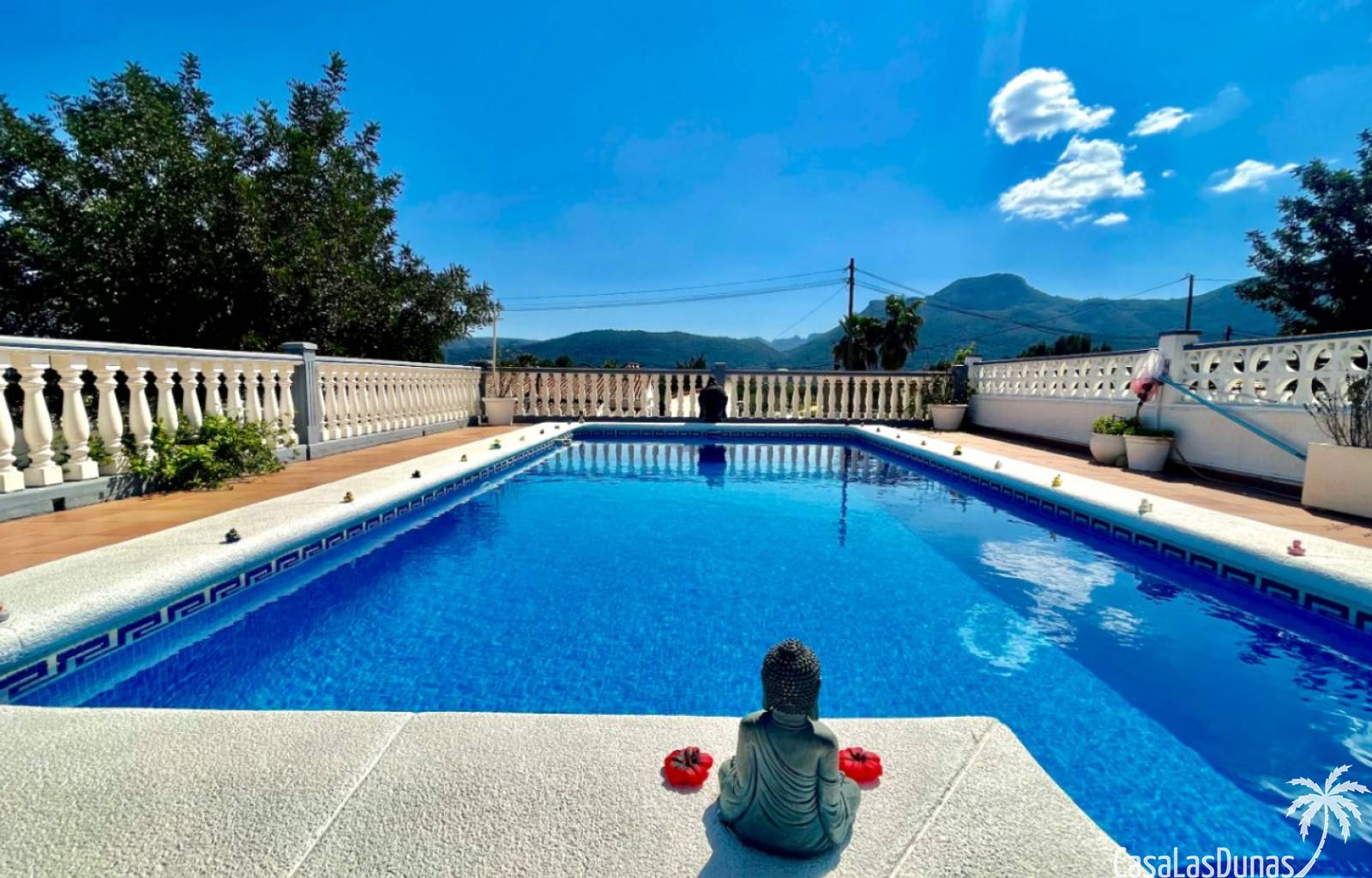 This south-facing detached villa is situated on a flat plot of 1,010 m², within walking distance of the picturesque village of Alcalalí. The house is entirely single-story and offers bright, well-laid-out rooms, culminating in an impressive 45 m² glass naya with a wooden beamed ceiling, ideal for relaxing, dining, or entertaining guests year-round. The villa features a large living room with a wood-burning stove and air conditioning (hot/cold), a spacious fully equipped kitchen with a breakfast bar, a utility room with access to the pool terrace, and three bedrooms, all with en-suite bathrooms; the master suite has three built-in wardrobes, a dressing room, a ceiling fan, patio doors to the private terrace, and a spacious walk-in shower. Outside, the plot offers an 8 x 4 m swimming pool, an outdoor shower, a sunny terrace with a pergola, a chill-out and BBQ area, an additional pergola for shade, and low-maintenance Mediterranean gardens. The fully fenced plot features an entrance gate, ample parking, double glazing, and gas central heating, making this an ideal family or holiday home offering space, privacy, and comfort close to the center of Alcalalí.