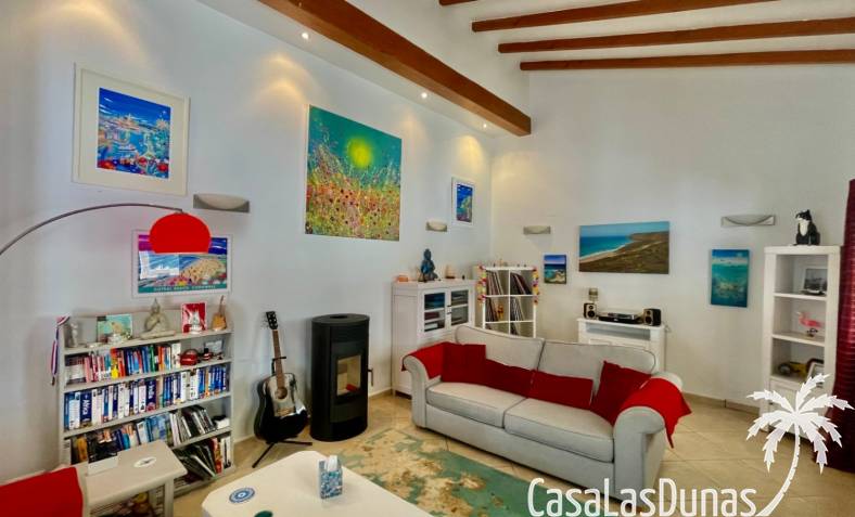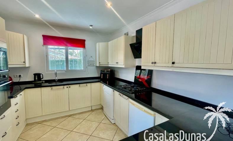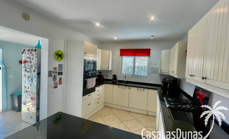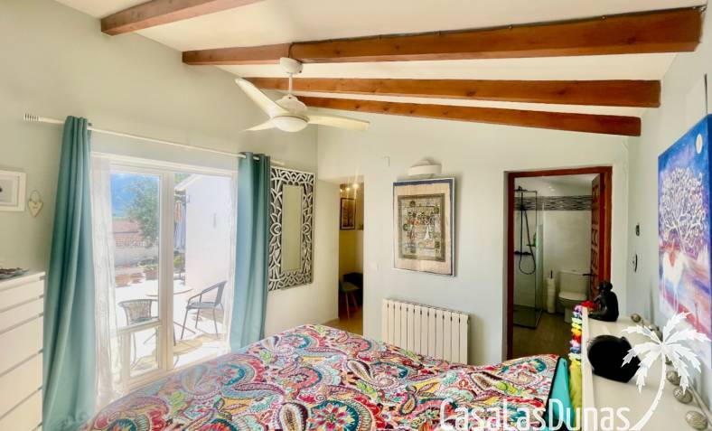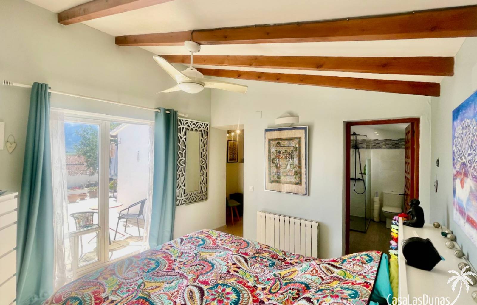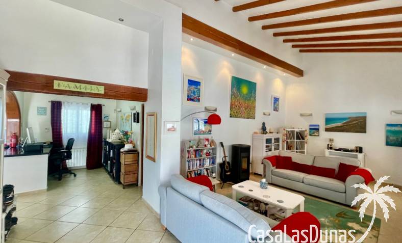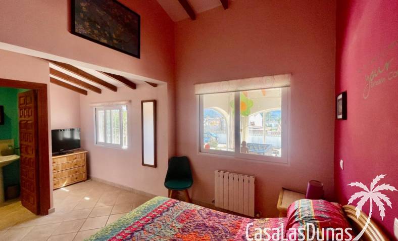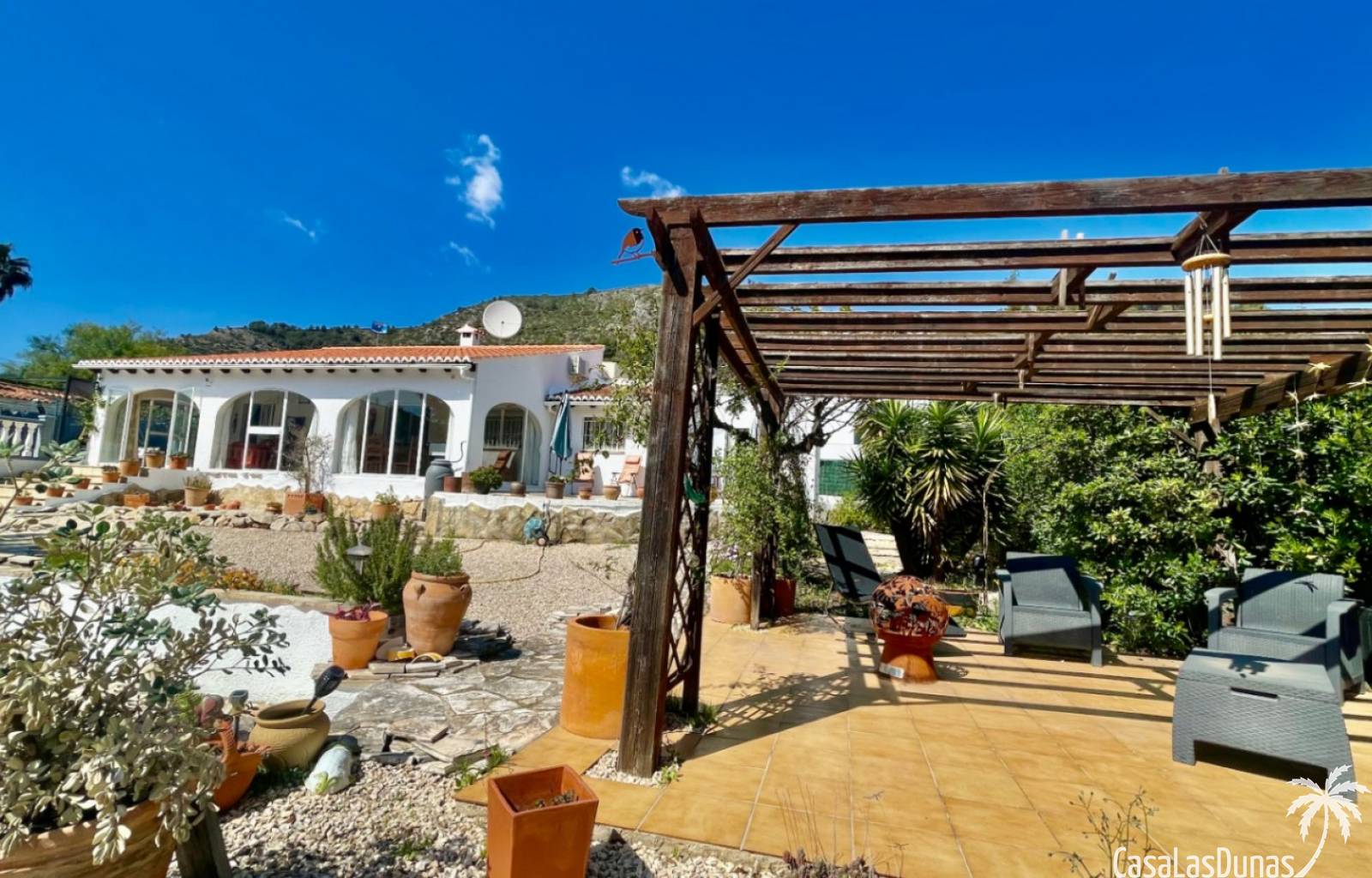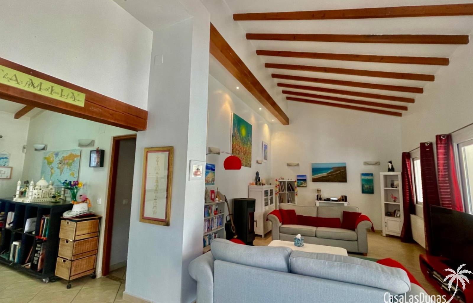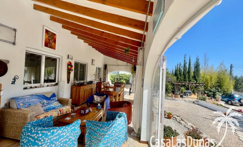 This south-facing detached villa is situated on a flat plot of 1,010 m², within walking distance of the picturesque village of Alcalalí. The house is entirely single-story and offers bright, well-laid-out rooms, culminating in an impressive 45 m² glass naya with a wooden beamed ceiling, ideal for relaxing, dining, or entertaining guests year-round. The villa features a large living room with a wood-burning stove and air conditioning (hot/cold), a spacious fully equipped kitchen with a breakfast bar, a utility room with access to the pool terrace, and three bedrooms, all with en-suite bathrooms; the master suite has three built-in wardrobes, a dressing room, a ceiling fan, patio doors to the private terrace, and a spacious walk-in shower. Outside, the plot offers an 8 x 4 m swimming pool, an outdoor shower, a sunny terrace with a pergola, a chill-out and BBQ area, an additional pergola for shade, and low-maintenance Mediterranean gardens. The fully fenced plot features an entrance gate, ample parking, double glazing, and gas central heating, making this an ideal family or holiday home offering space, privacy, and comfort close to the center of Alcalalí.