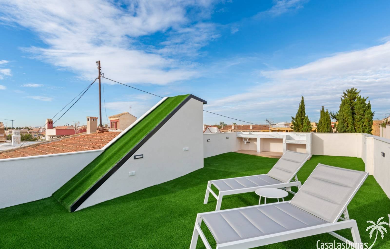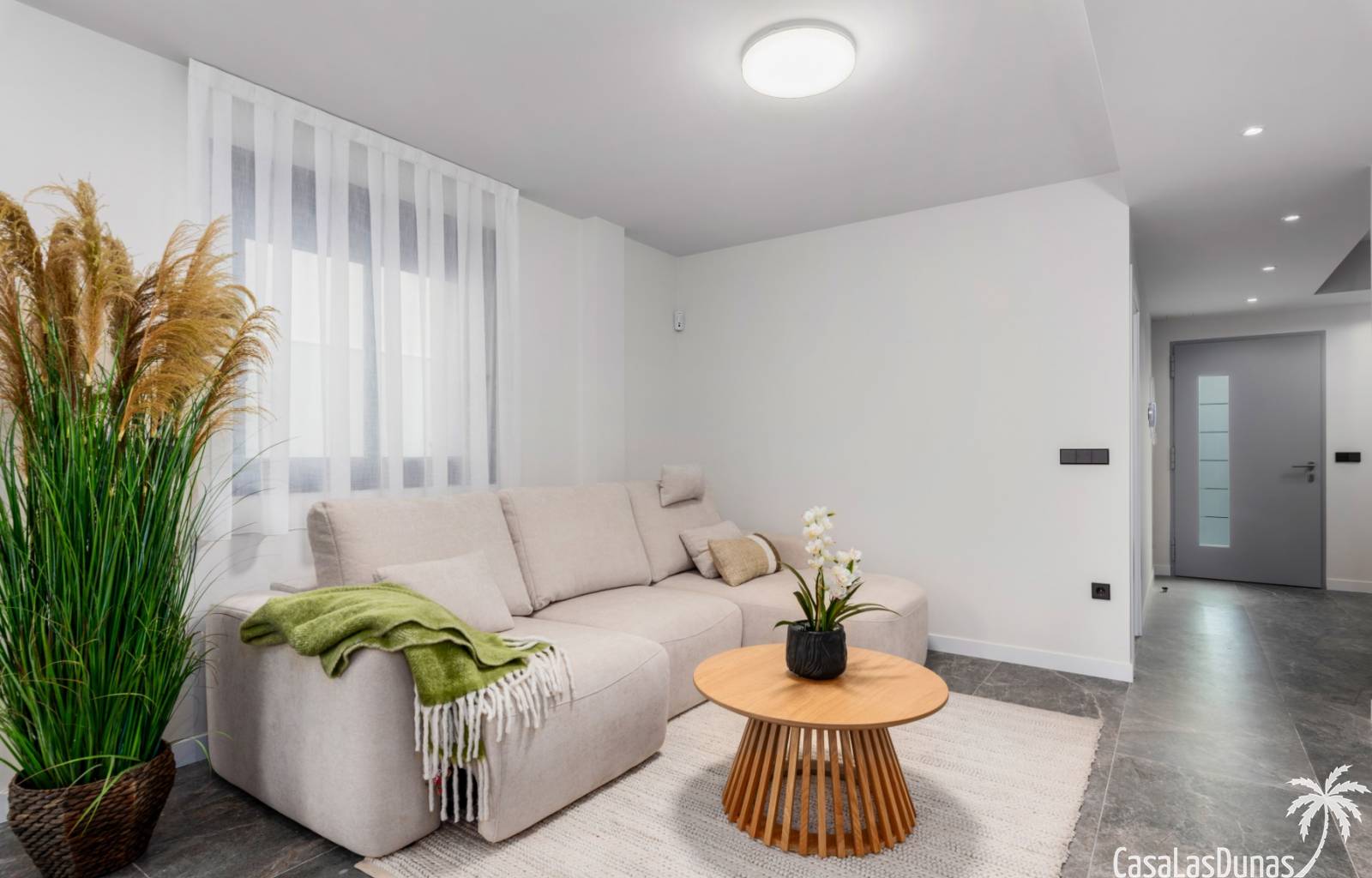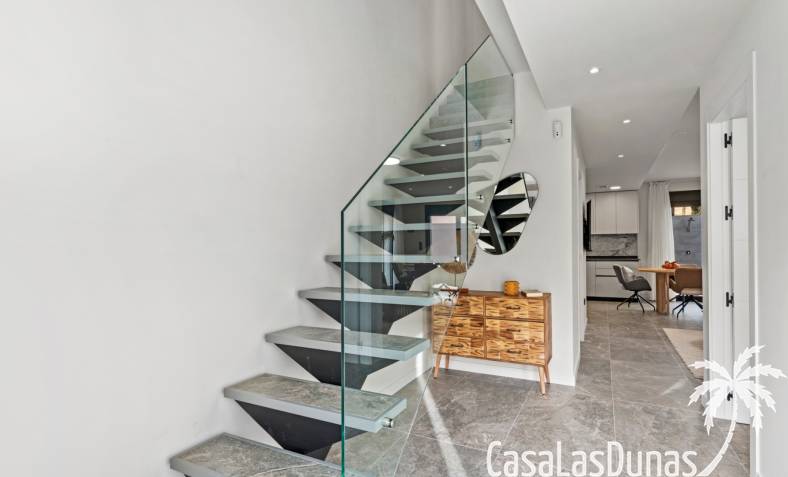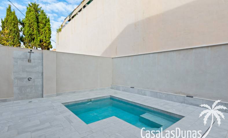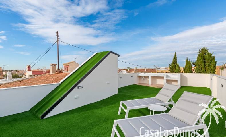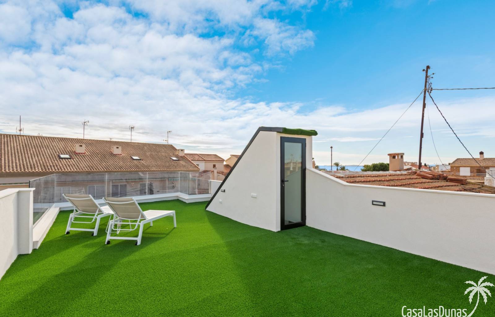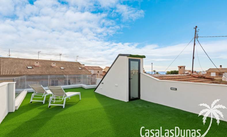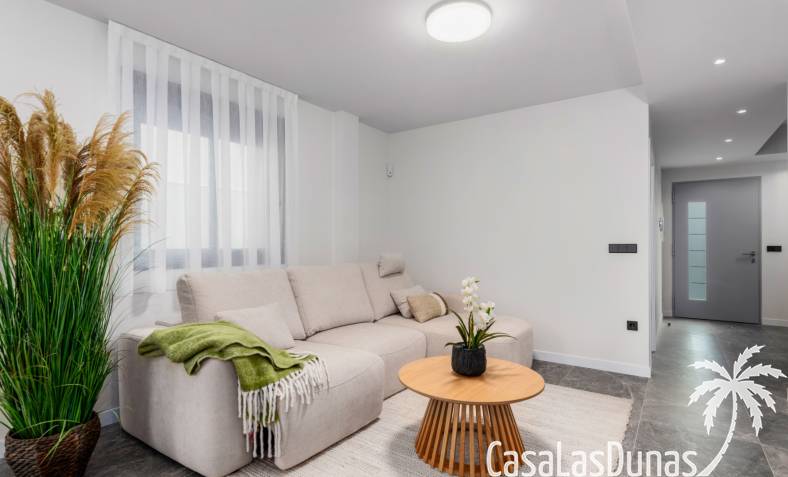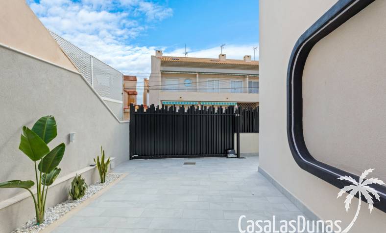 This East Facing, Four Bedroom, Renovated, Semi Detached Villa in Torre de la Horadada is located just a 3 minute walk to the beach, positioned one street behind the sea and promenade which leads you to the marina and a larger stretch of sandy coastline. Torre de la Horadada is a typically Spanish seaside town offering a variety of restaurants and café bars, while Pilar de la Horadada is just a couple of minutes’ drive away. Orihuela Costa, La Zenia Boulevard shopping centre, and several golf courses can all be reached in approximately 15 minutes. Recently renovated to a high standard with a unique and stylish design, this impressive 121m2 villa is set over two floors and even enjoys sea views. The property offers a bright open plan living space that flows seamlessly to the exterior, along with a well fitted modern kitchen. A hallway leads to the stairs for the first floor, while the ground floor also features a double bedroom with double sliding glazed doors out to the garden, and a contemporary shower room. On the first floor, there are three further double bedrooms, including a spacious master with dressing area and an en suite shower room featuring a double vanity. Bedroom four benefits from its own private terrace, and there is also an additional modern family shower room. The 45m2 private solarium is laid with artificial grass and includes a brick-built area with sink — ideal for outdoor entertaining. The garden is tiled and partly laid with artificial grass, and offers off road parking, a private swimming pool, outdoor shower, and an extensive covered kitchen/work area. Additional extras include ducted air conditioning, an irrigation system, and a store room. An exceptional, fully renovated villa in a prime coastal location, perfect for enjoying modern Mediterranean living on the Costa Blanca South.